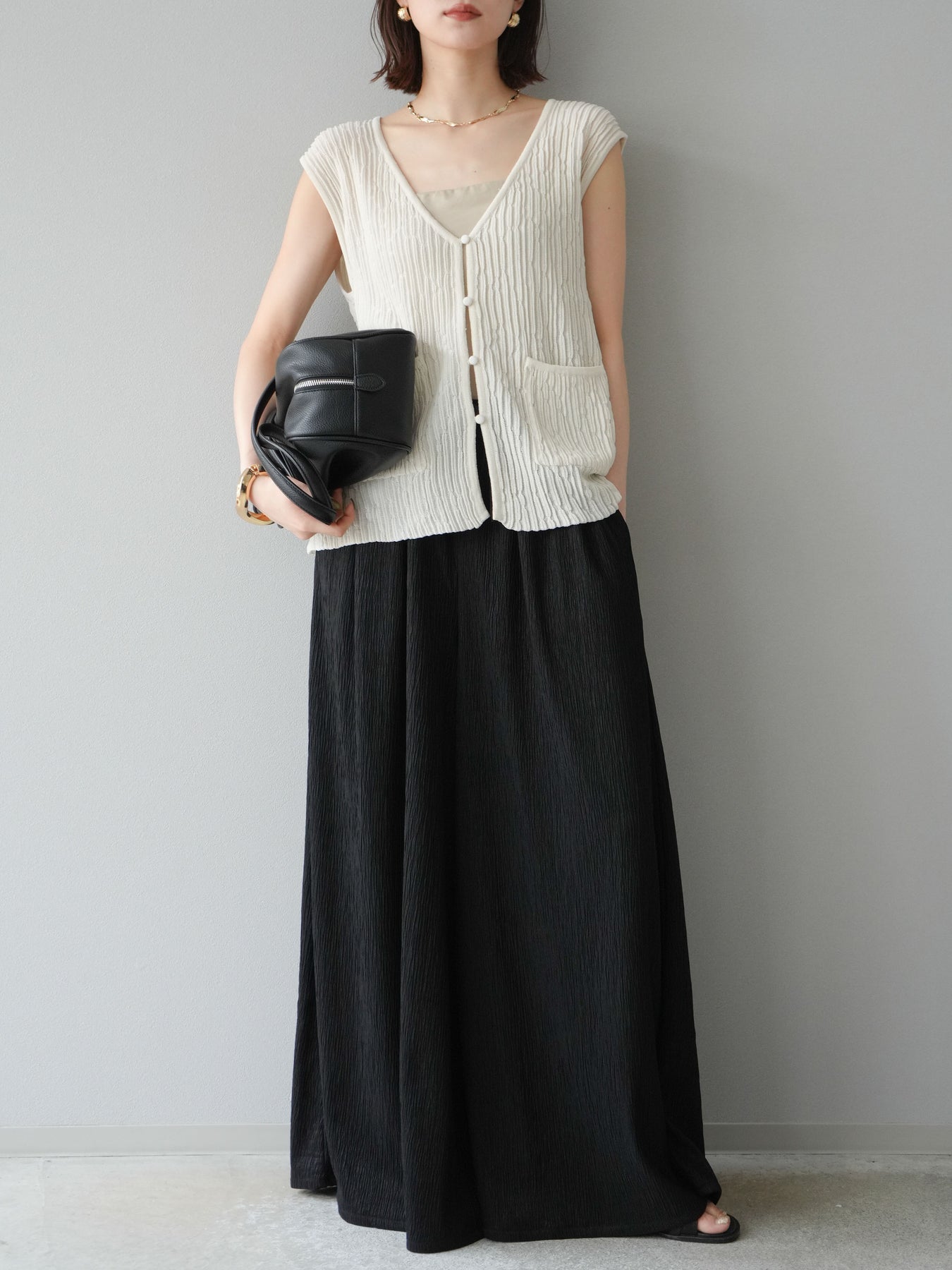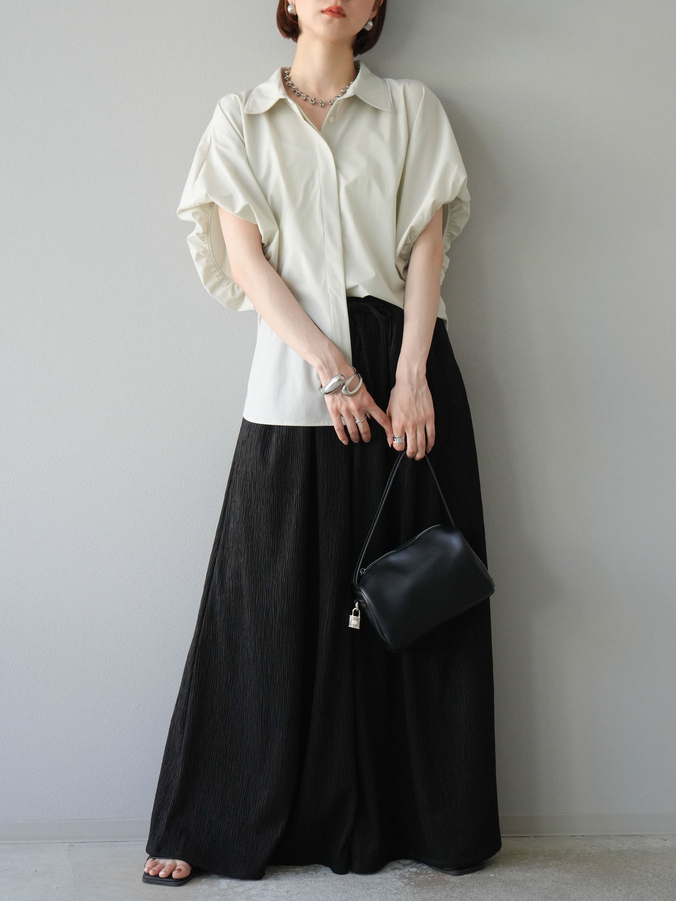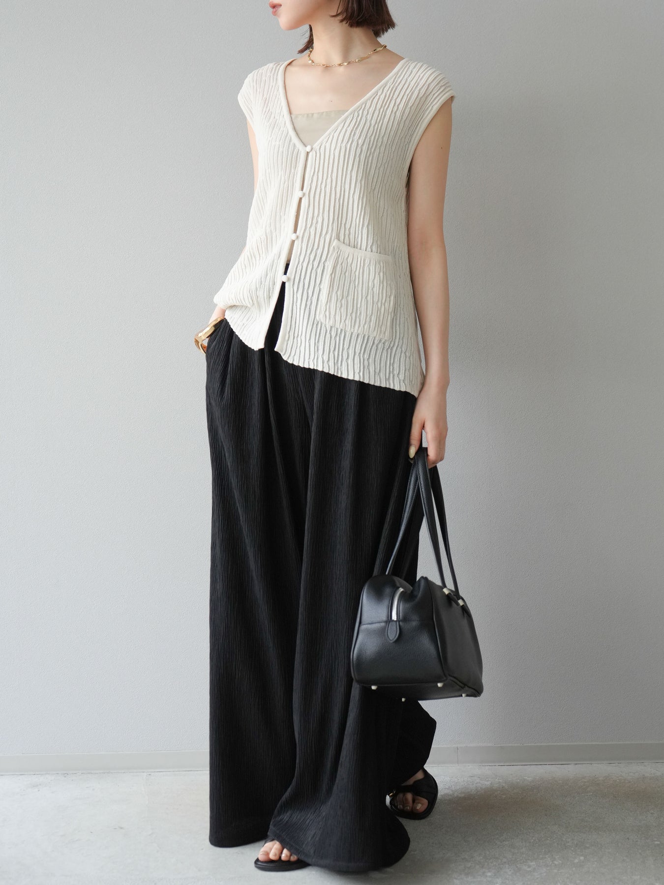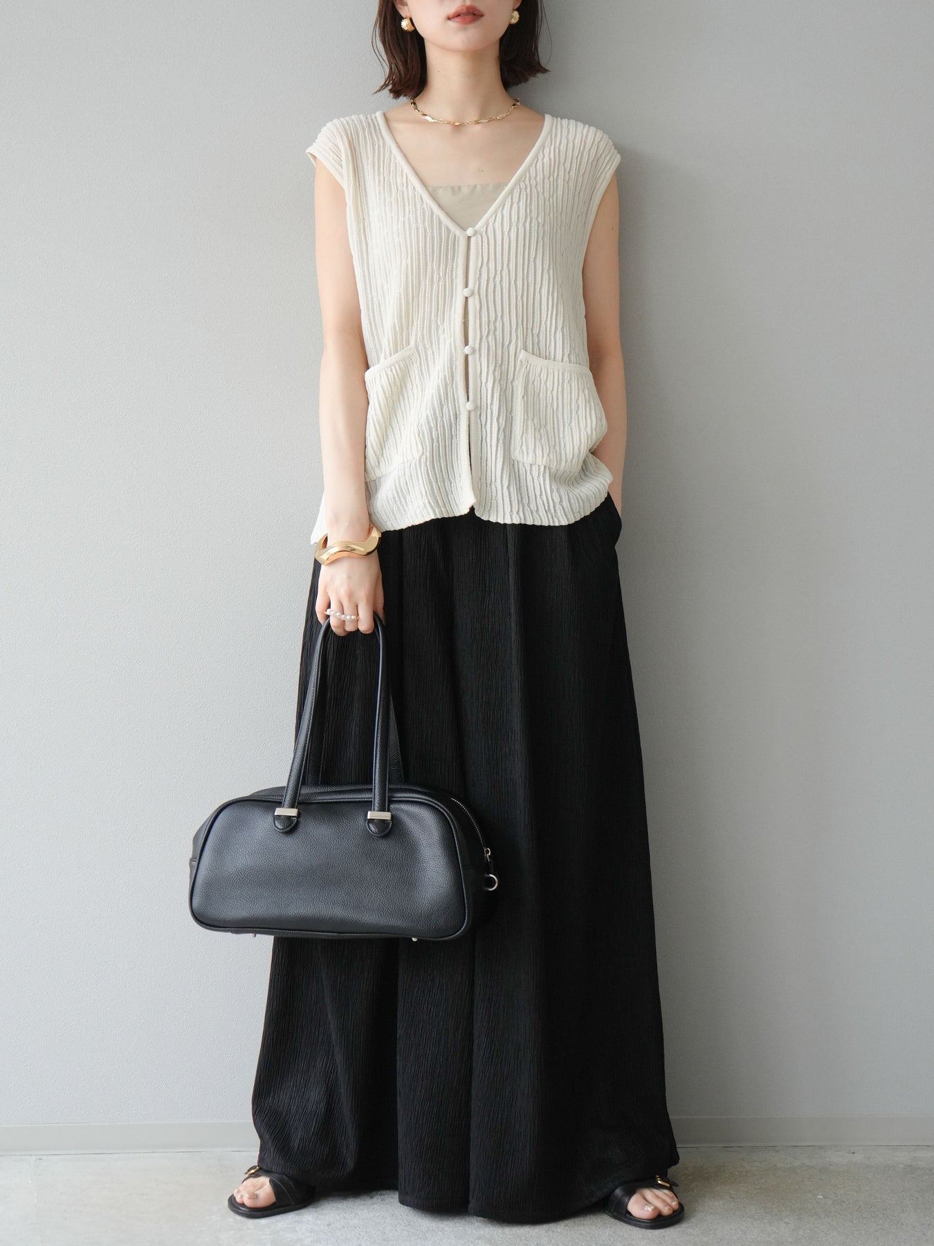 凹凸感のある表面が特徴の楊柳素材を使用した、涼しげな風合いのバギーパンツ。柔らかく軽やかな履き心地で、暑い季節にも快適に着用できます。 ウエストは総ゴム+ドローストリング仕様でリラクシーなフィット感。たっぷりと生地を使ったボリューム感のあるワイドシルエットが、動くたびに揺れ、抜け感のあるスタイルを演出します。 シンプルなトップスを合わせるだけで存在感のある着こなしが完成する、デイリーに活躍する1本です。