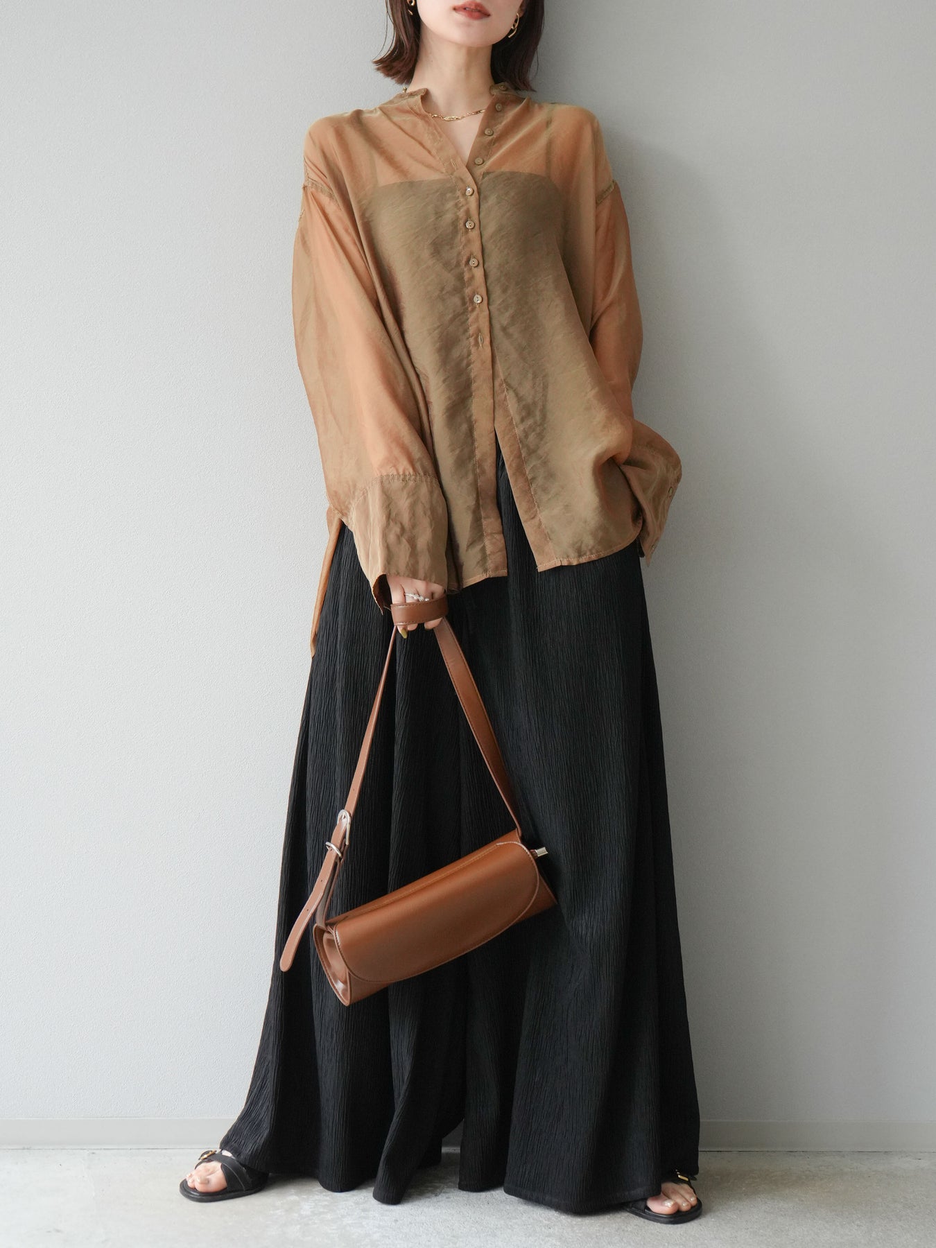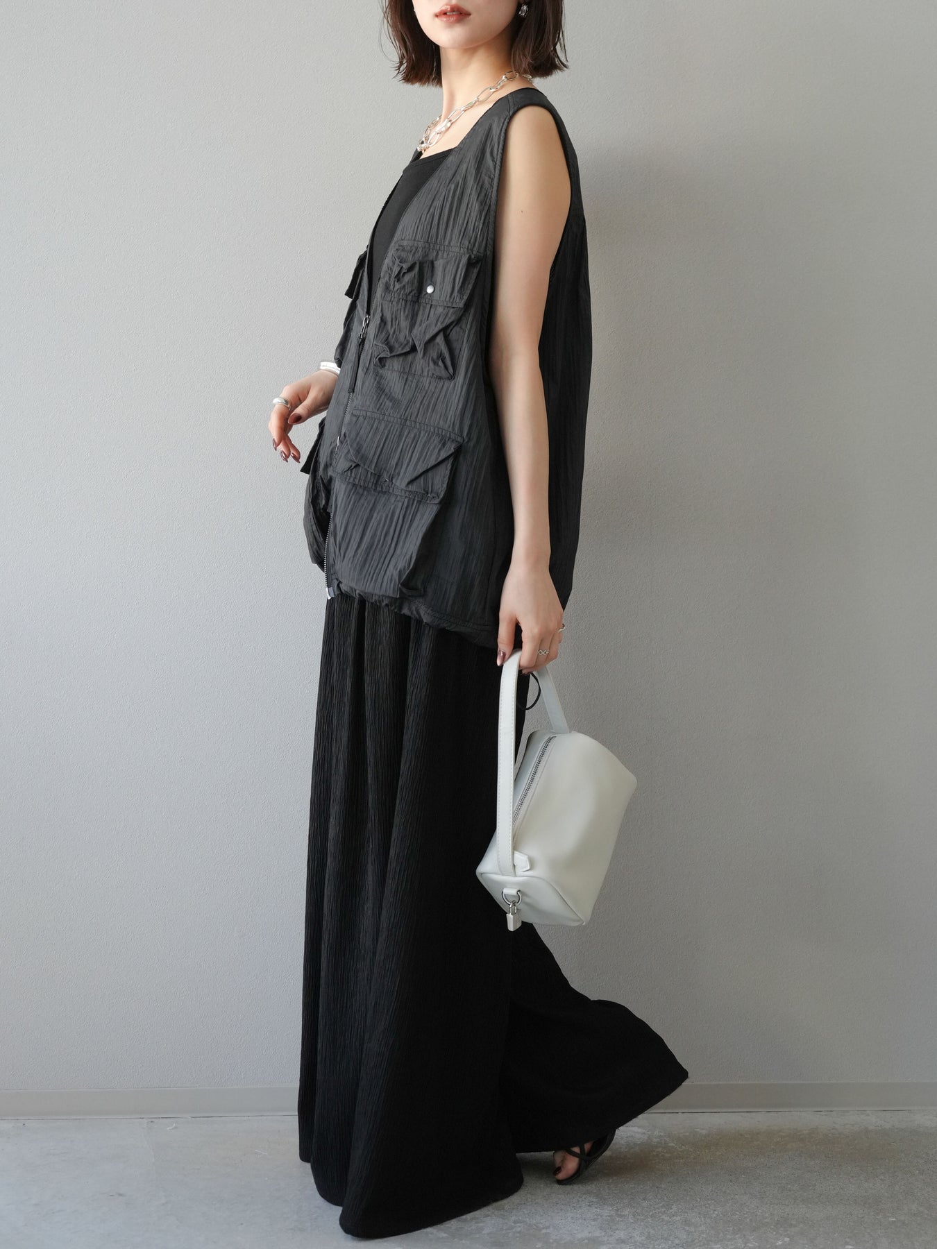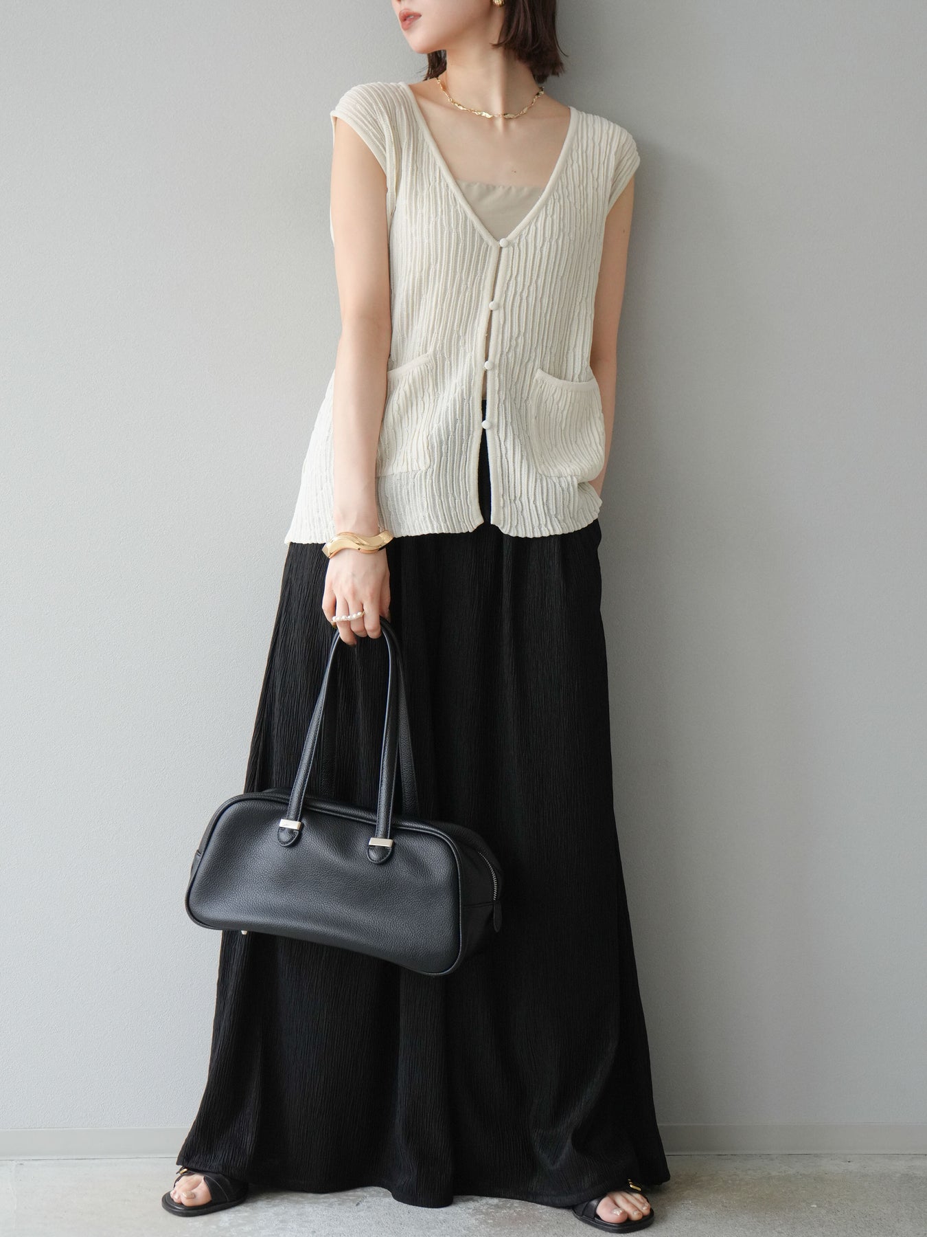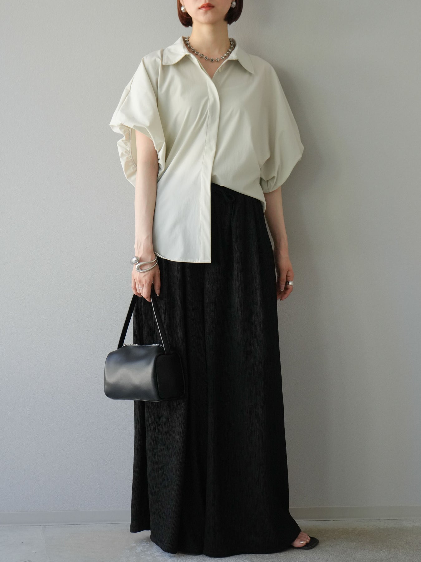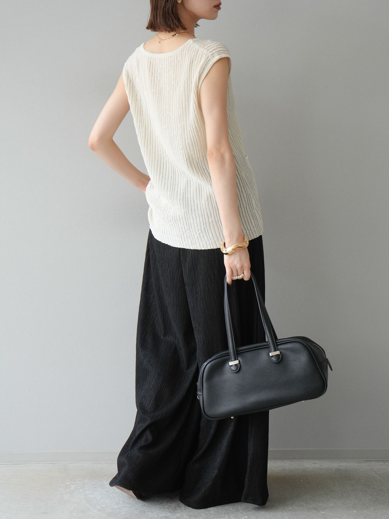 凹凸感のある表面が特徴の楊柳素材を使用した、涼しげな風合いのバギーパンツ。柔らかく軽やかな履き心地で、暑い季節にも快適に着用できます。 ウエストは総ゴム+ドローストリング仕様でリラクシーなフィット感。たっぷりと生地を使ったボリューム感のあるワイドシルエットが、動くたびに揺れ、抜け感のあるスタイルを演出します。 シンプルなトップスを合わせるだけで存在感のある着こなしが完成する、デイリーに活躍する1本です。