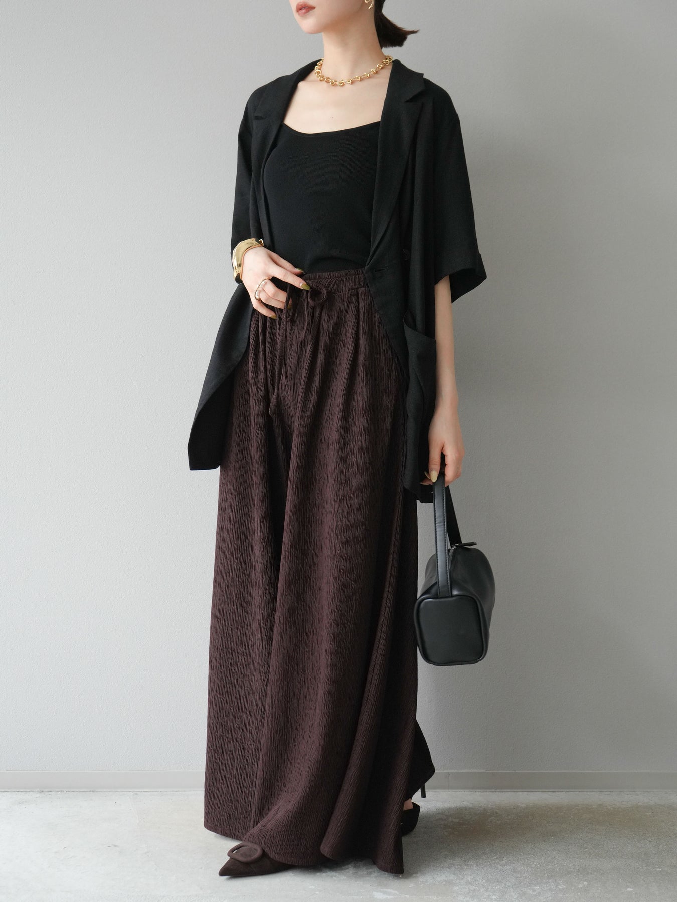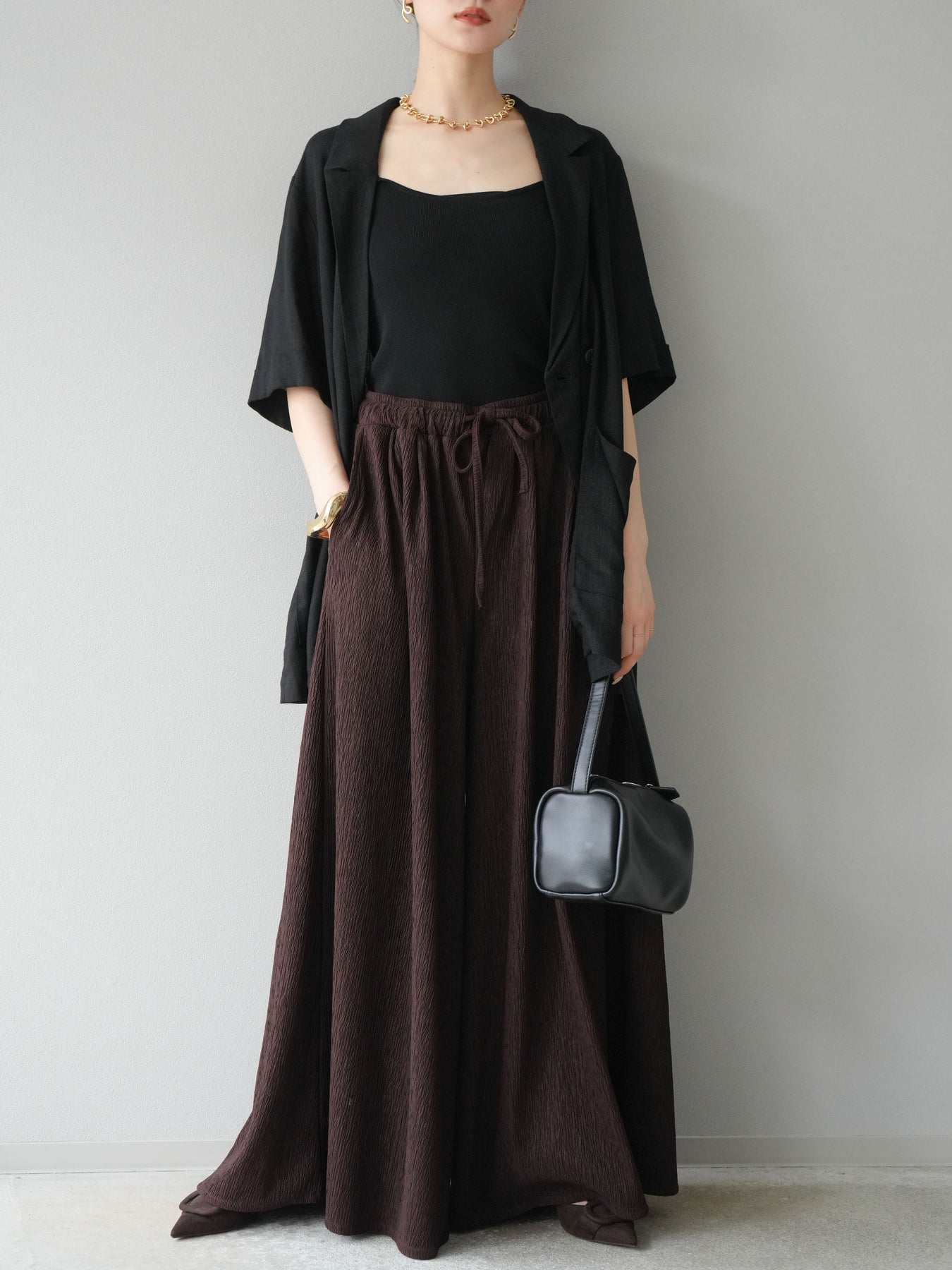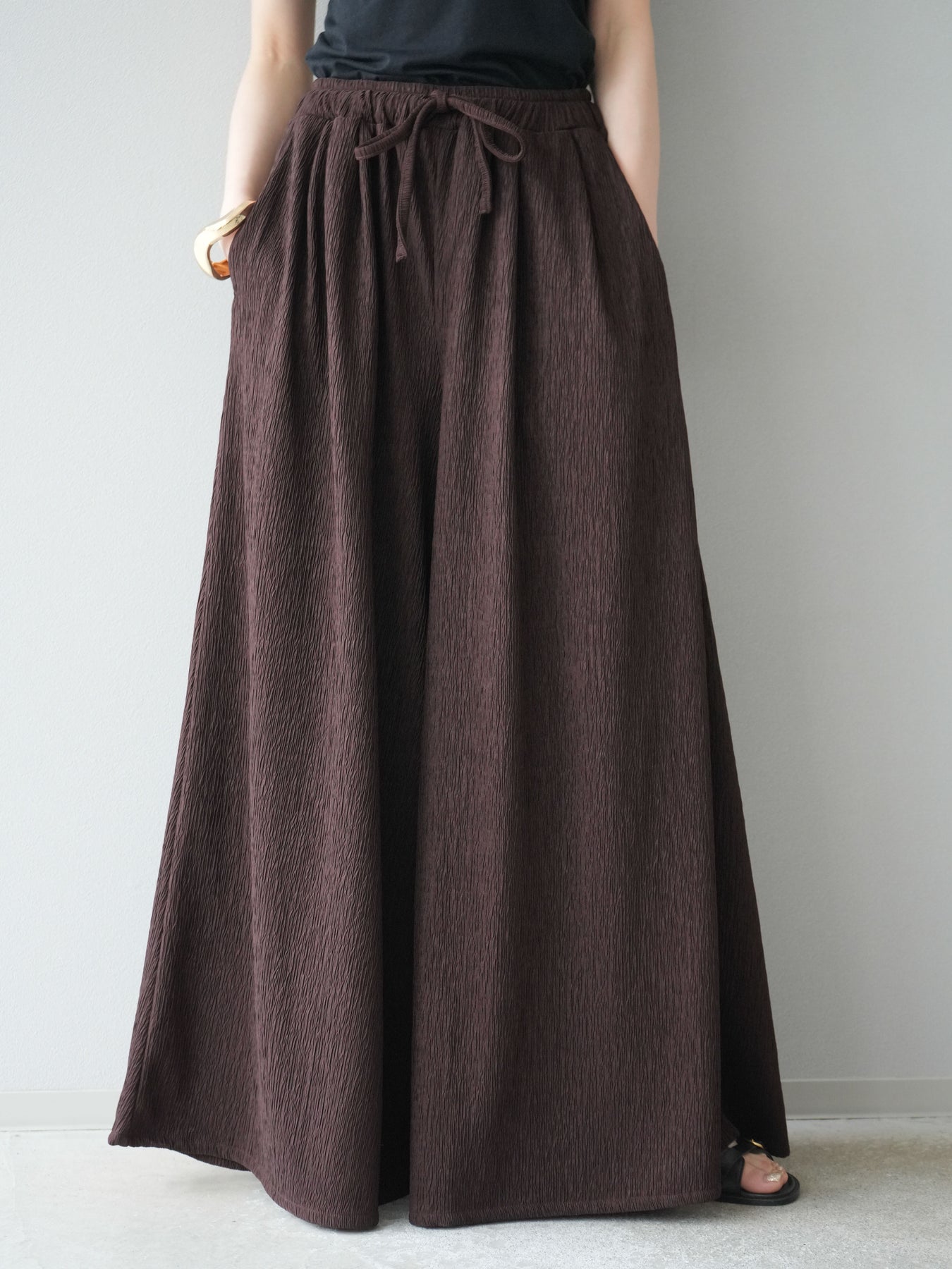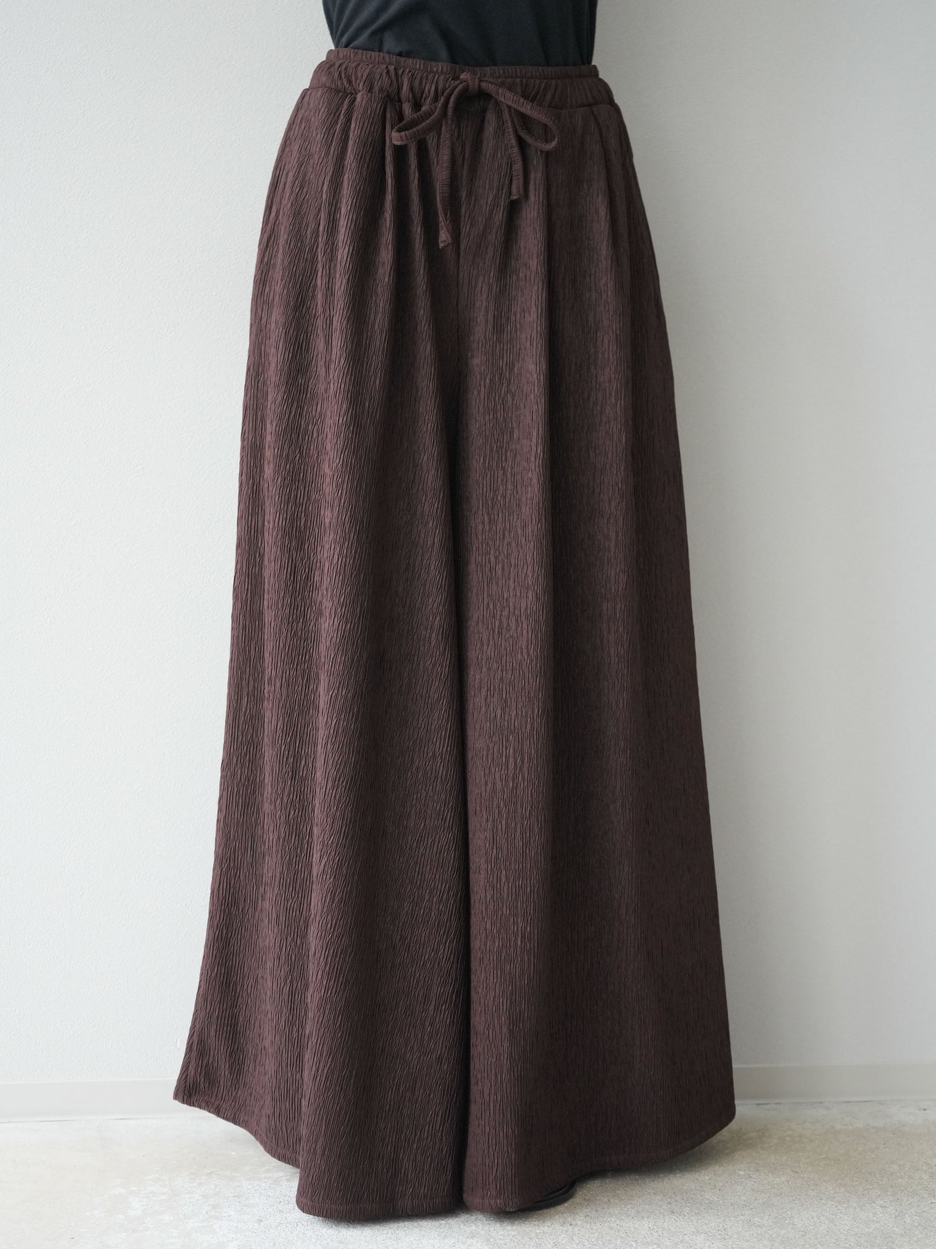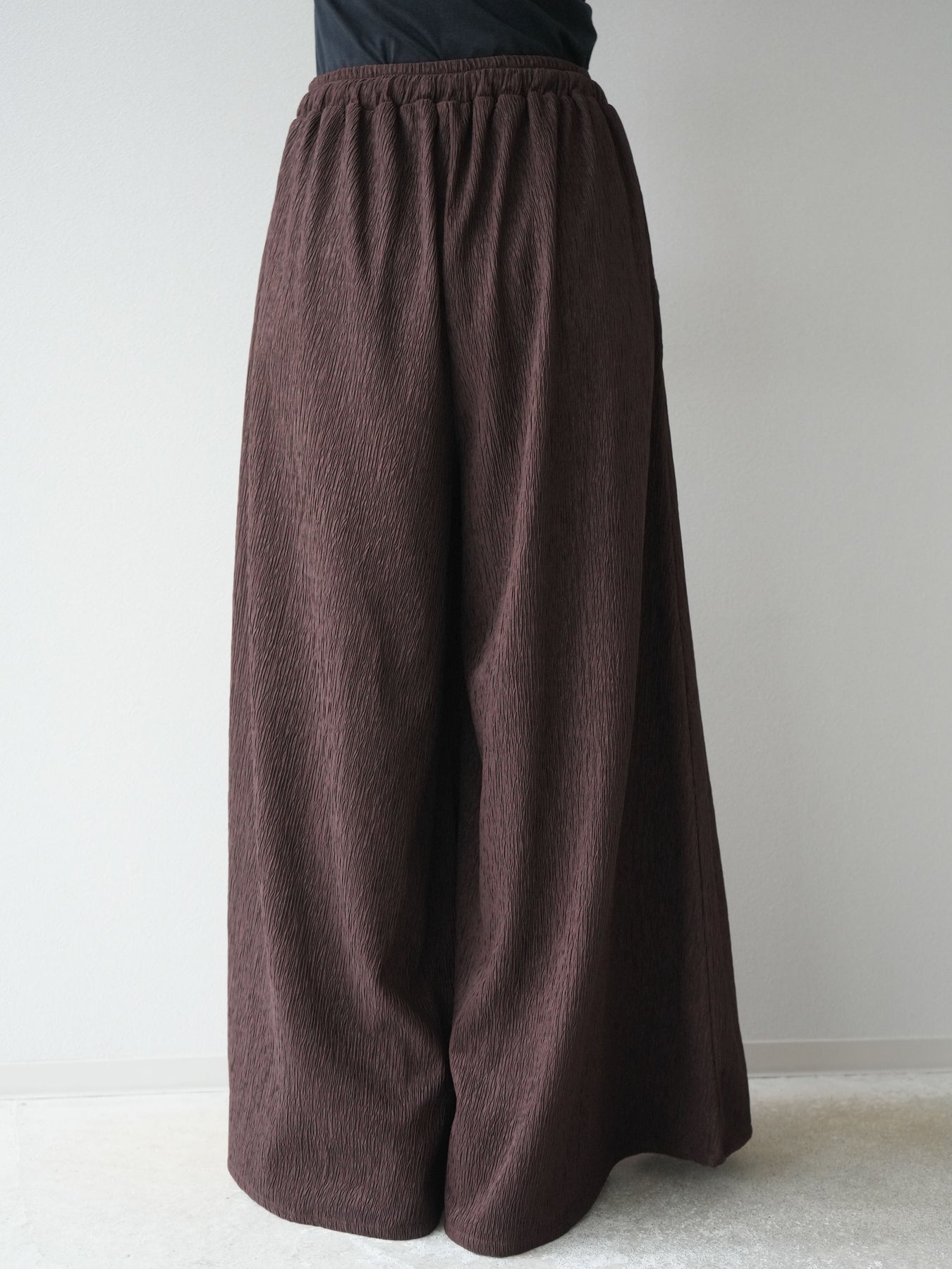 凹凸感のある表面が特徴の楊柳素材を使用した、涼しげな風合いのバギーパンツ。柔らかく軽やかな履き心地で、暑い季節にも快適に着用できます。 ウエストは総ゴム+ドローストリング仕様でリラクシーなフィット感。たっぷりと生地を使ったボリューム感のあるワイドシルエットが、動くたびに揺れ、抜け感のあるスタイルを演出します。 シンプルなトップスを合わせるだけで存在感のある着こなしが完成する、デイリーに活躍する1本です。