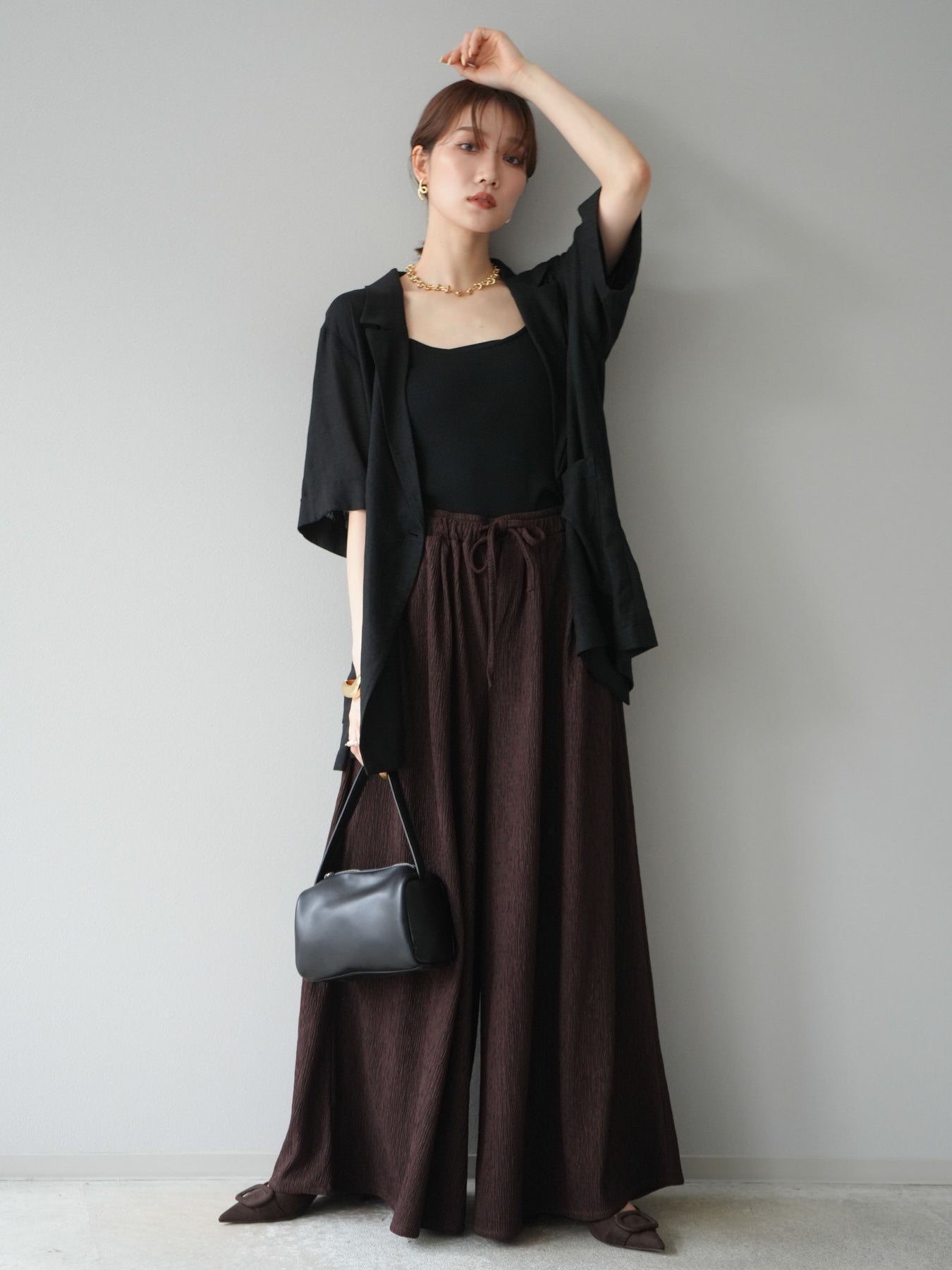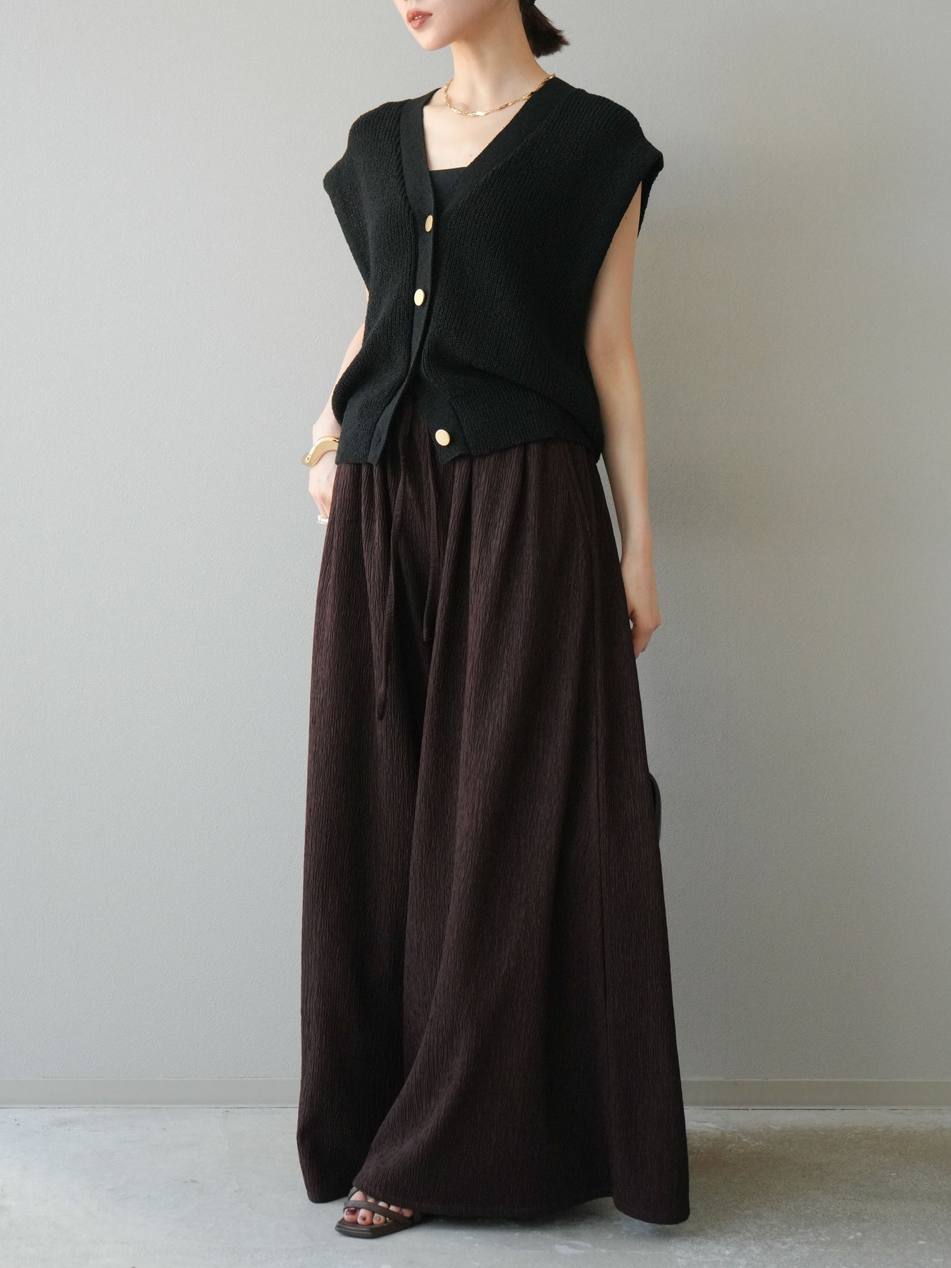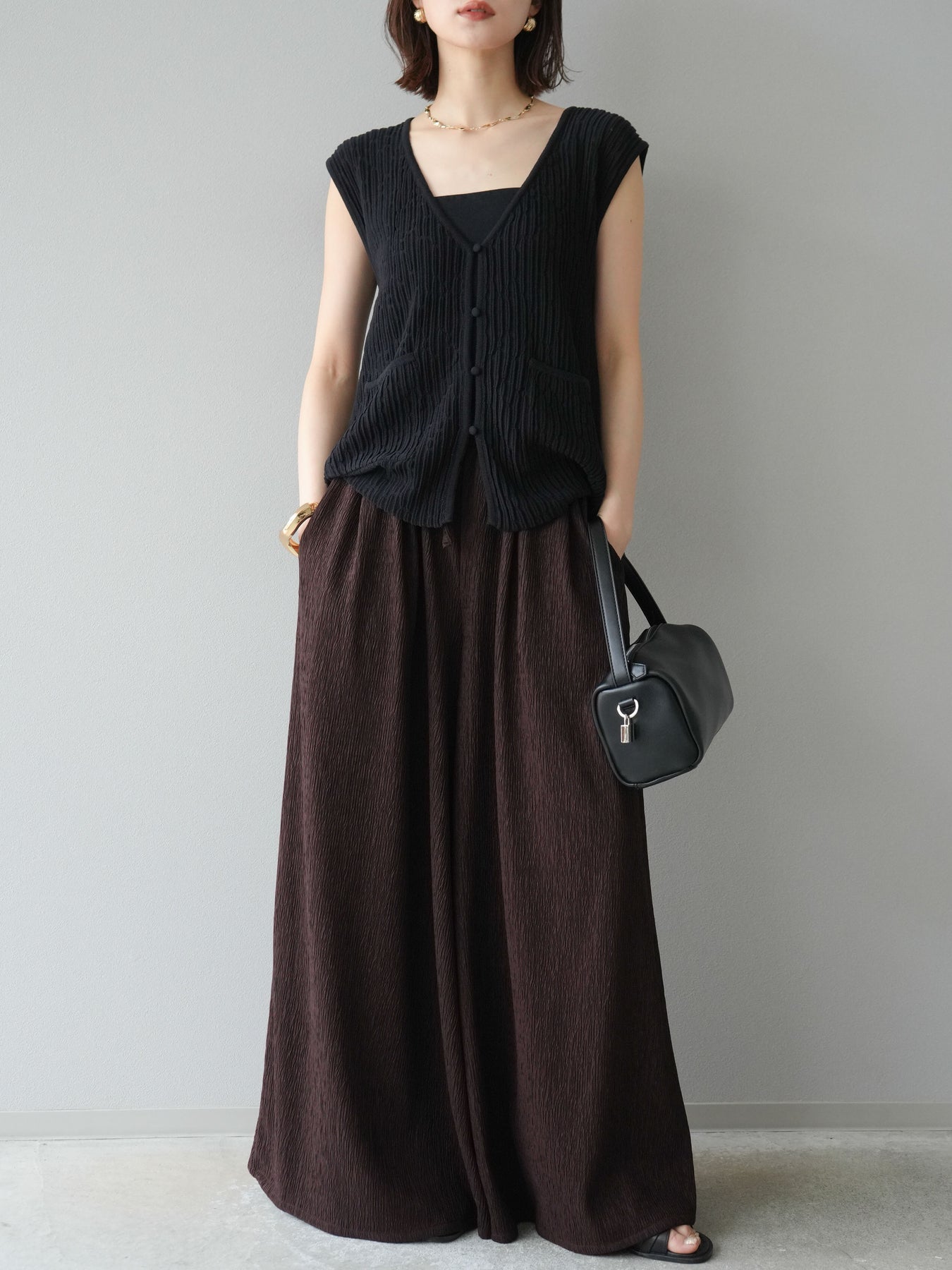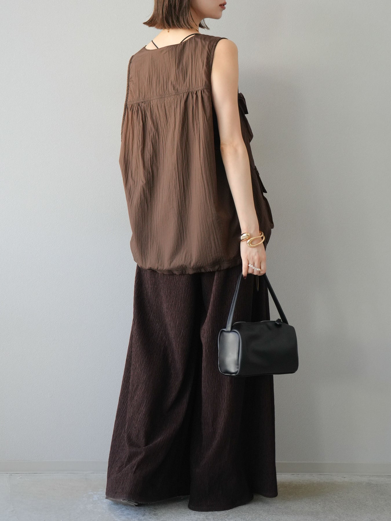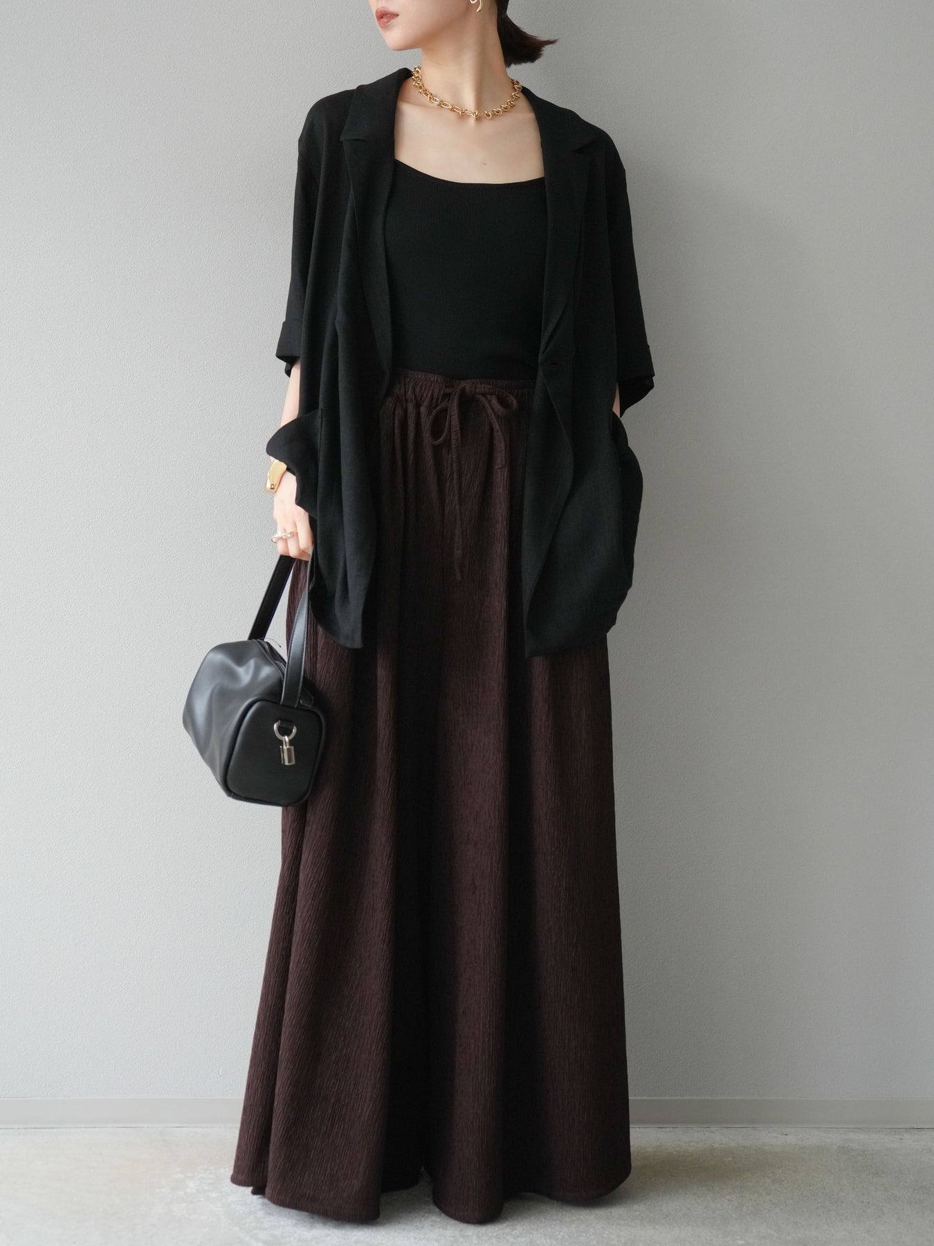 凹凸感のある表面が特徴の楊柳素材を使用した、涼しげな風合いのバギーパンツ。柔らかく軽やかな履き心地で、暑い季節にも快適に着用できます。 ウエストは総ゴム+ドローストリング仕様でリラクシーなフィット感。たっぷりと生地を使ったボリューム感のあるワイドシルエットが、動くたびに揺れ、抜け感のあるスタイルを演出します。 シンプルなトップスを合わせるだけで存在感のある着こなしが完成する、デイリーに活躍する1本です。