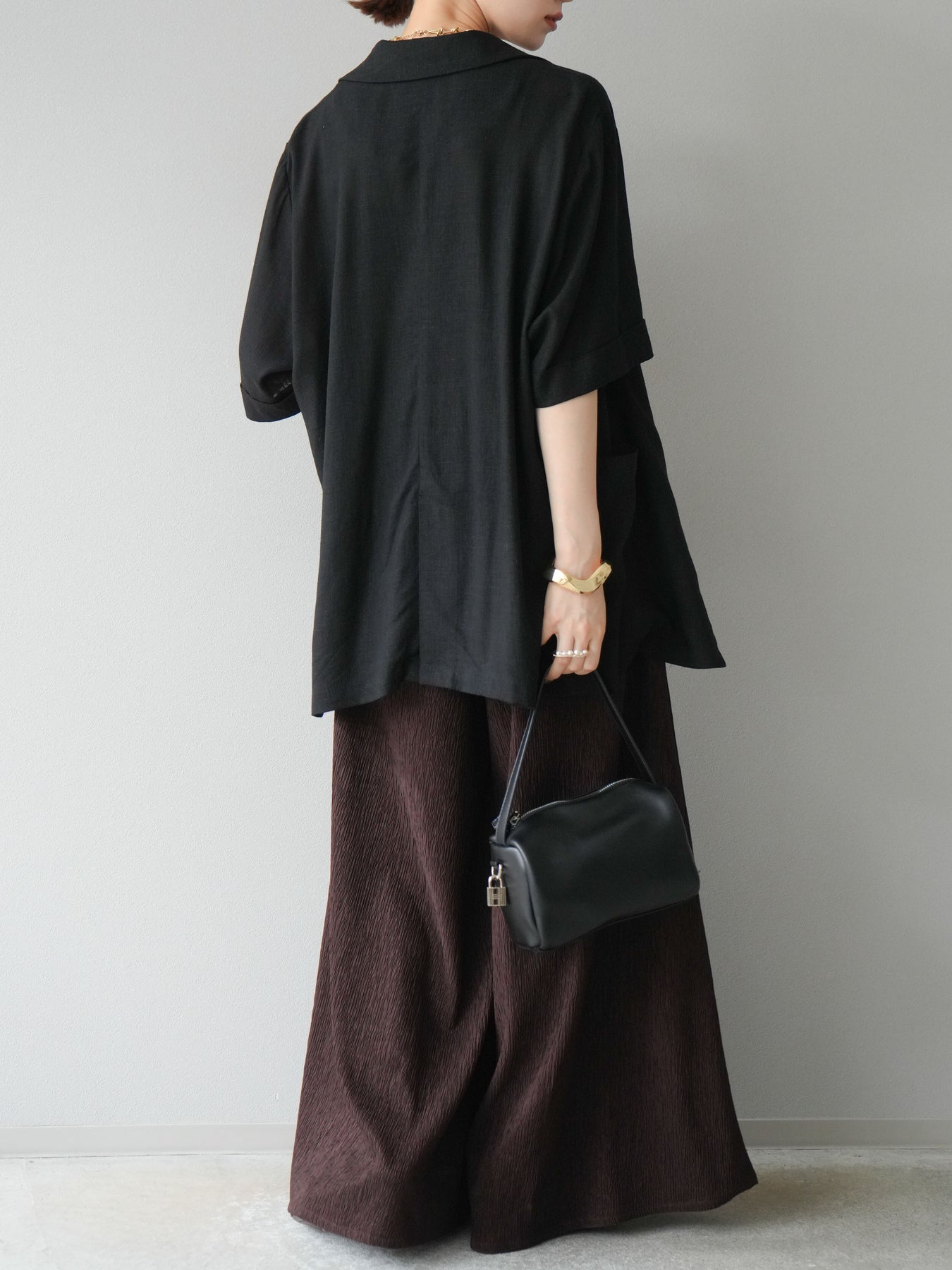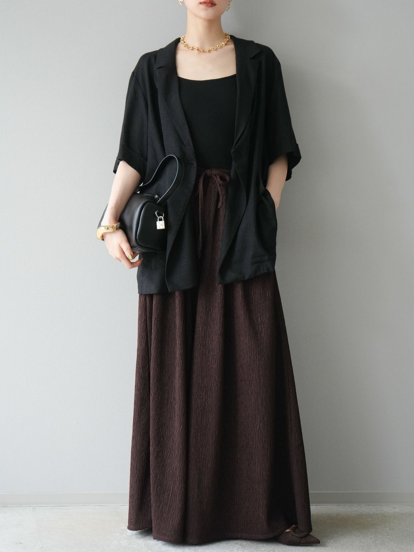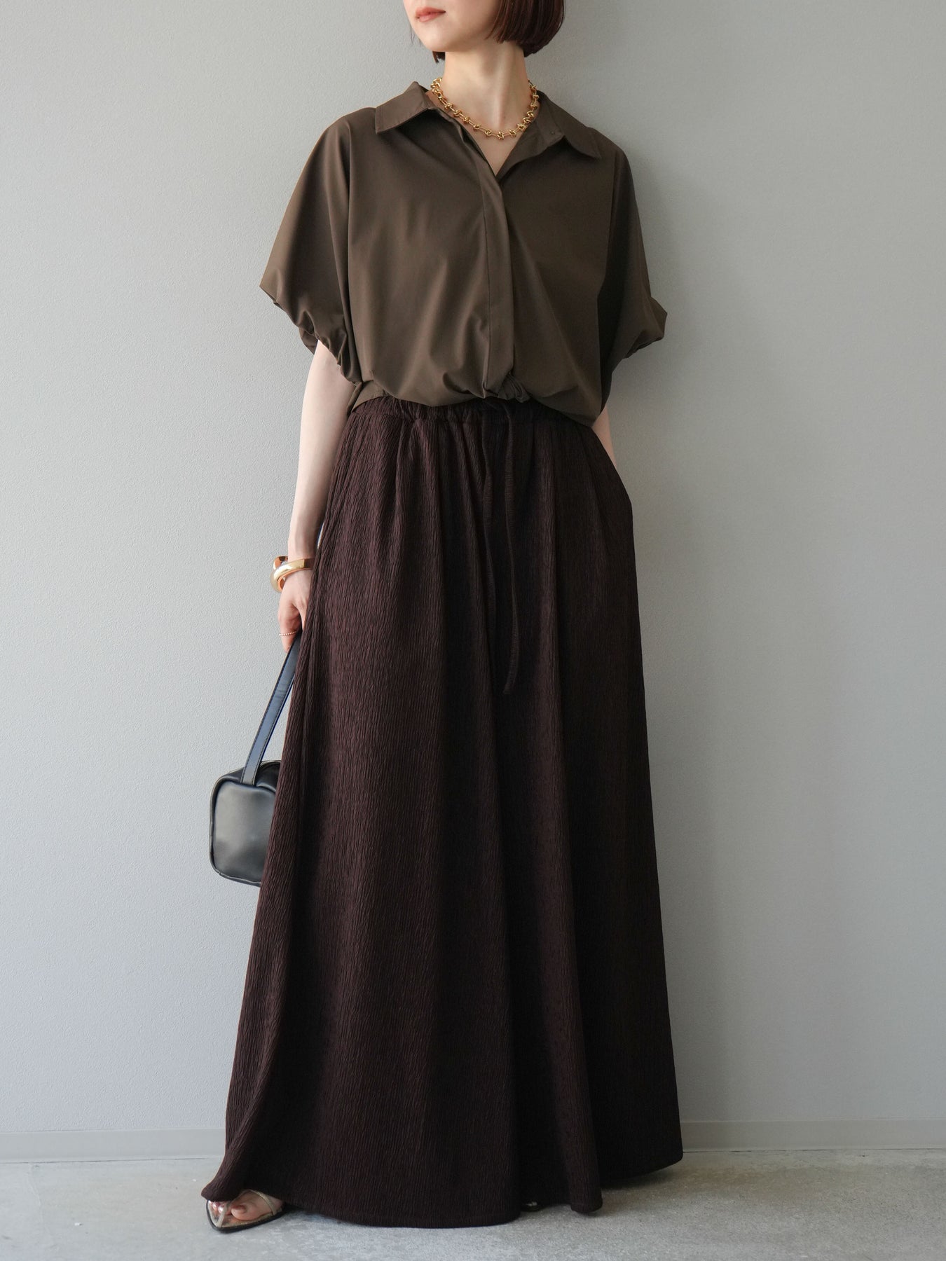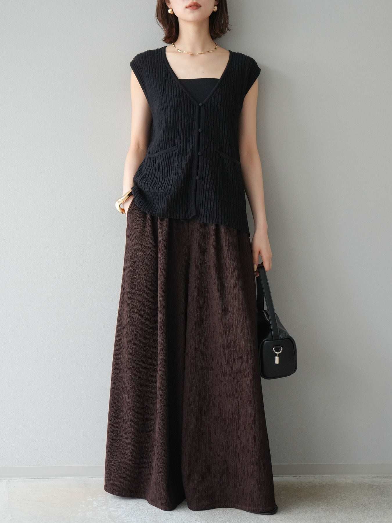 凹凸感のある表面が特徴の楊柳素材を使用した、涼しげな風合いのバギーパンツ。柔らかく軽やかな履き心地で、暑い季節にも快適に着用できます。 ウエストは総ゴム+ドローストリング仕様でリラクシーなフィット感。たっぷりと生地を使ったボリューム感のあるワイドシルエットが、動くたびに揺れ、抜け感のあるスタイルを演出します。 シンプルなトップスを合わせるだけで存在感のある着こなしが完成する、デイリーに活躍する1本です。