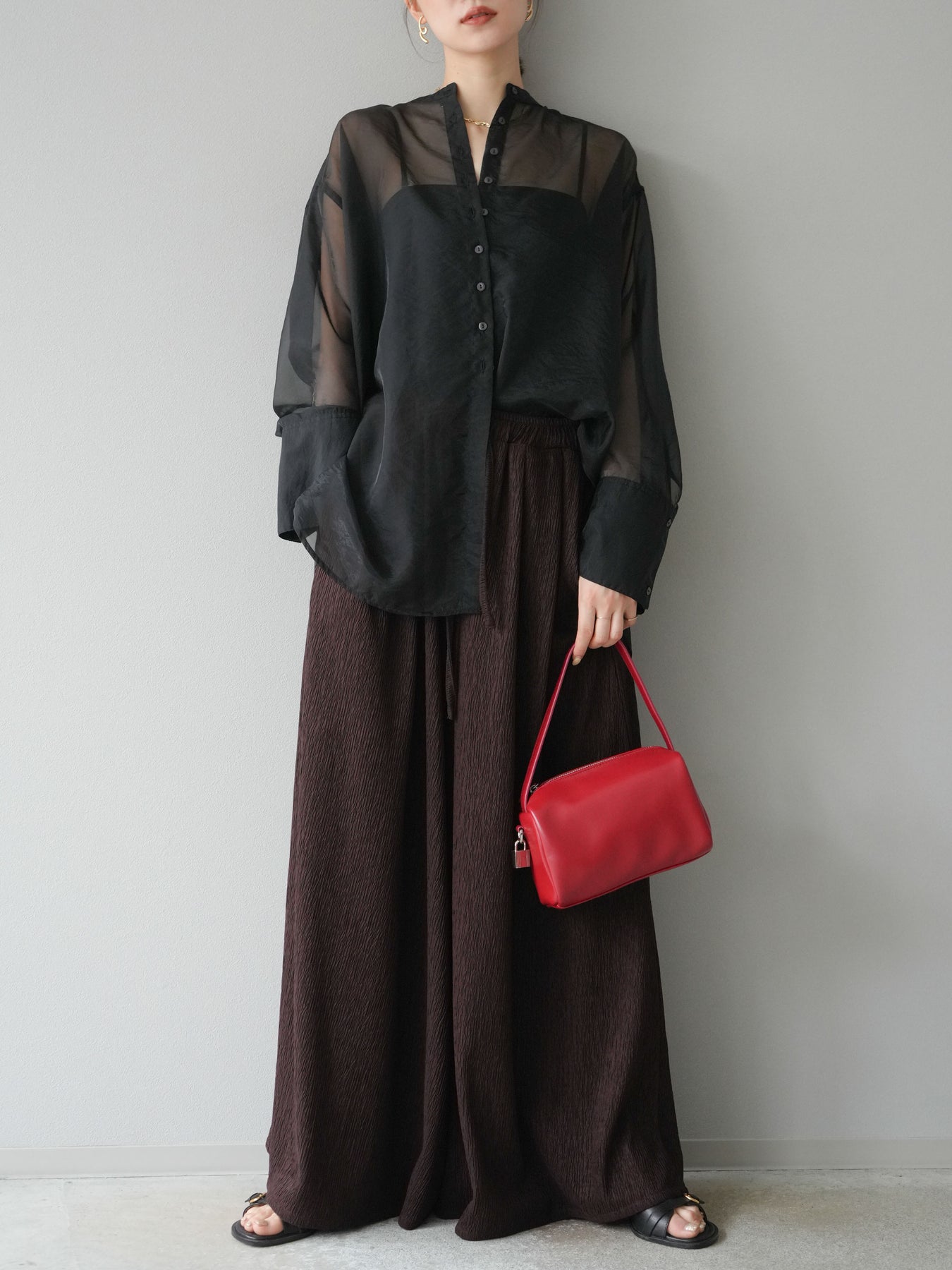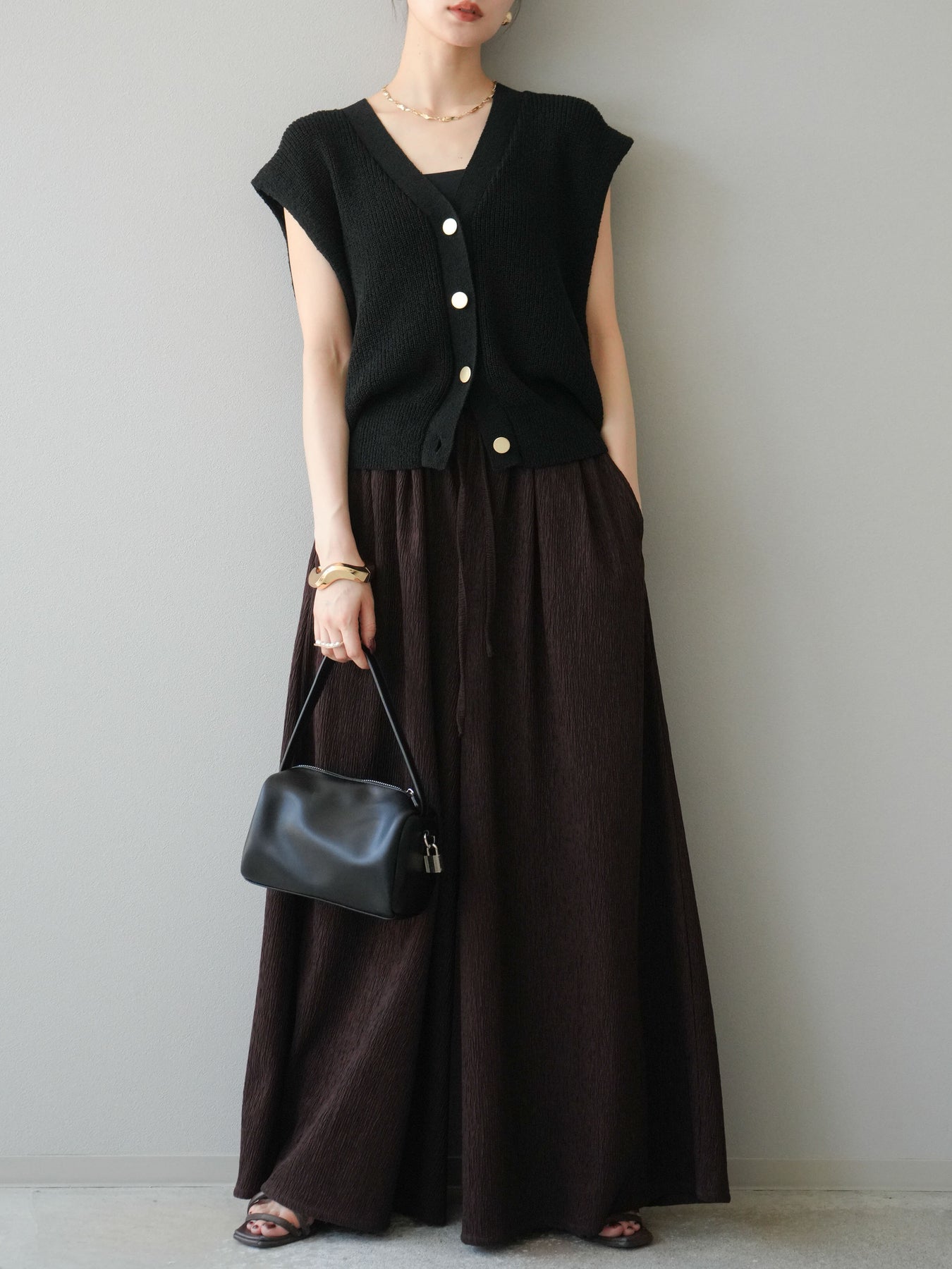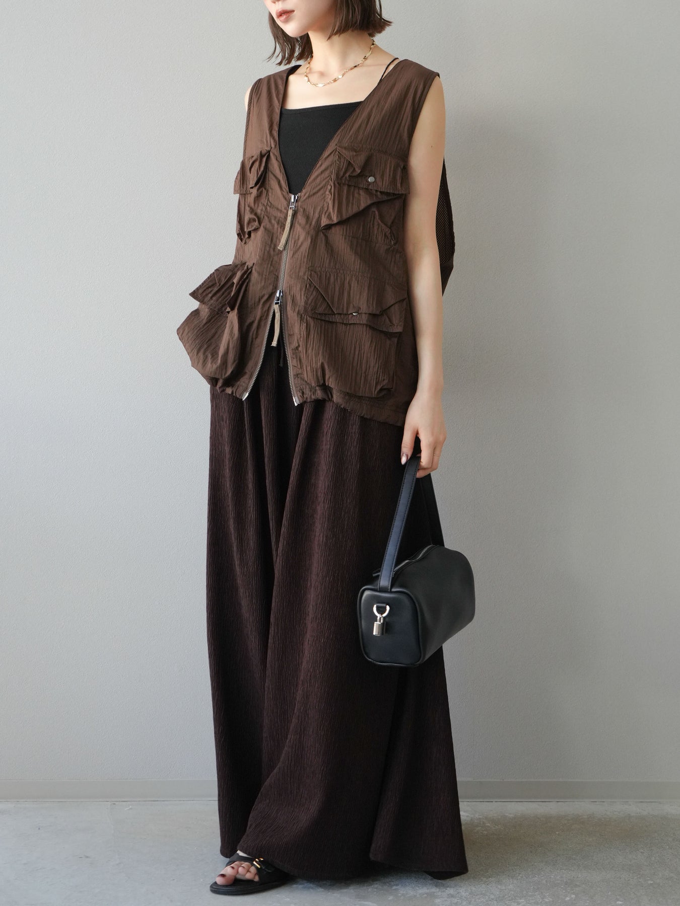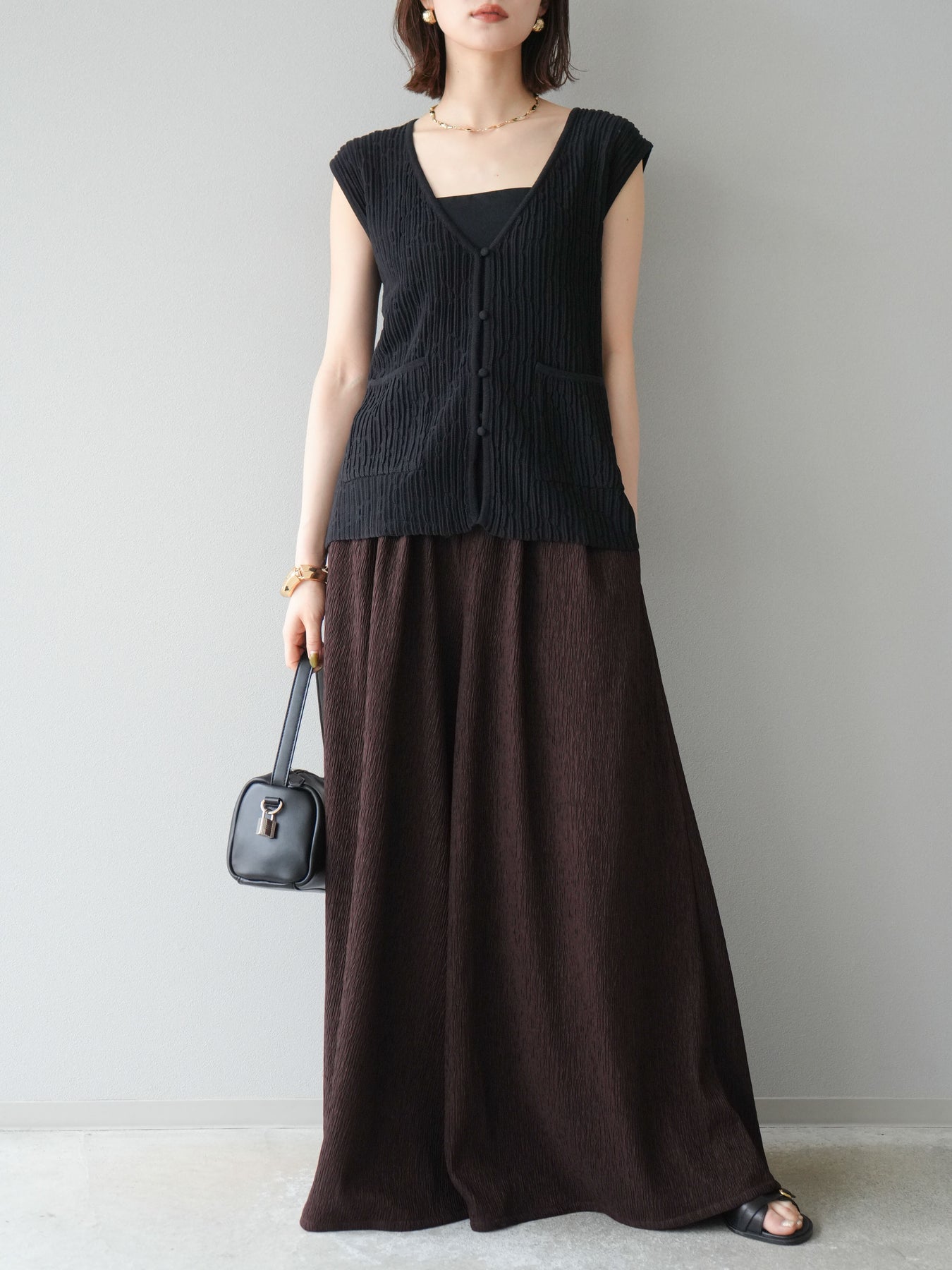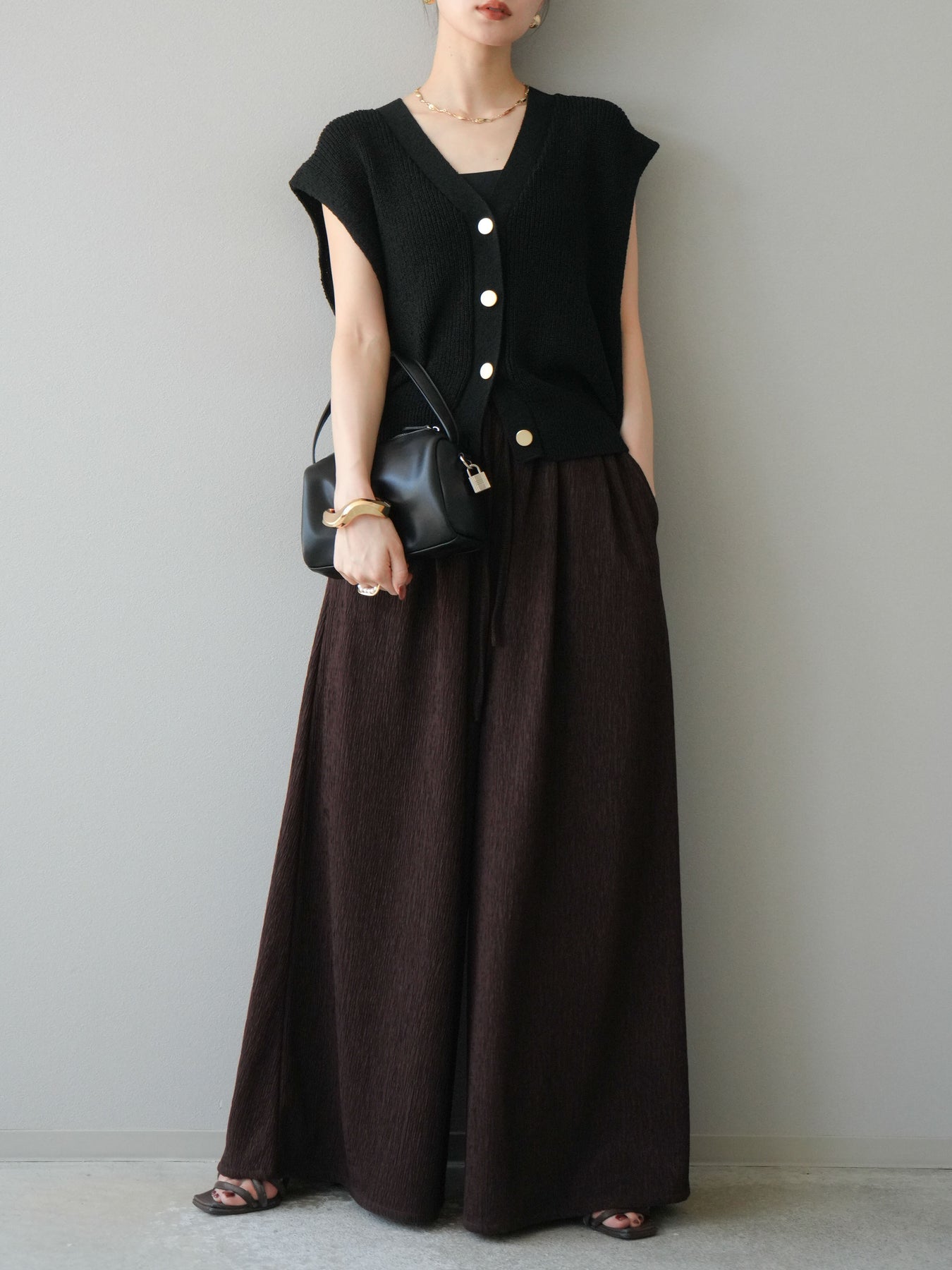 凹凸感のある表面が特徴の楊柳素材を使用した、涼しげな風合いのバギーパンツ。柔らかく軽やかな履き心地で、暑い季節にも快適に着用できます。 ウエストは総ゴム+ドローストリング仕様でリラクシーなフィット感。たっぷりと生地を使ったボリューム感のあるワイドシルエットが、動くたびに揺れ、抜け感のあるスタイルを演出します。 シンプルなトップスを合わせるだけで存在感のある着こなしが完成する、デイリーに活躍する1本です。