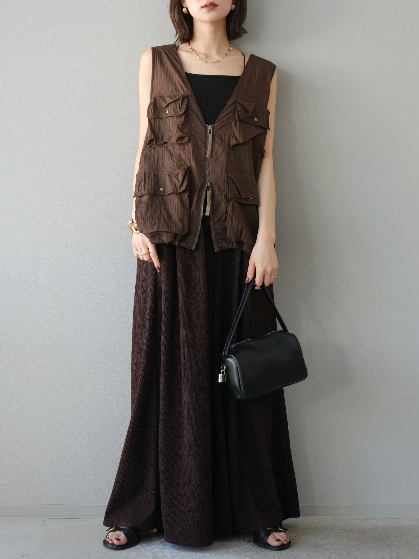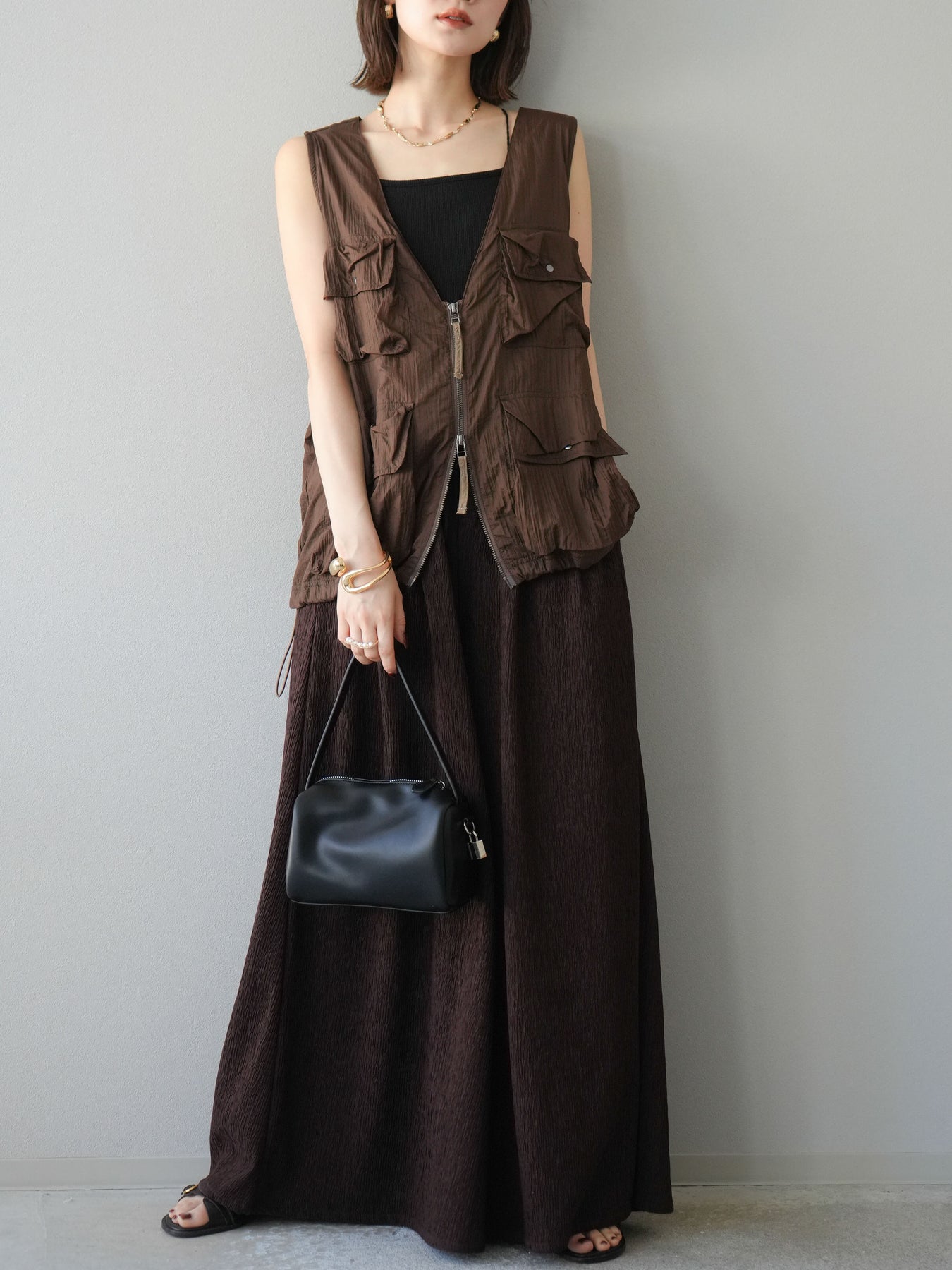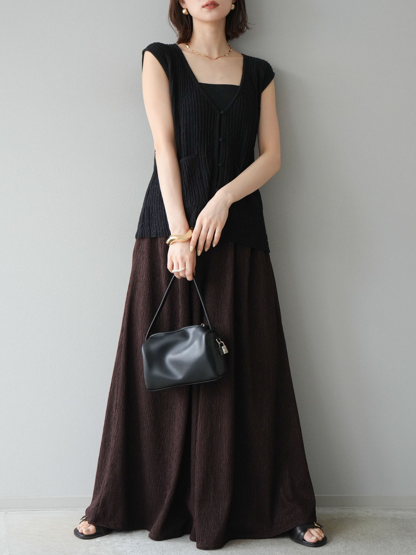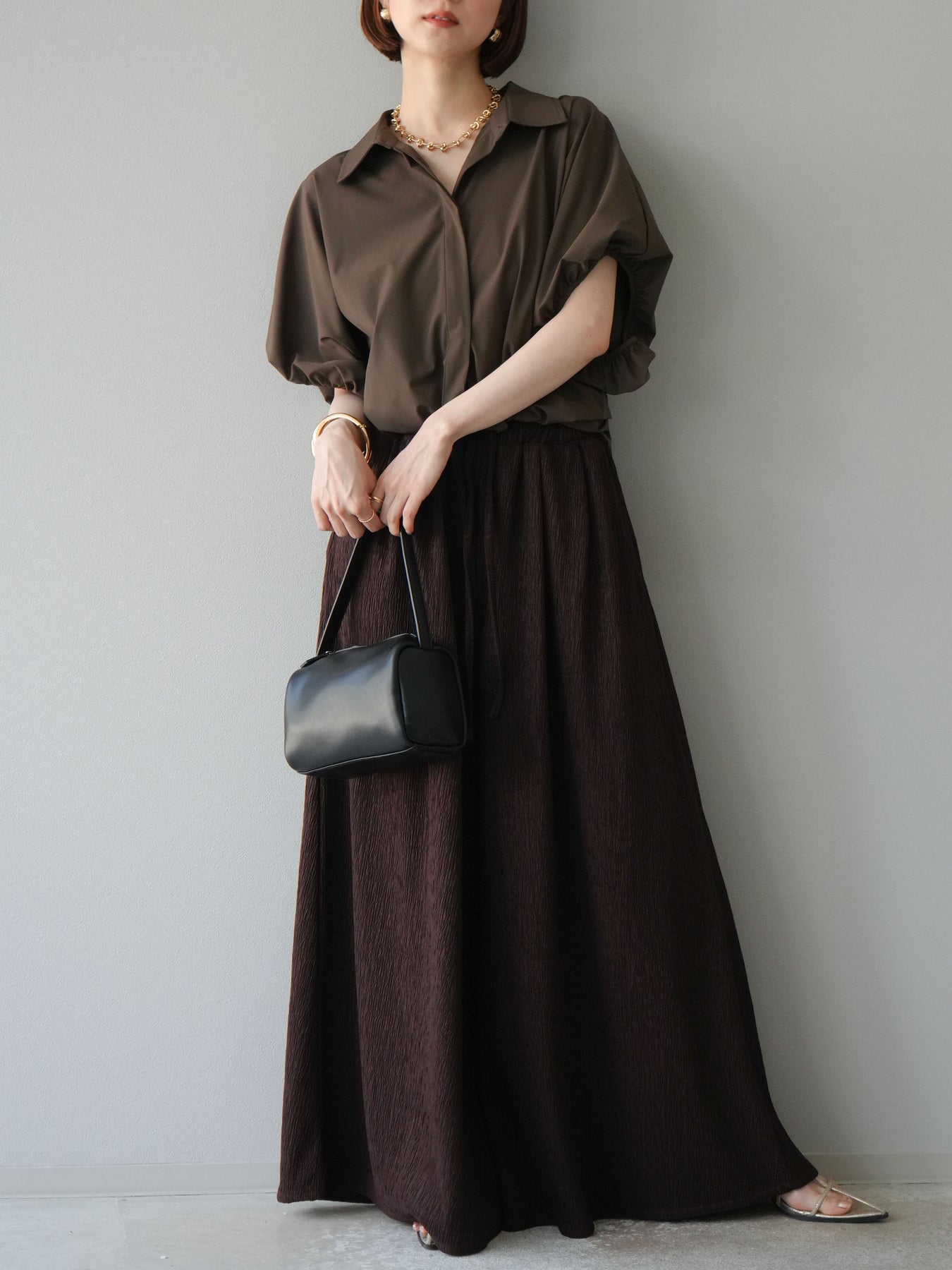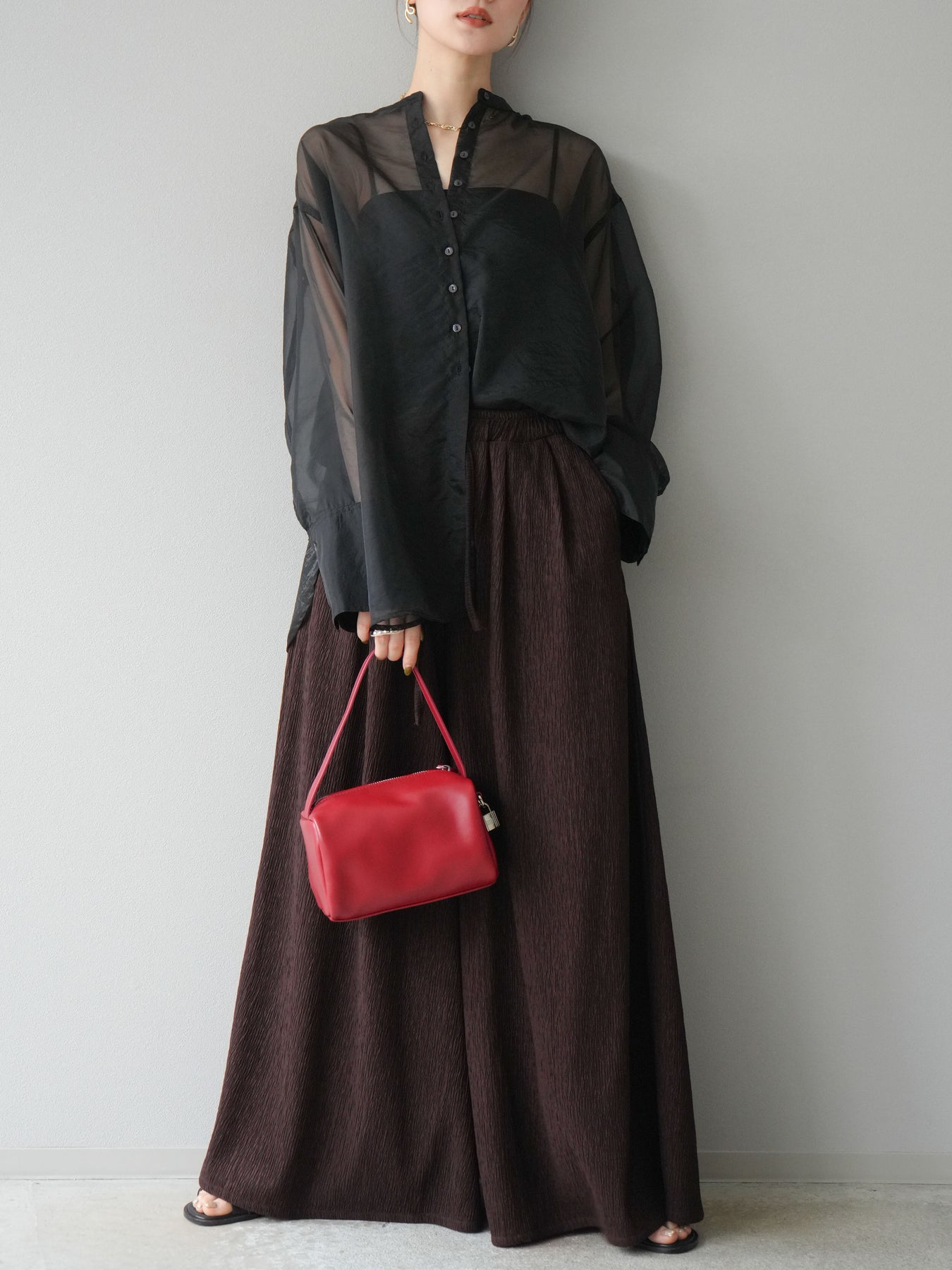 凹凸感のある表面が特徴の楊柳素材を使用した、涼しげな風合いのバギーパンツ。柔らかく軽やかな履き心地で、暑い季節にも快適に着用できます。 ウエストは総ゴム+ドローストリング仕様でリラクシーなフィット感。たっぷりと生地を使ったボリューム感のあるワイドシルエットが、動くたびに揺れ、抜け感のあるスタイルを演出します。 シンプルなトップスを合わせるだけで存在感のある着こなしが完成する、デイリーに活躍する1本です。