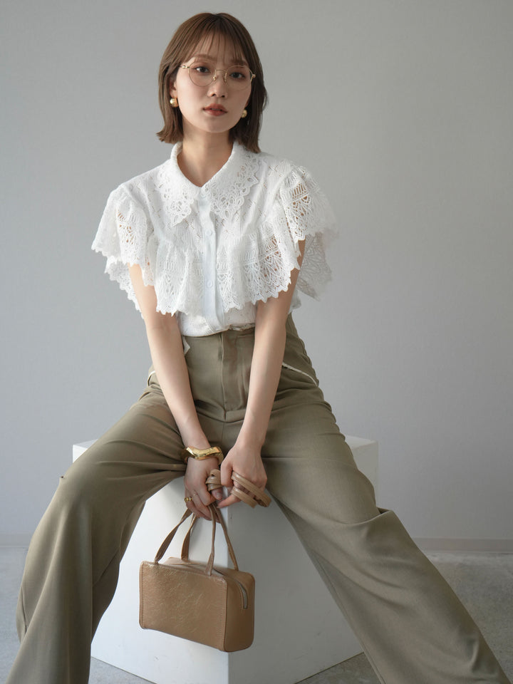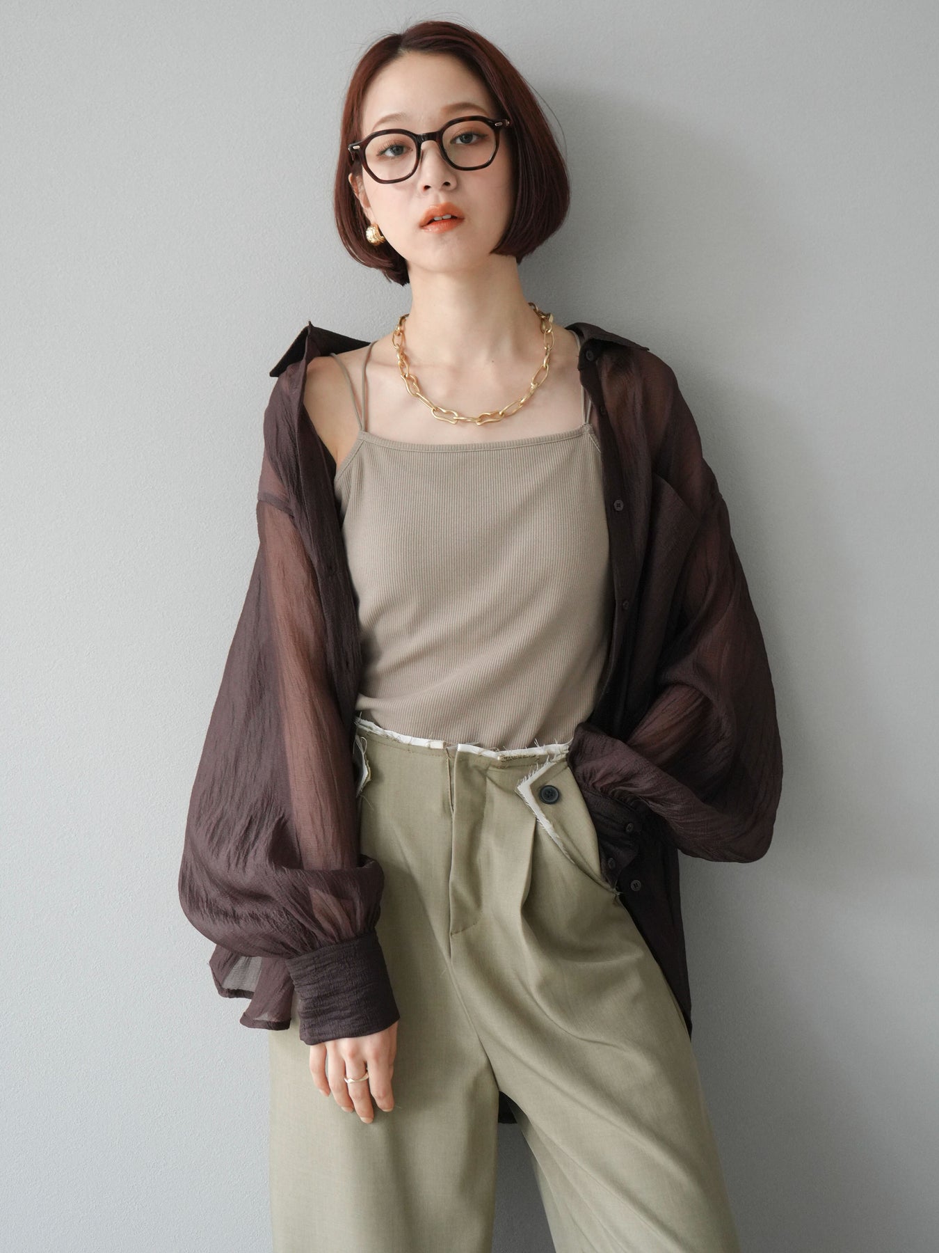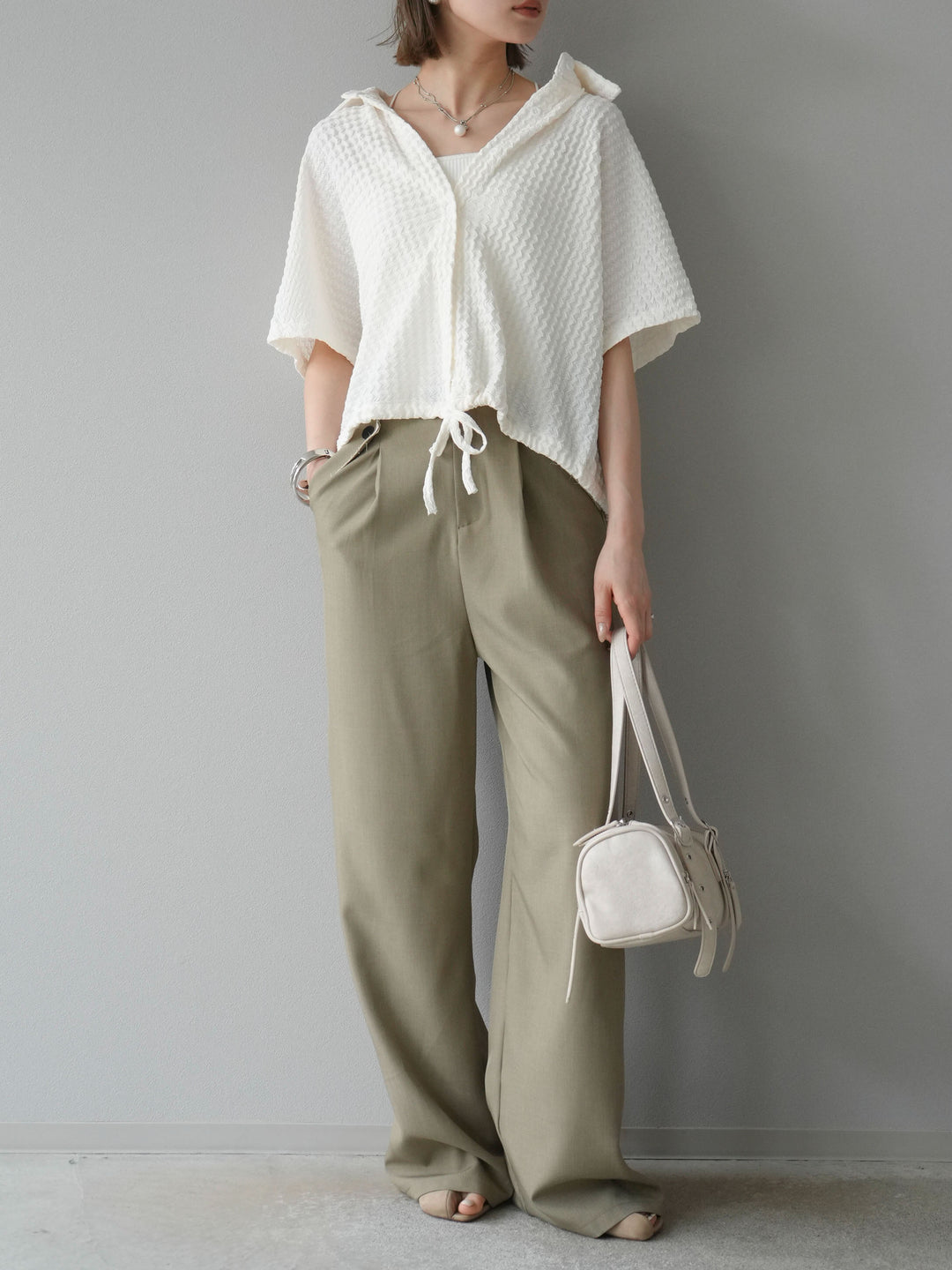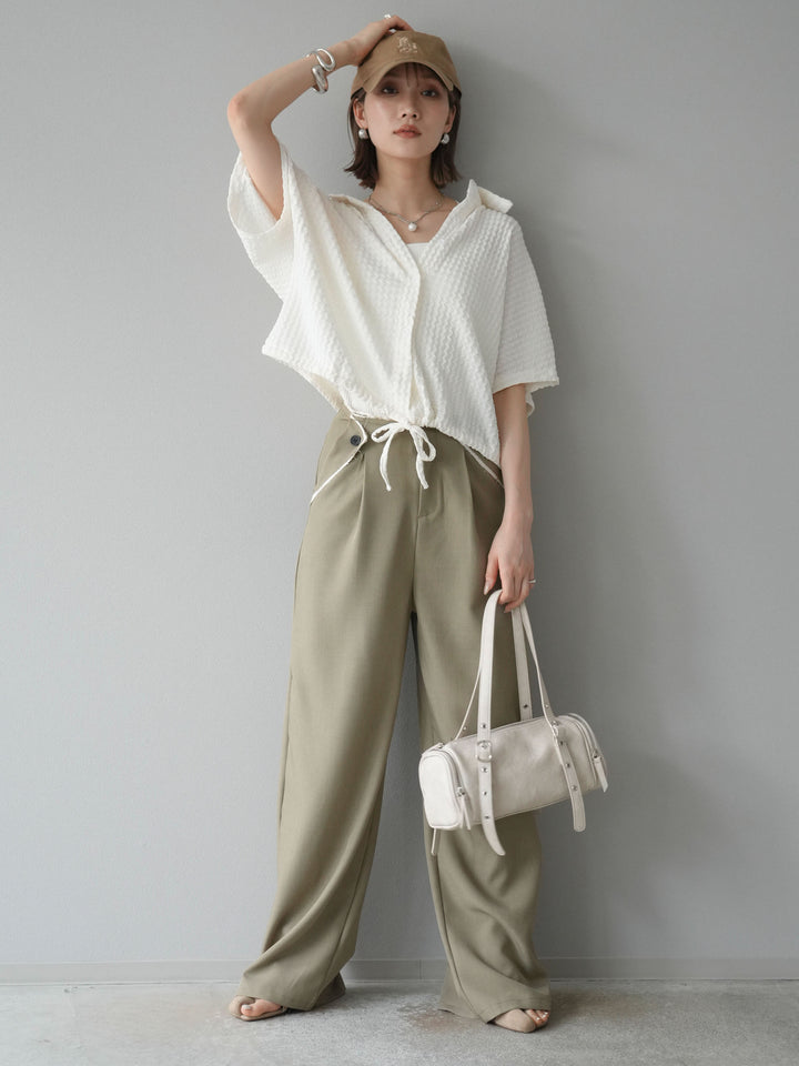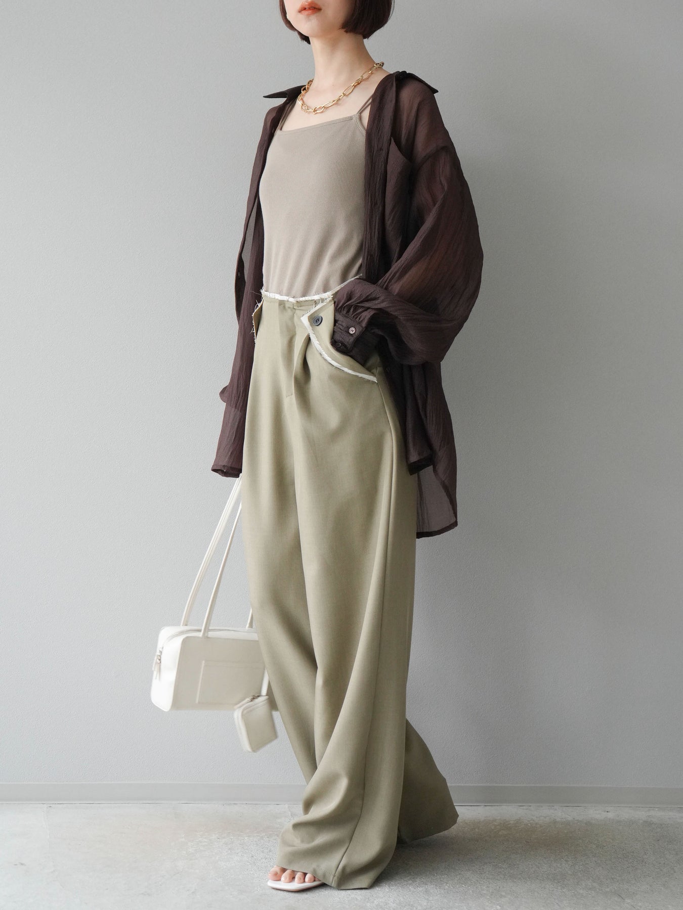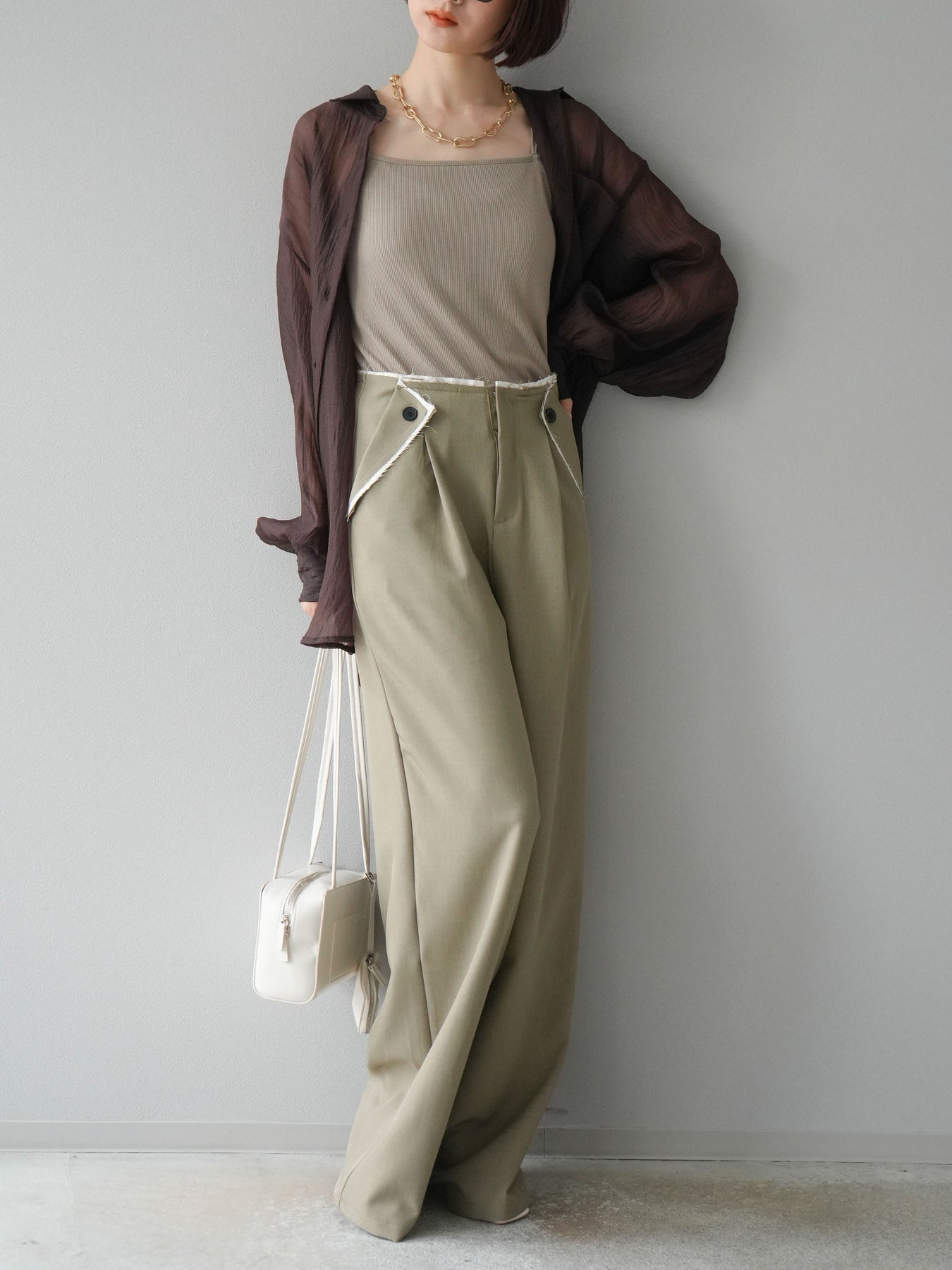ウエスト部分のカットオフ風ディテールとレイヤード見えのデザインが目を惹く、モード感漂うワイドパンツ。すっきりとしたハイウエストとセンタープレスがスタイルアップを叶え、きちんと感と抜け感を両立。シンプルトップスを合わせるだけで、こなれた印象に仕上がります。 ※ボトムス、キャミソール(インナー)以外の商品は一律でインナーは付属していません