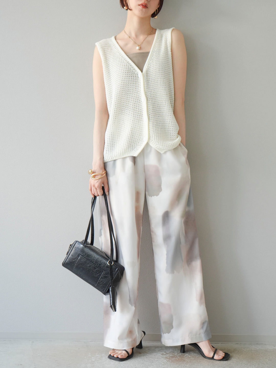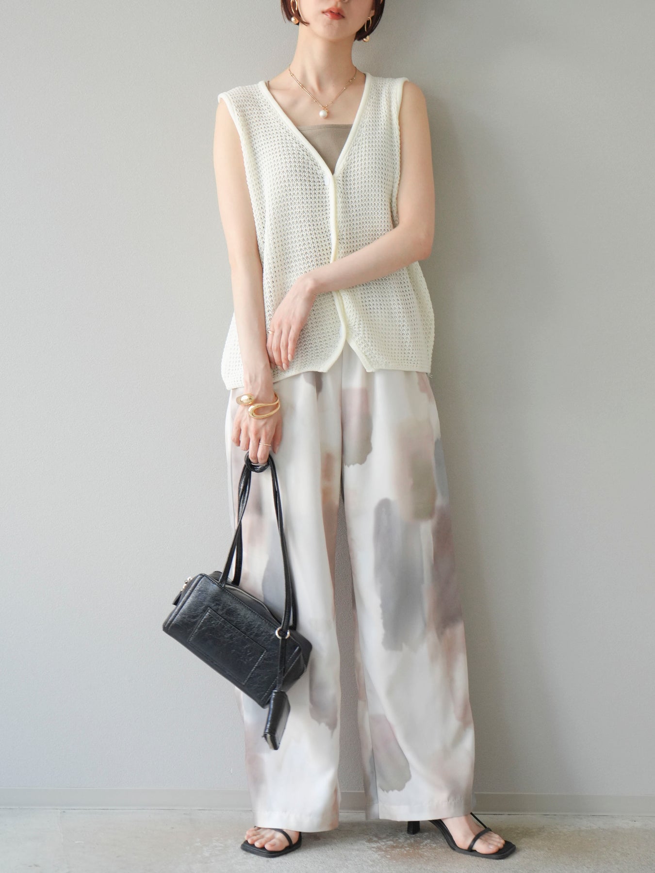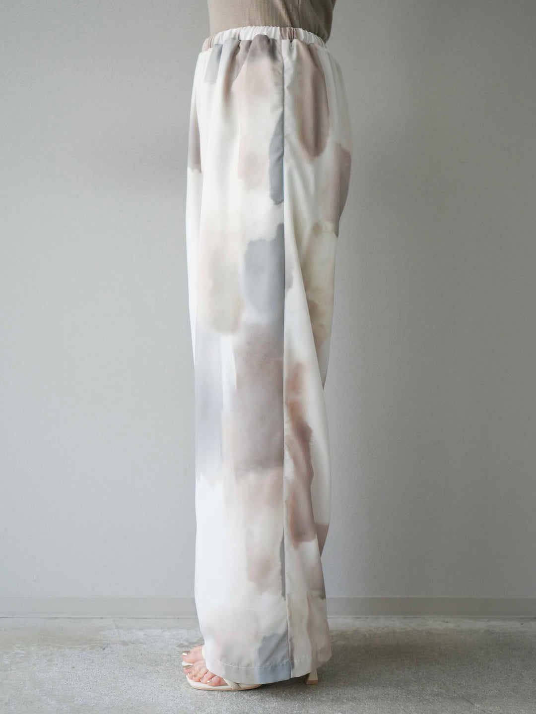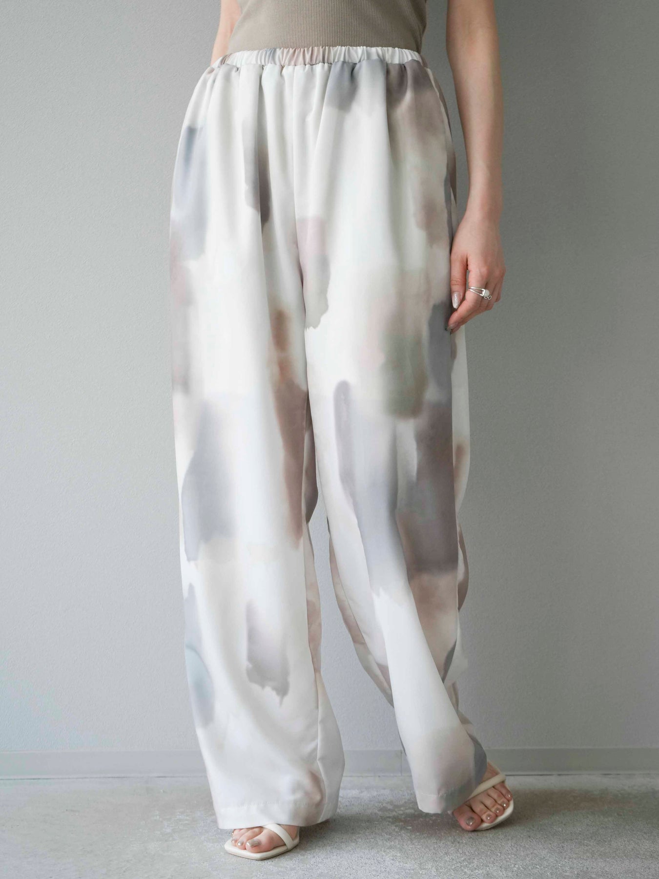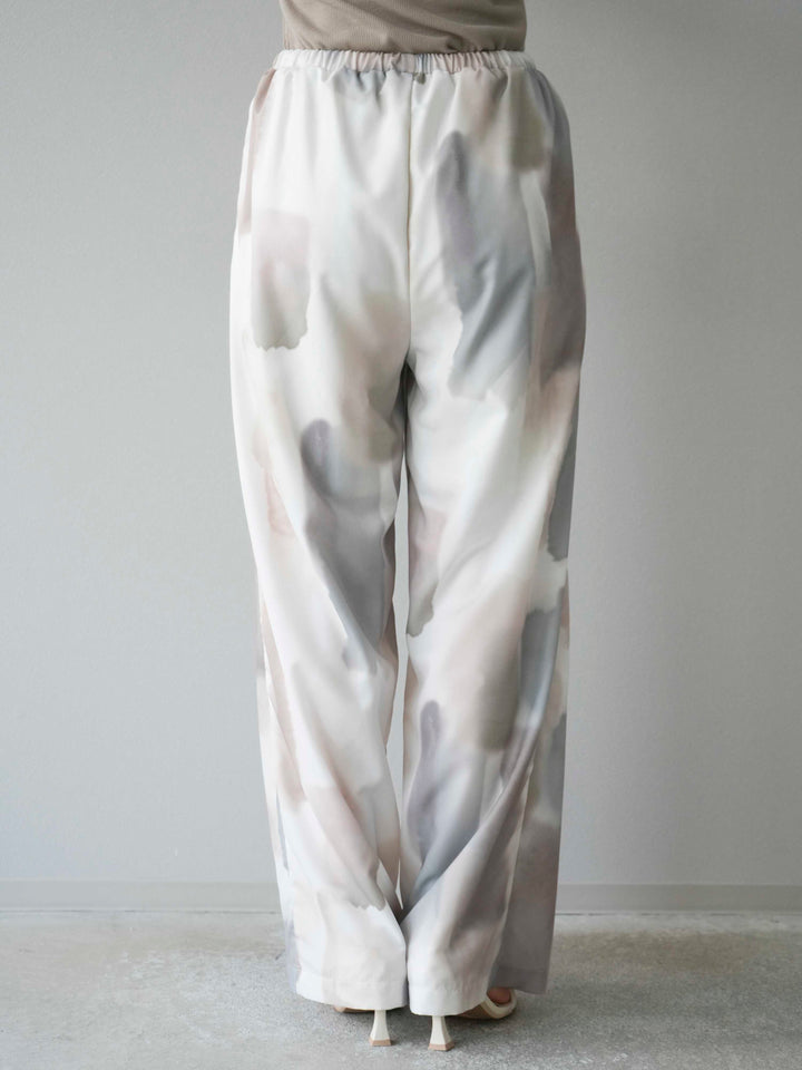 アートのような水彩プリントが印象的な、水彩アートイージーパンツ。しっとりと落ち感のある素材とストレートシルエットが、動くたびに美しい揺れ感を演出します。ウエストは総ゴム仕様でリラックスした穿き心地ながら、スタイルアップも叶う一枚。シンプルなトップスと合わせるだけで、洗練された大人のモードスタイルが完成します。同柄のワンピースやビスチェとのセットアップコーデもおすすめ。 ※ボトムス、キャミソール(インナー)以外の商品は一律でインナーは付属していません。