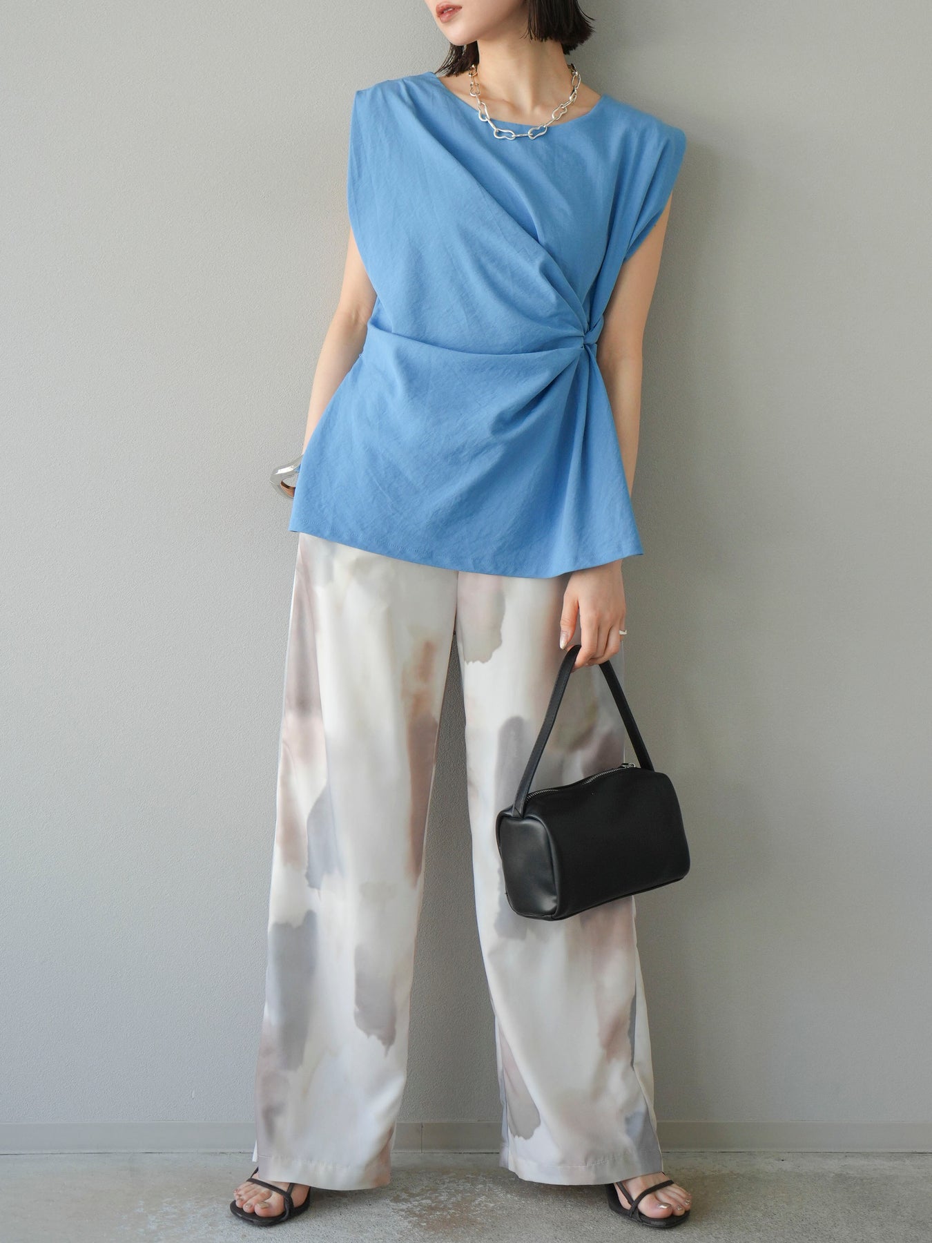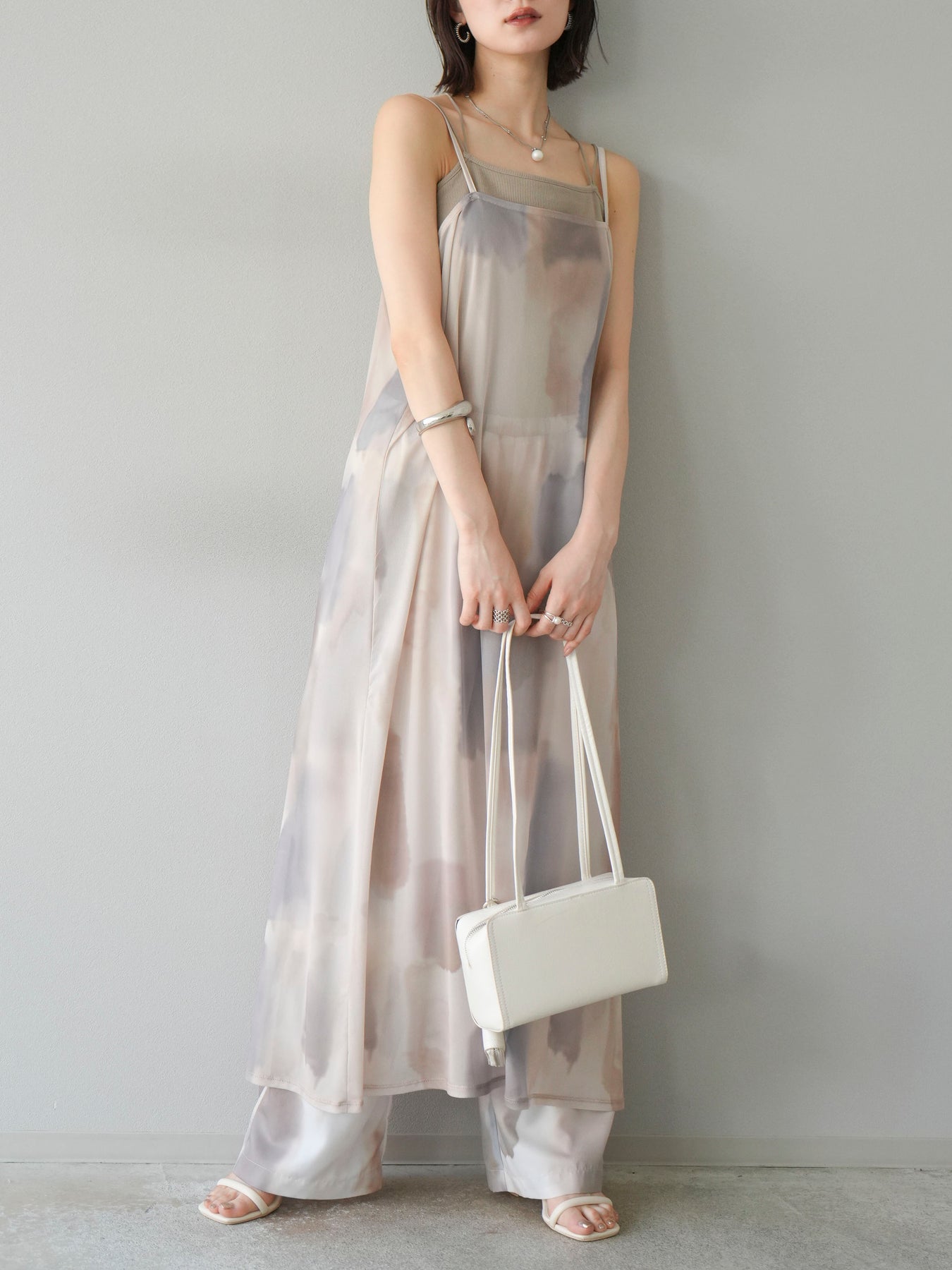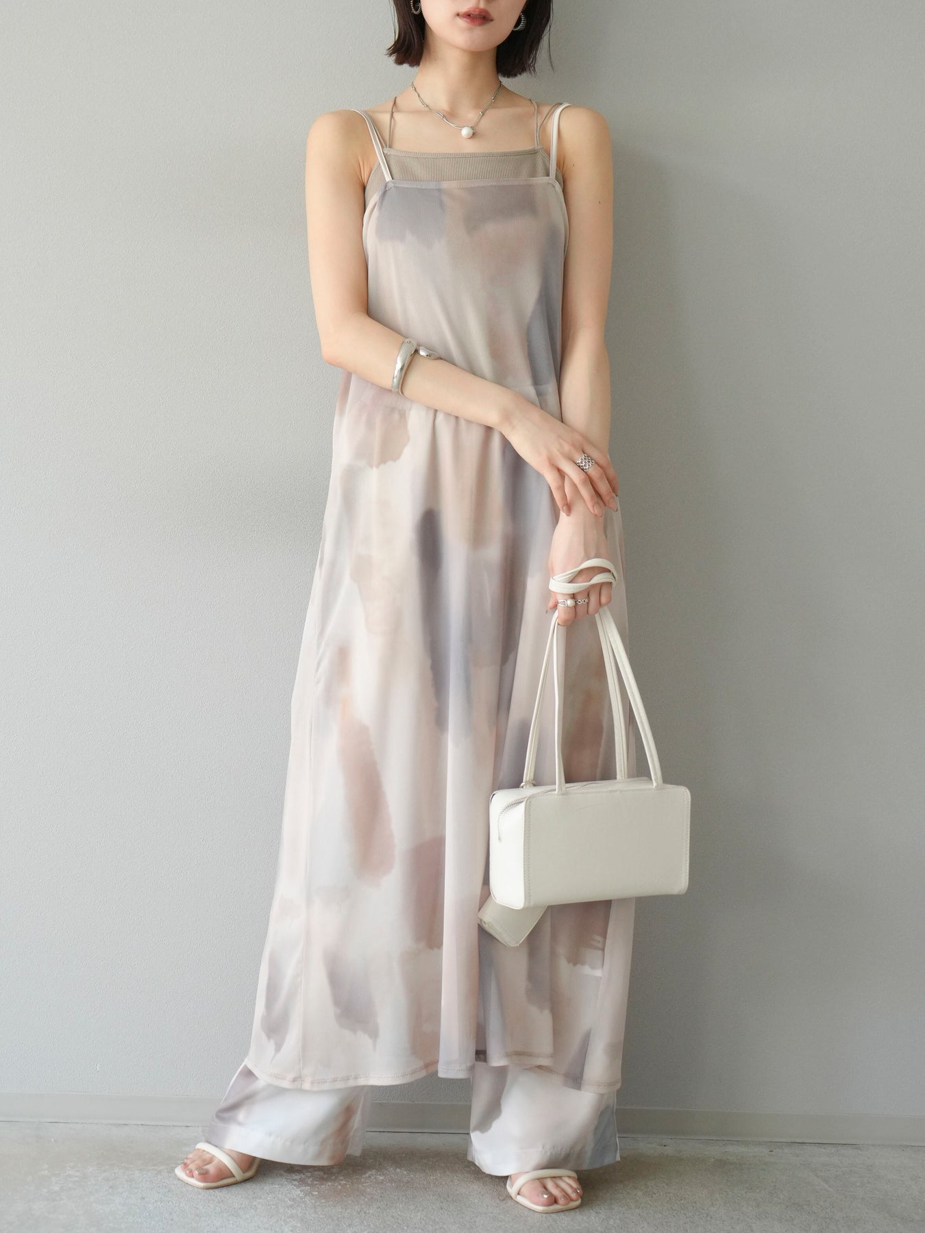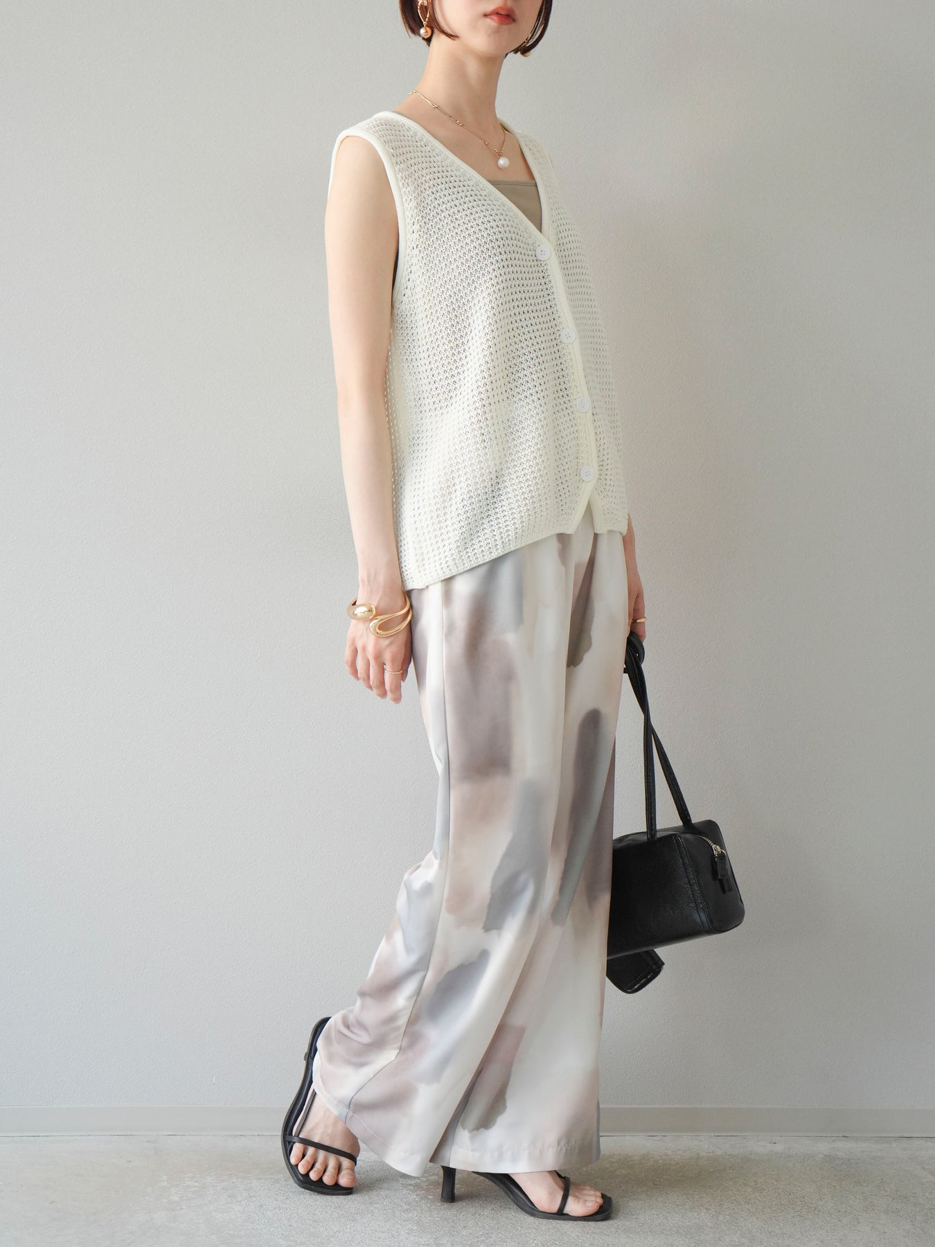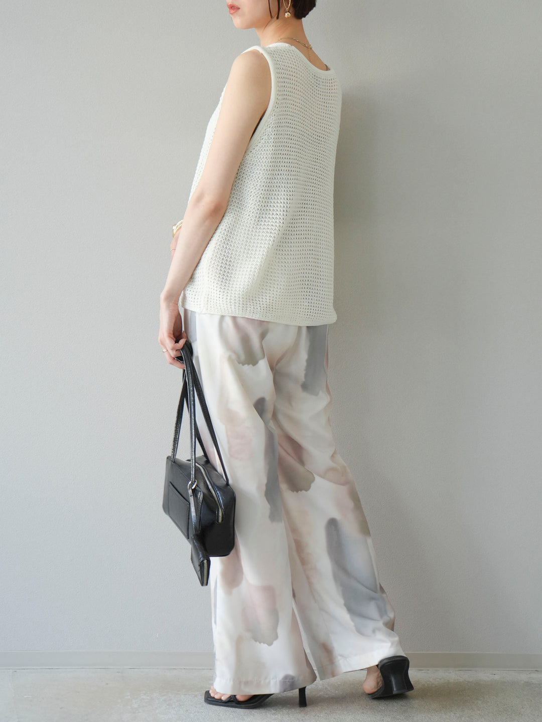 アートのような水彩プリントが印象的な、水彩アートイージーパンツ。しっとりと落ち感のある素材とストレートシルエットが、動くたびに美しい揺れ感を演出します。ウエストは総ゴム仕様でリラックスした穿き心地ながら、スタイルアップも叶う一枚。シンプルなトップスと合わせるだけで、洗練された大人のモードスタイルが完成します。同柄のワンピースやビスチェとのセットアップコーデもおすすめ。 ※ボトムス、キャミソール(インナー)以外の商品は一律でインナーは付属していません。