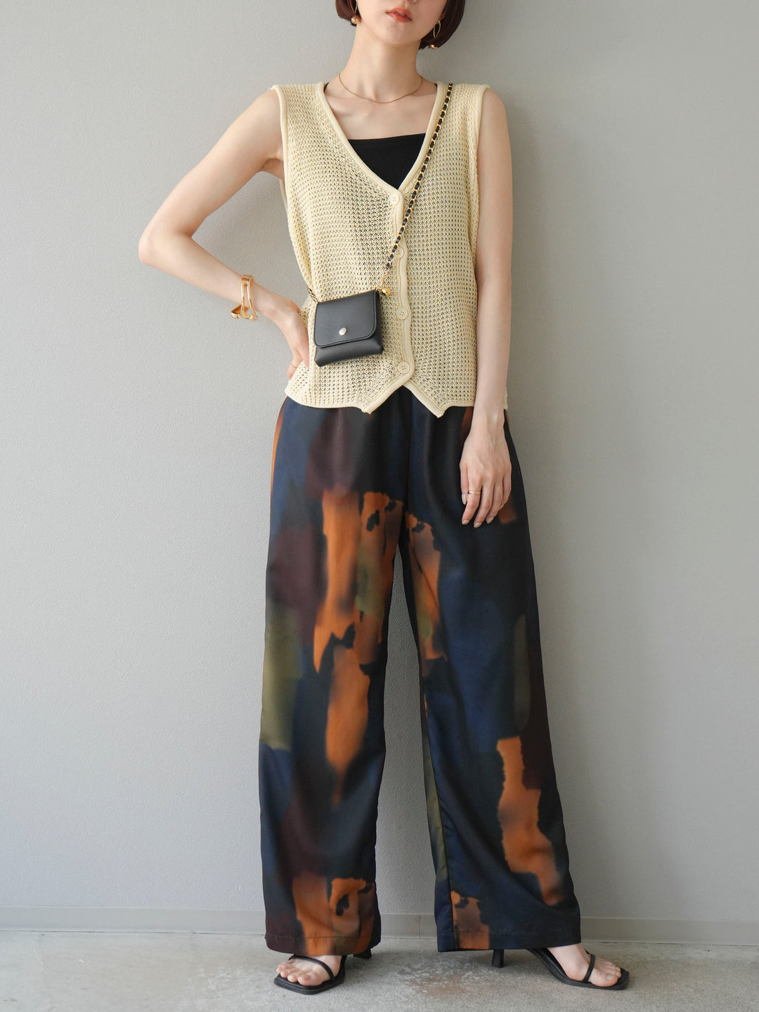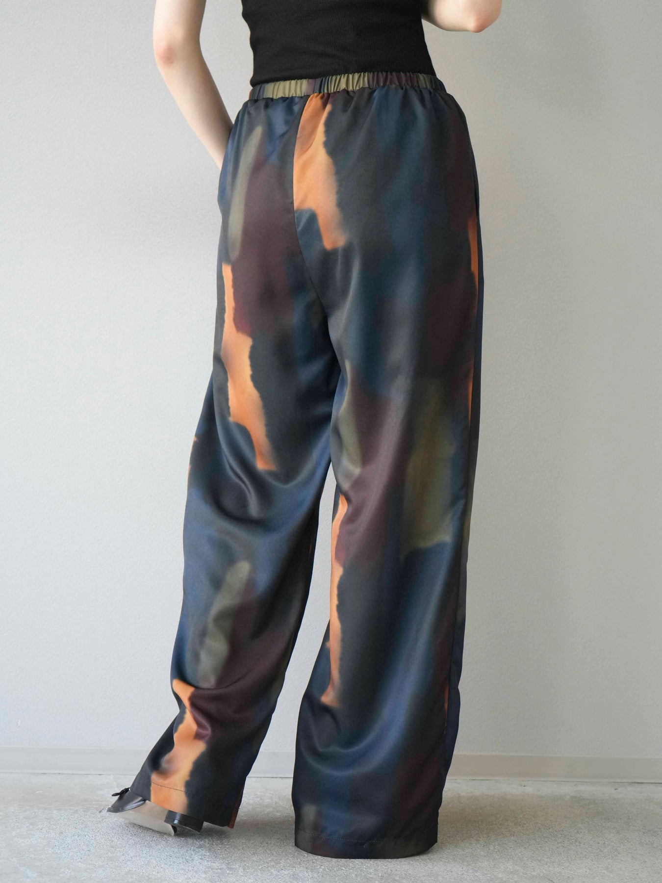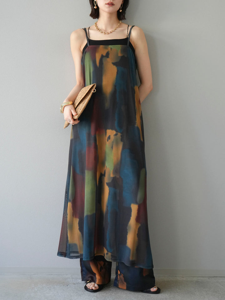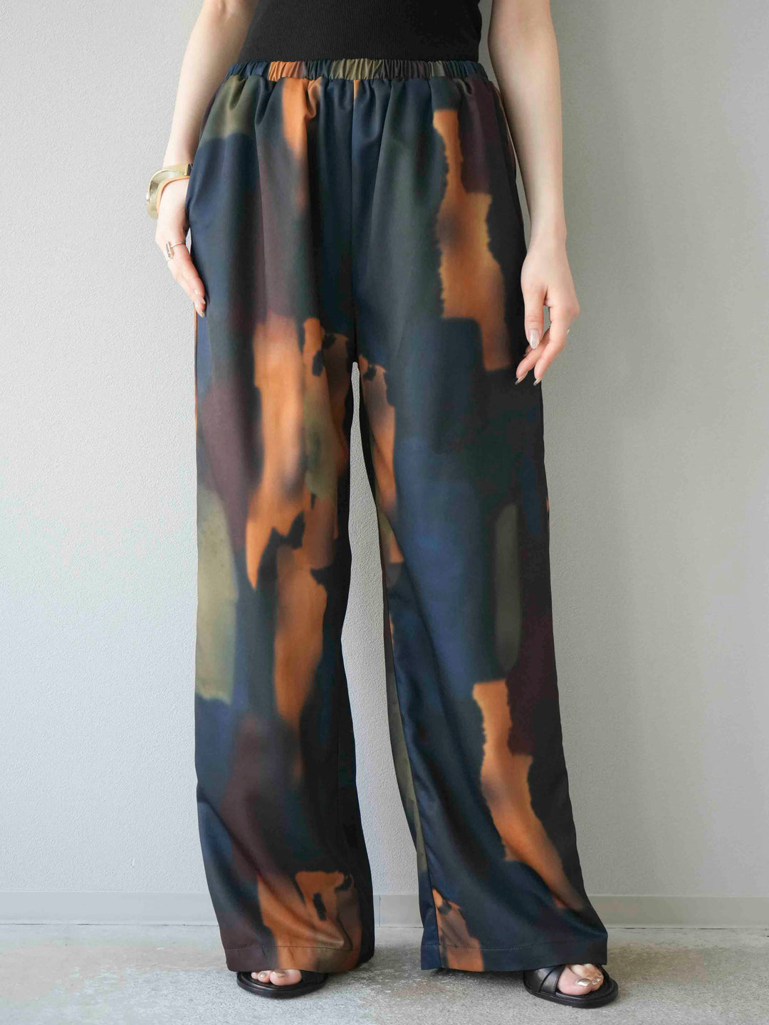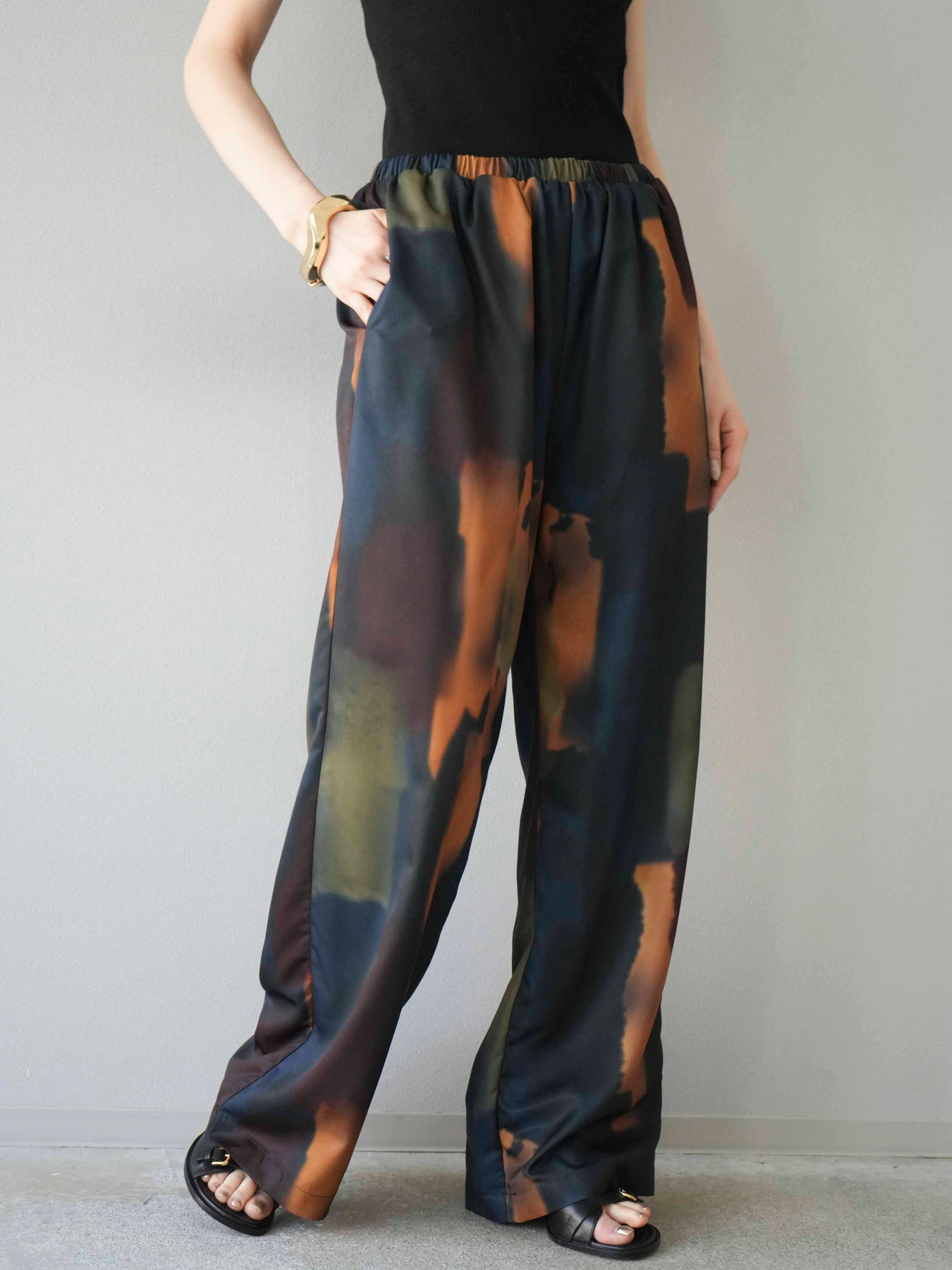 アートのような水彩プリントが印象的な、水彩アートイージーパンツ。しっとりと落ち感のある素材とストレートシルエットが、動くたびに美しい揺れ感を演出します。ウエストは総ゴム仕様でリラックスした穿き心地ながら、スタイルアップも叶う一枚。シンプルなトップスと合わせるだけで、洗練された大人のモードスタイルが完成します。同柄のワンピースやビスチェとのセットアップコーデもおすすめ。 ※ボトムス、キャミソール(インナー)以外の商品は一律でインナーは付属していません。