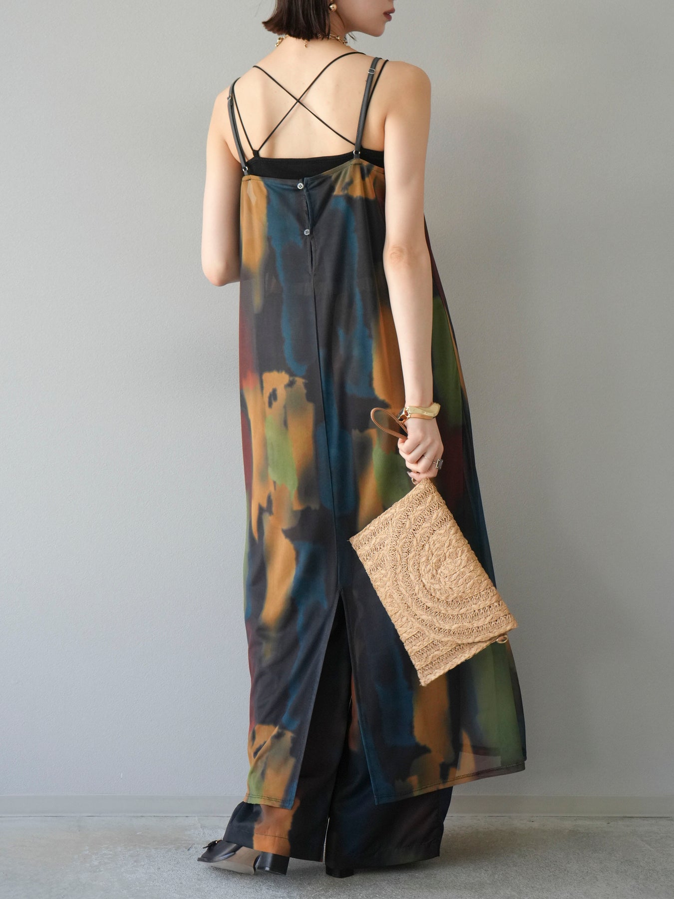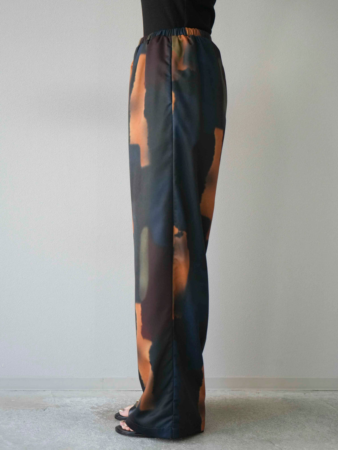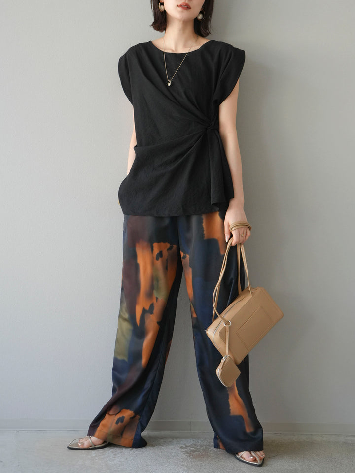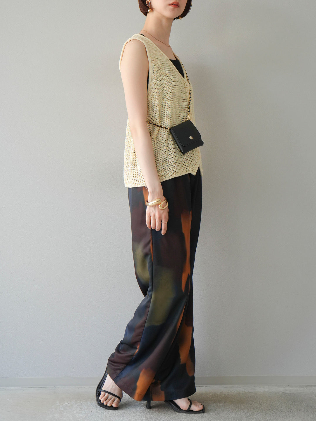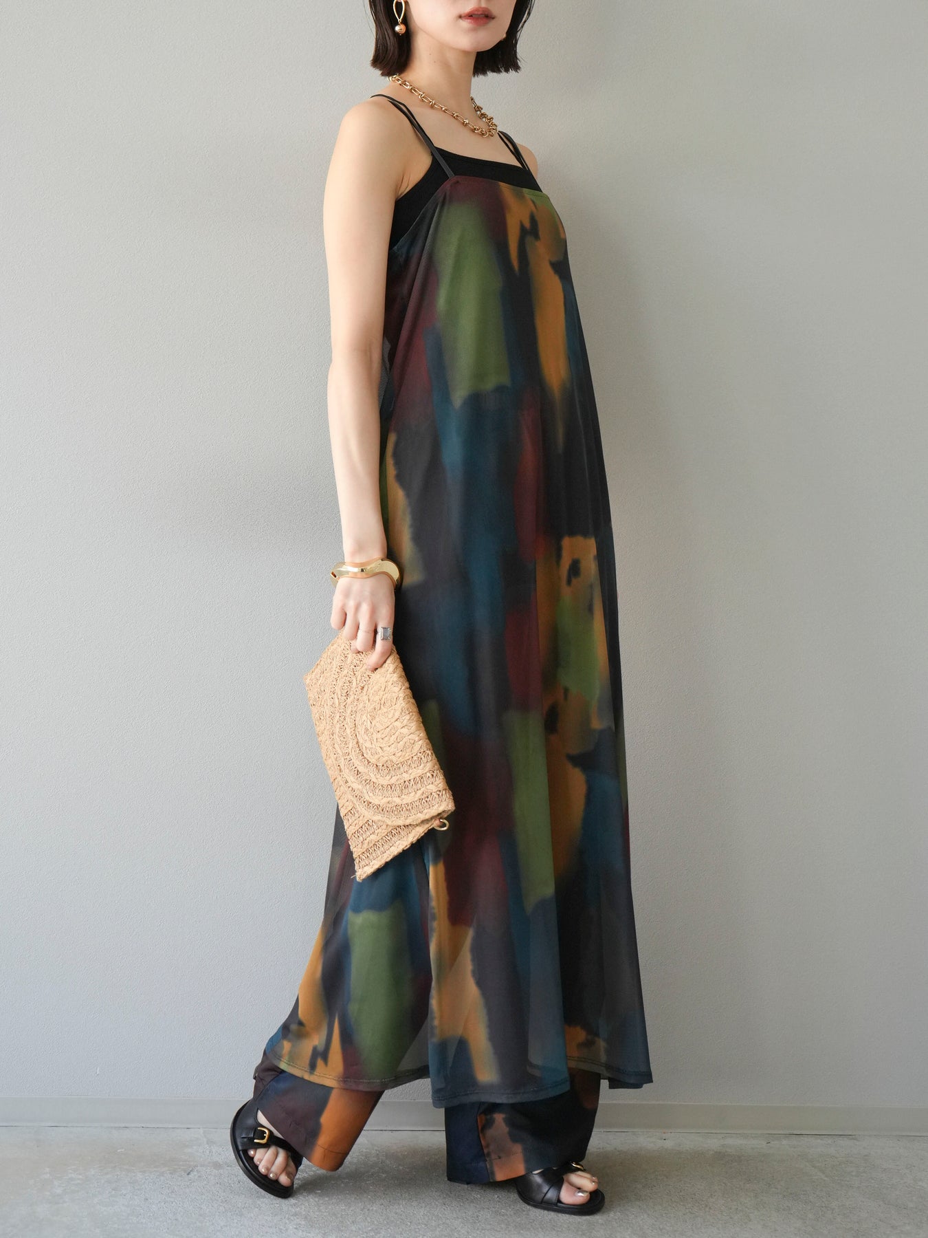 アートのような水彩プリントが印象的な、水彩アートイージーパンツ。しっとりと落ち感のある素材とストレートシルエットが、動くたびに美しい揺れ感を演出します。ウエストは総ゴム仕様でリラックスした穿き心地ながら、スタイルアップも叶う一枚。シンプルなトップスと合わせるだけで、洗練された大人のモードスタイルが完成します。同柄のワンピースやビスチェとのセットアップコーデもおすすめ。 ※ボトムス、キャミソール(インナー)以外の商品は一律でインナーは付属していません。