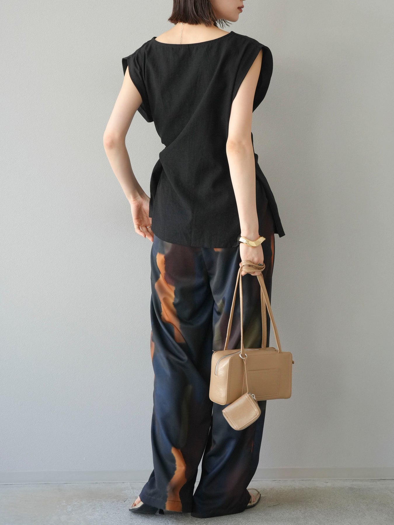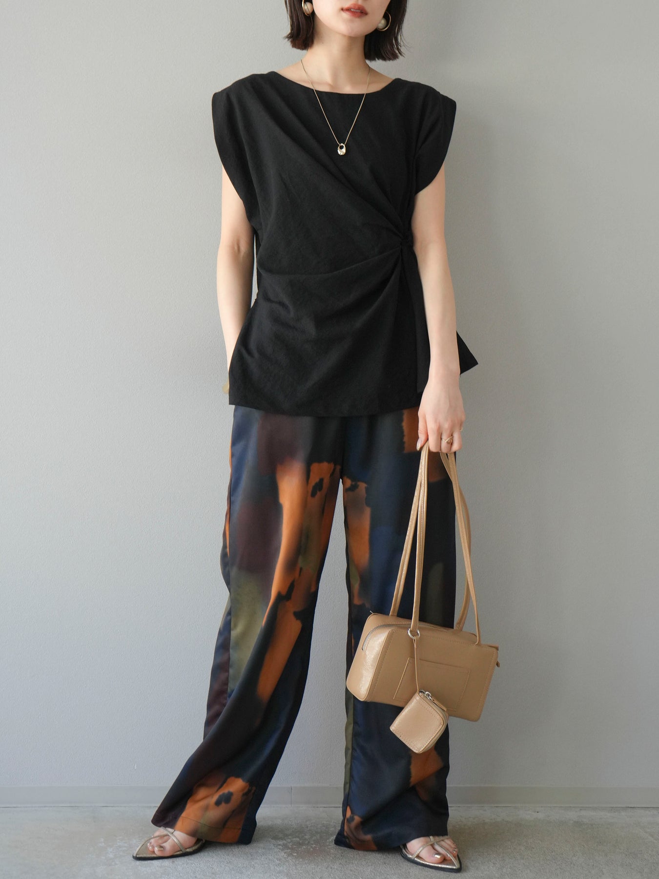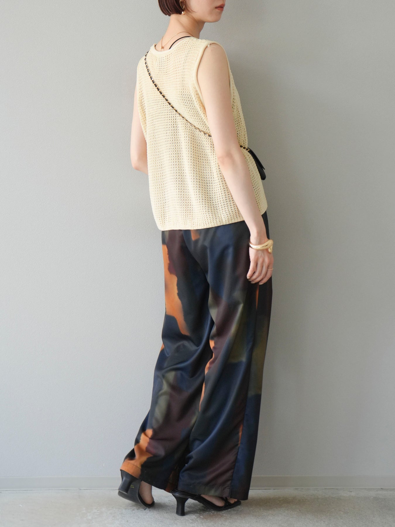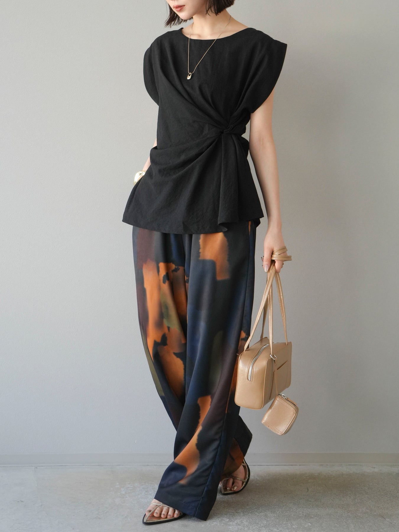 アートのような水彩プリントが印象的な、水彩アートイージーパンツ。しっとりと落ち感のある素材とストレートシルエットが、動くたびに美しい揺れ感を演出します。ウエストは総ゴム仕様でリラックスした穿き心地ながら、スタイルアップも叶う一枚。シンプルなトップスと合わせるだけで、洗練された大人のモードスタイルが完成します。同柄のワンピースやビスチェとのセットアップコーデもおすすめ。 ※ボトムス、キャミソール(インナー)以外の商品は一律でインナーは付属していません。