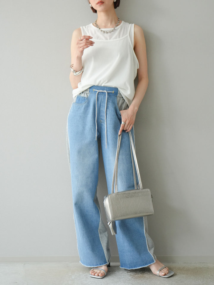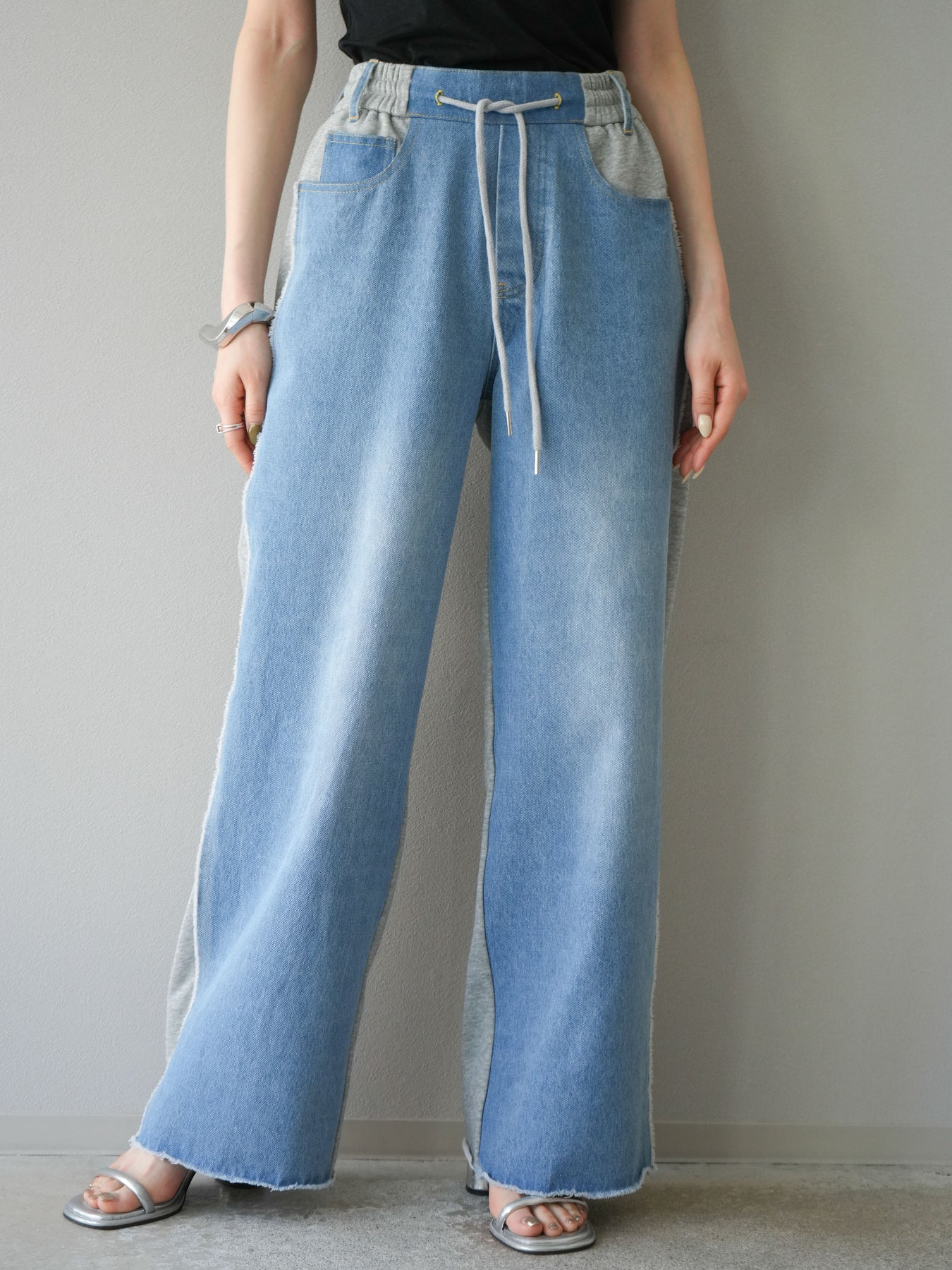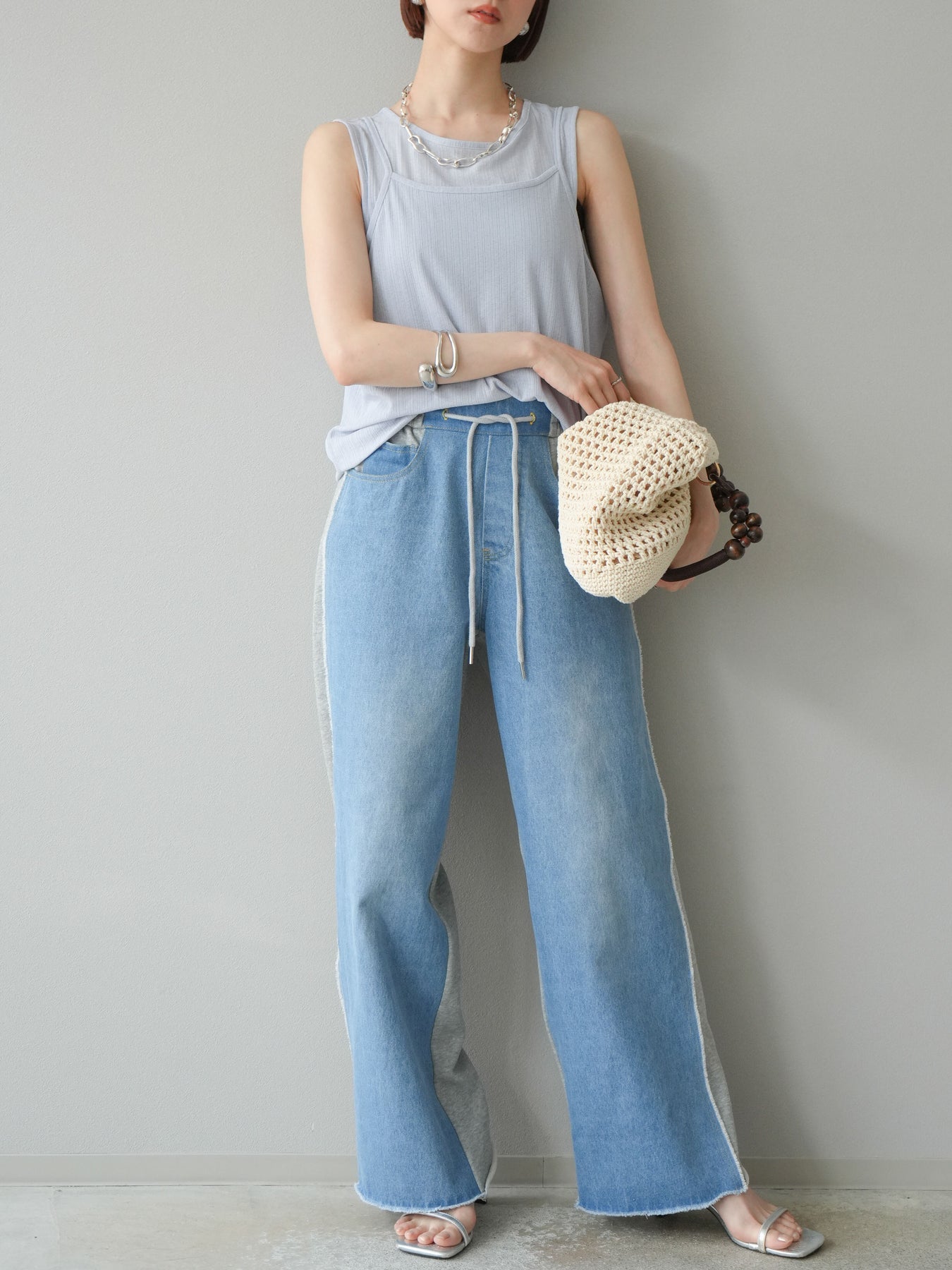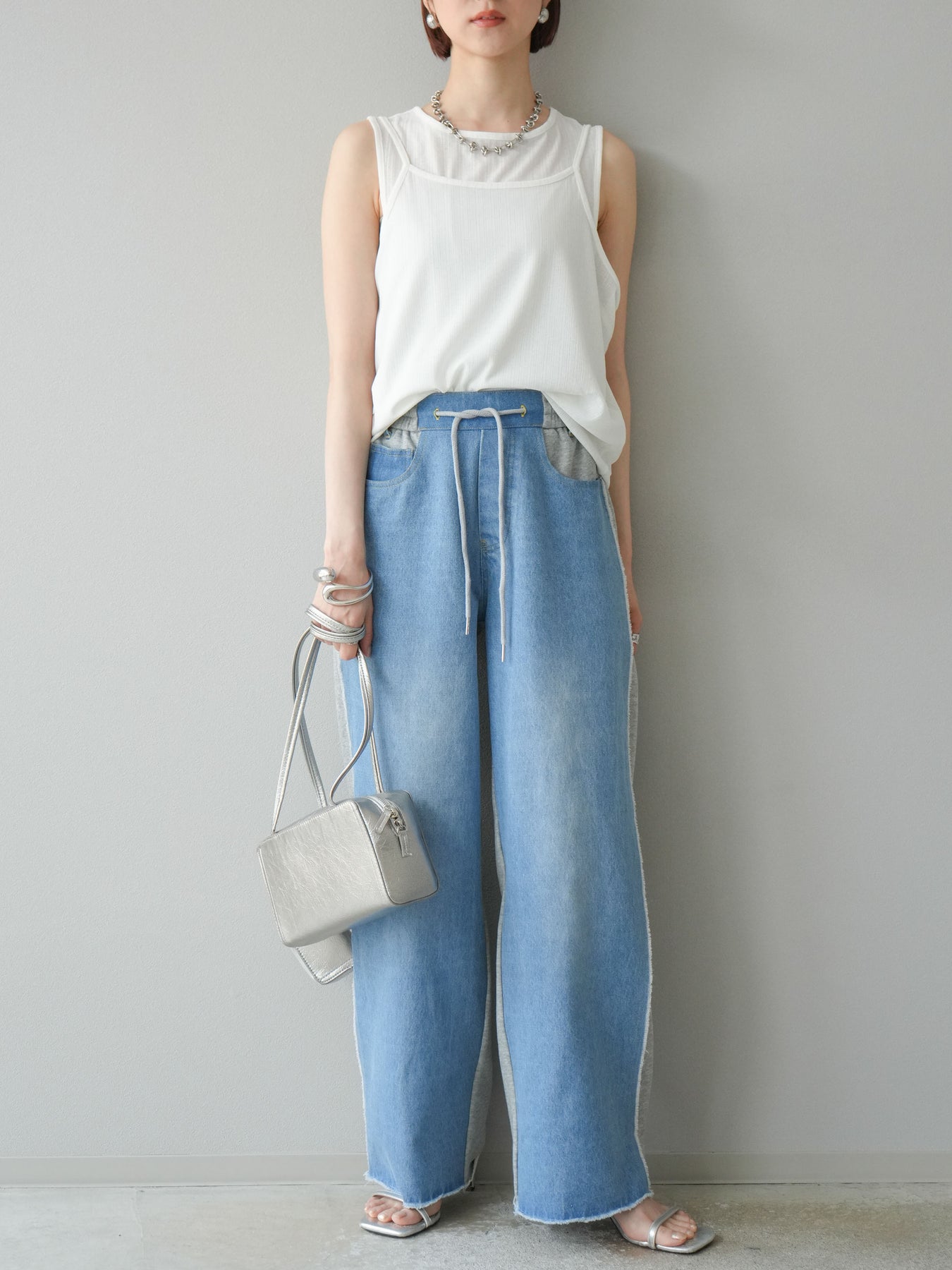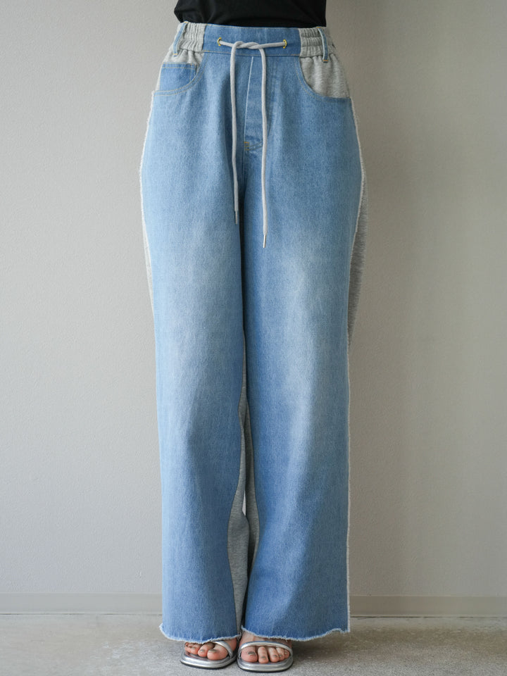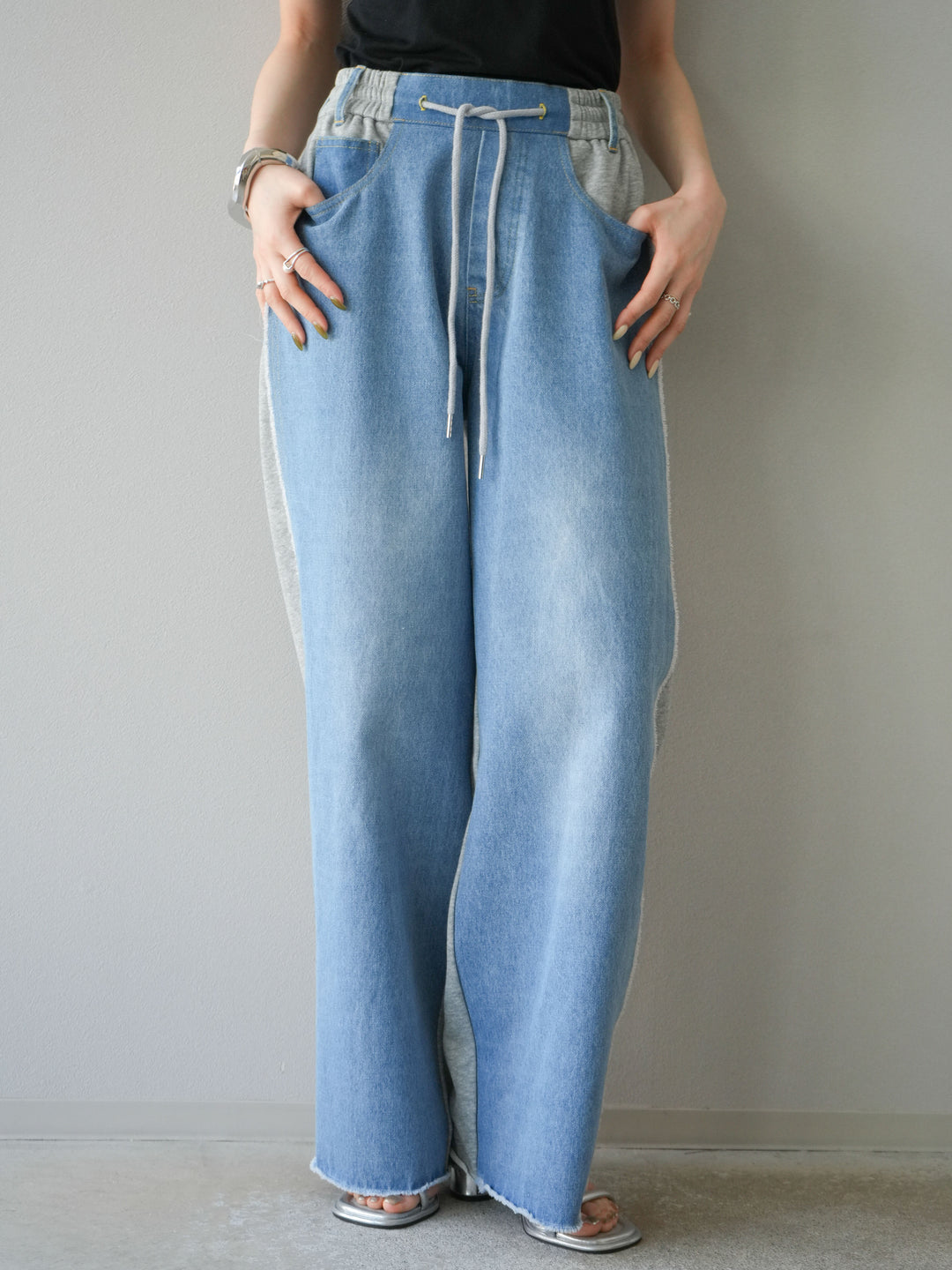 スウェットのラフさとデニムのカジュアル感を融合させた、異素材ドッキングのワイドパンツ。フロントはデニム、バックはスウェット素材で仕立てられており、見た目のインパクトと着心地の良さを両立。ウエストはドローストリング仕様でサイズ調整もラクに。1枚でコーディネートの主役になる、旬のストリートミックススタイルにぴったりなアイテムです。 ※ボトムス、キャミソール(インナー)以外の商品は一律でインナーは付属していません。