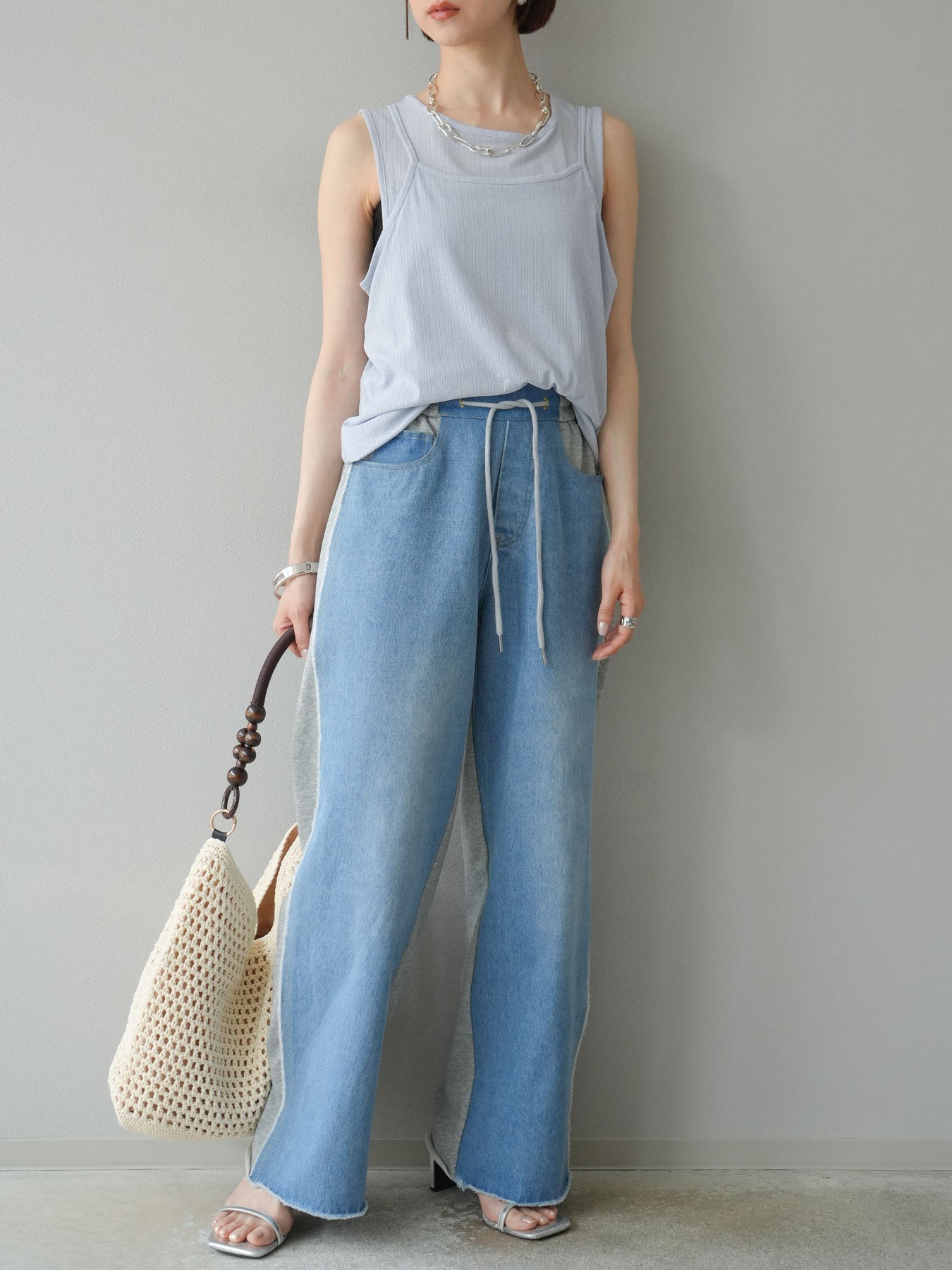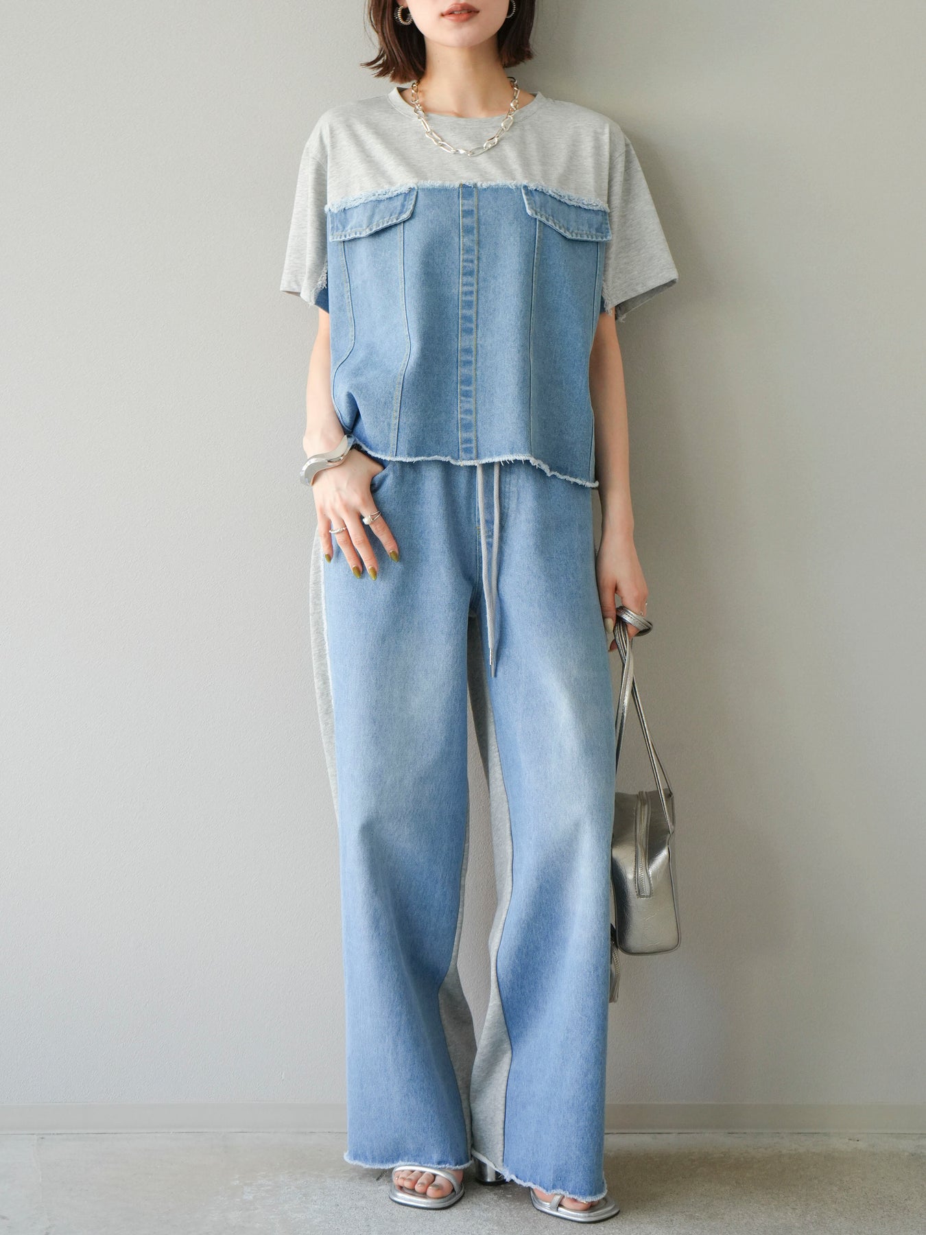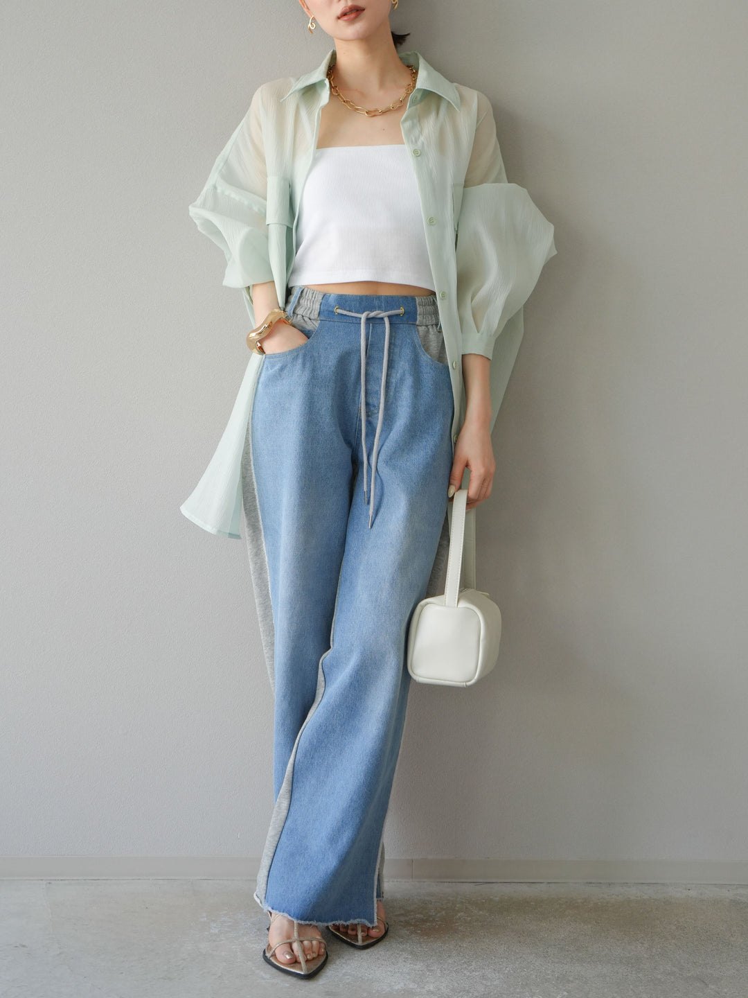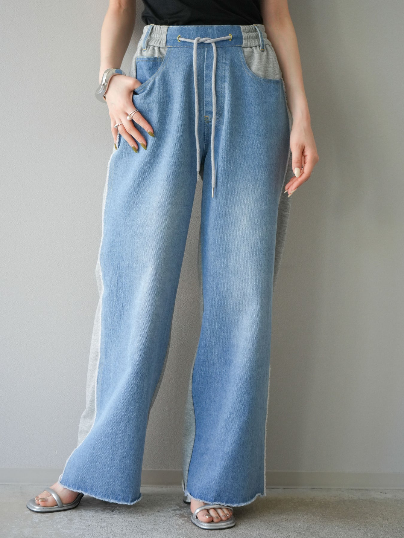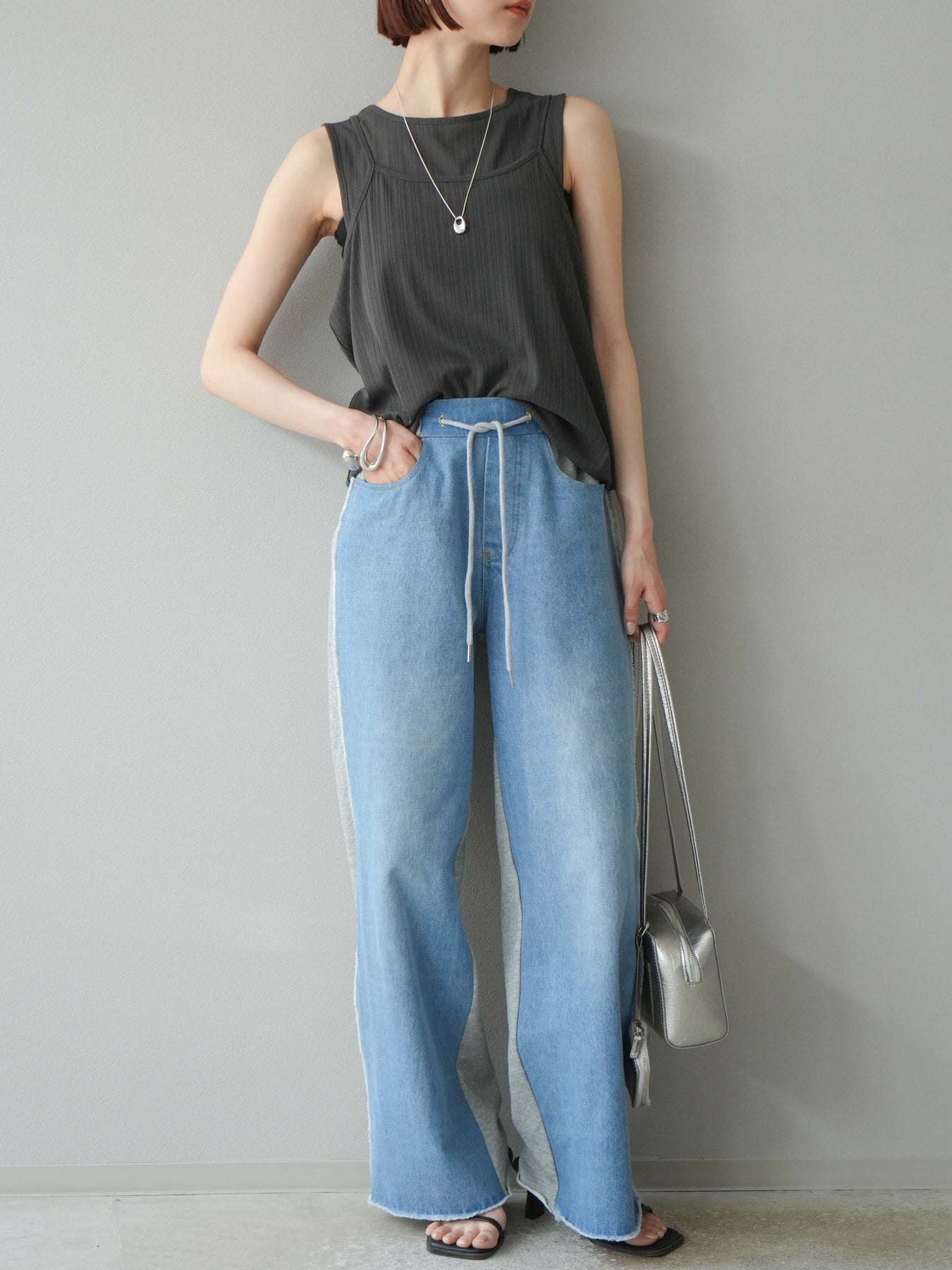 スウェットのラフさとデニムのカジュアル感を融合させた、異素材ドッキングのワイドパンツ。フロントはデニム、バックはスウェット素材で仕立てられており、見た目のインパクトと着心地の良さを両立。ウエストはドローストリング仕様でサイズ調整もラクに。1枚でコーディネートの主役になる、旬のストリートミックススタイルにぴったりなアイテムです。 ※ボトムス、キャミソール(インナー)以外の商品は一律でインナーは付属していません。