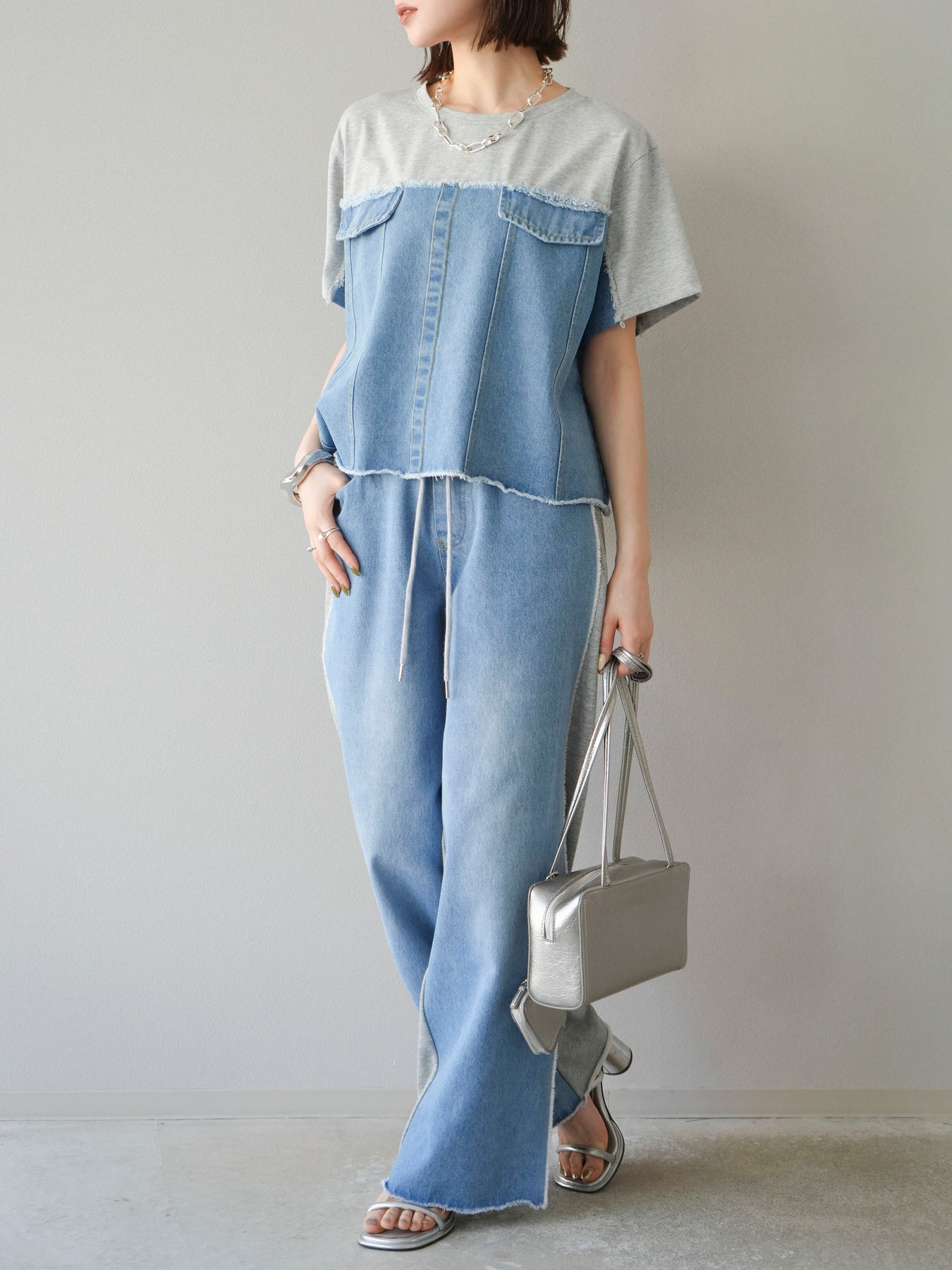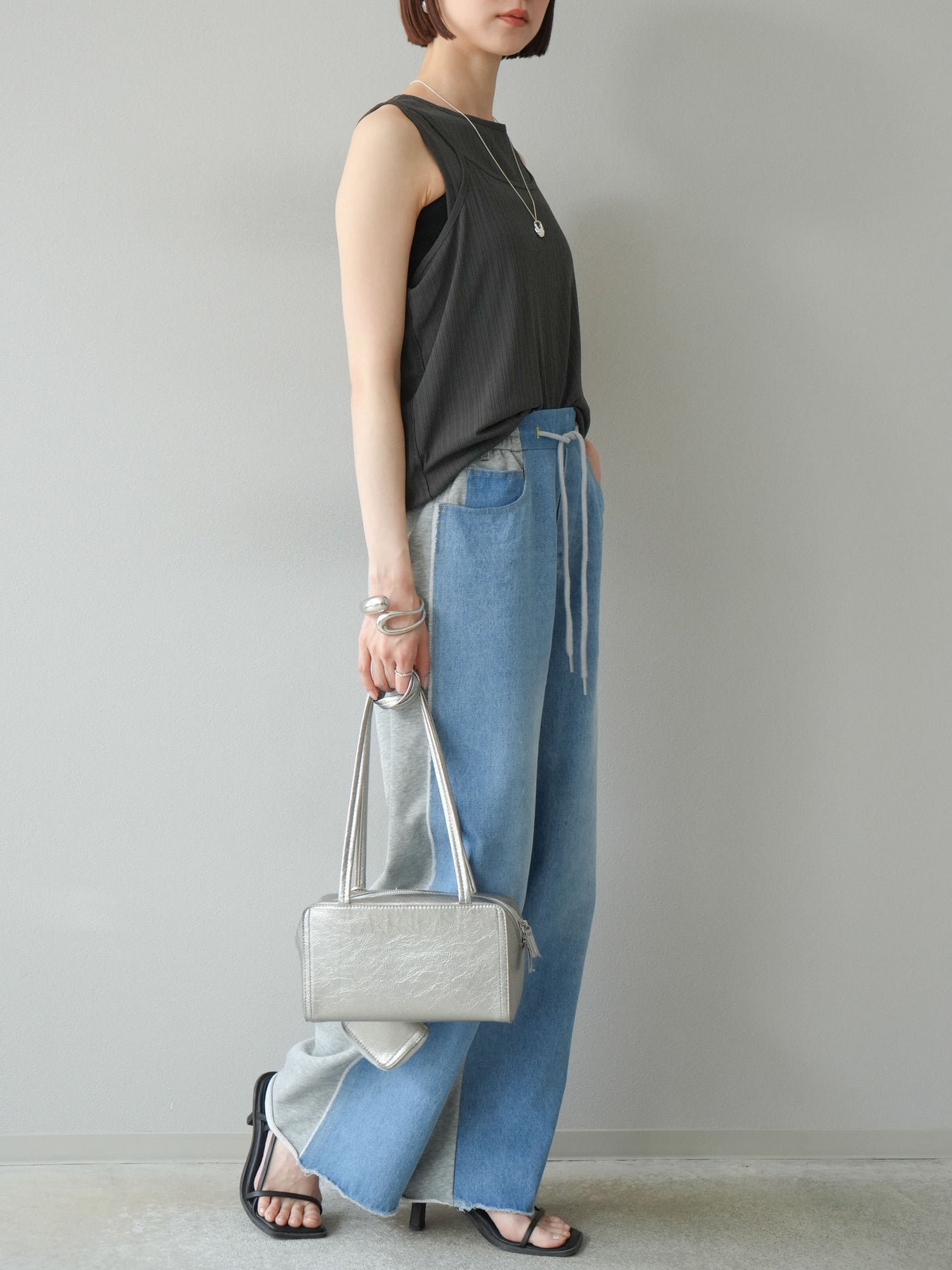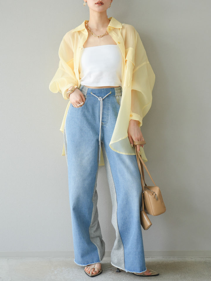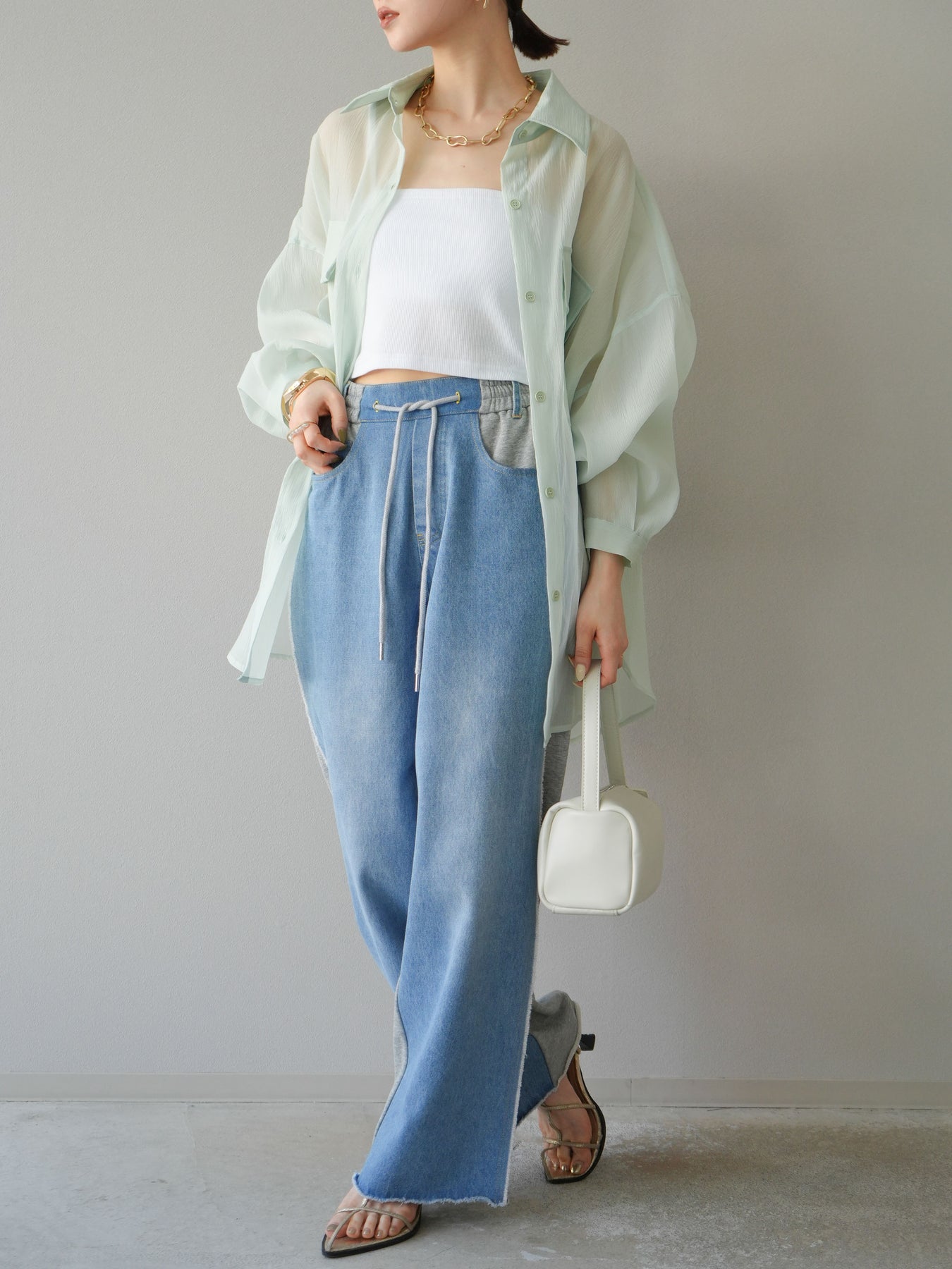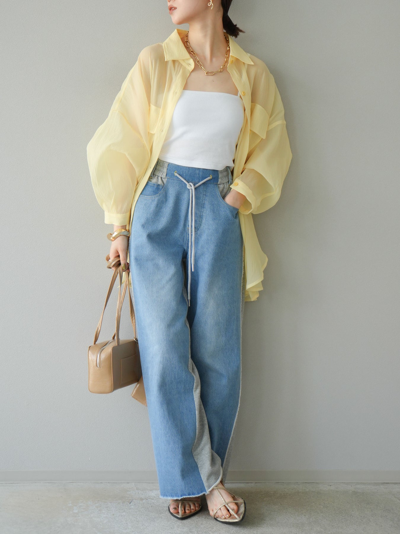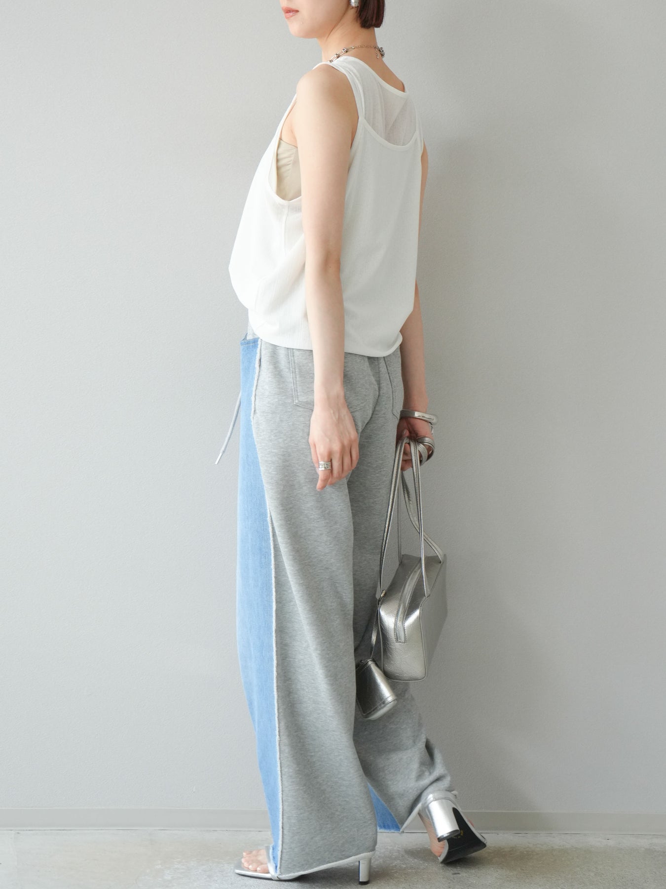 スウェットのラフさとデニムのカジュアル感を融合させた、異素材ドッキングのワイドパンツ。フロントはデニム、バックはスウェット素材で仕立てられており、見た目のインパクトと着心地の良さを両立。ウエストはドローストリング仕様でサイズ調整もラクに。1枚でコーディネートの主役になる、旬のストリートミックススタイルにぴったりなアイテムです。 ※ボトムス、キャミソール(インナー)以外の商品は一律でインナーは付属していません。