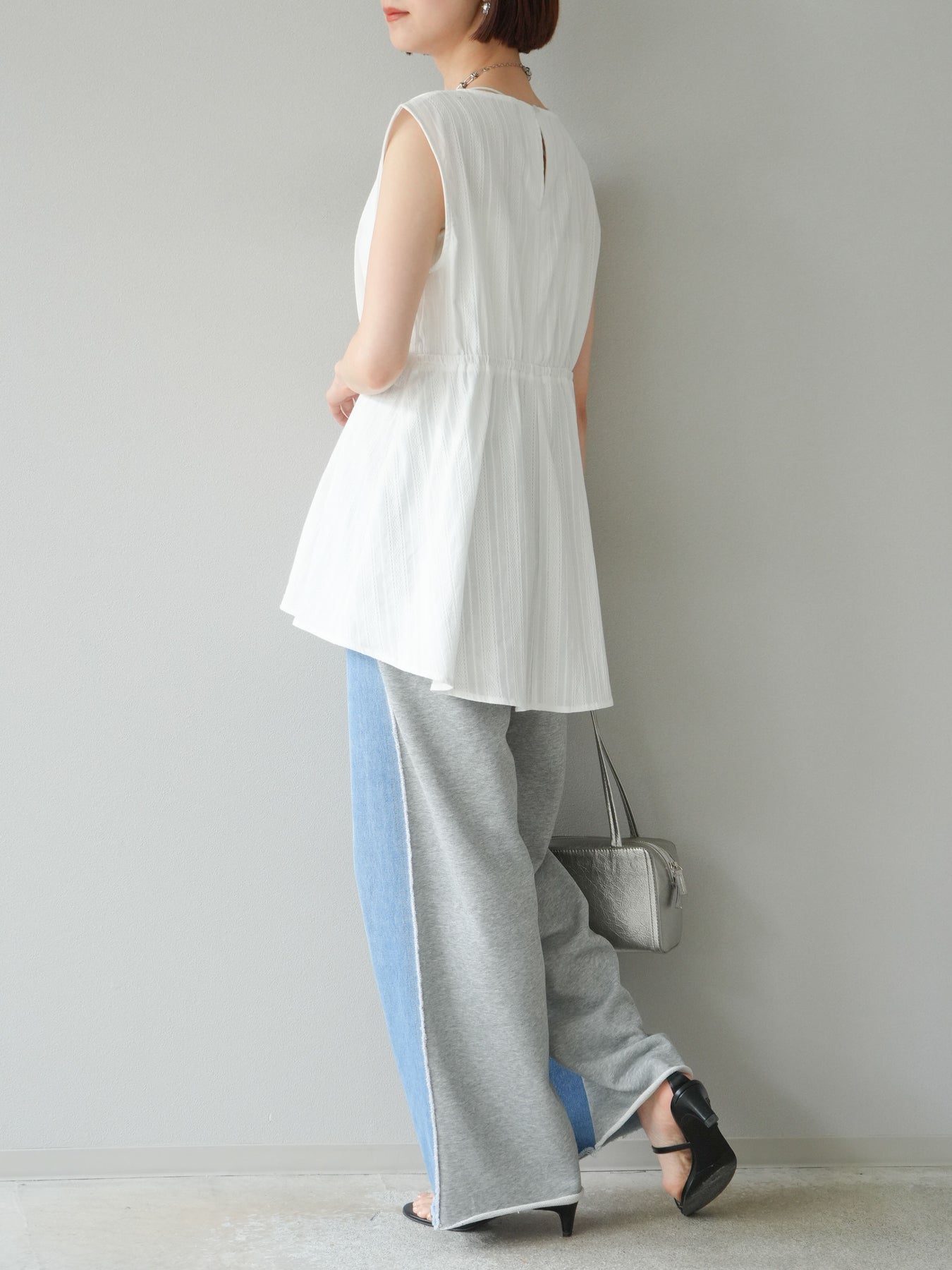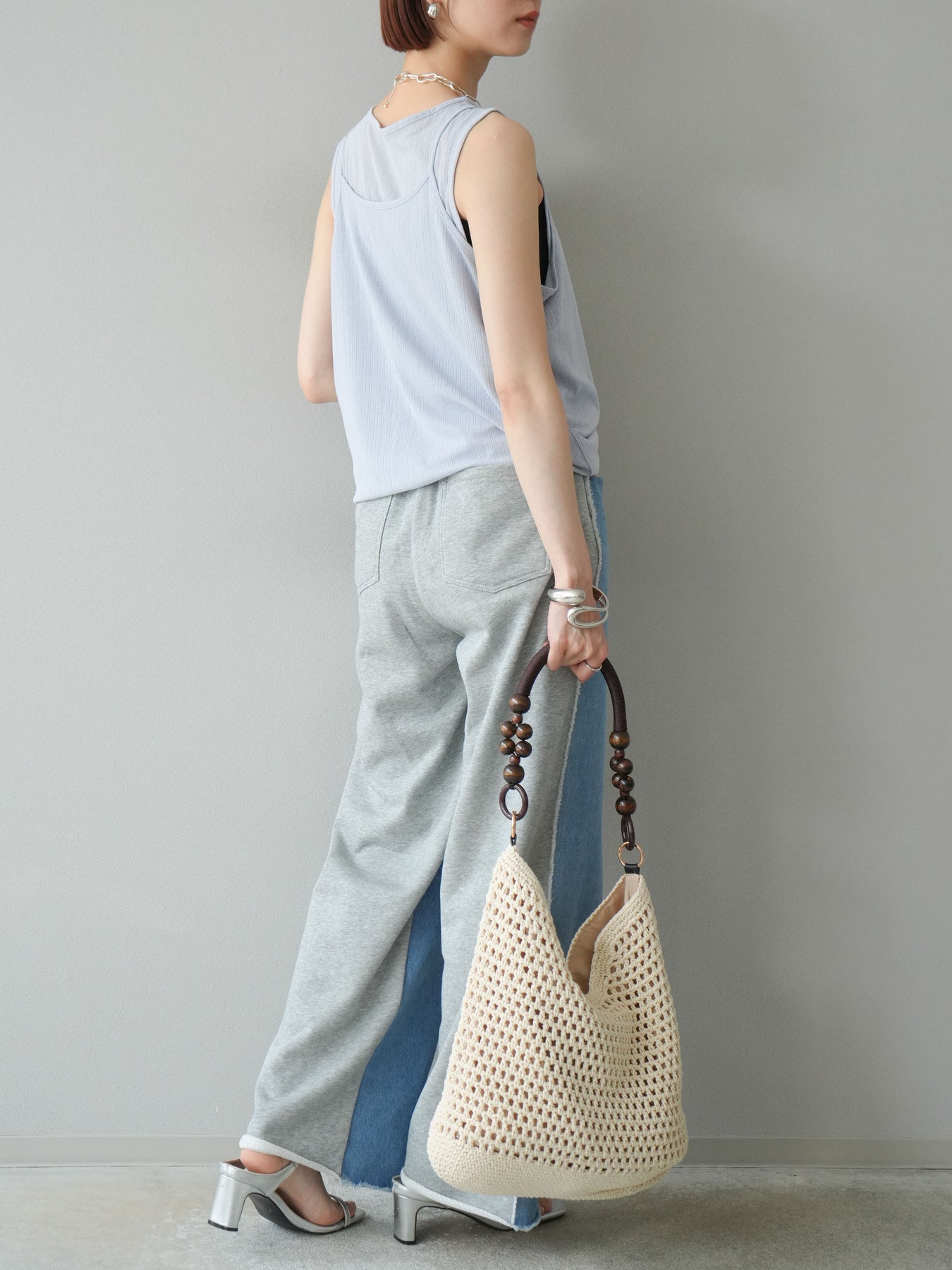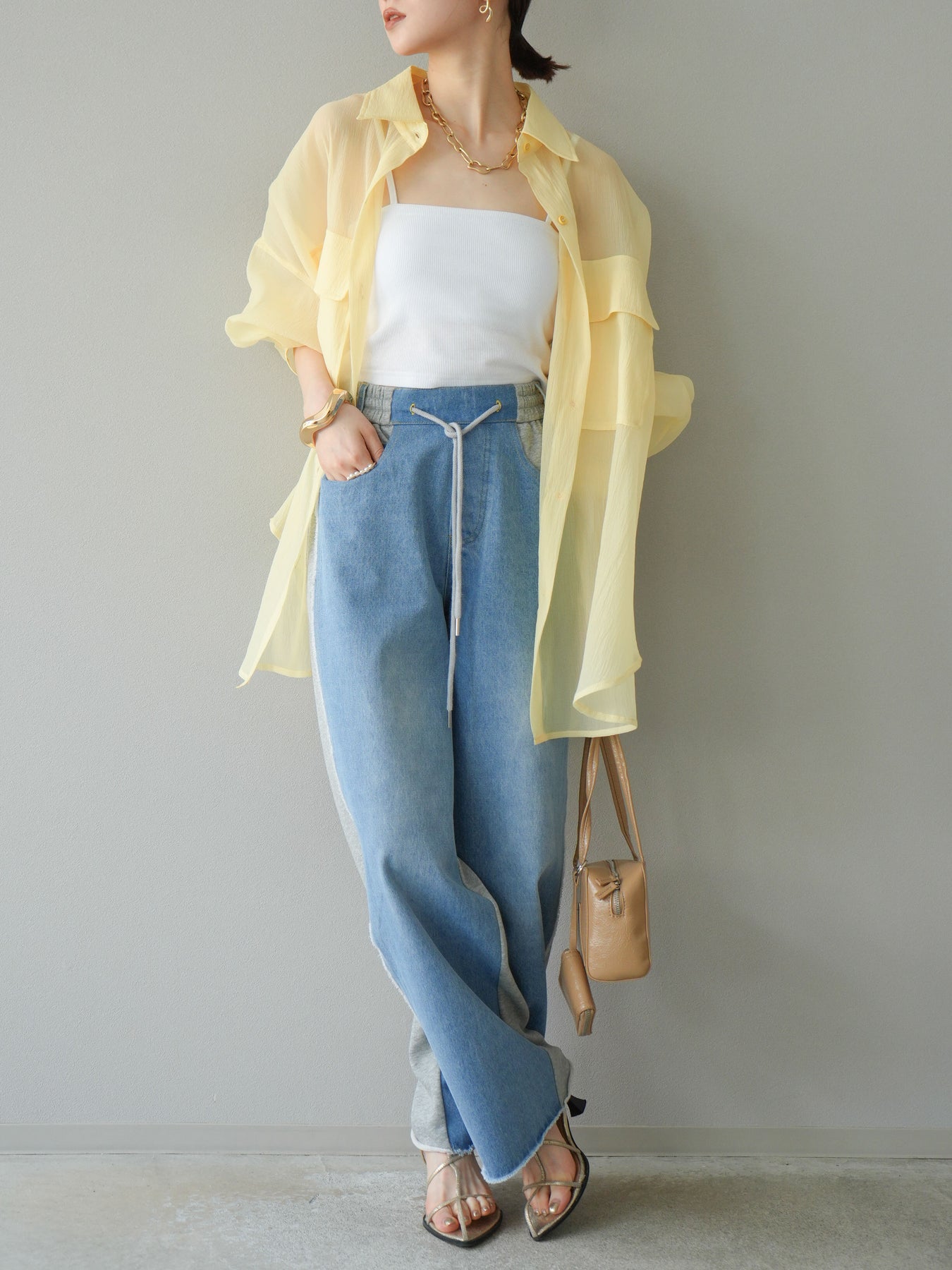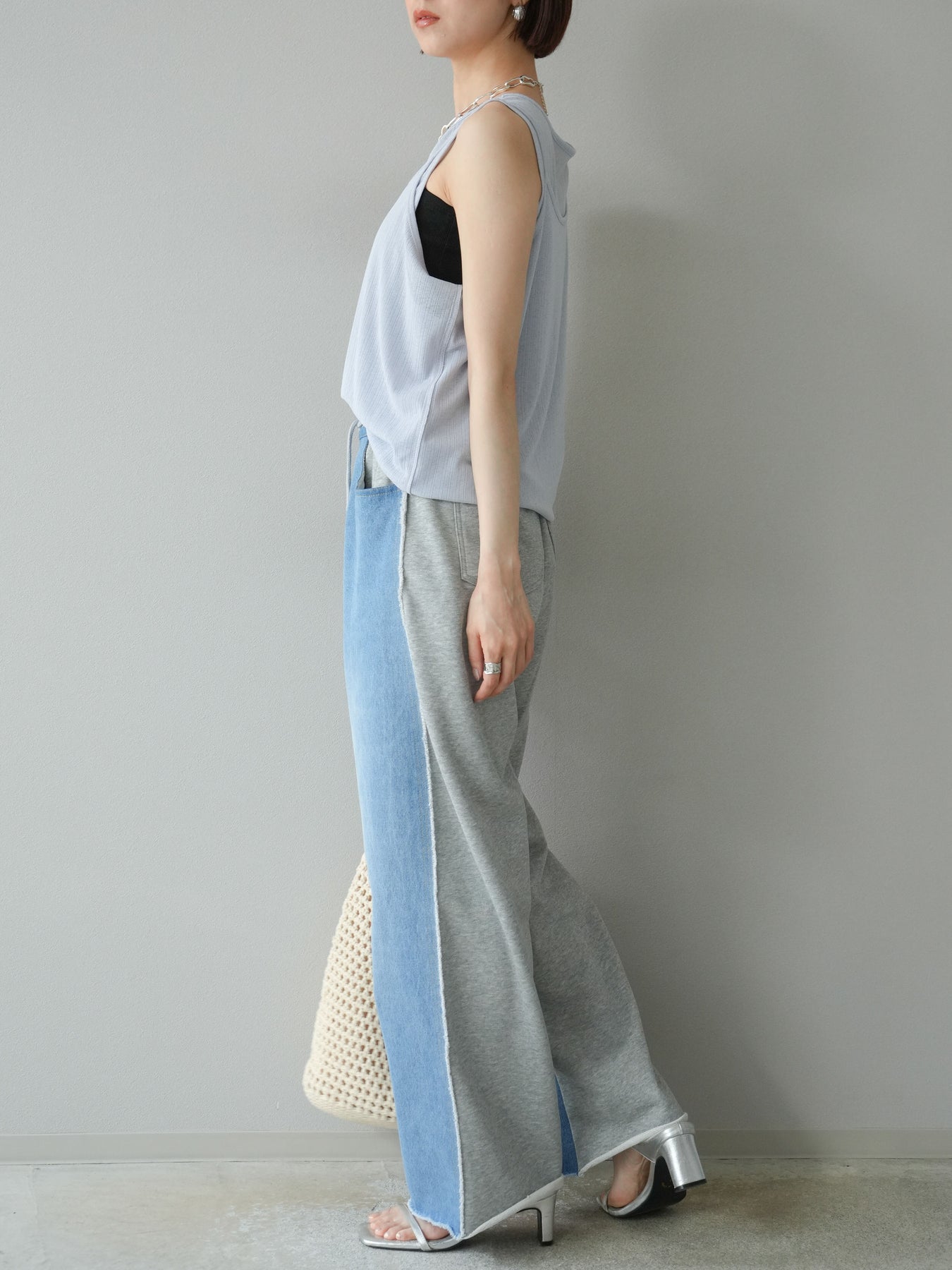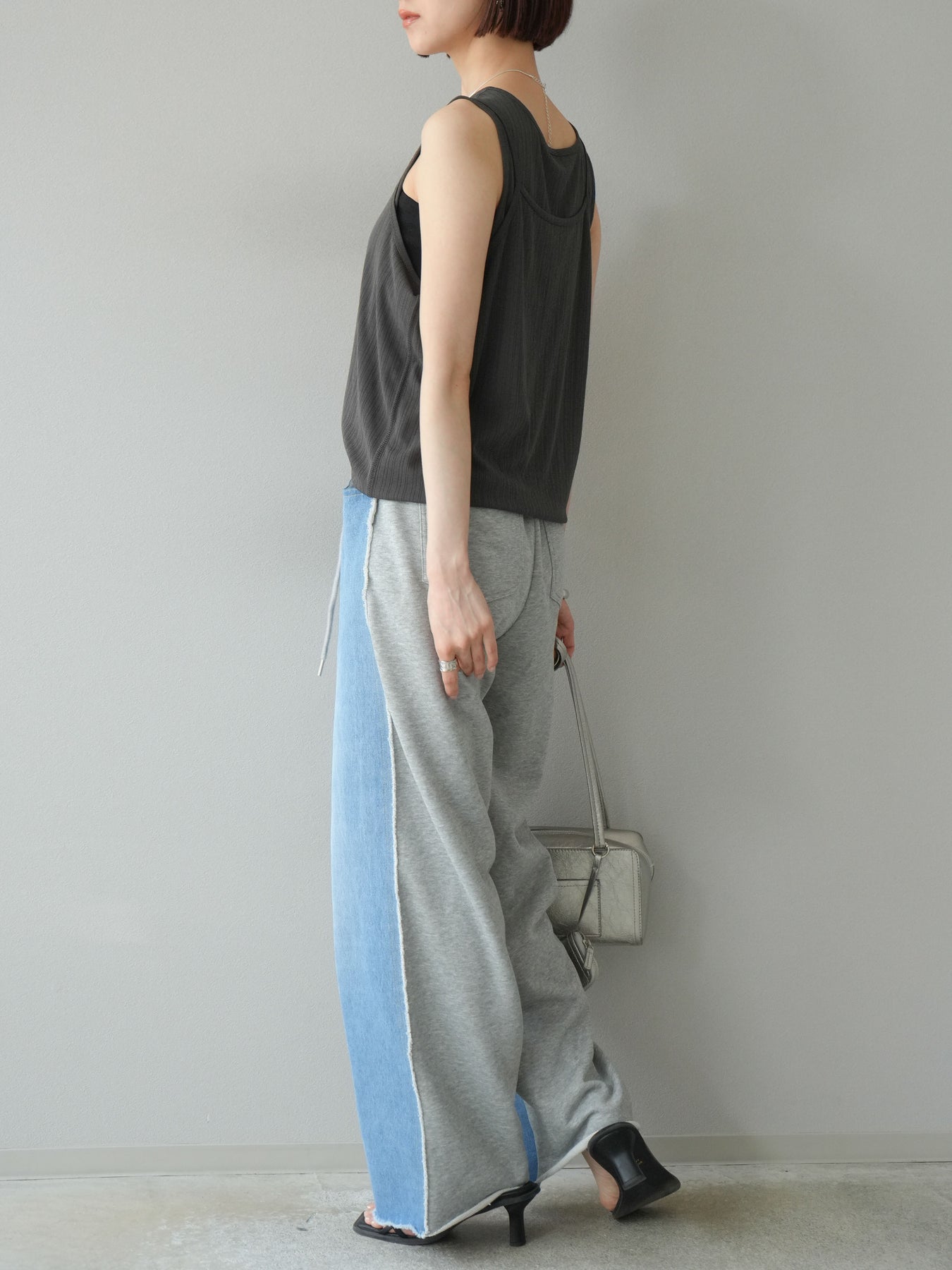 スウェットのラフさとデニムのカジュアル感を融合させた、異素材ドッキングのワイドパンツ。フロントはデニム、バックはスウェット素材で仕立てられており、見た目のインパクトと着心地の良さを両立。ウエストはドローストリング仕様でサイズ調整もラクに。1枚でコーディネートの主役になる、旬のストリートミックススタイルにぴったりなアイテムです。 ※ボトムス、キャミソール(インナー)以外の商品は一律でインナーは付属していません。