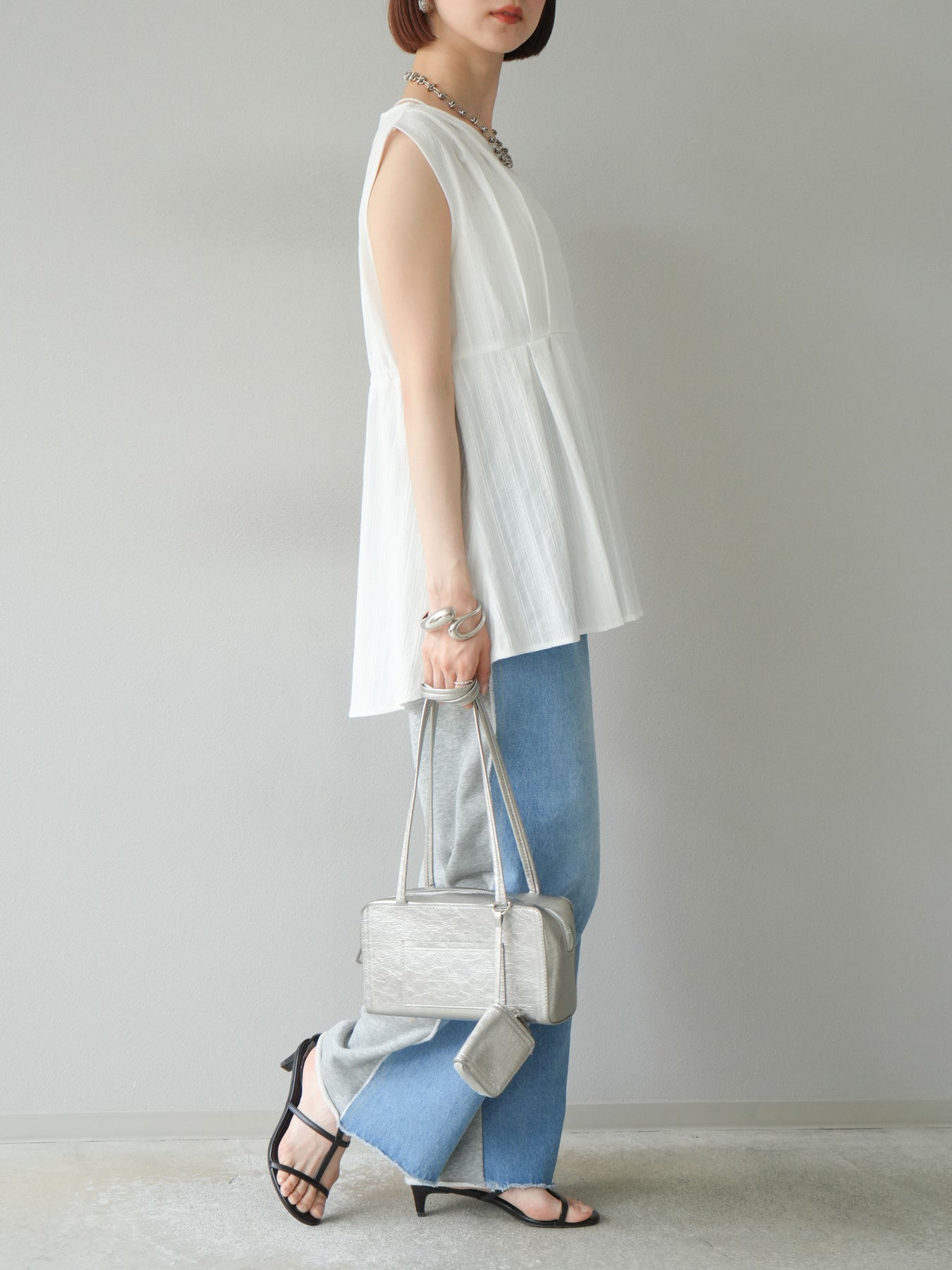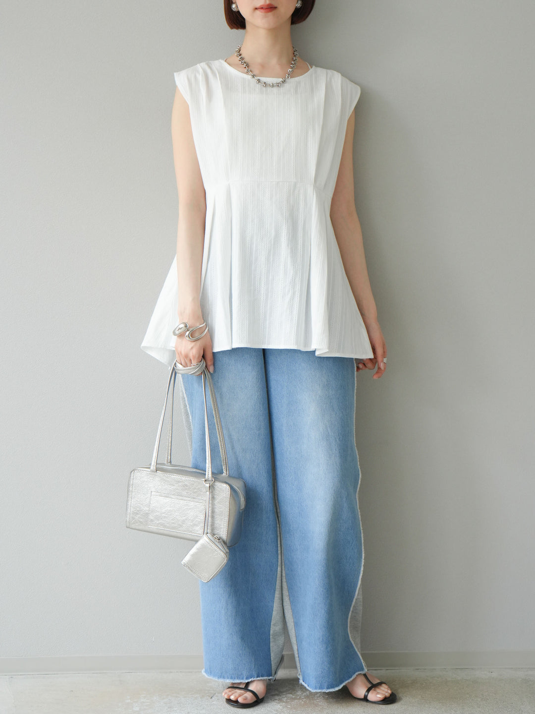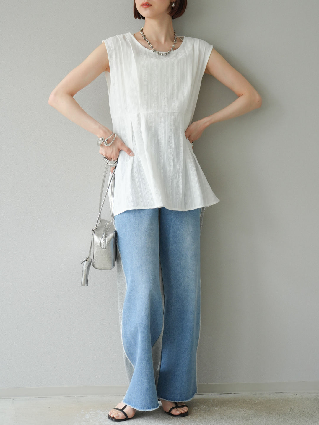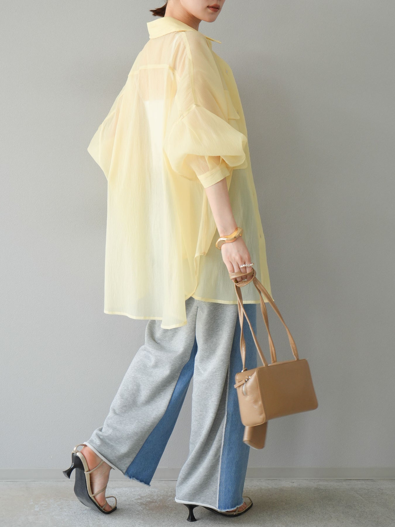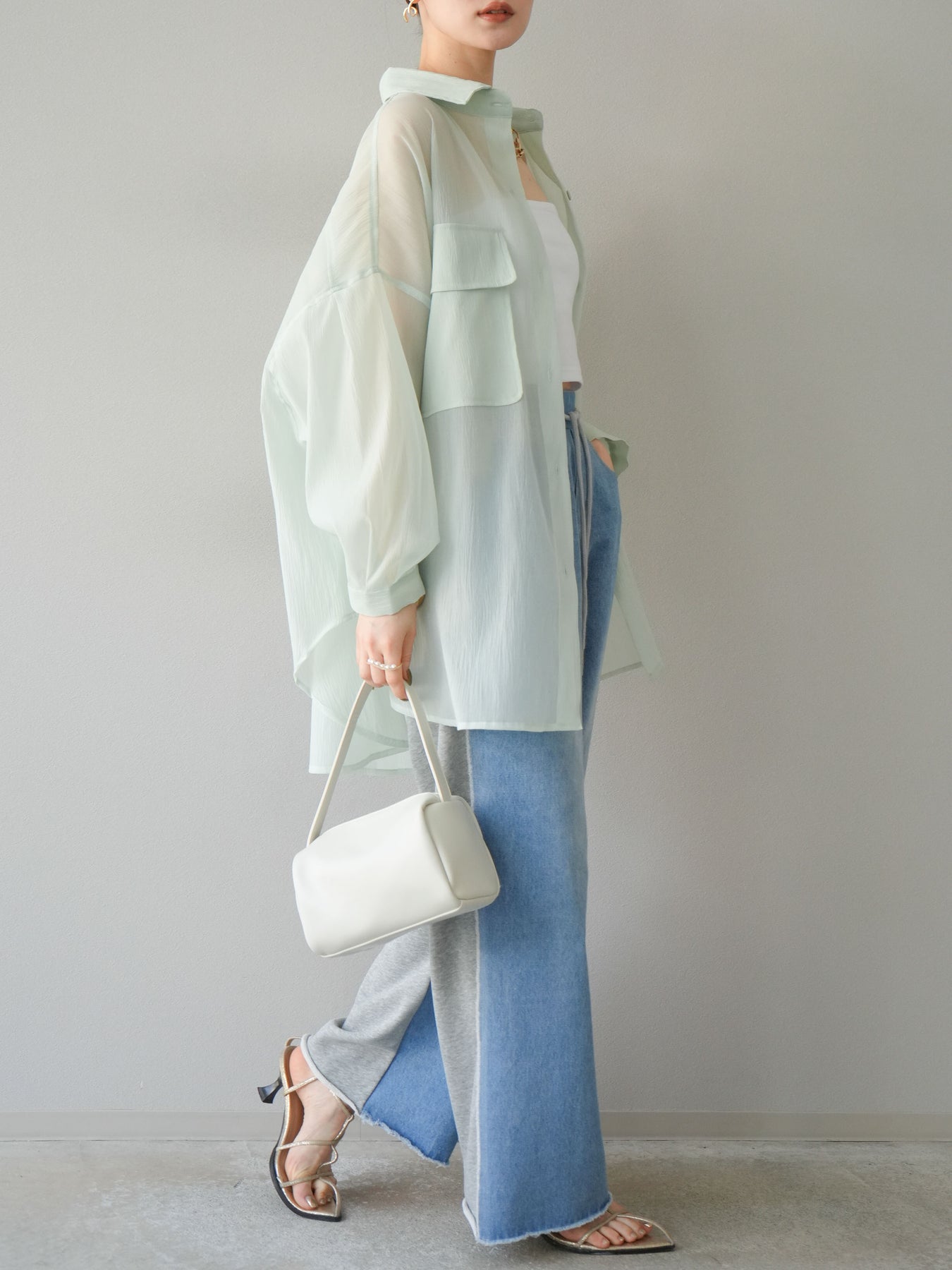 スウェットのラフさとデニムのカジュアル感を融合させた、異素材ドッキングのワイドパンツ。フロントはデニム、バックはスウェット素材で仕立てられており、見た目のインパクトと着心地の良さを両立。ウエストはドローストリング仕様でサイズ調整もラクに。1枚でコーディネートの主役になる、旬のストリートミックススタイルにぴったりなアイテムです。 ※ボトムス、キャミソール(インナー)以外の商品は一律でインナーは付属していません。