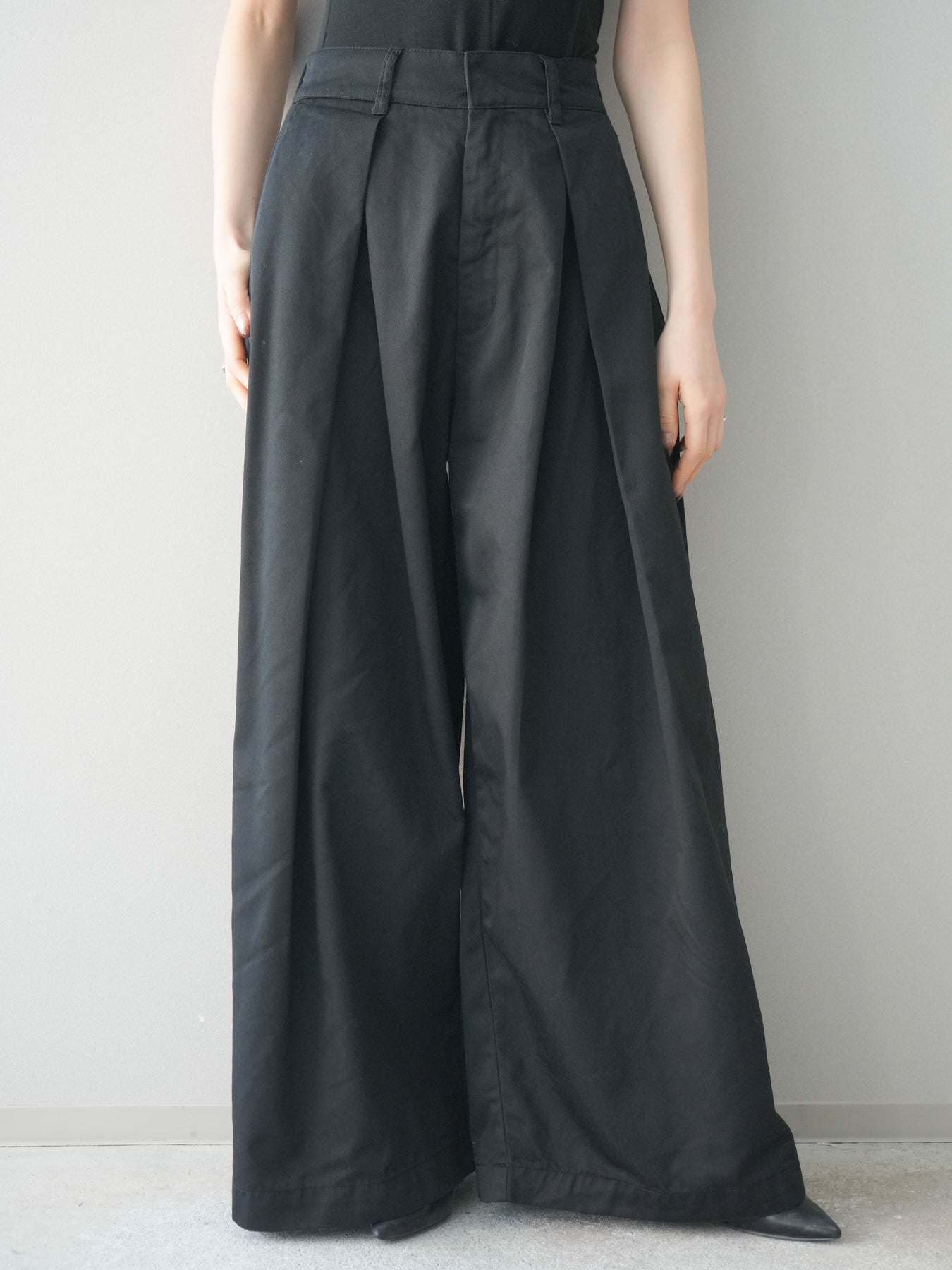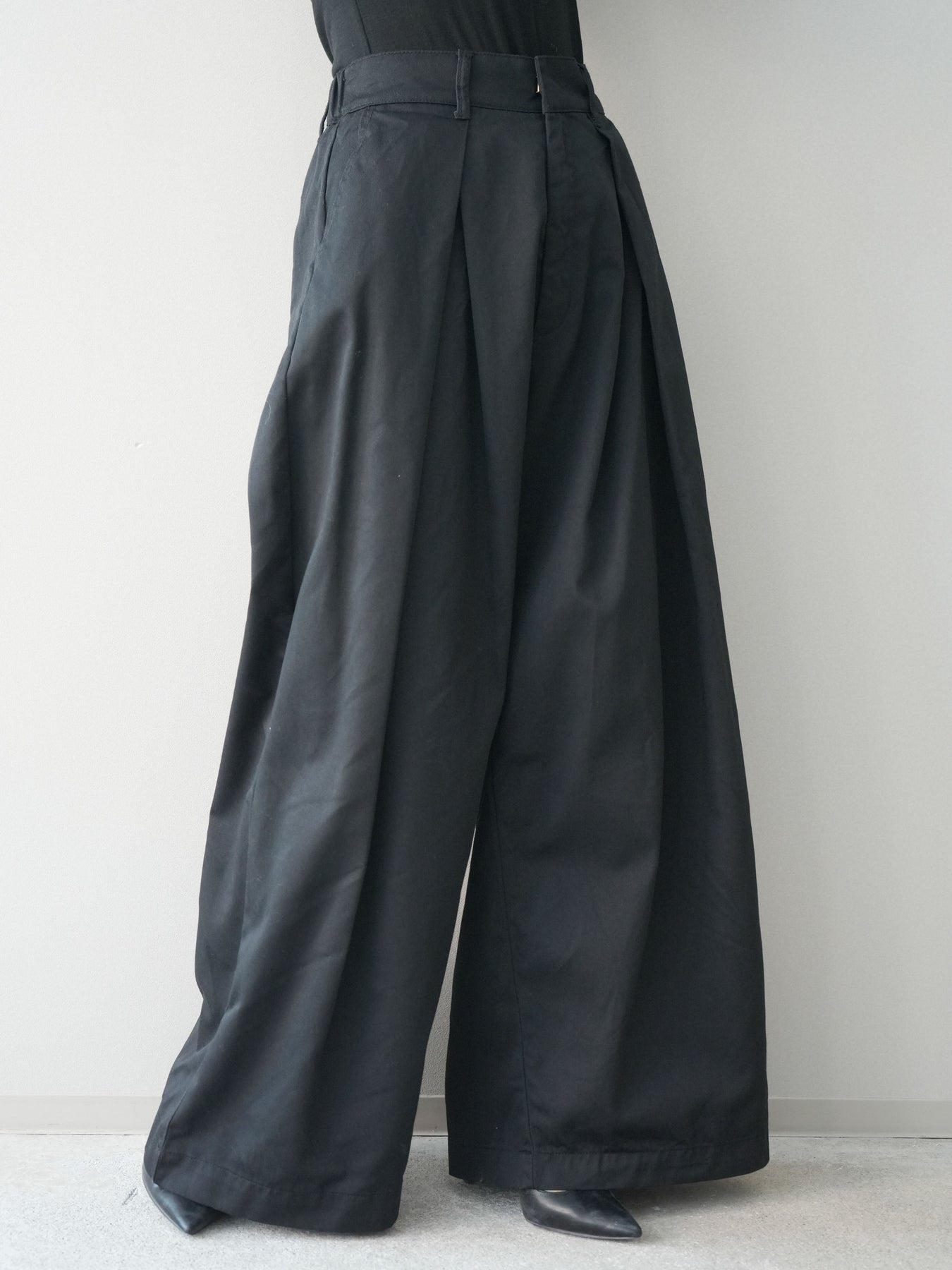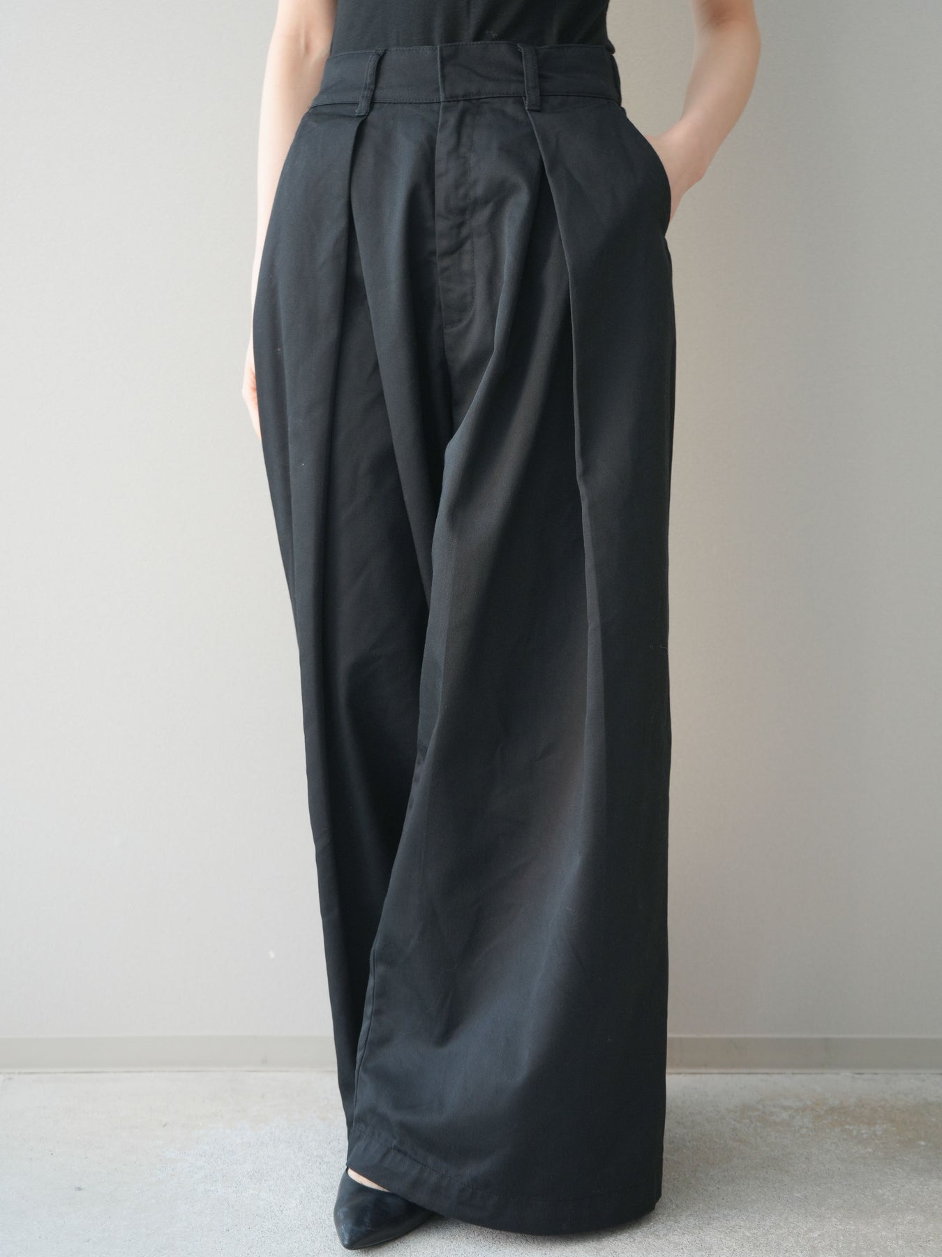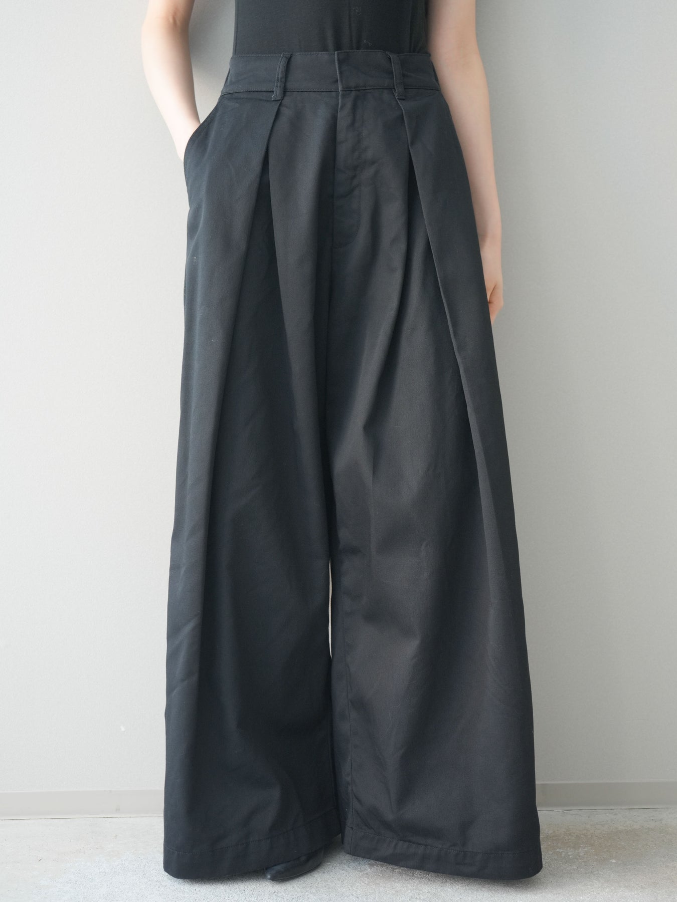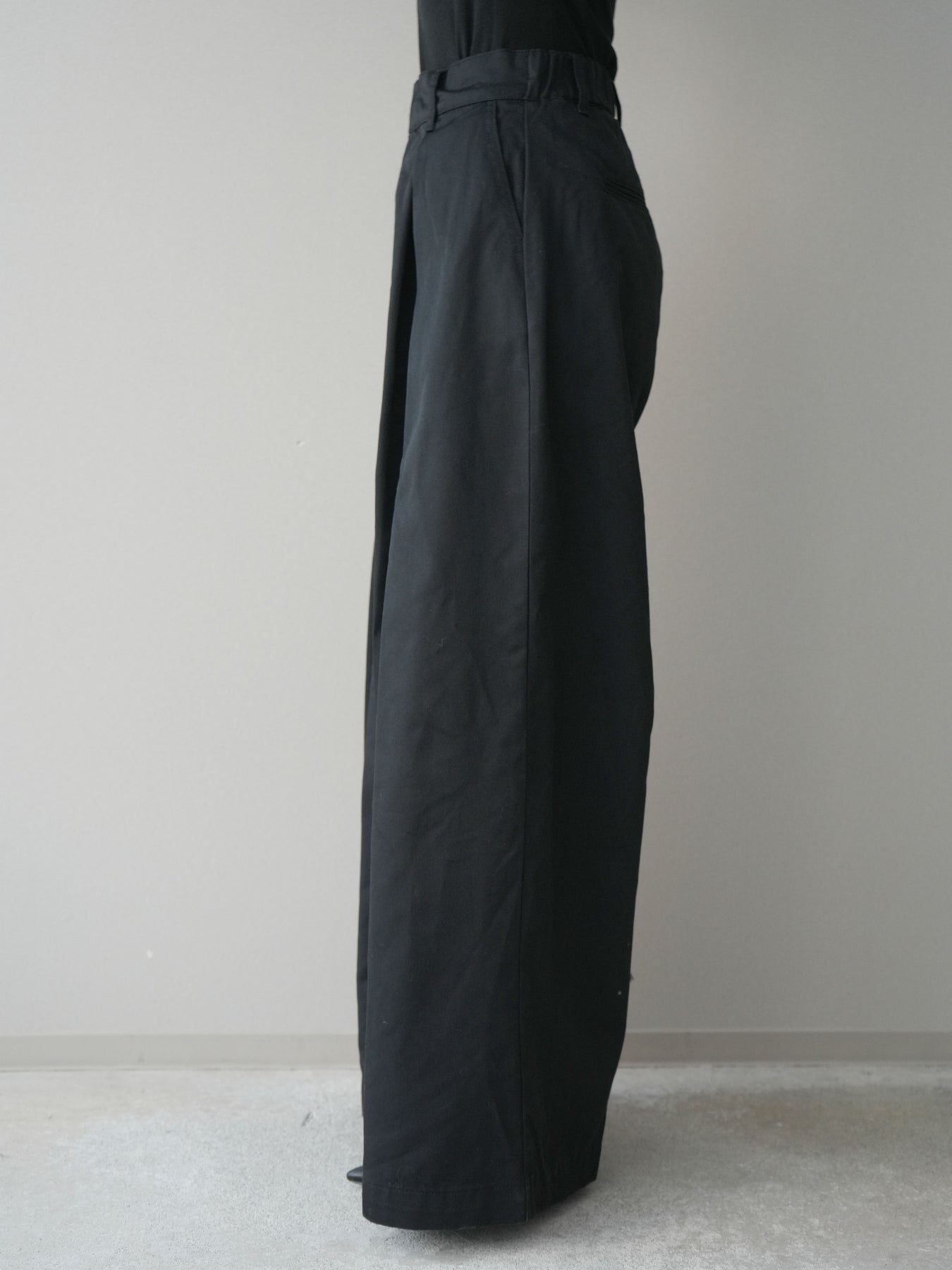 程よくハリのあるツイル素材を使用した、タック入りのワイドチノパンツ。フロントに施したタックが縦のラインを強調し、落ち感のあるシルエットが洗練された印象を与えます。腰まわりはすっきりと、裾に向かって自然に広がるバランスで、トップスを選ばず着回しやすい一本。きれいめにもカジュアルにも対応でき、日常のスタイリングに取り入れやすいアイテムです。