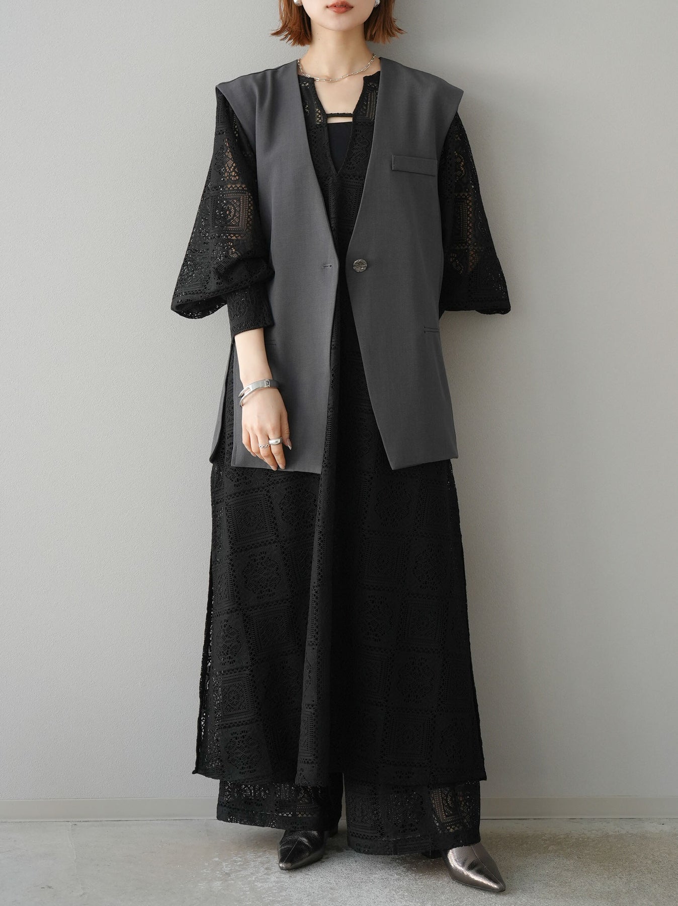 ヴィンテージライクなブロックレースを使用したワイドパンツ。ウエスト部分にタックが施されているためお腹まわりがスッキリと見え、バックゴムで穿き心地も快適です。ワイドレッグながらも素材によって膨張せず、裏地付きなので安心感があるのがポイント。コーディネートに清涼感をプラスことができ、同素材のワンピースとのレイヤードスタイルも素敵に決まります。