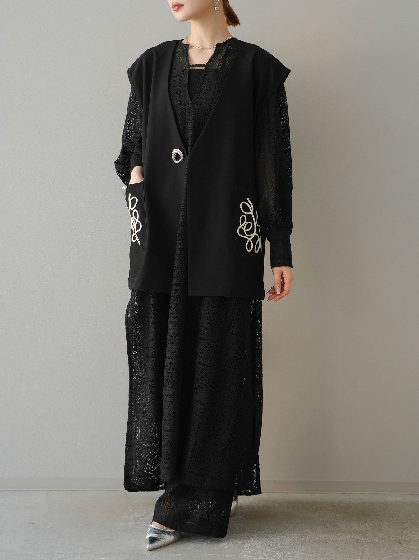 [予約]ブロックレースワイドパンツ/ブラック