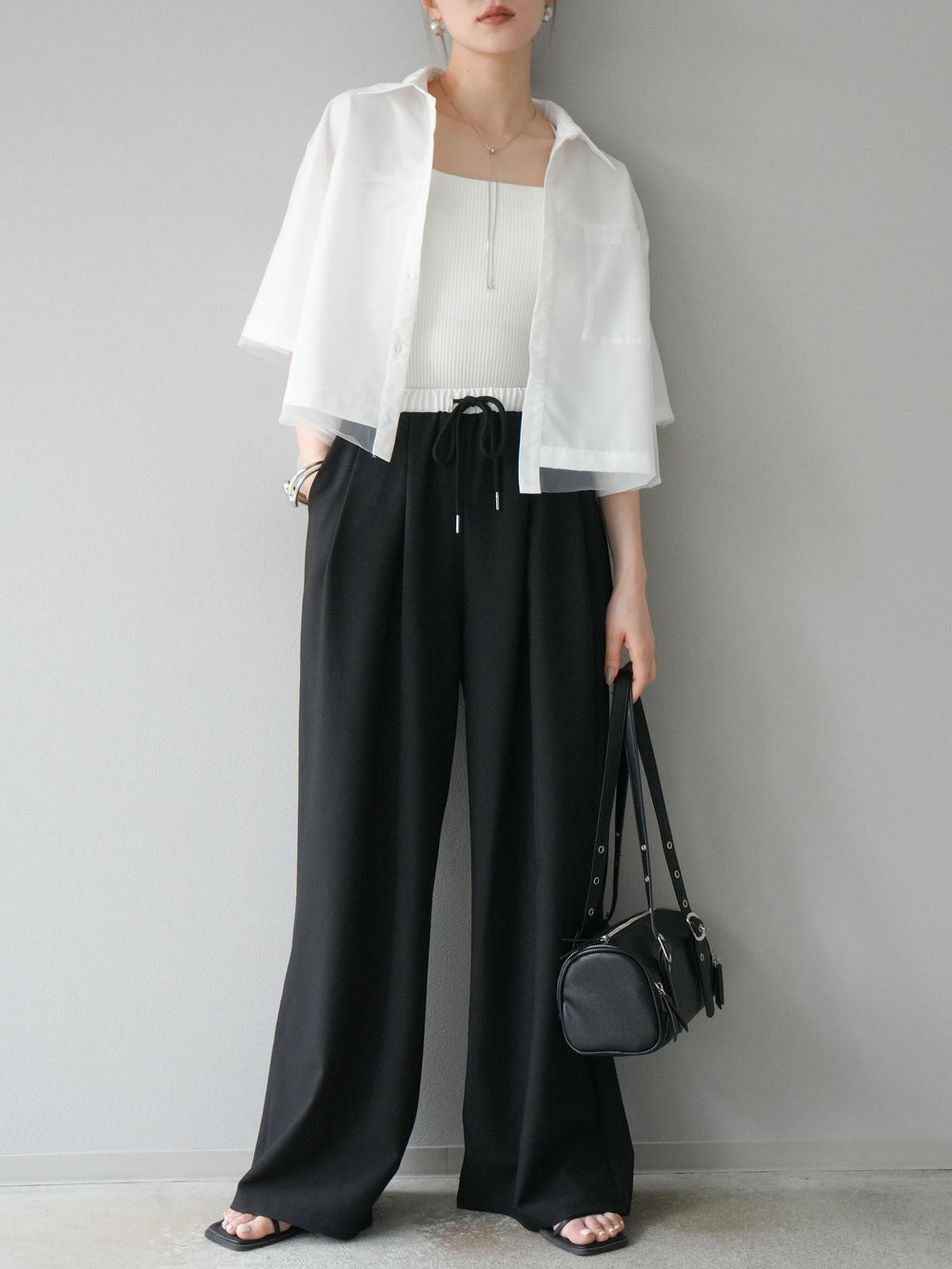 [SET]フロントリボン配色メローニットカーディガン+テープベルトタックバギーパンツ(2set)
