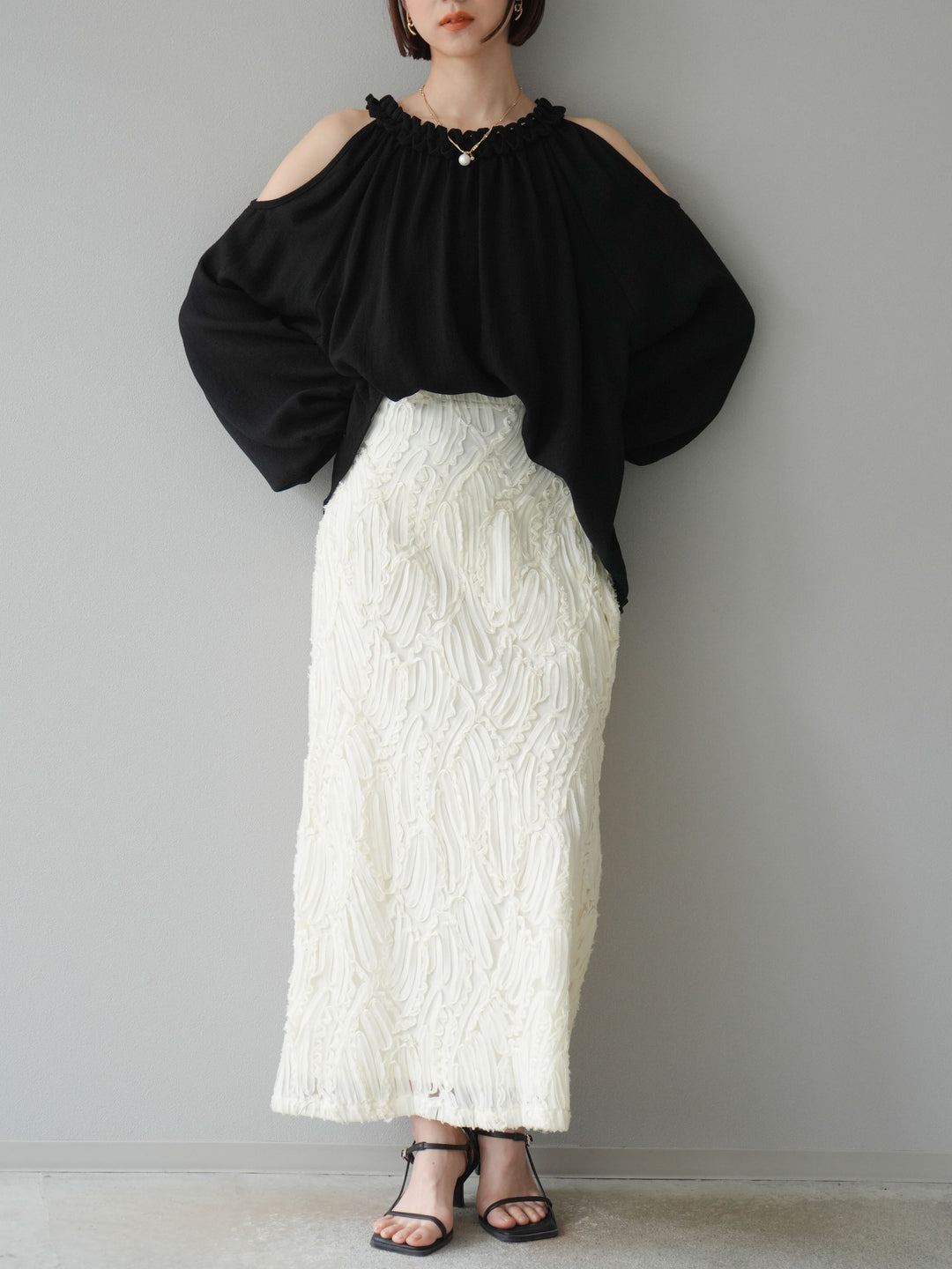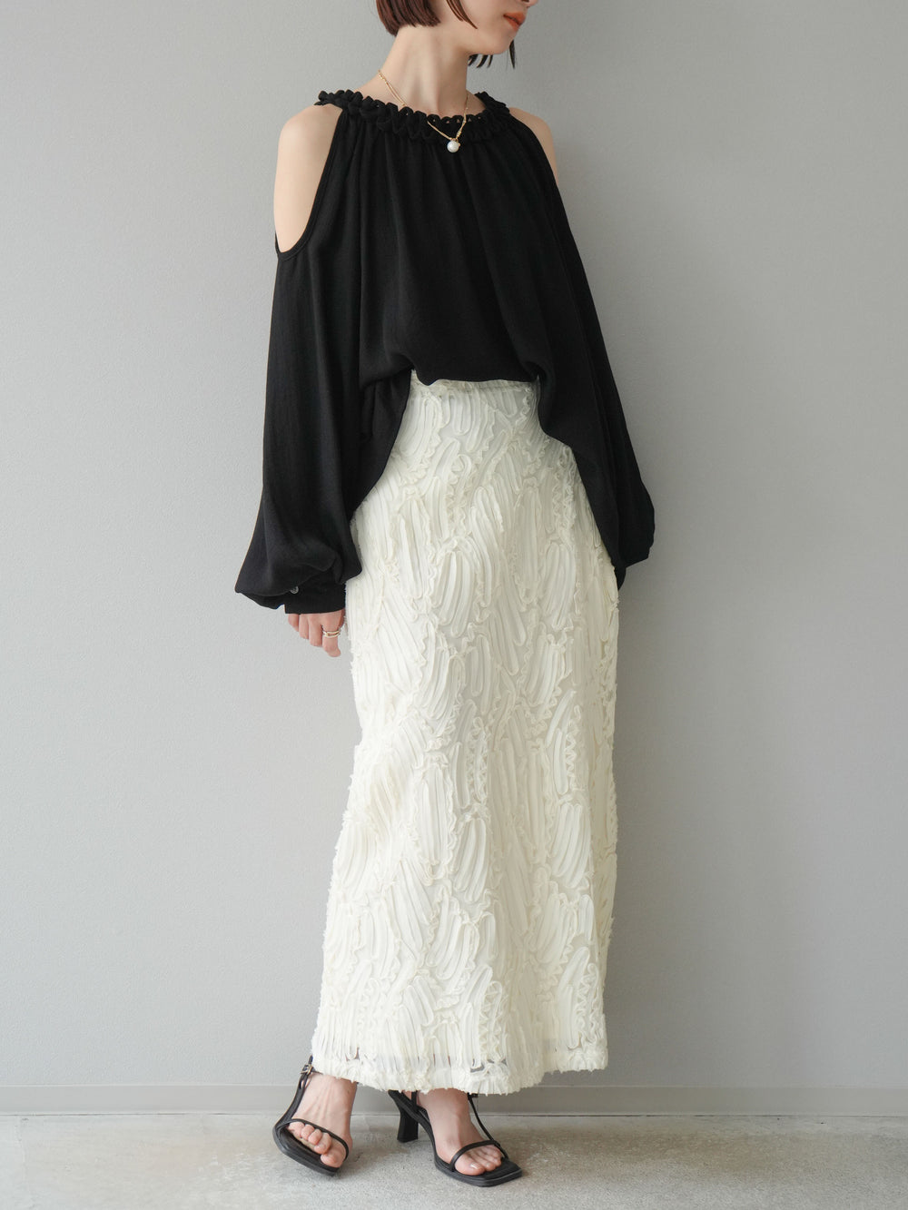 [SET]アンゴラタッチクルーネックニットプルオーバー+チュールレーストップス+ギャザーベロアスカート(3set)