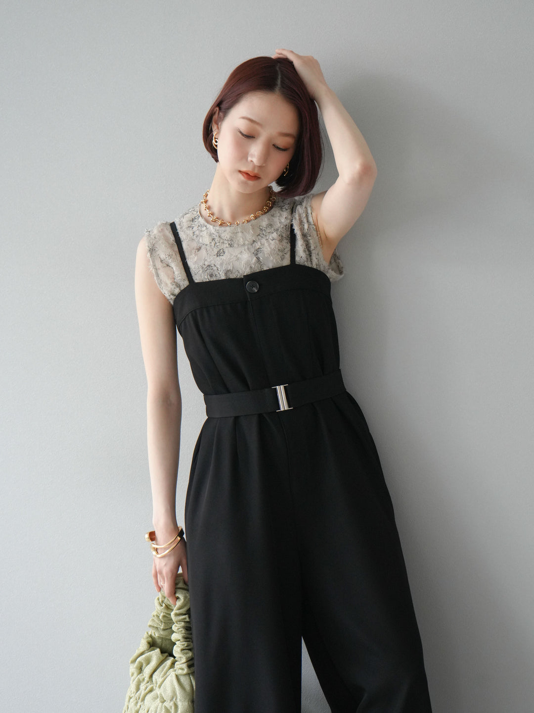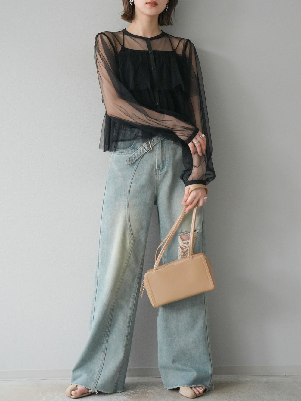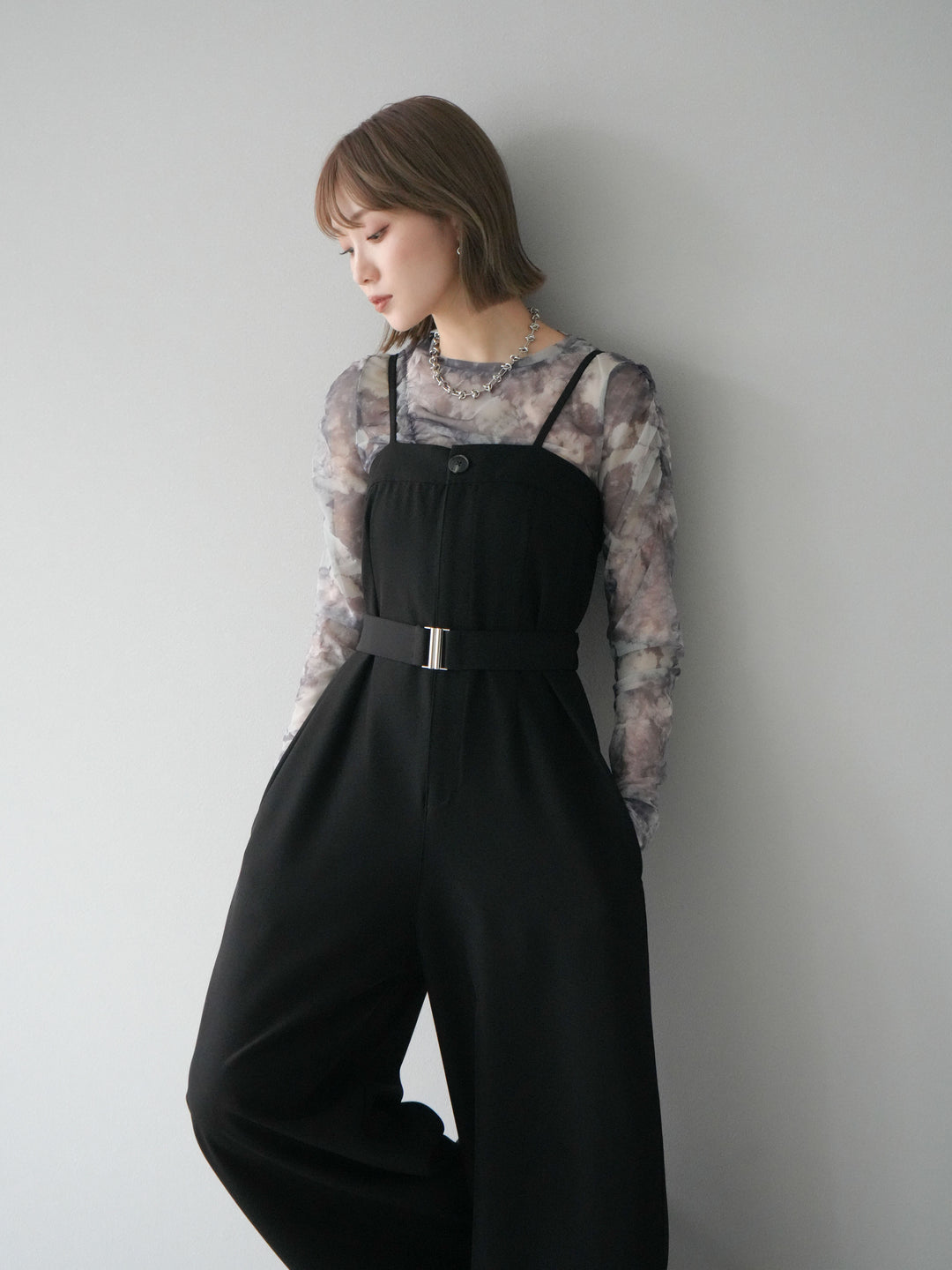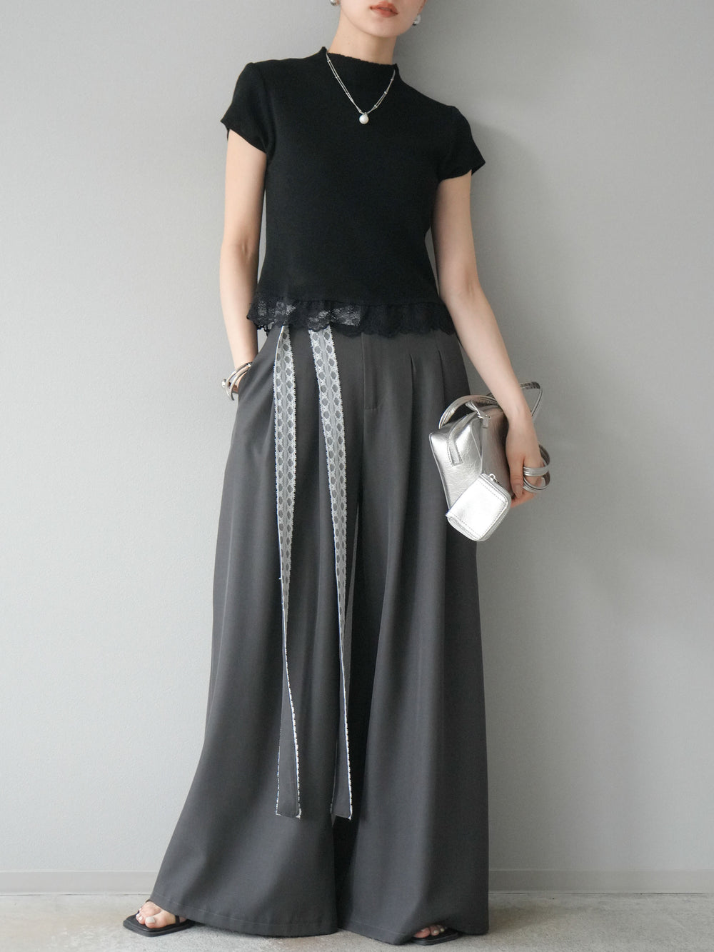[SET]アンゴラタッチクルーネックニットプルオーバー+チュールレーストップス+テープベルトタックバギーパンツ(3set)