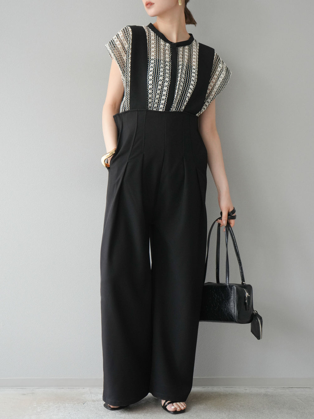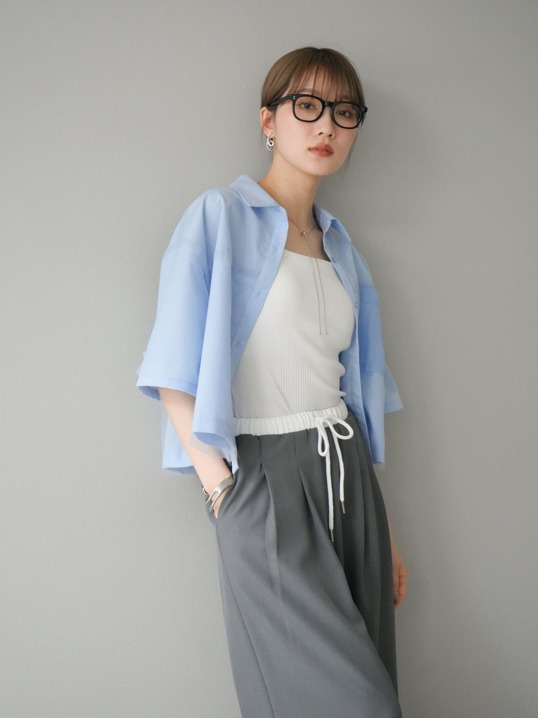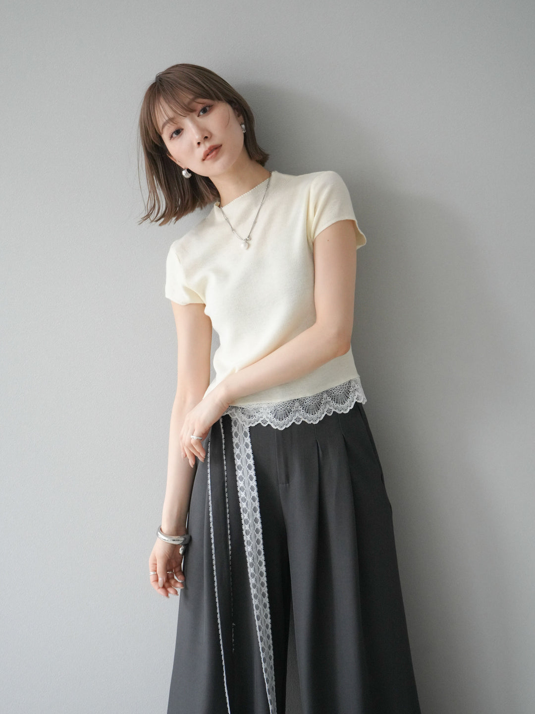 [SET]バルキーケーブルクロップドニットプルオーバー+チュールレーストップス+テープベルトタックバギーパンツ(3set)