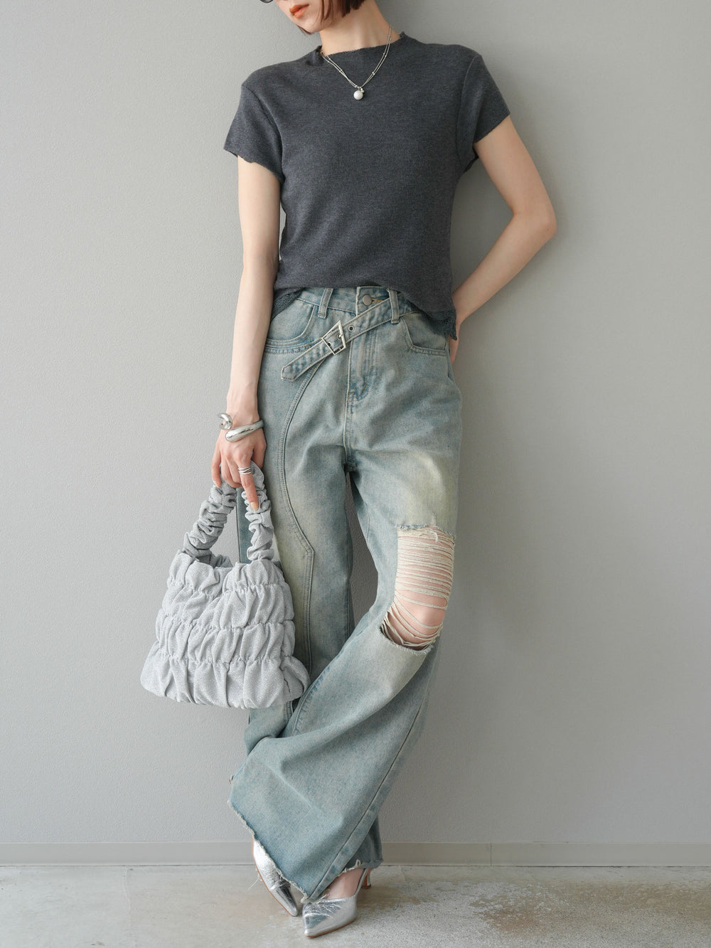 [SET]ラメシャギートップス+サイド切替カーブデニムパンツ(2set)