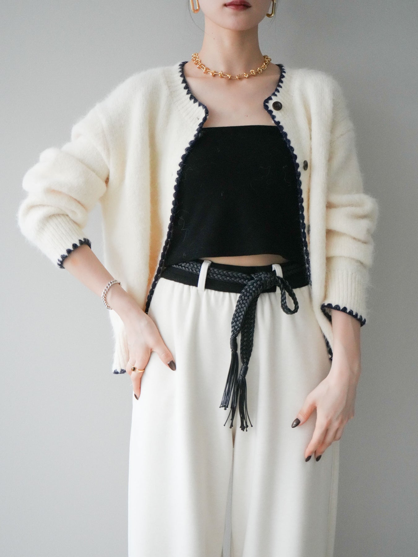 フロントや裾、袖口に施した三角ステッチがポイントになるニットカーディガン。柔らかな風合いのニット素材がふんわりとした優しい雰囲気を演出し、シンプルなシルエットの中にほどよいアクセントをプラスします。ゆるやかなドロップショルダーが抜け感をもたらし、羽織りとしてもトップス風にも使える万能な一枚。デニムやワイドパンツ、スカートなど幅広いコーディネートに合わせやすく、デイリーに重宝するアイテムです。 ※ボトムス、キャミソール(インナー)以外の商品は一律でインナーは付属していません。
