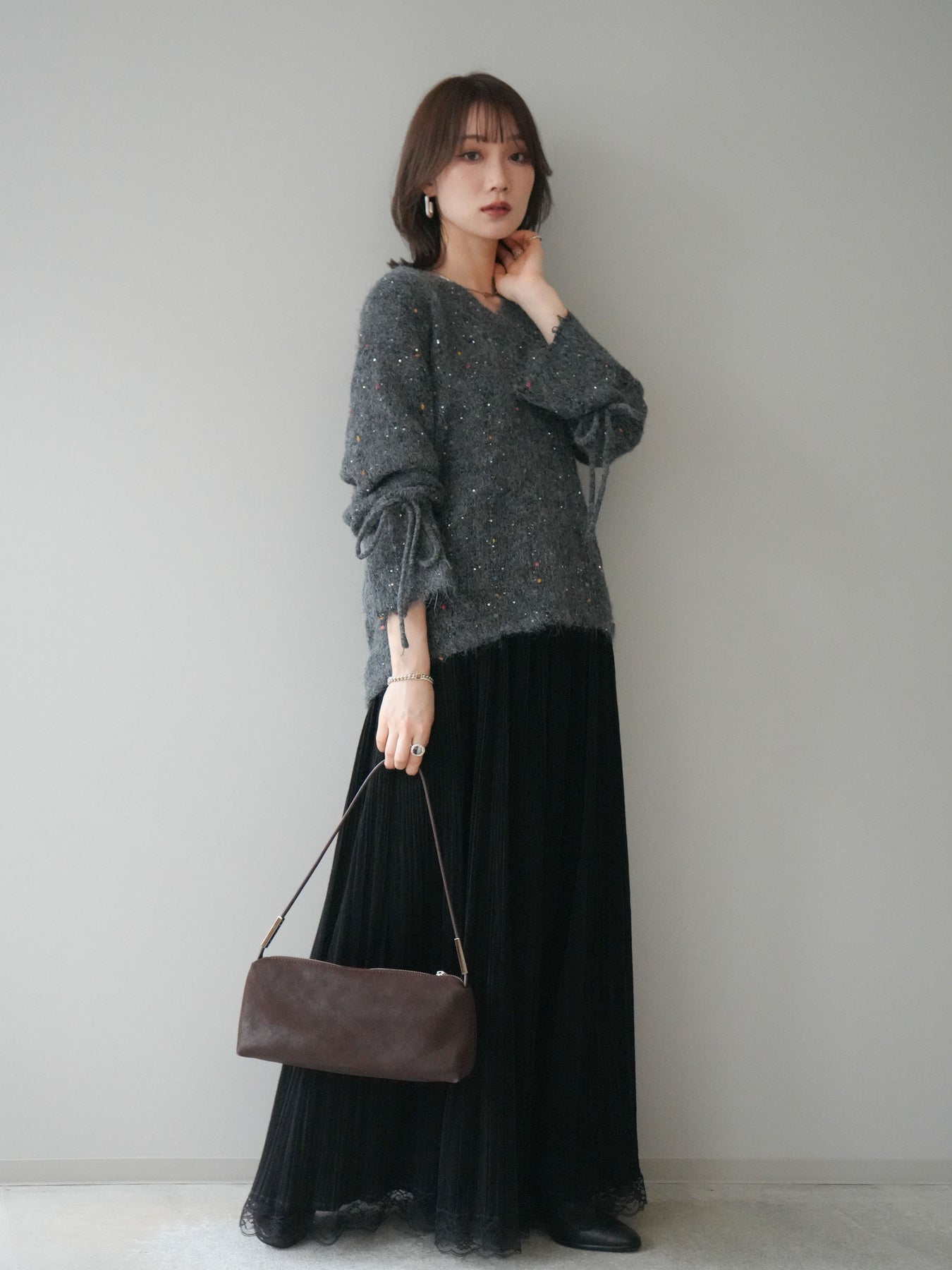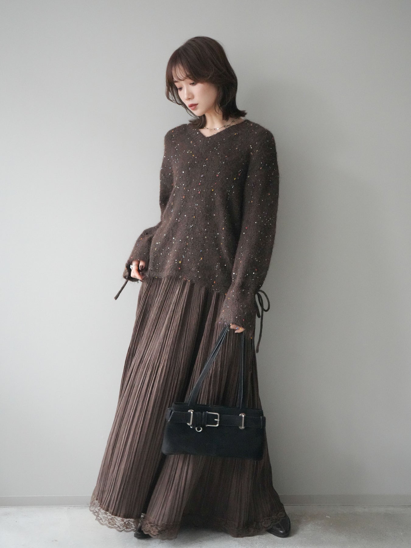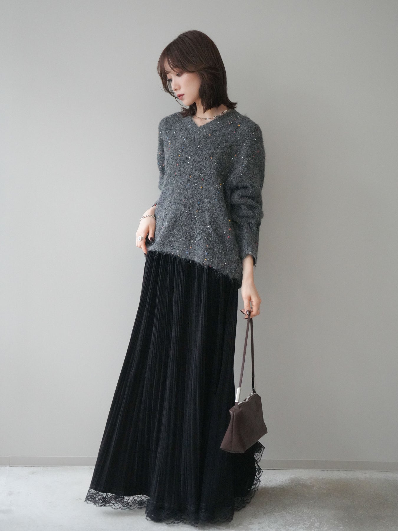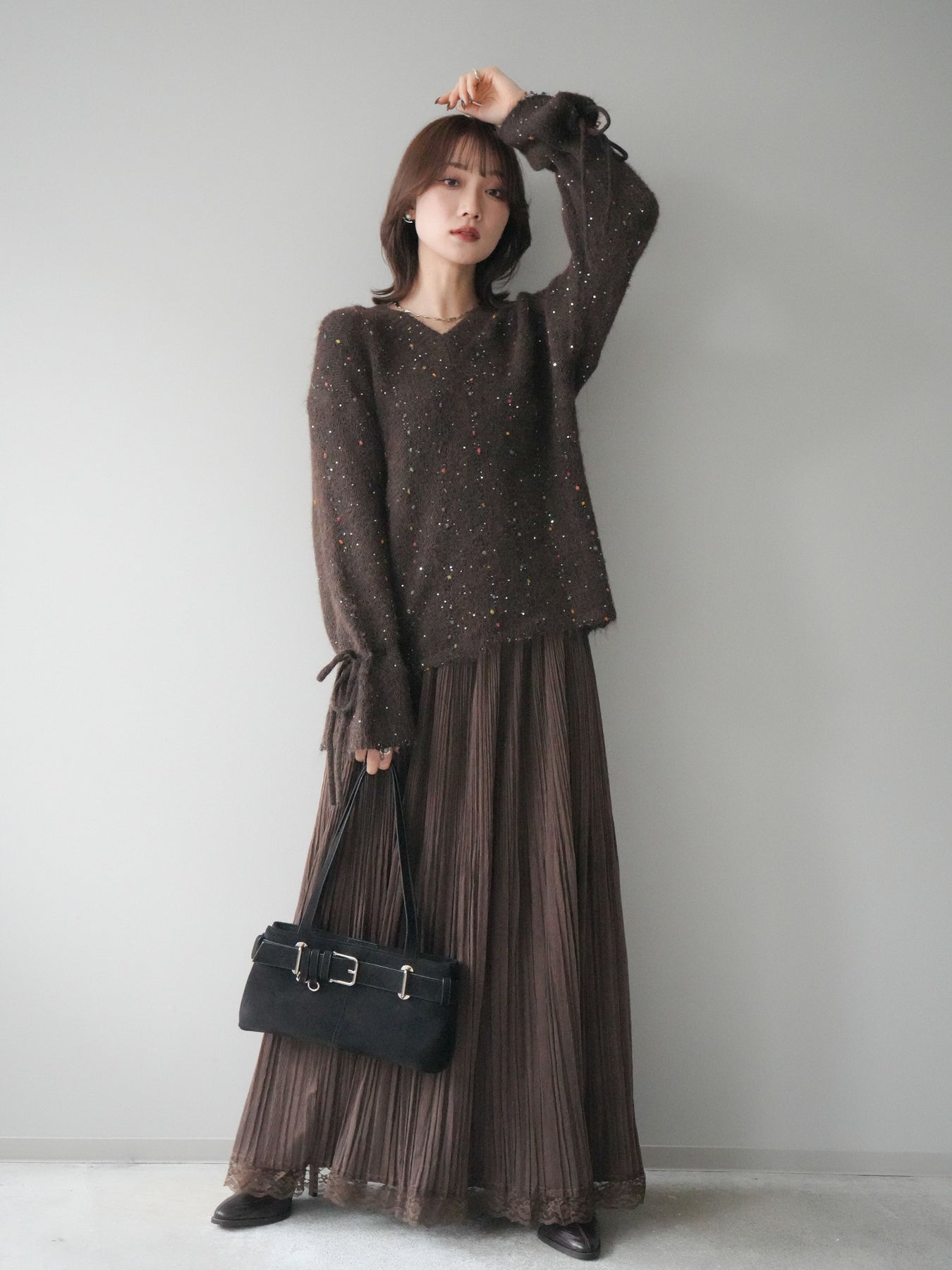 [SET]キャンディースリーブカラーネップスパンコールニットプルオーバー+裾レーススウェードプリーツマキシスカート(2set)