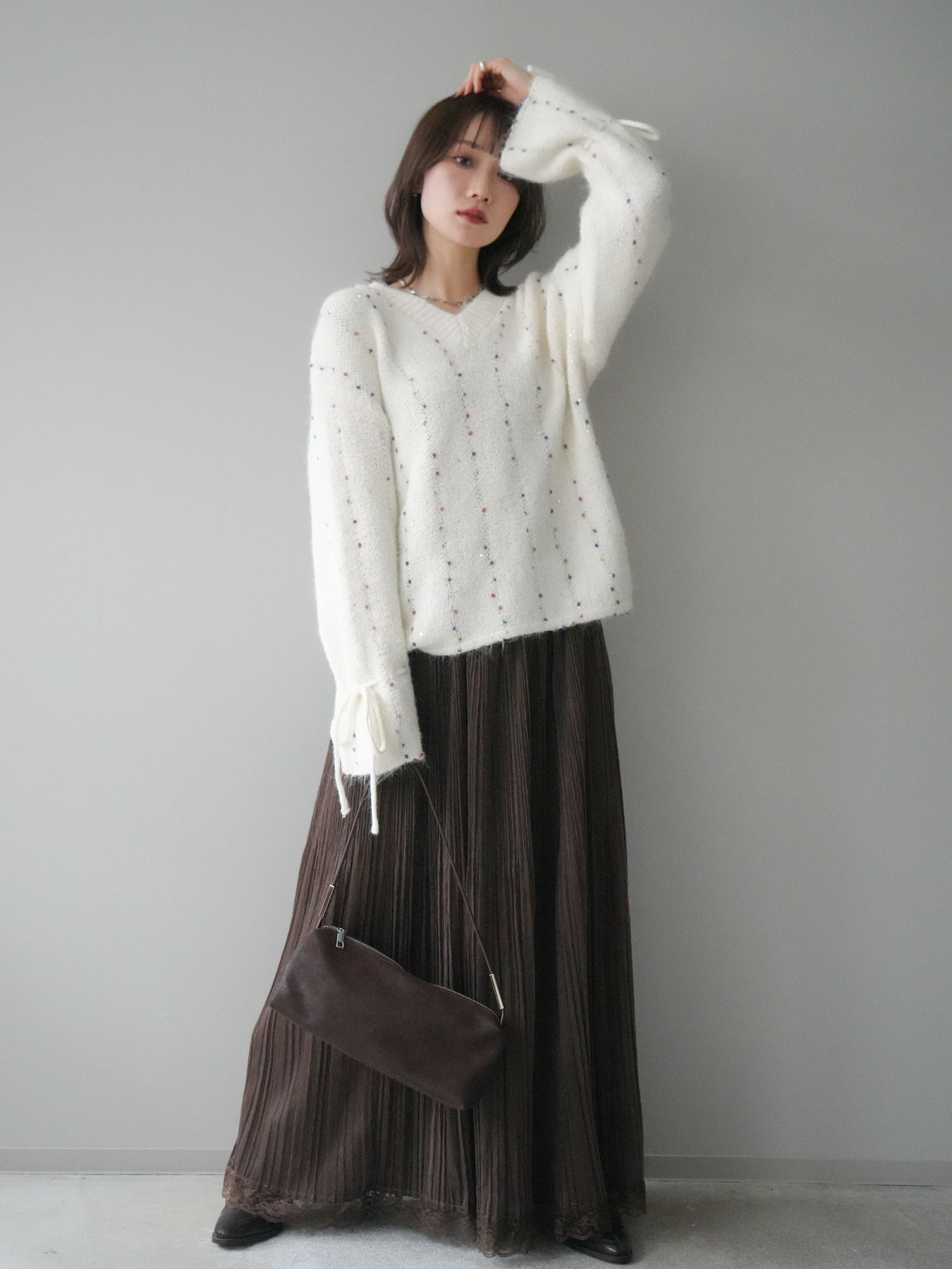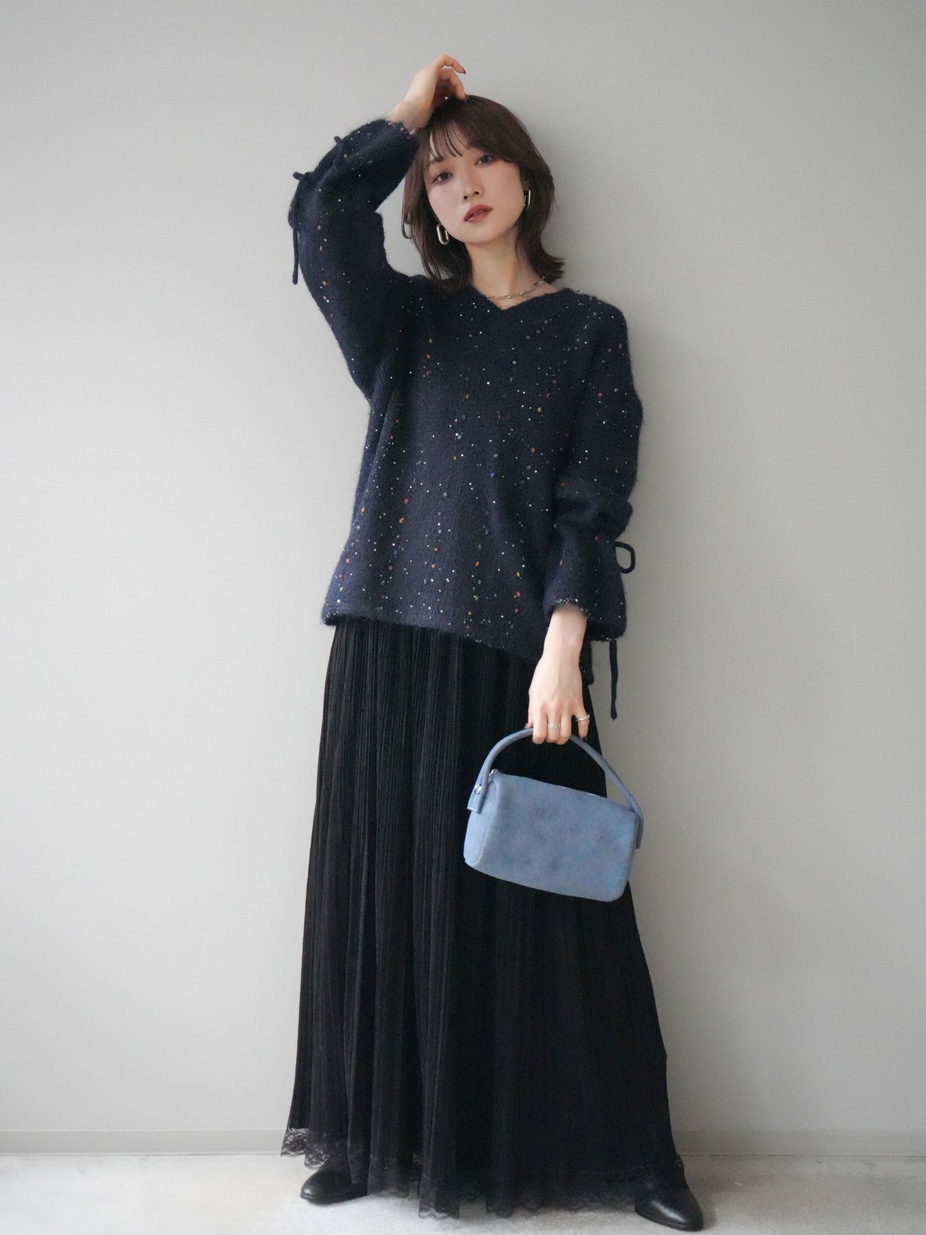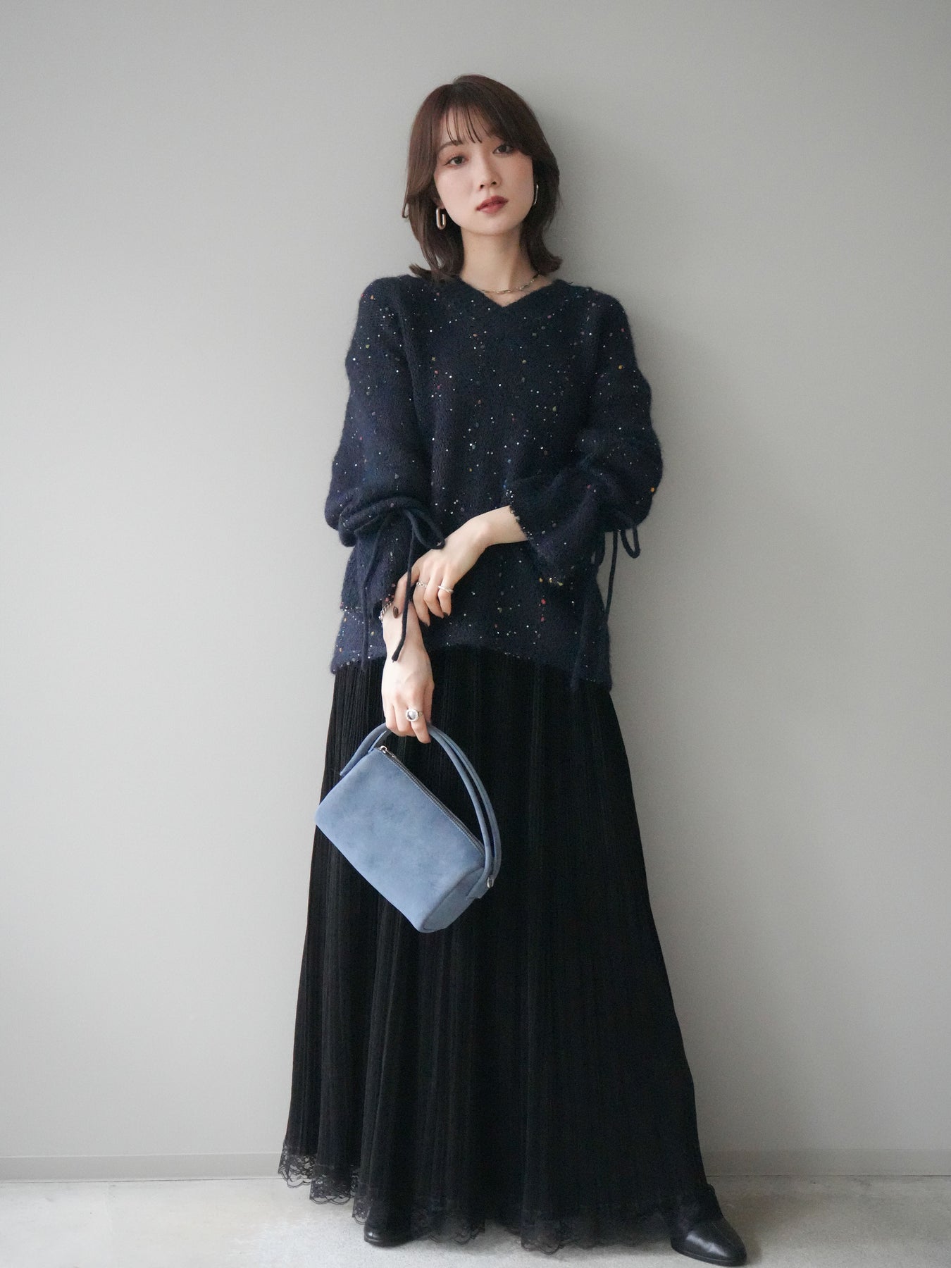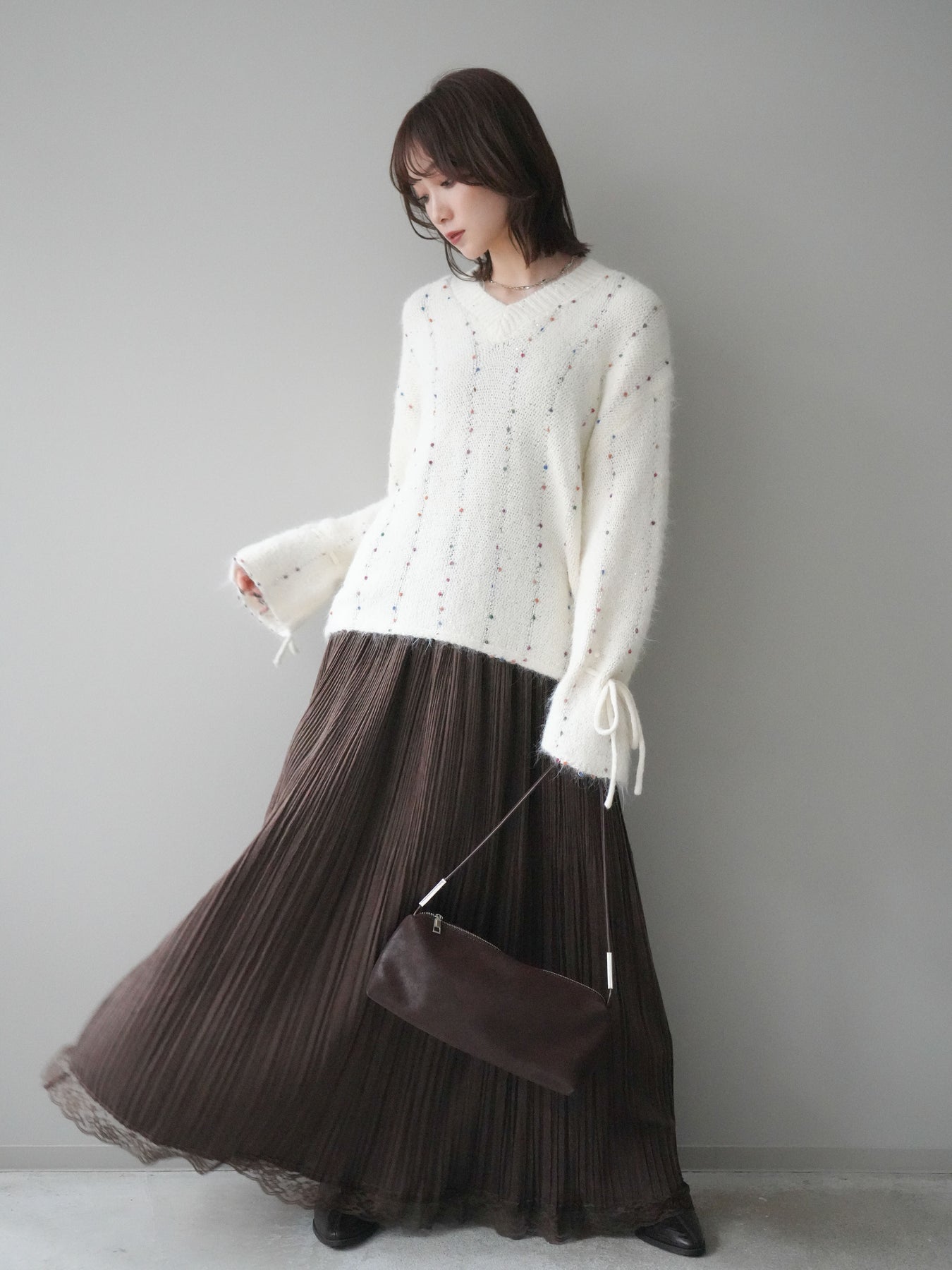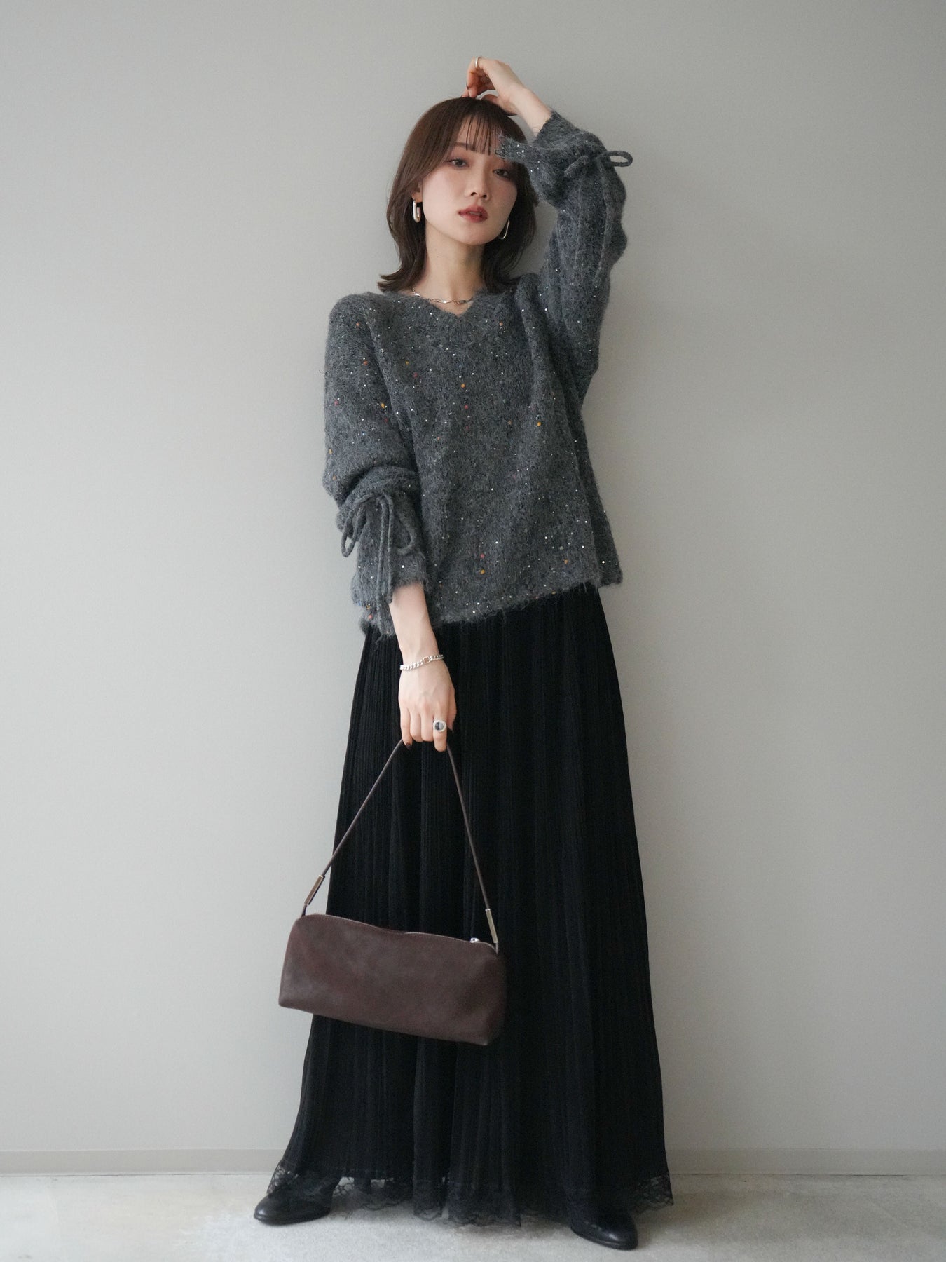 [SET]キャンディースリーブカラーネップスパンコールニットプルオーバー+裾レーススウェードプリーツマキシスカート(2set)