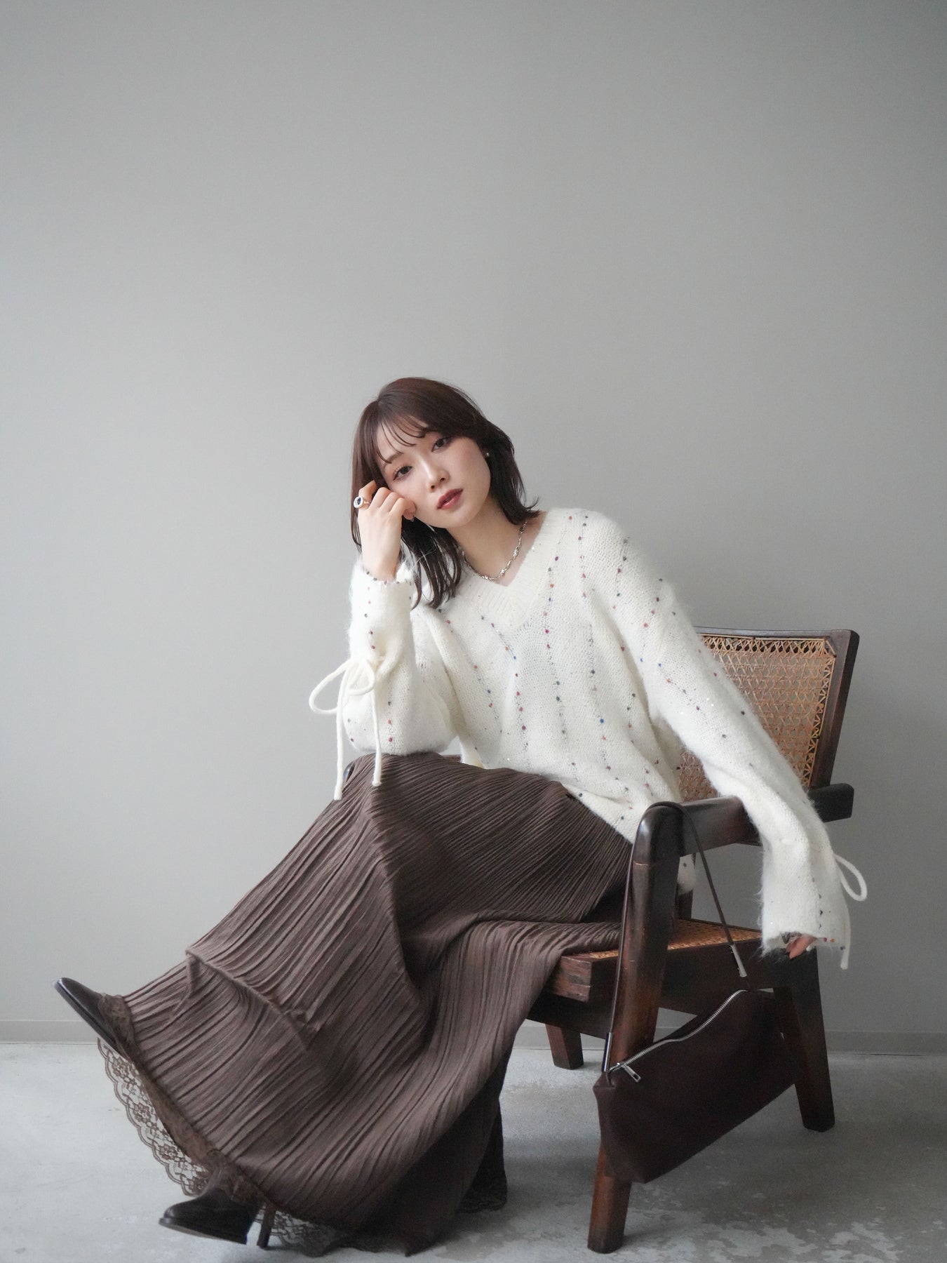 カラーネップを散りばめた糸にスパンコールをミックスした、華やかな表情が魅力のニットプルオーバー。袖口はキャンディのようにキュッと結べるリボン仕様で、女性らしいアクセントとシルエットの変化が楽しめます。ふんわりとした素材感が季節感を引き立てつつ、程よいゆとりのあるサイズ感でリラックスした着心地も魅力。デニムからスカートまで幅広いスタイリングにマッチし、1枚で主役になる着映えアイテムです。 ※ボトムス、キャミソール(インナー)以外の商品は一律でインナーは付属していません。