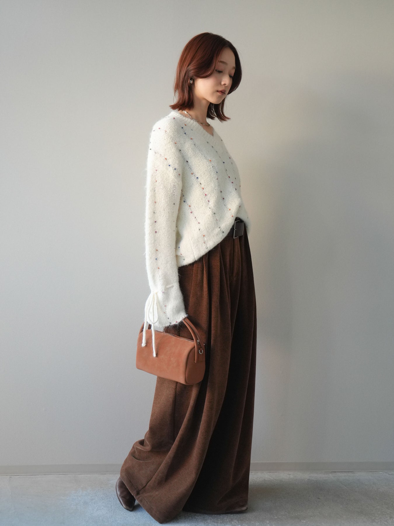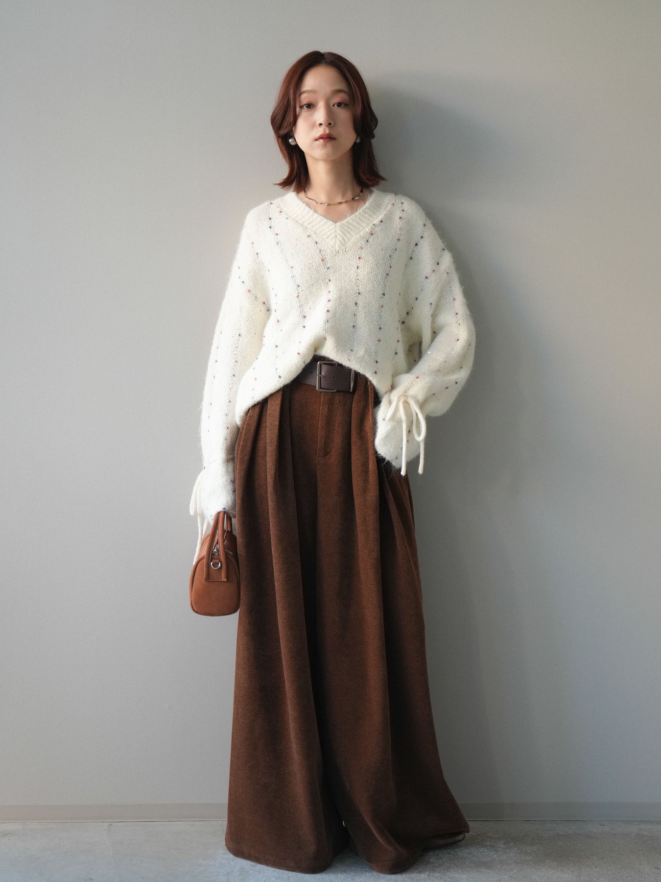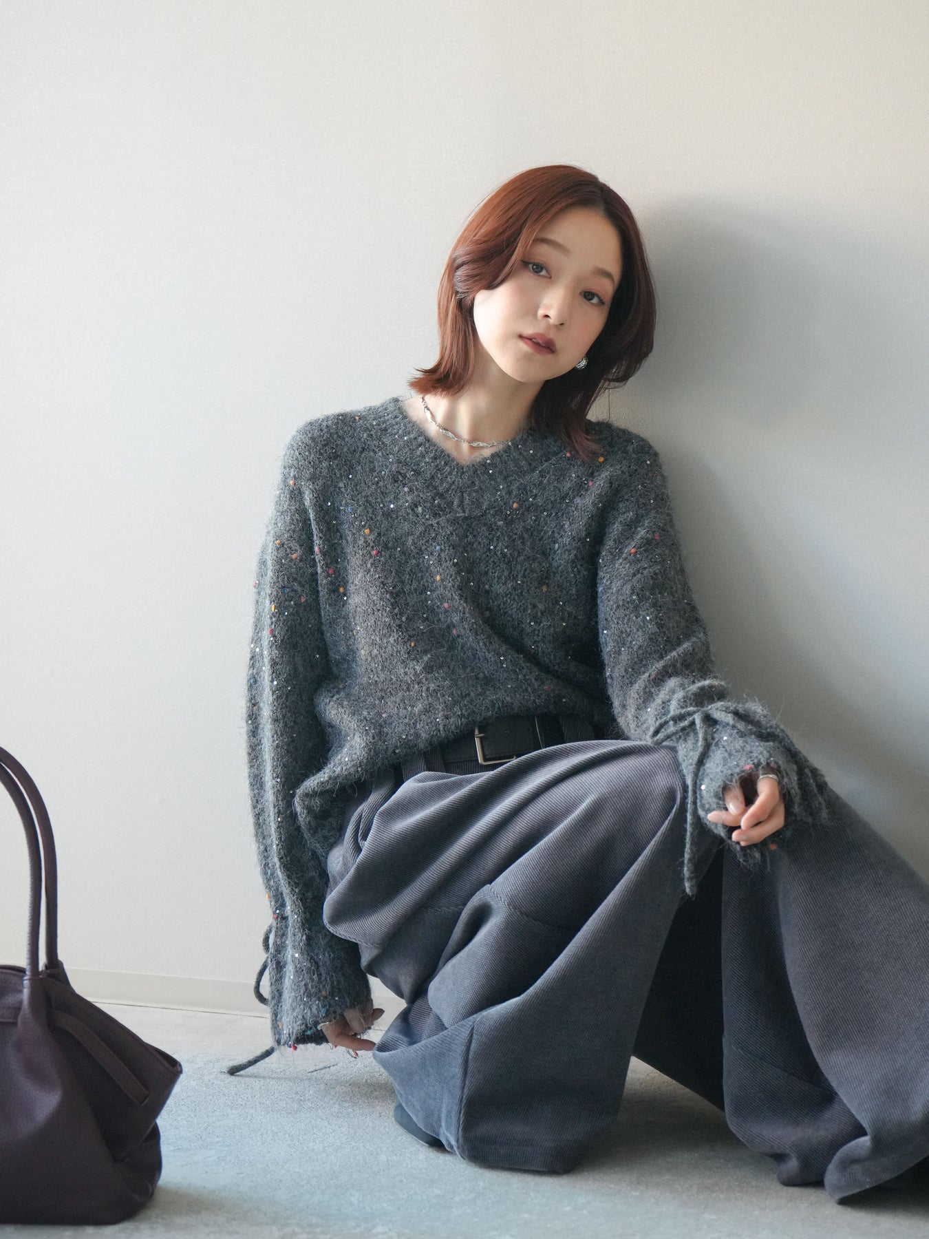 [SET]キャンディースリーブカラーネップスパンコールニットプルオーバー+ベルトデザインループコールテンワイドパンツ(ベルト付き)(2set)