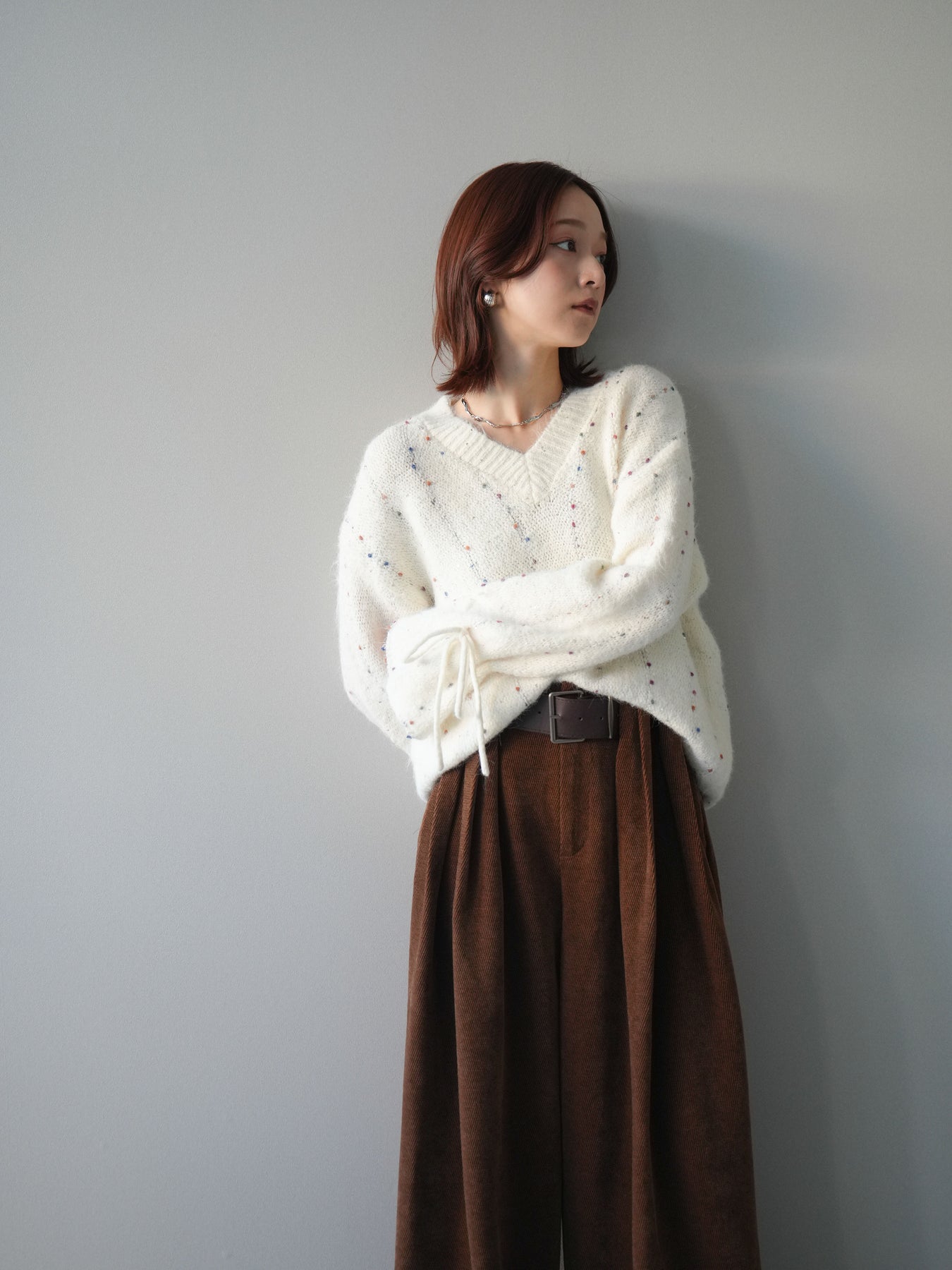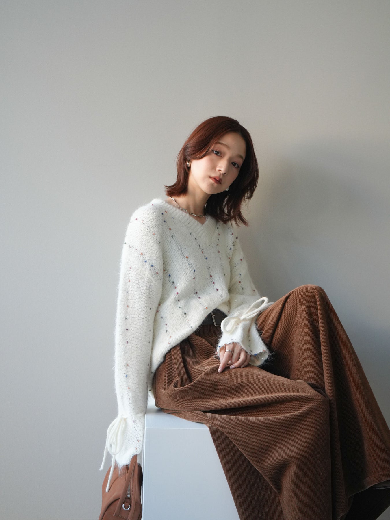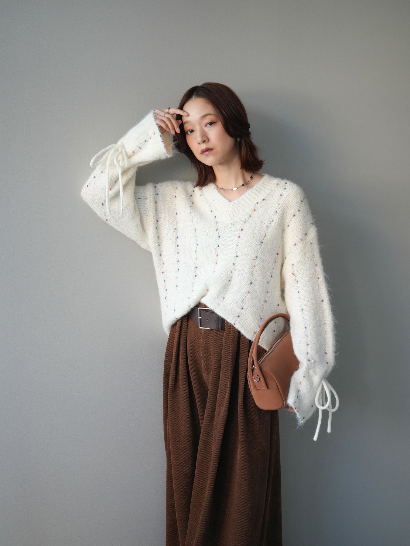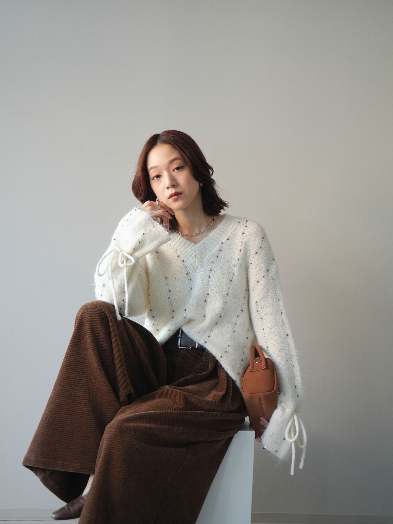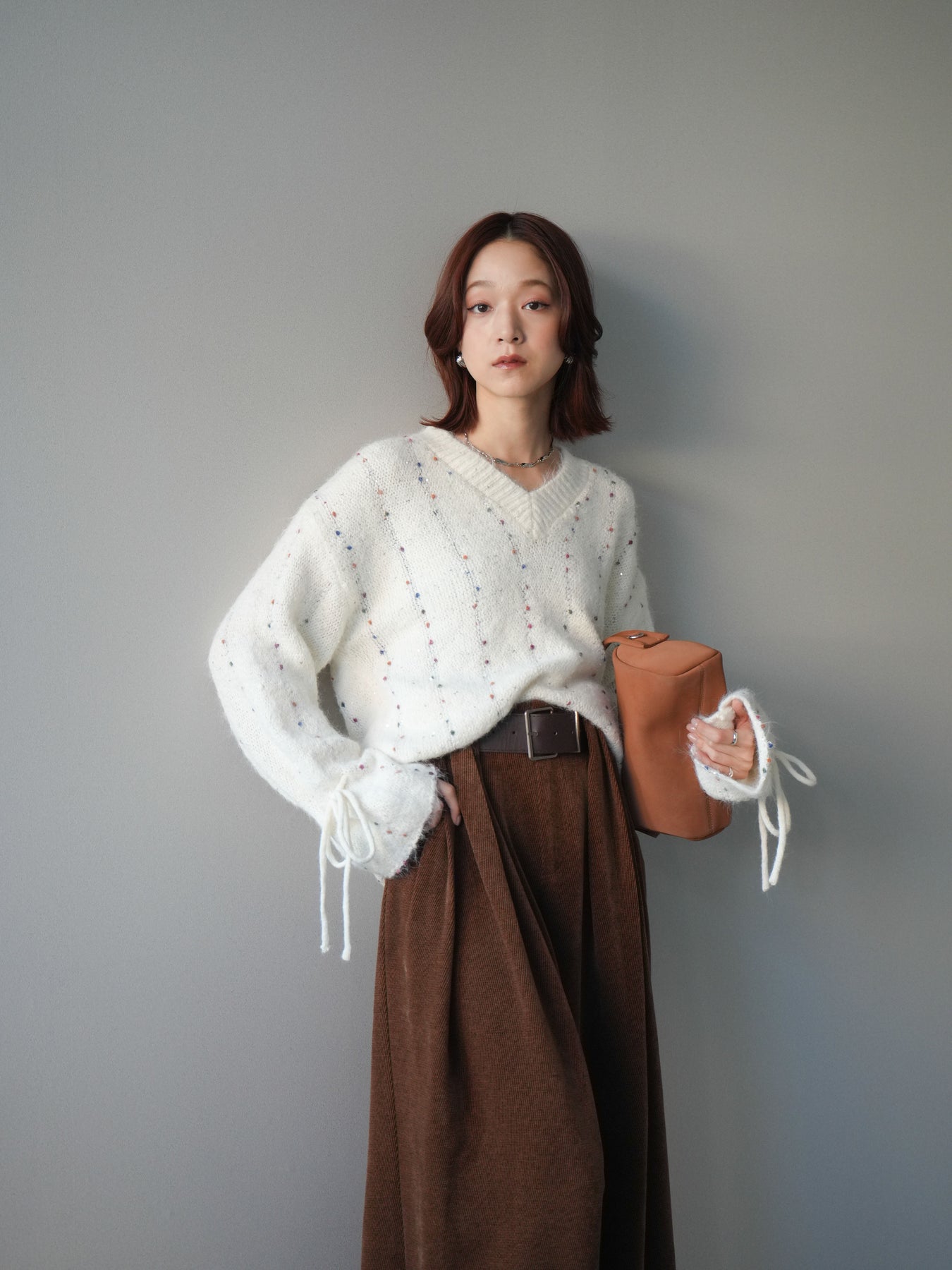 カラーネップを散りばめた糸にスパンコールをミックスした、華やかな表情が魅力のニットプルオーバー。袖口はキャンディのようにキュッと結べるリボン仕様で、女性らしいアクセントとシルエットの変化が楽しめます。ふんわりとした素材感が季節感を引き立てつつ、程よいゆとりのあるサイズ感でリラックスした着心地も魅力。デニムからスカートまで幅広いスタイリングにマッチし、1枚で主役になる着映えアイテムです。 ※ボトムス、キャミソール(インナー)以外の商品は一律でインナーは付属していません。