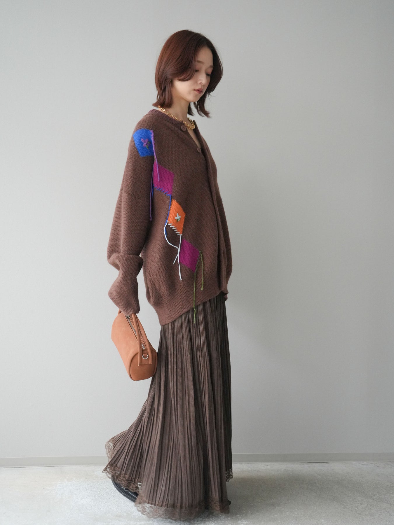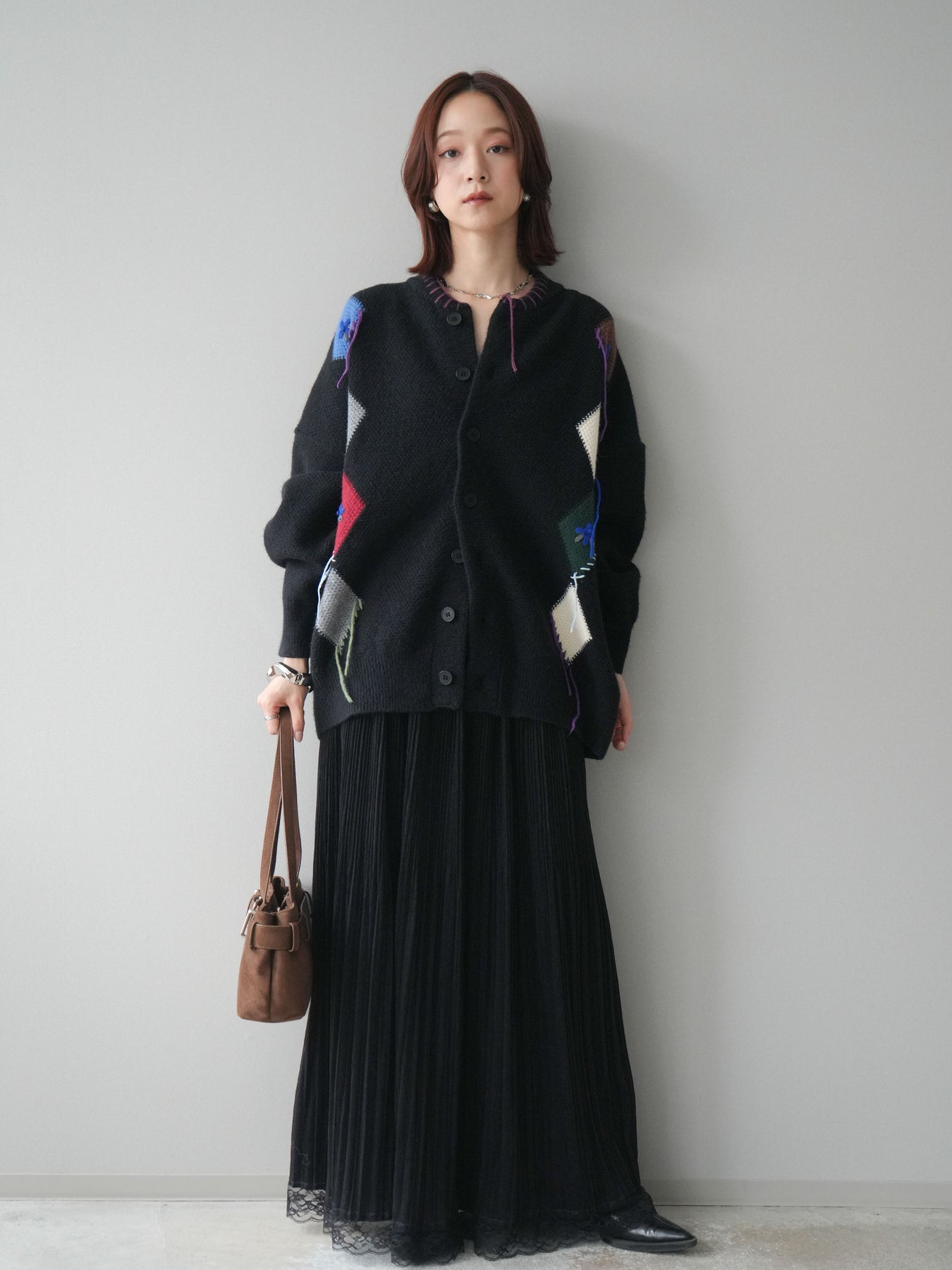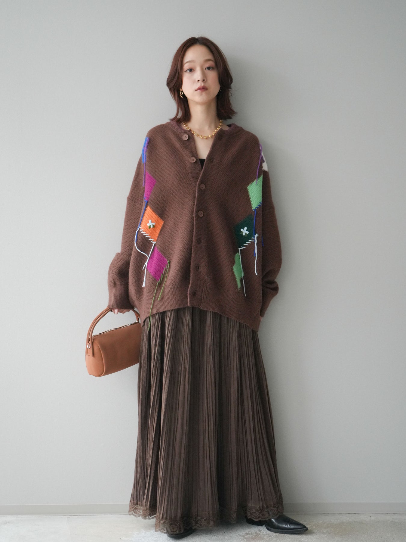 [SET]ハンドステッチアーガイルデザインニットカーディガン+裾レーススウェードプリーツマキシスカート(2set)