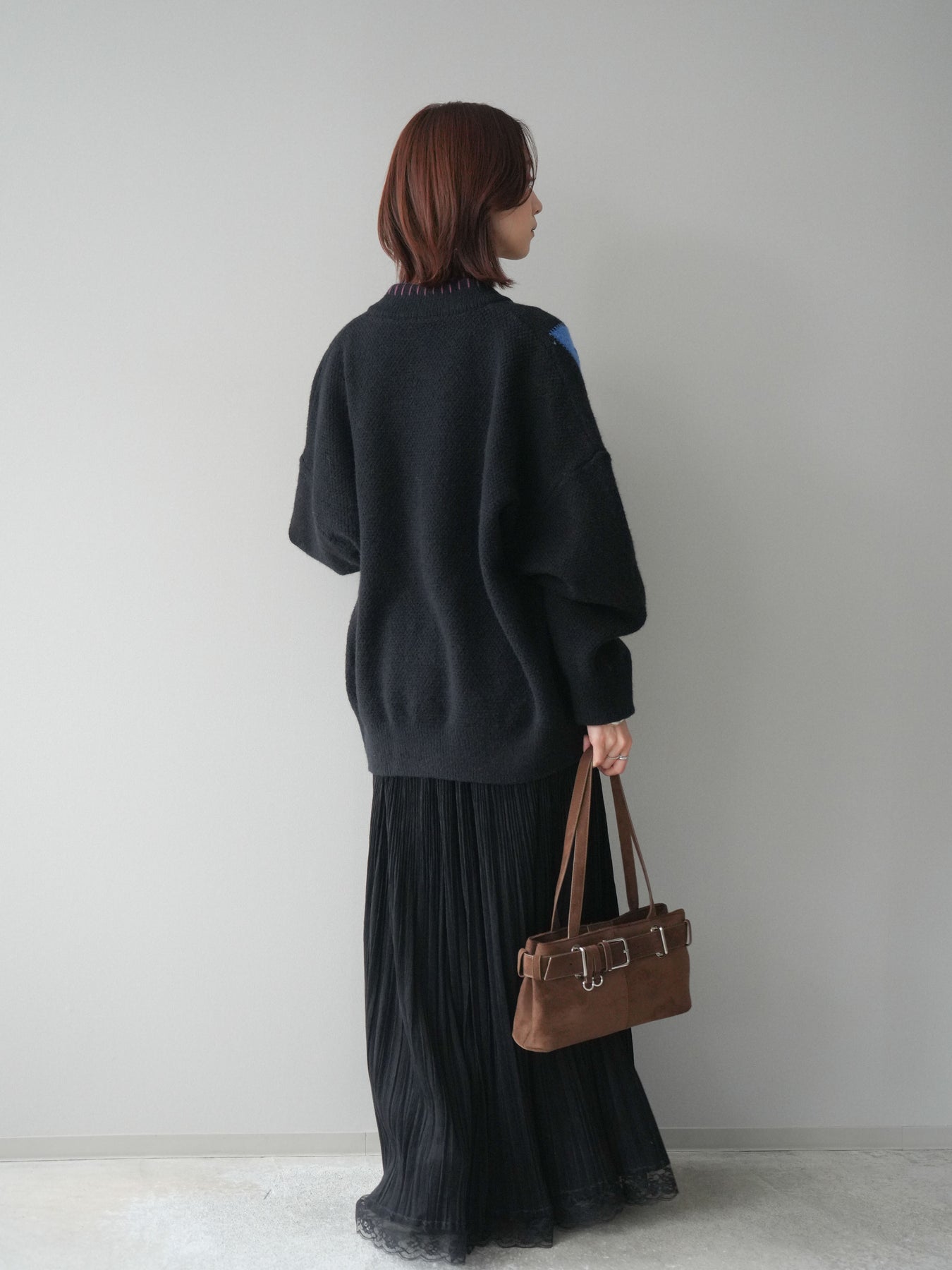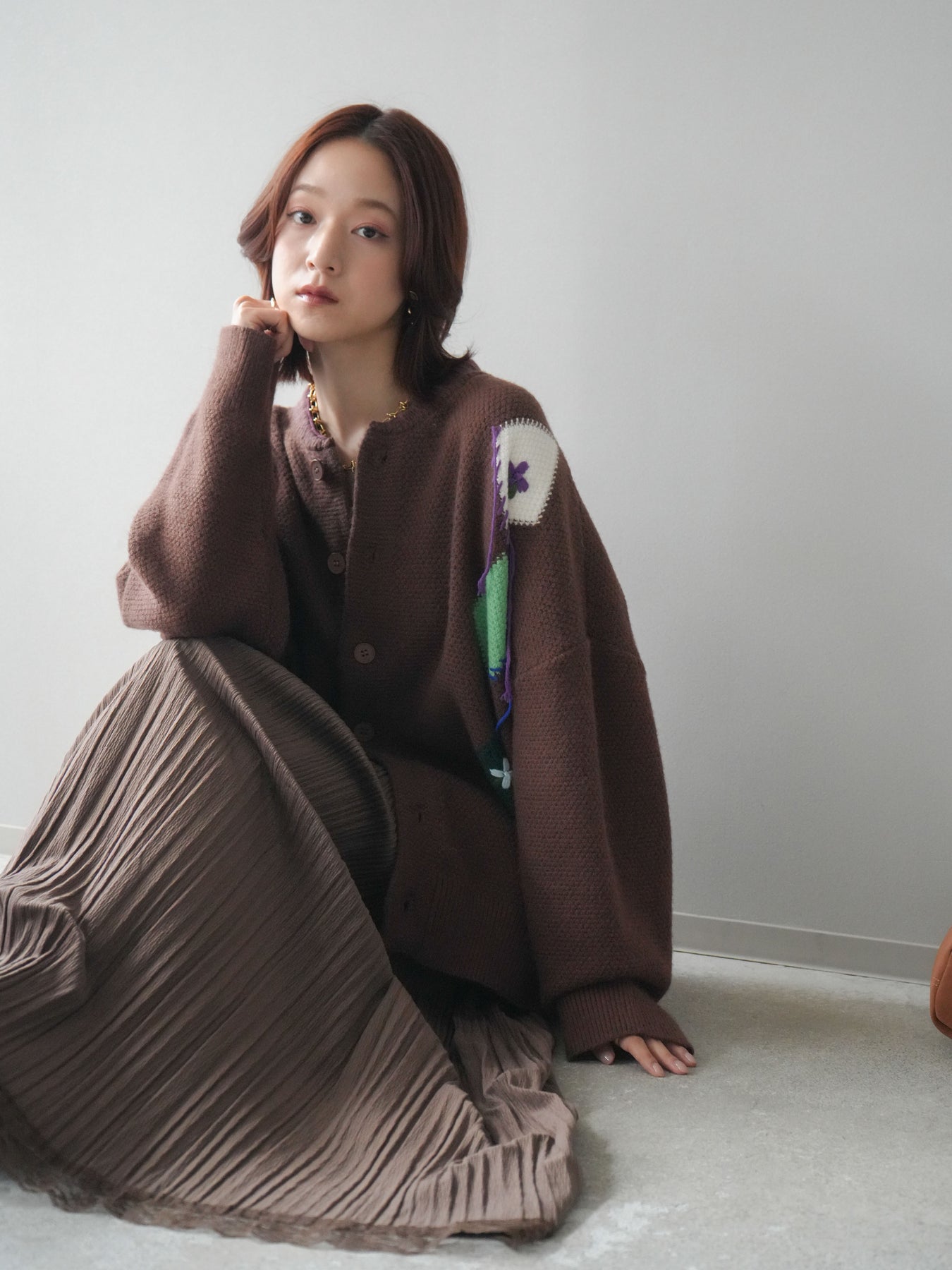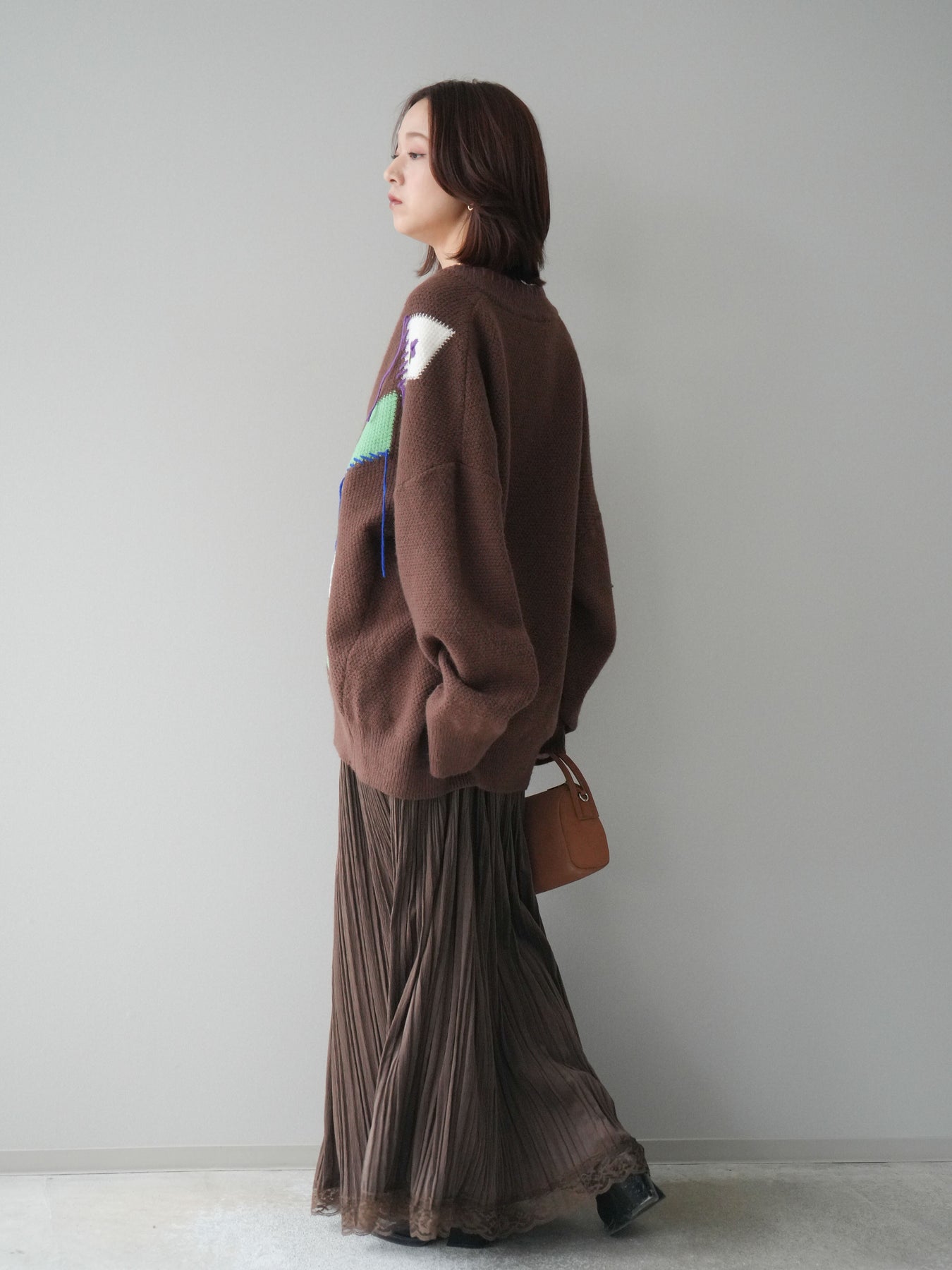 [SET]ハンドステッチアーガイルデザインニットカーディガン+裾レーススウェードプリーツマキシスカート(2set)