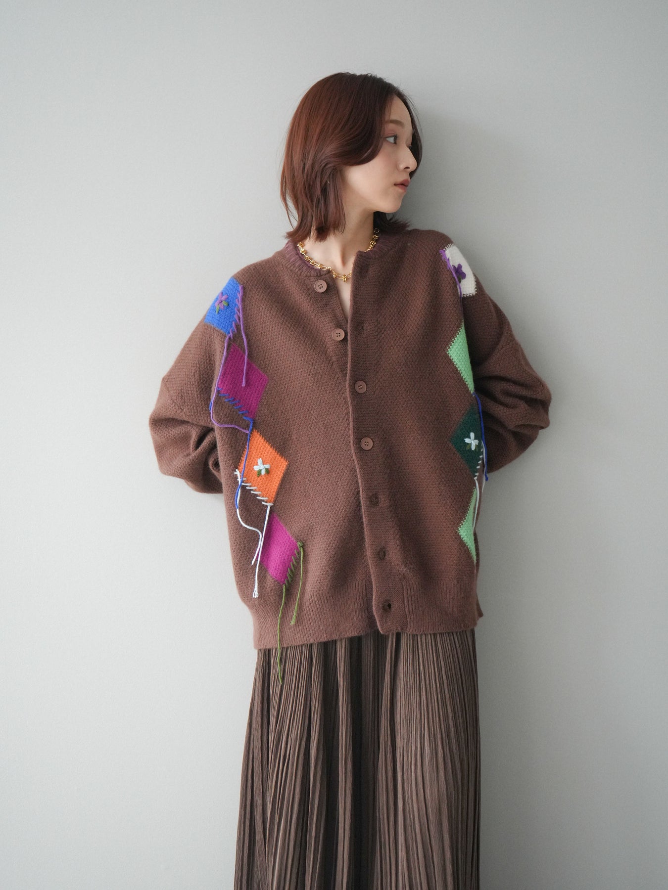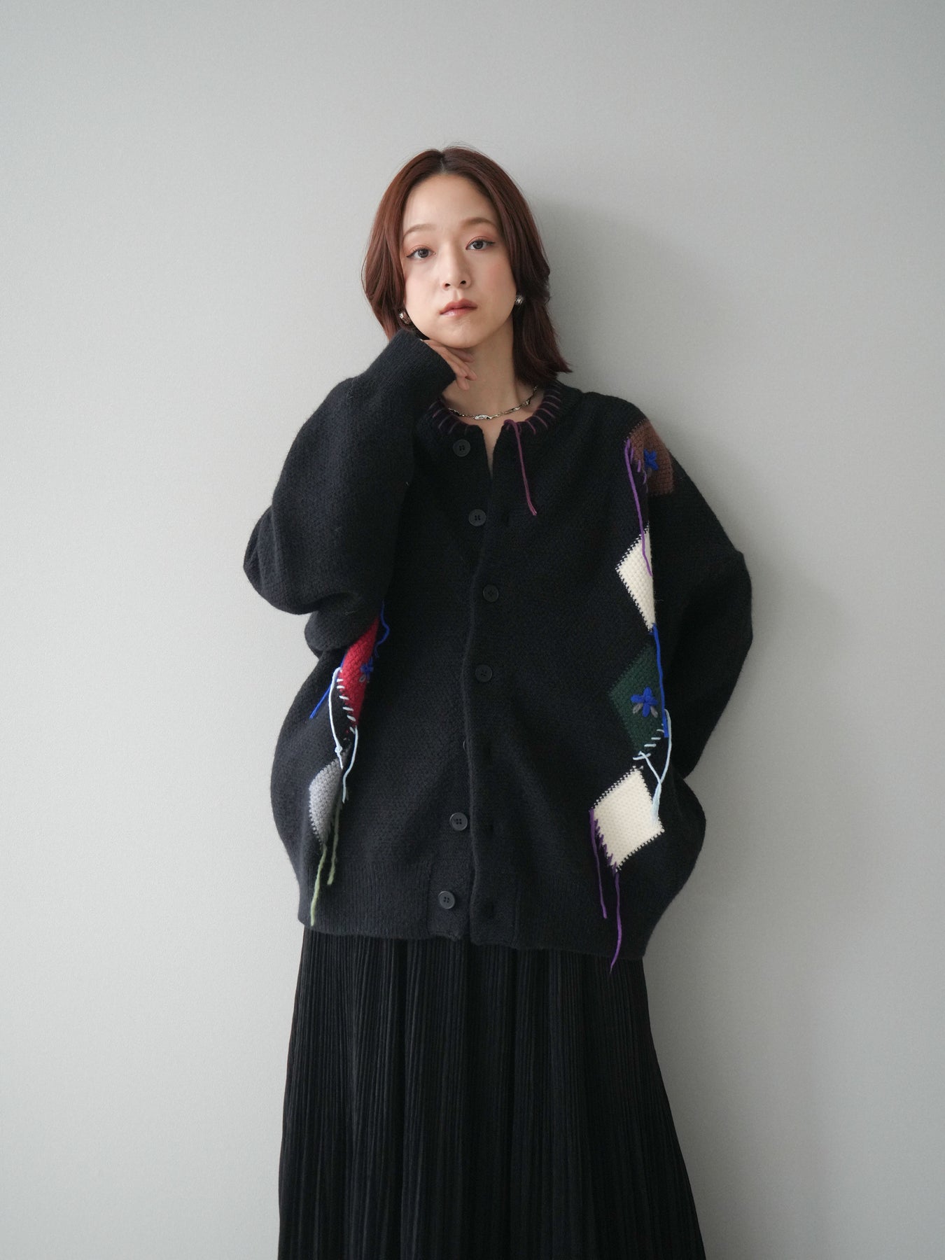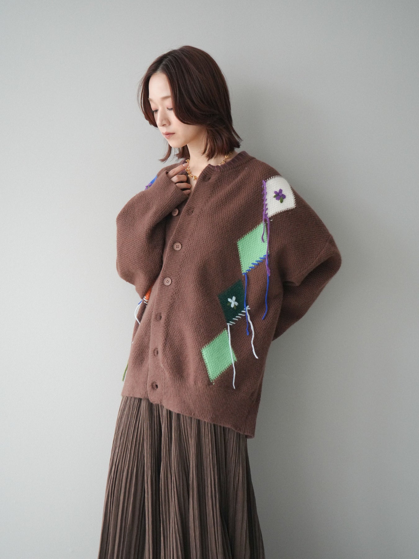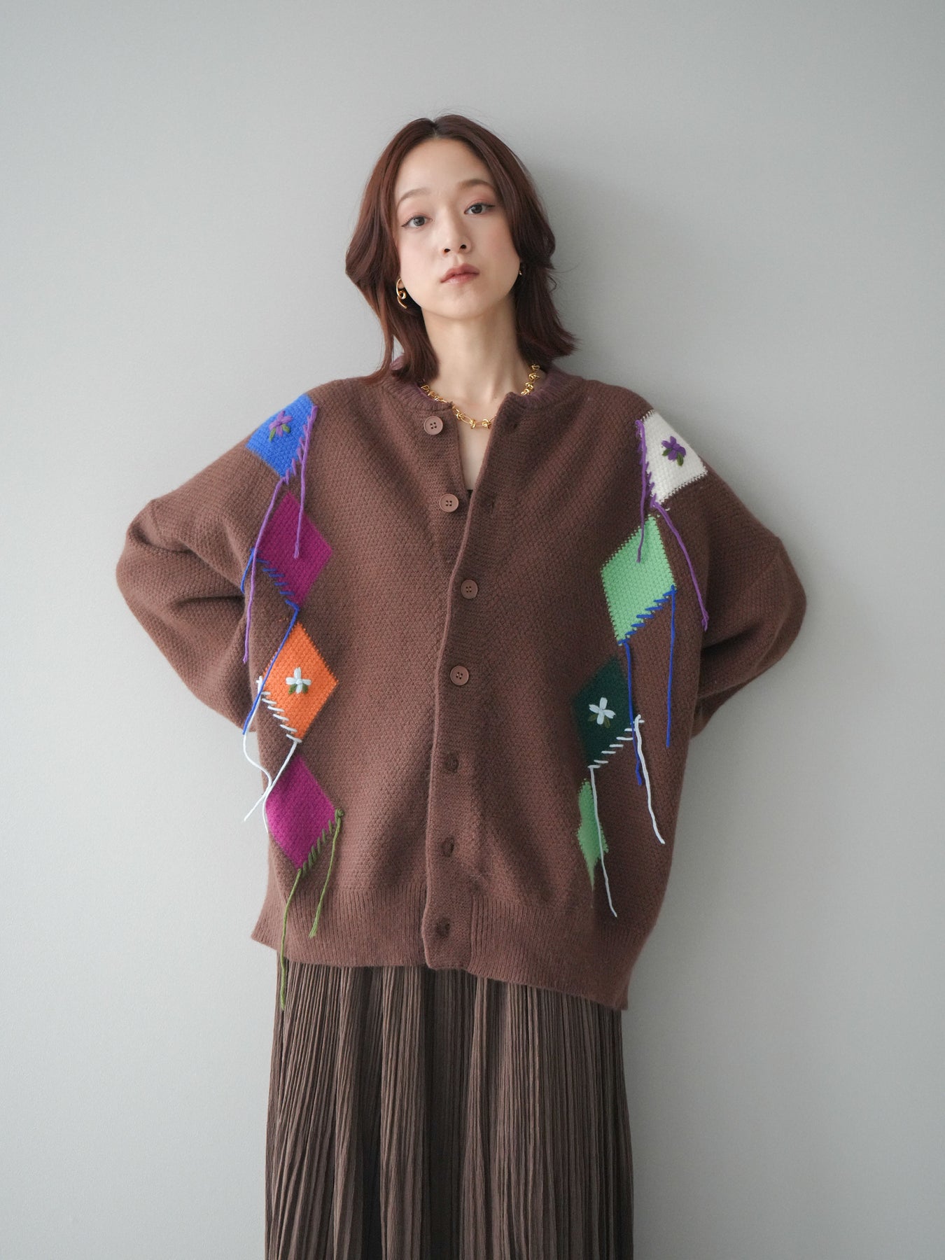 異素材の編地とハンドステッチ風のディテールを組み合わせた、存在感あふれるアーガイルデザインのニットカーディガン。色や質感の異なるパッチワークのような装飾が視覚的な楽しさを加え、1枚で主役になる着映えアイテムに仕上がっています。ゆったりとしたシルエットと柔らかなニット素材がリラックスした着心地を叶えつつ、フロントのボタンで着こなしのアレンジも自在。シンプルなボトムスに合わせるだけでスタイルが完成する、個性と暖かみを兼ね備えた一枚です。 ※ボトムス、キャミソール(インナー)以外の商品は一律でインナーは付属していません。
