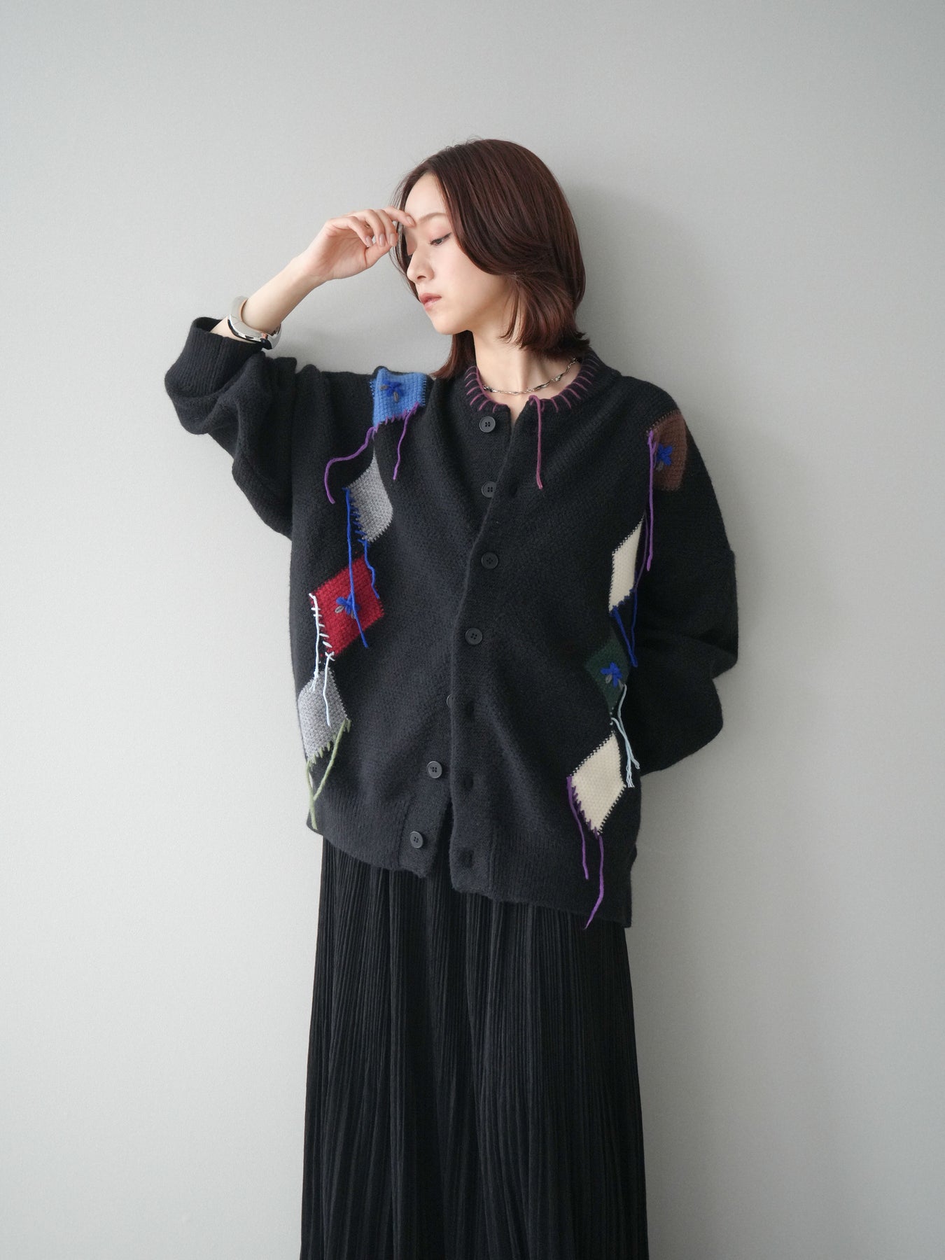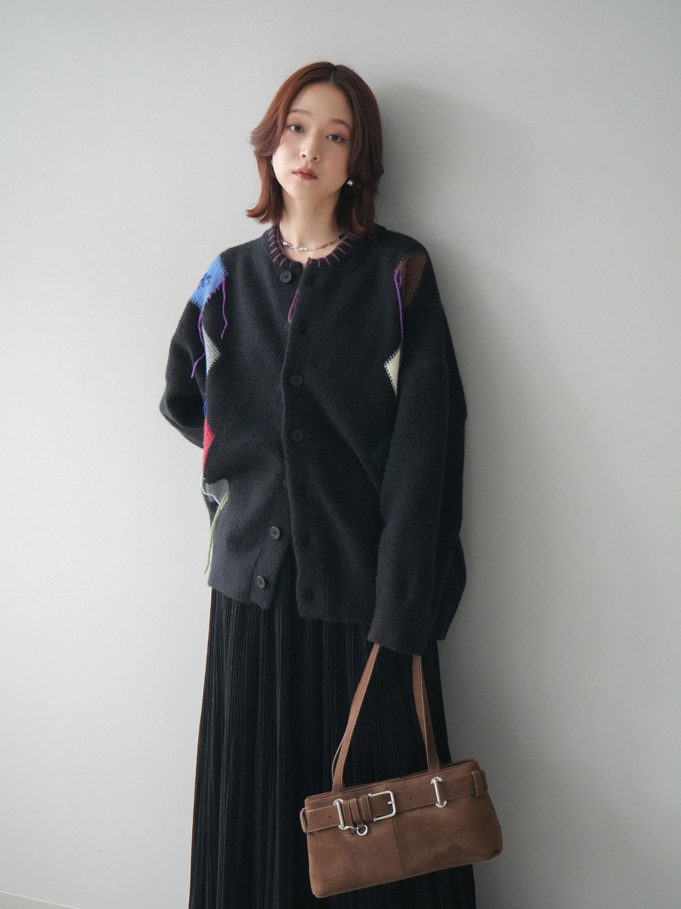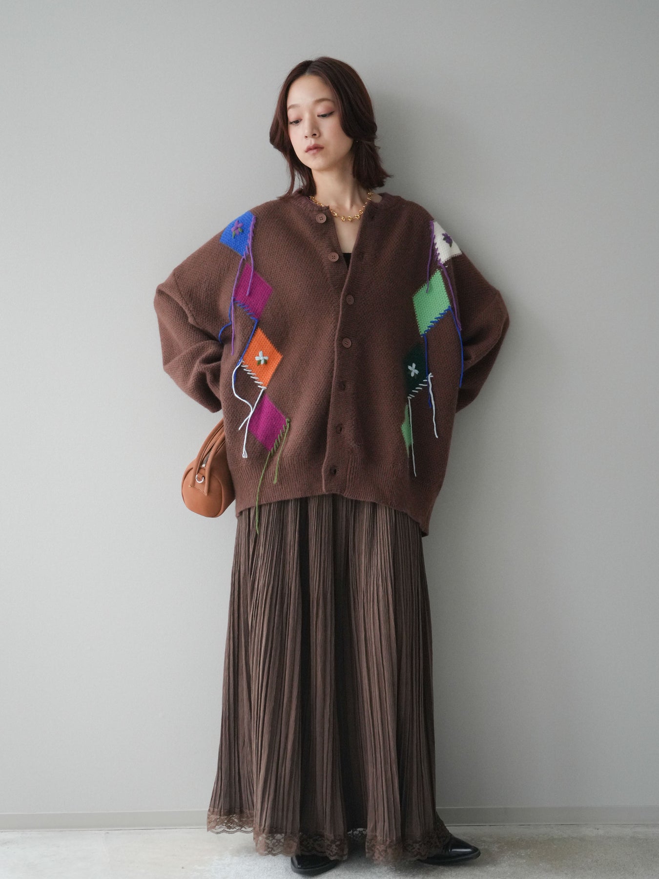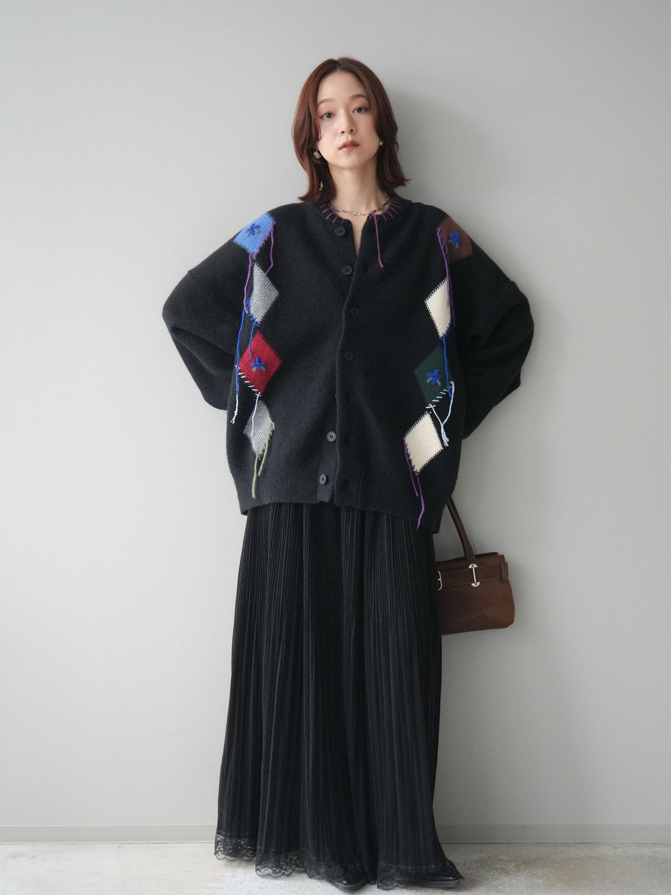 異素材の編地とハンドステッチ風のディテールを組み合わせた、存在感あふれるアーガイルデザインのニットカーディガン。色や質感の異なるパッチワークのような装飾が視覚的な楽しさを加え、1枚で主役になる着映えアイテムに仕上がっています。ゆったりとしたシルエットと柔らかなニット素材がリラックスした着心地を叶えつつ、フロントのボタンで着こなしのアレンジも自在。シンプルなボトムスに合わせるだけでスタイルが完成する、個性と暖かみを兼ね備えた一枚です。 ※ボトムス、キャミソール(インナー)以外の商品は一律でインナーは付属していません。