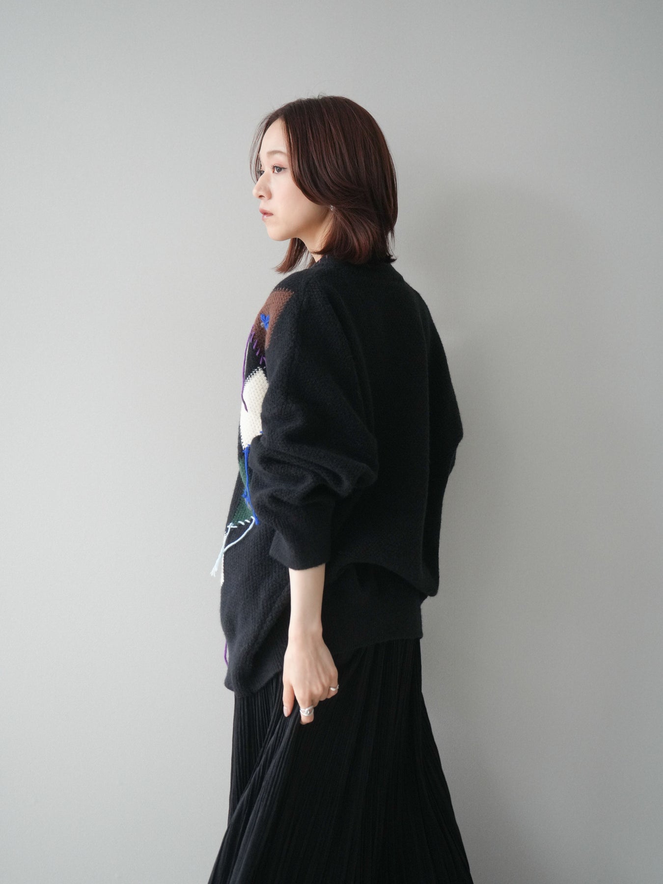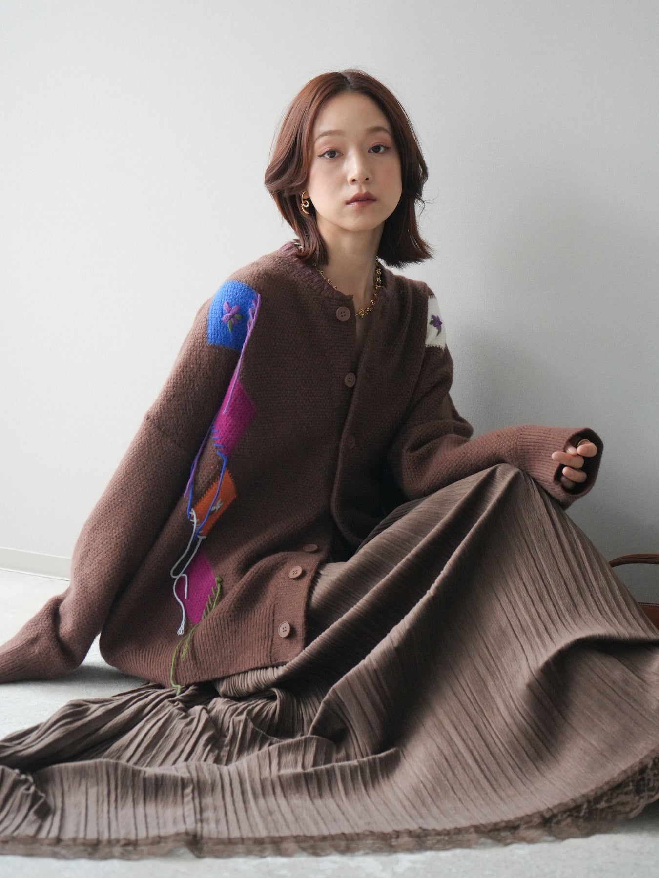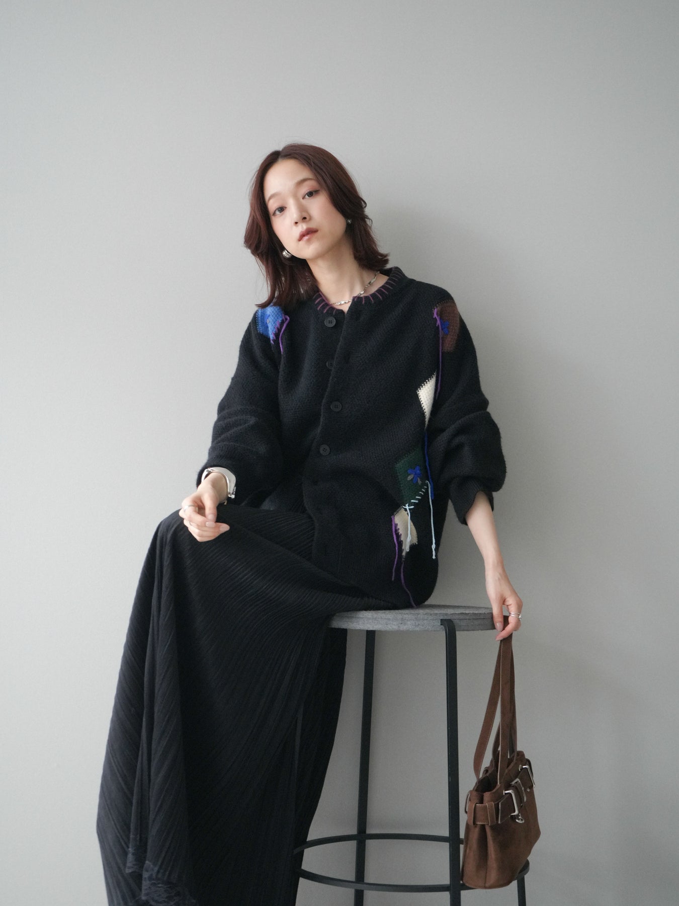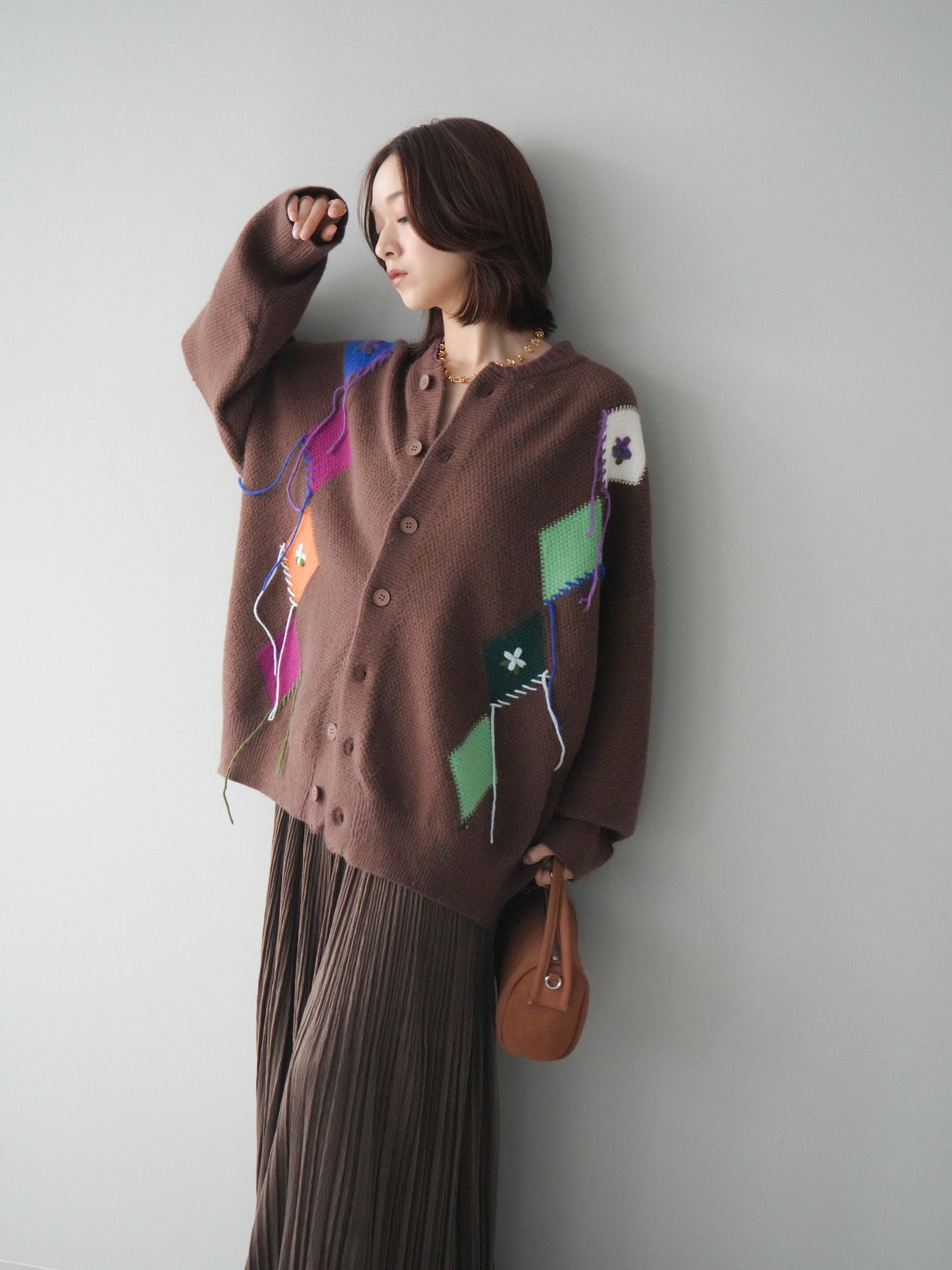 異素材の編地とハンドステッチ風のディテールを組み合わせた、存在感あふれるアーガイルデザインのニットカーディガン。色や質感の異なるパッチワークのような装飾が視覚的な楽しさを加え、1枚で主役になる着映えアイテムに仕上がっています。ゆったりとしたシルエットと柔らかなニット素材がリラックスした着心地を叶えつつ、フロントのボタンで着こなしのアレンジも自在。シンプルなボトムスに合わせるだけでスタイルが完成する、個性と暖かみを兼ね備えた一枚です。 ※ボトムス、キャミソール(インナー)以外の商品は一律でインナーは付属していません。
