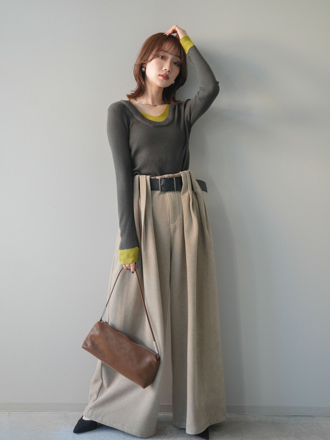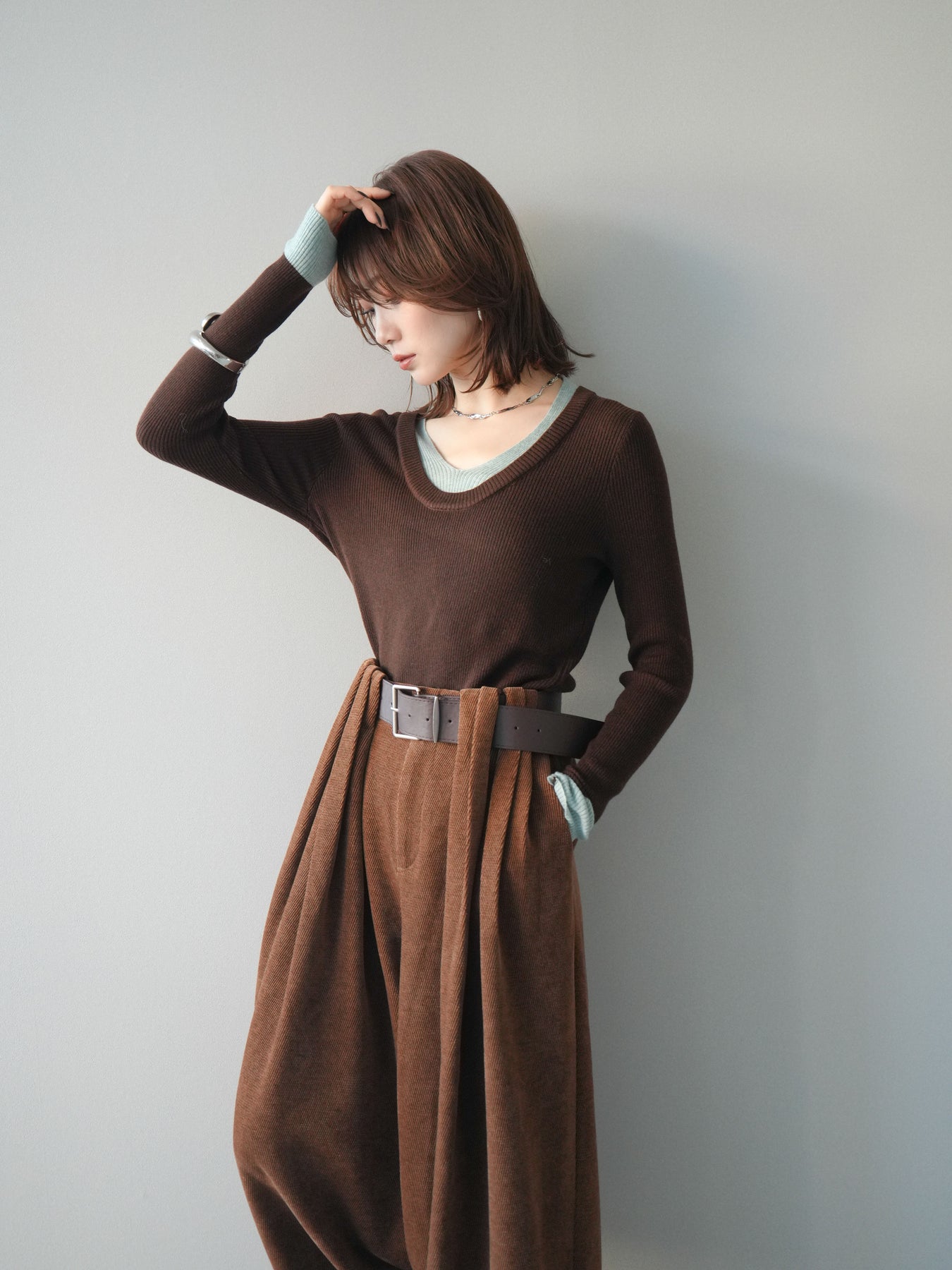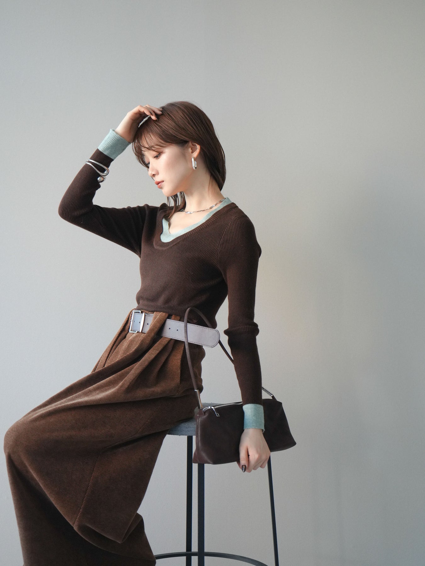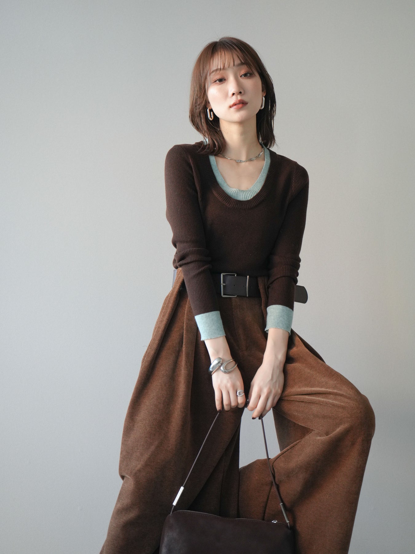 [SET]Uネック配色レイヤードリブニットトップス+ベルトデザインループコールテンワイドパンツ(ベルト付き)(2set)