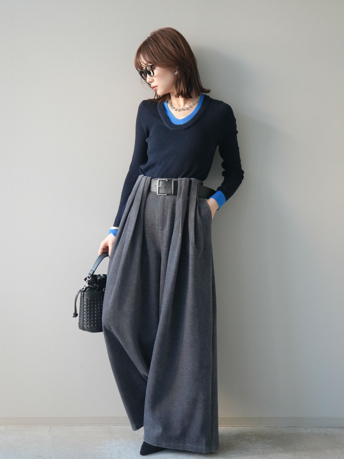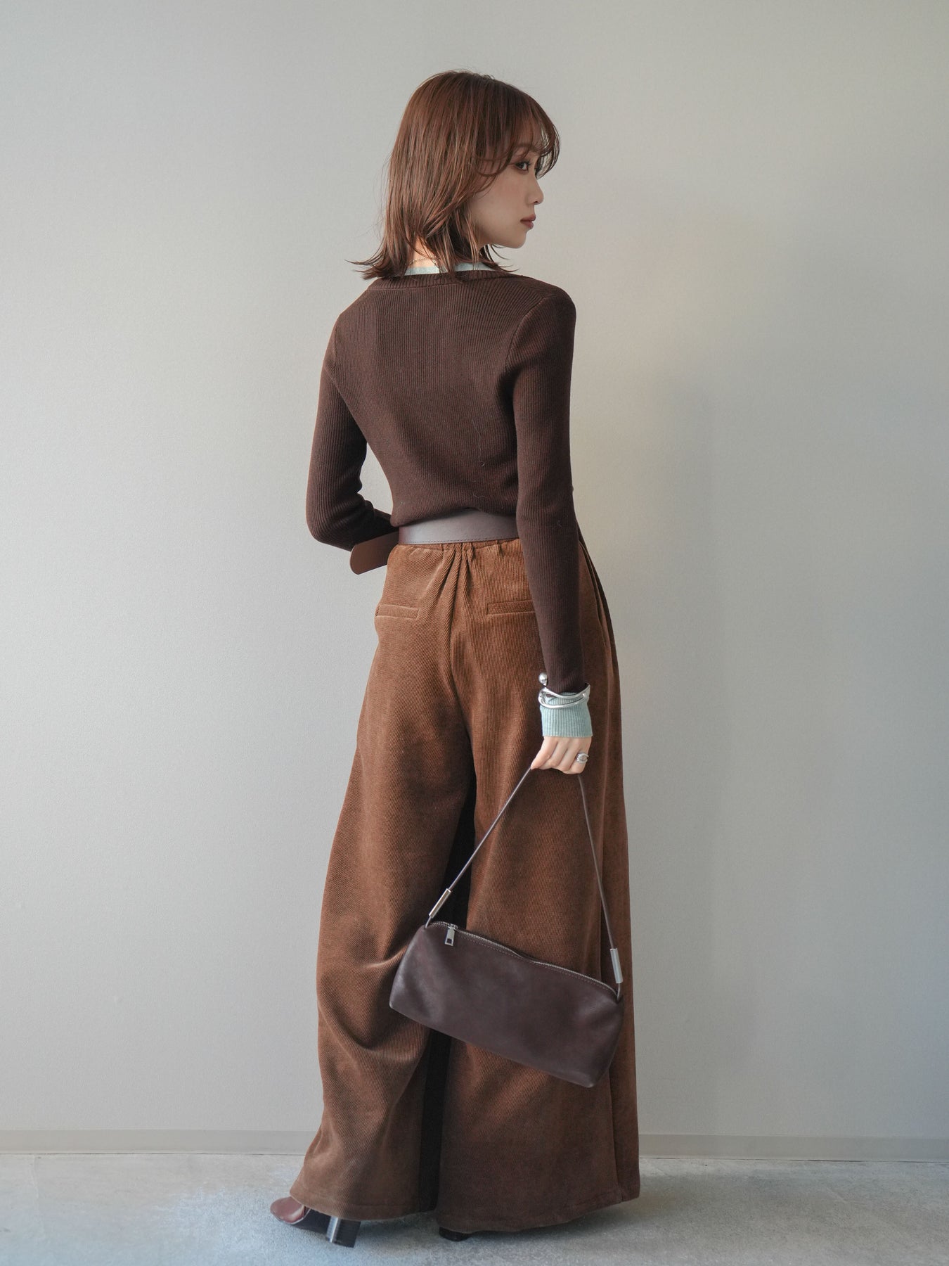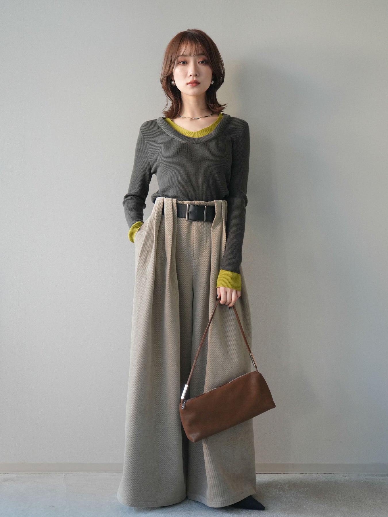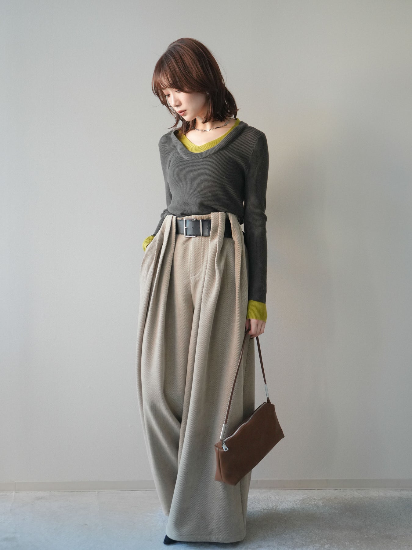 [SET]Uネック配色レイヤードリブニットトップス+ベルトデザインループコールテンワイドパンツ(ベルト付き)(2set)