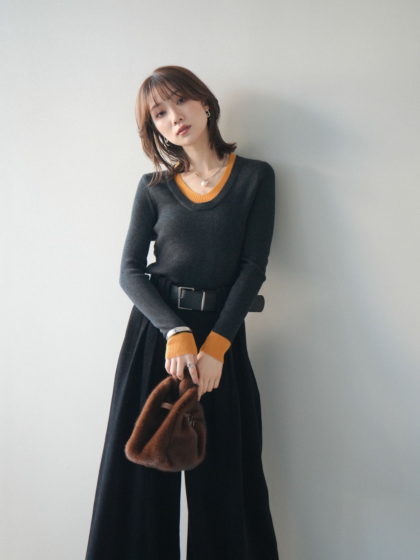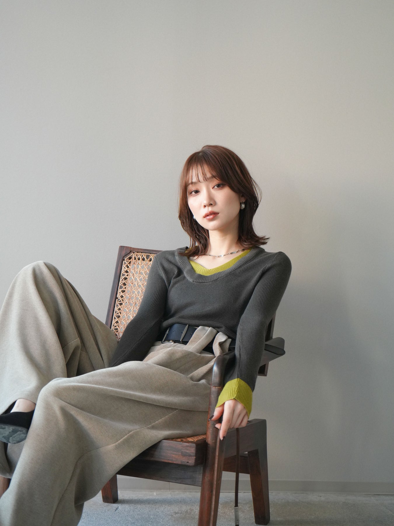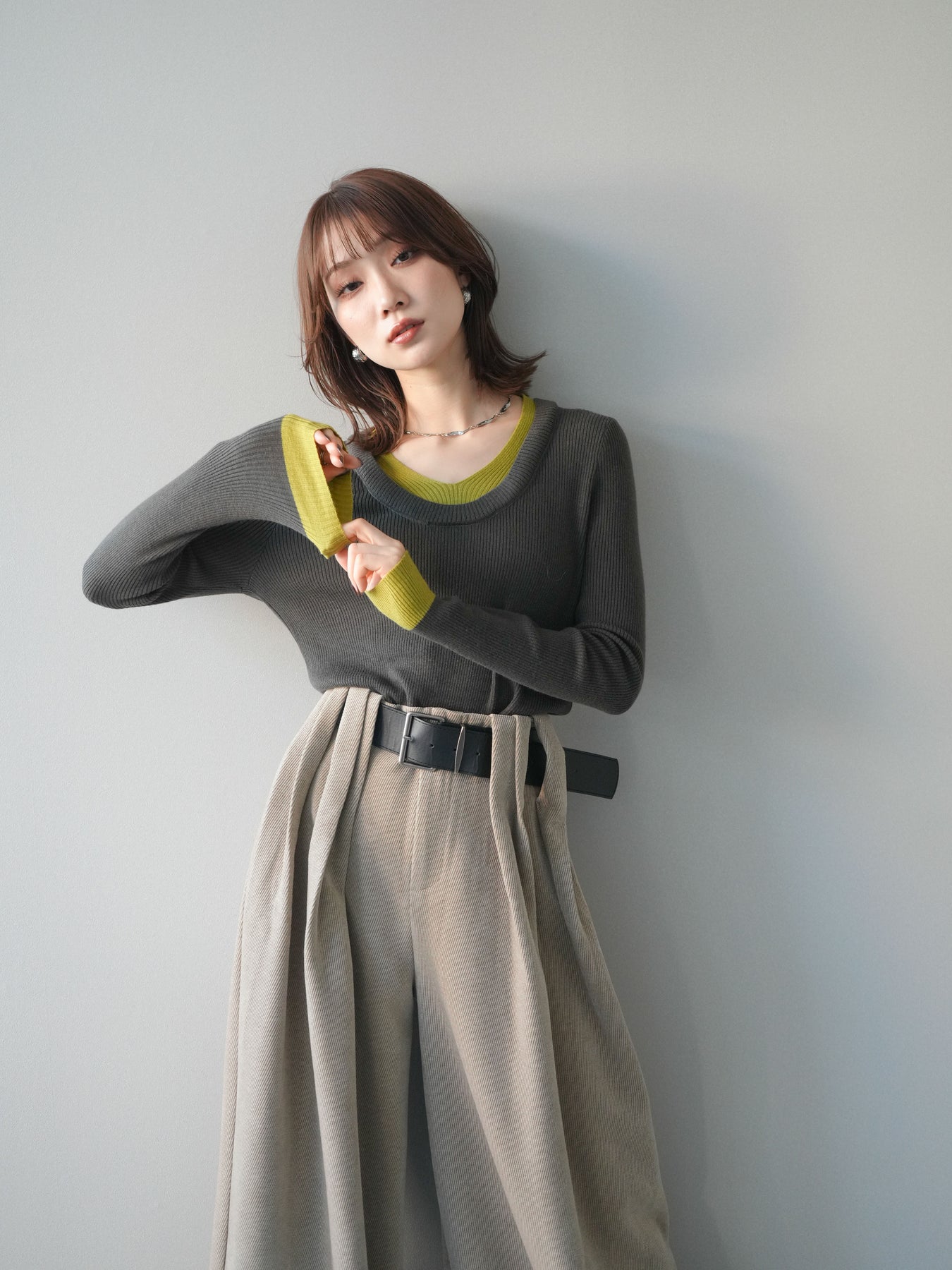 ◆ [予約]Uネック配色レイヤードリブニットトップス