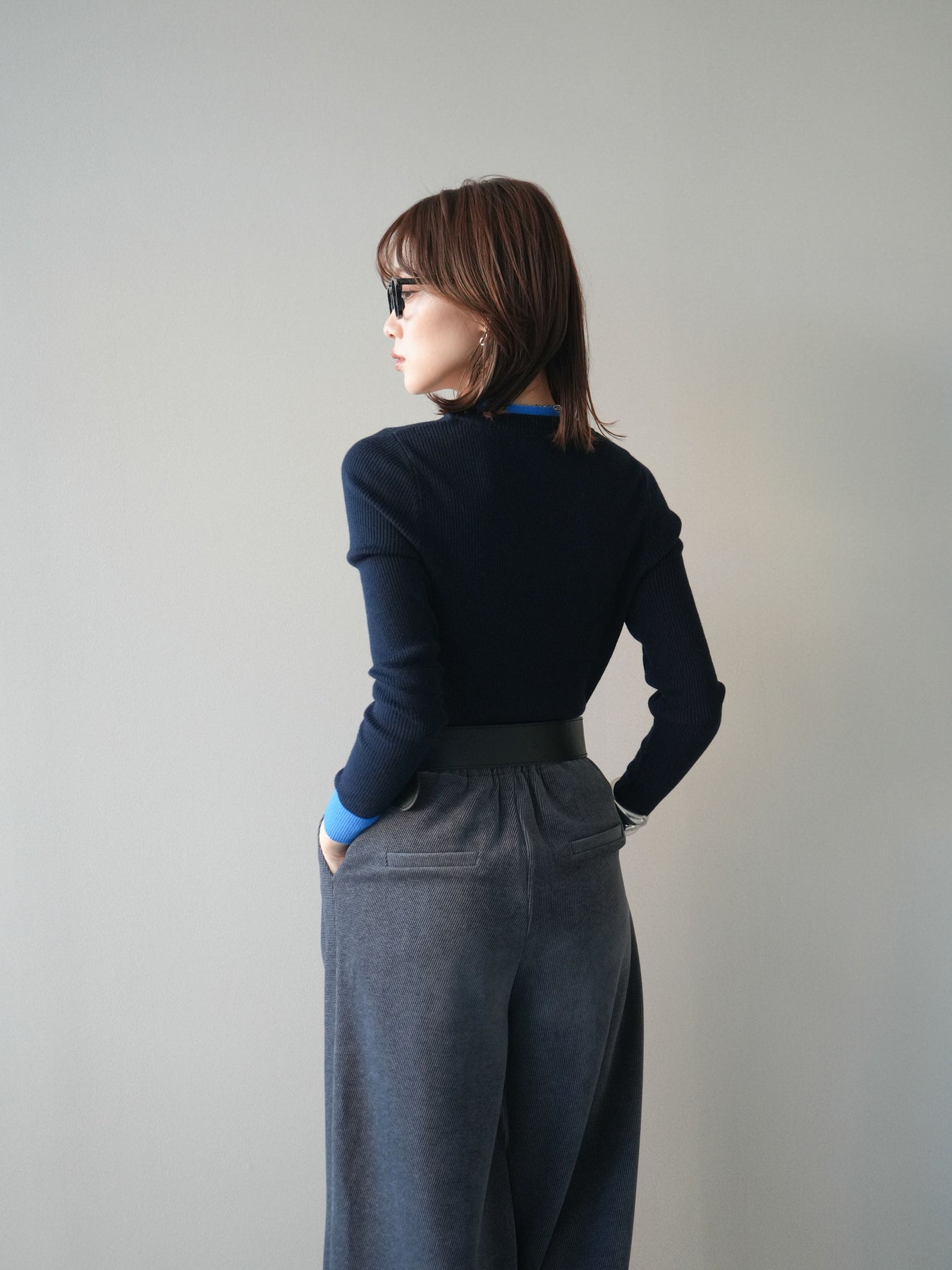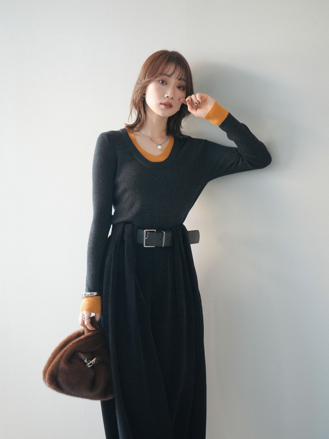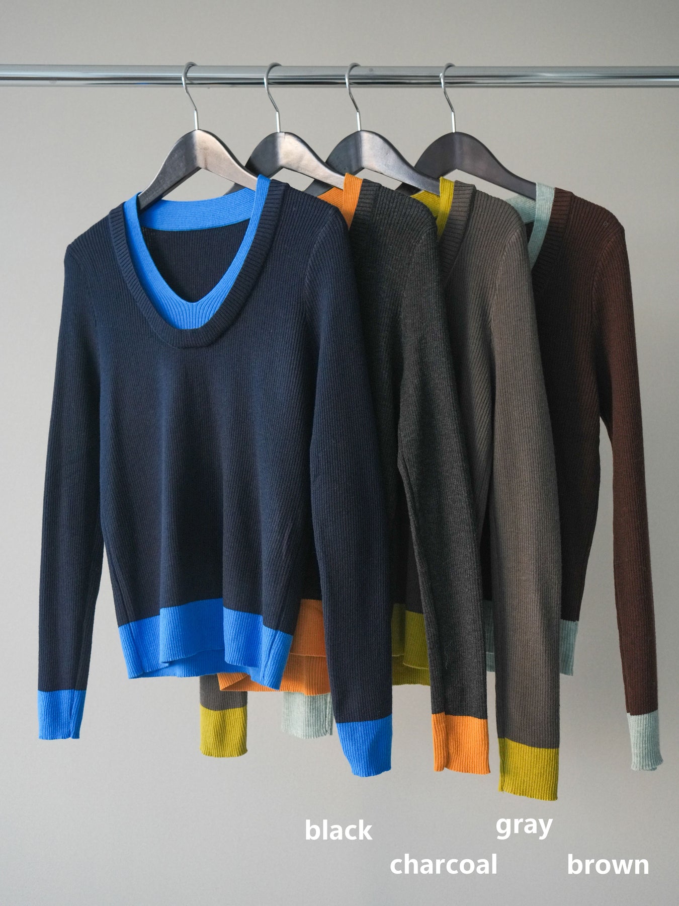 ◆ [予約]Uネック配色レイヤードリブニットトップス