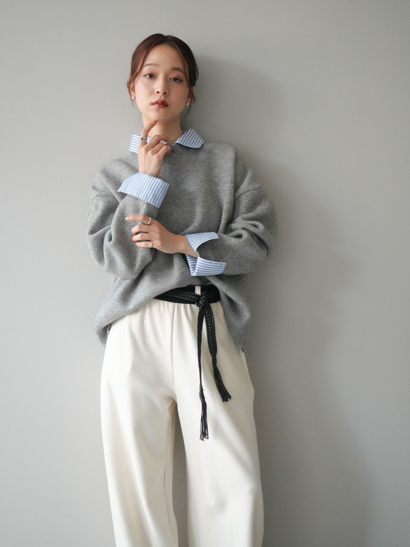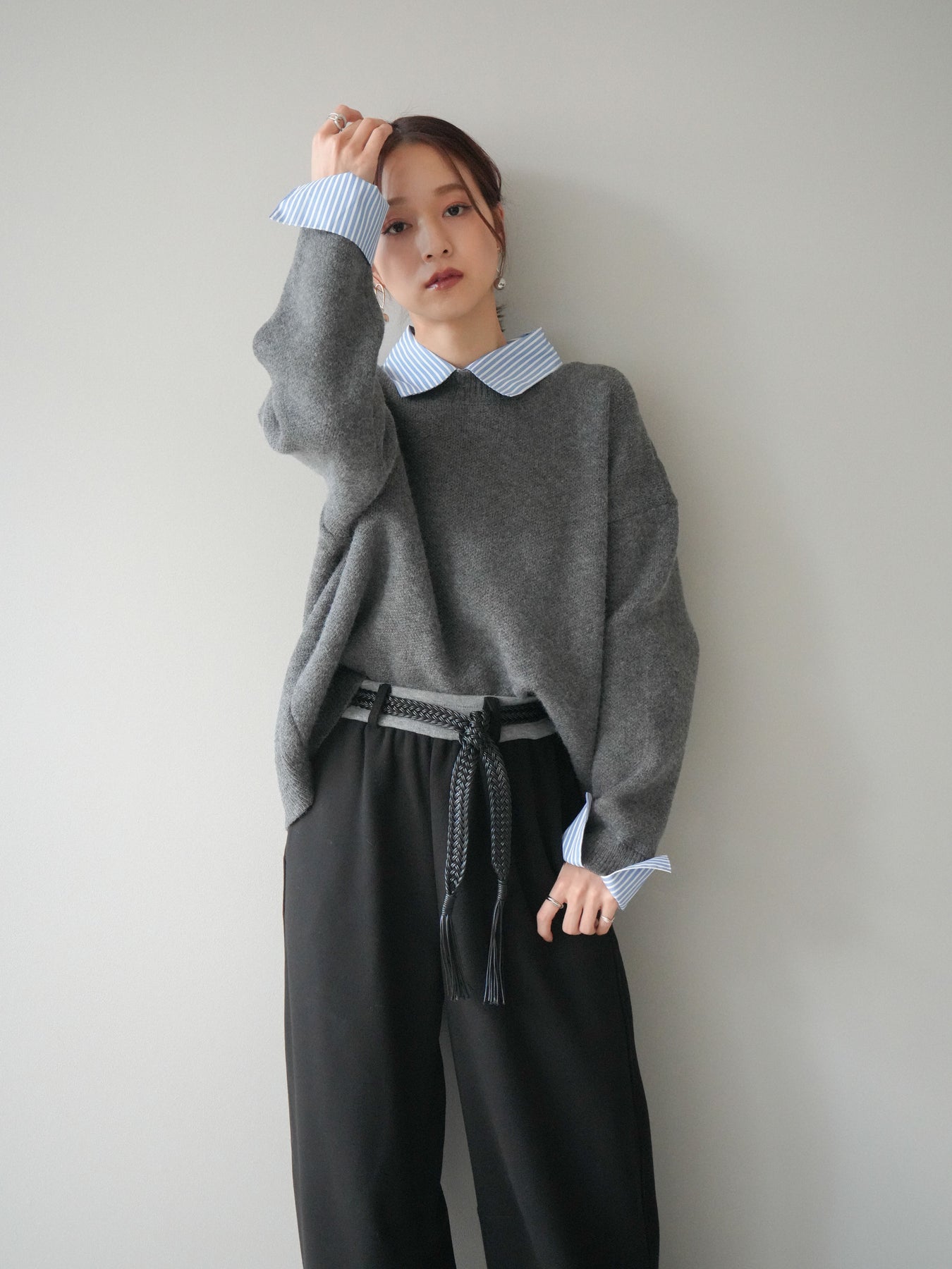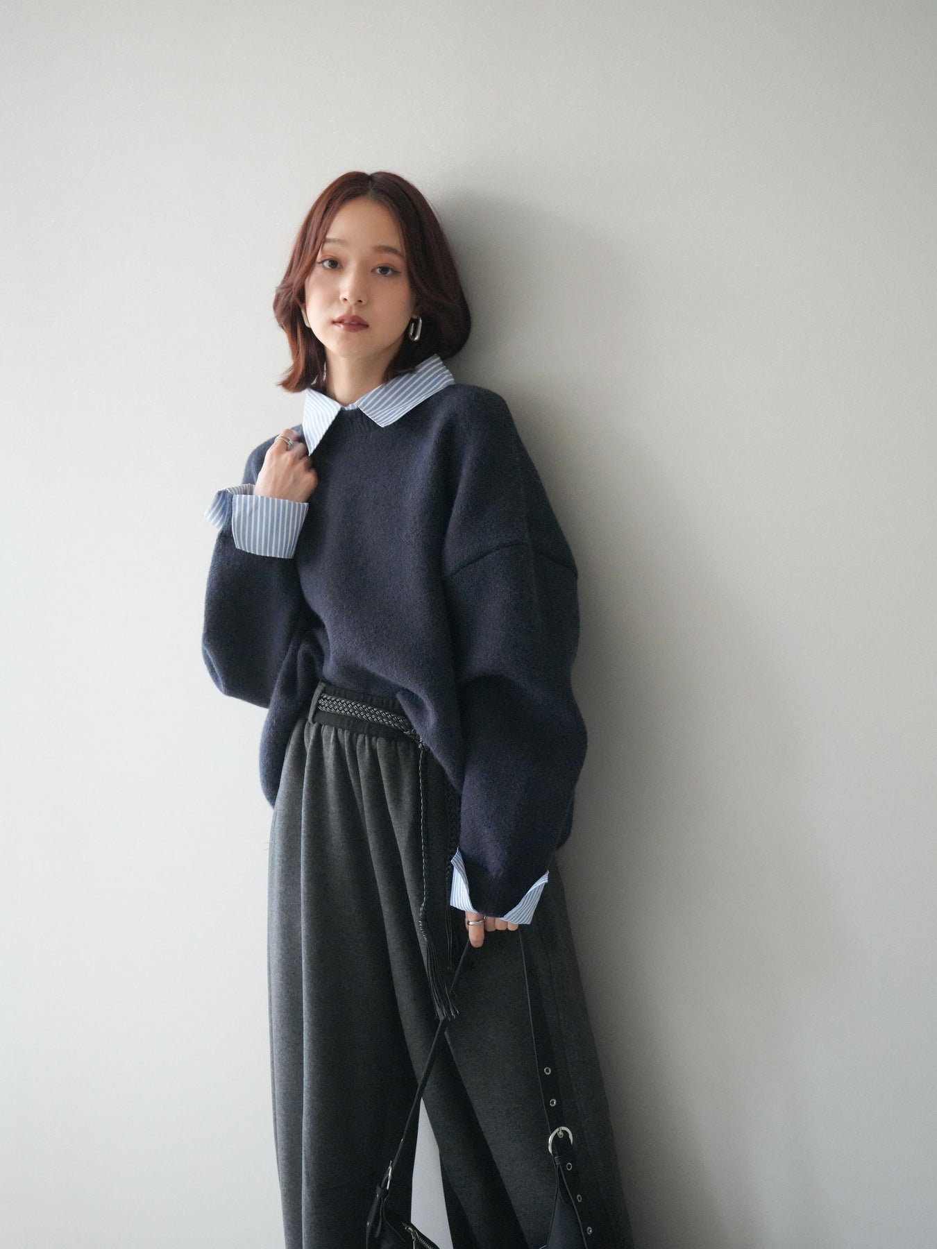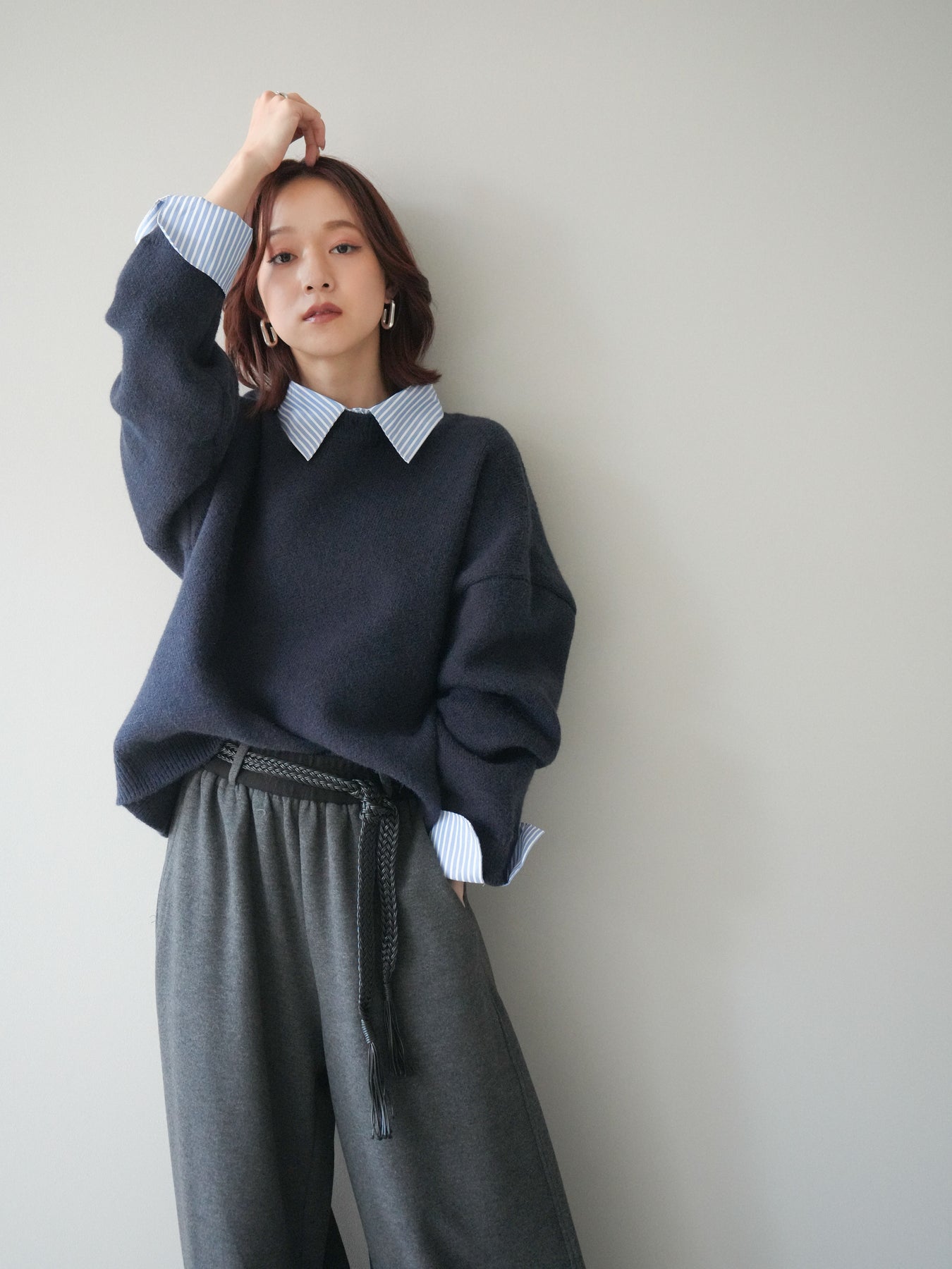 ストライプ柄の襟がアクセントになる、レイヤード風デザインのニットプルオーバー。襟は取り外し可能な2WAY仕様で、その日の気分やコーディネートに合わせてシンプルにも華やかにもアレンジできます。程よくゆとりのあるシルエットはリラックス感があり、ニットの柔らかな風合いが季節らしい温かみをプラス。デニムやスカートなど幅広いボトムスと相性がよく、1枚でバランスよく着映えする万能アイテムです。 ※ボトムス、キャミソール(インナー)以外の商品は一律でインナーは付属していません。