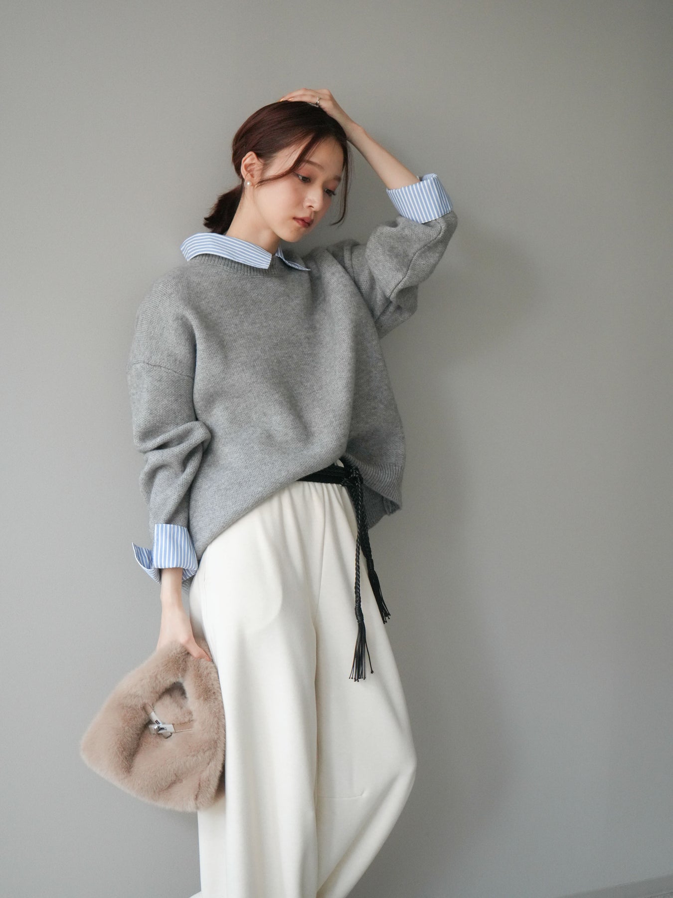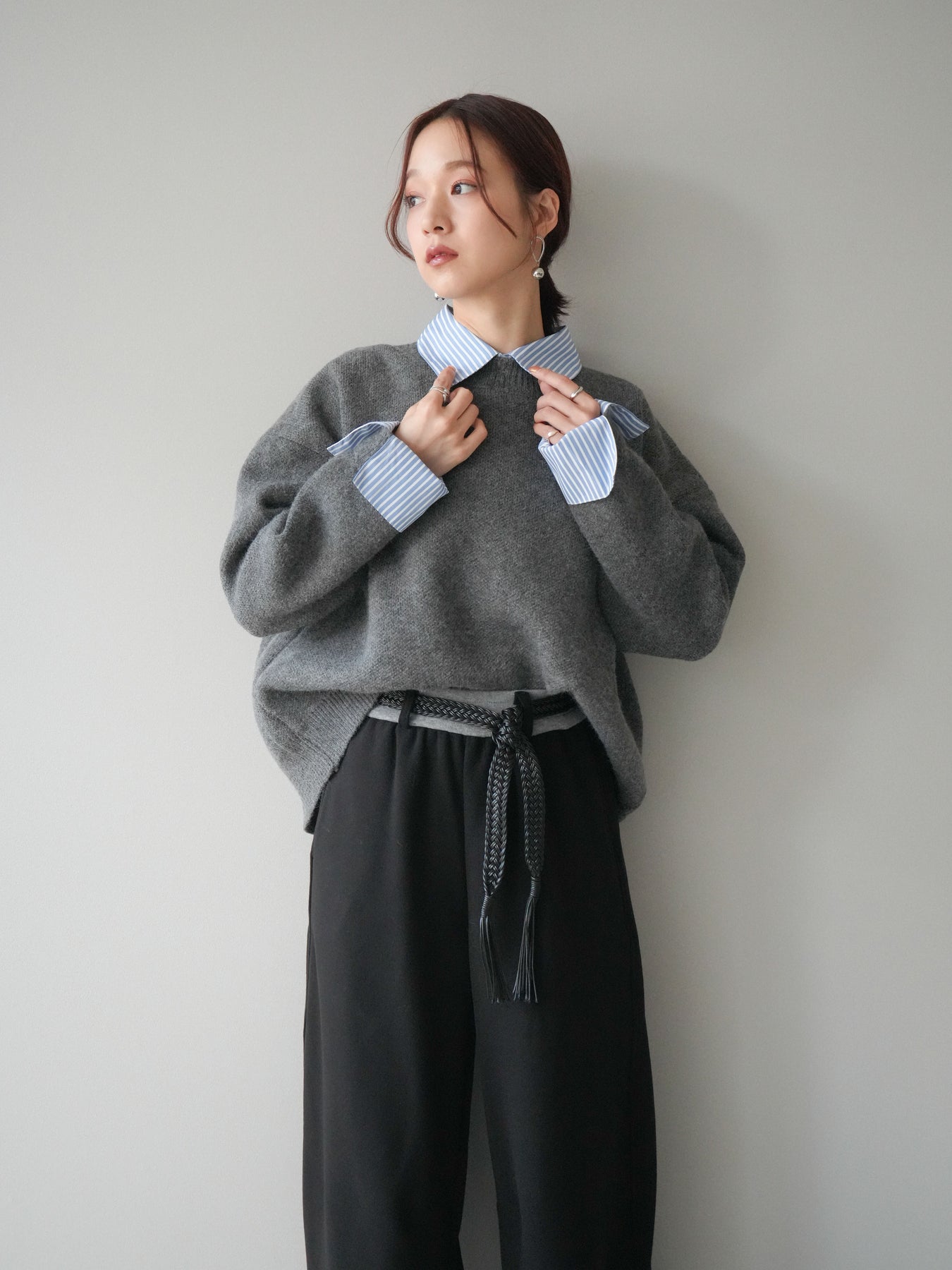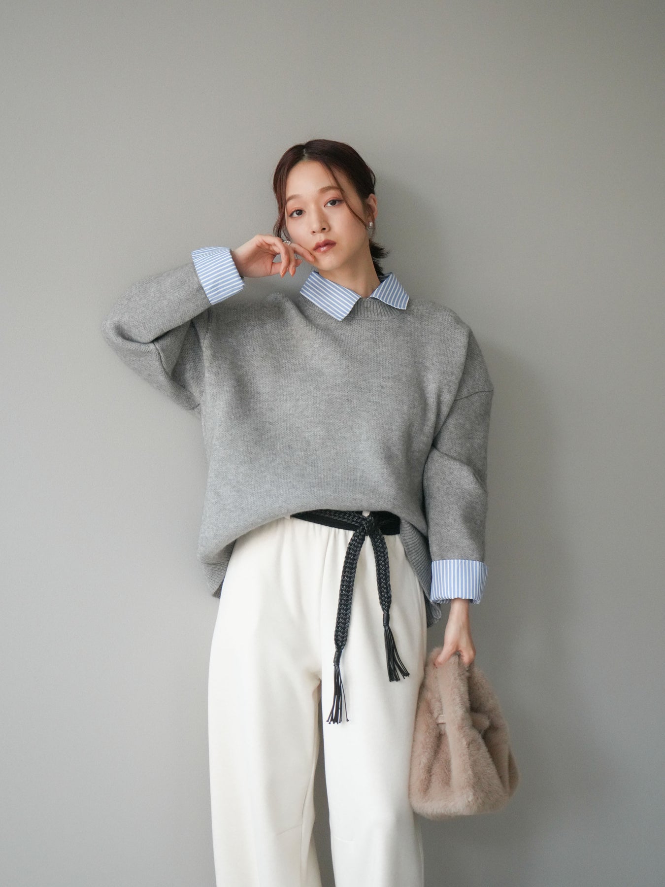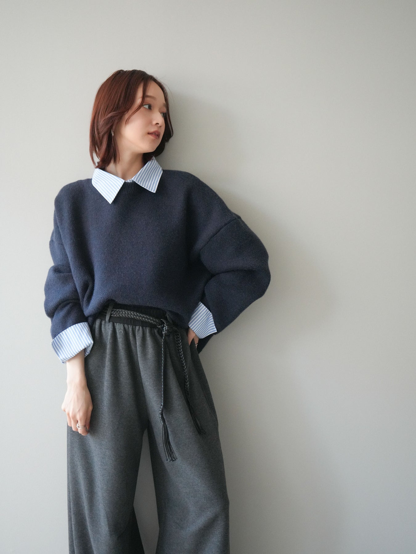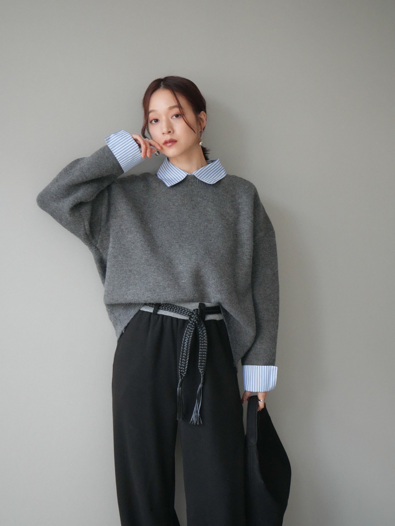 ストライプ柄の襟がアクセントになる、レイヤード風デザインのニットプルオーバー。襟は取り外し可能な2WAY仕様で、その日の気分やコーディネートに合わせてシンプルにも華やかにもアレンジできます。程よくゆとりのあるシルエットはリラックス感があり、ニットの柔らかな風合いが季節らしい温かみをプラス。デニムやスカートなど幅広いボトムスと相性がよく、1枚でバランスよく着映えする万能アイテムです。 ※ボトムス、キャミソール(インナー)以外の商品は一律でインナーは付属していません。
