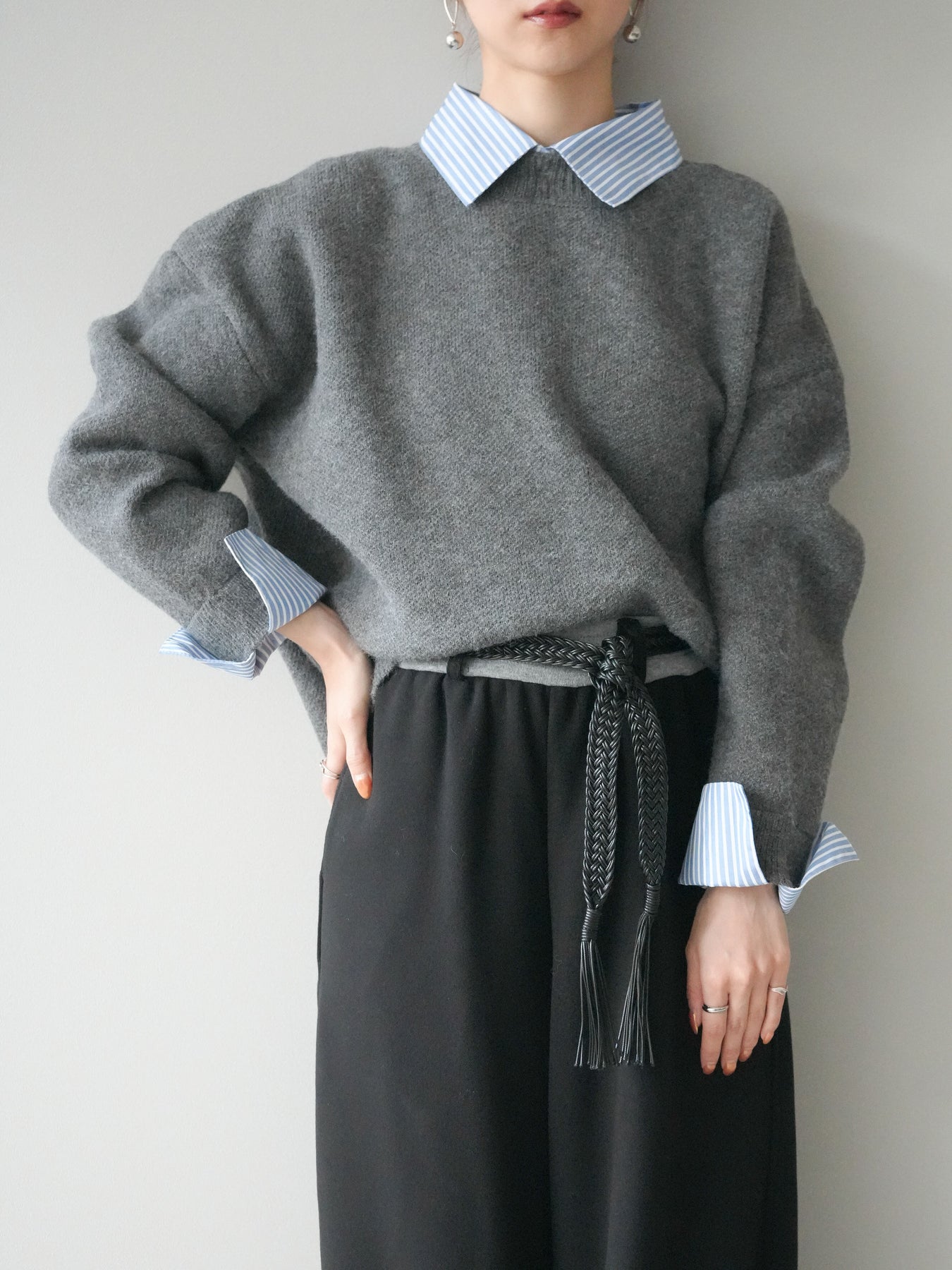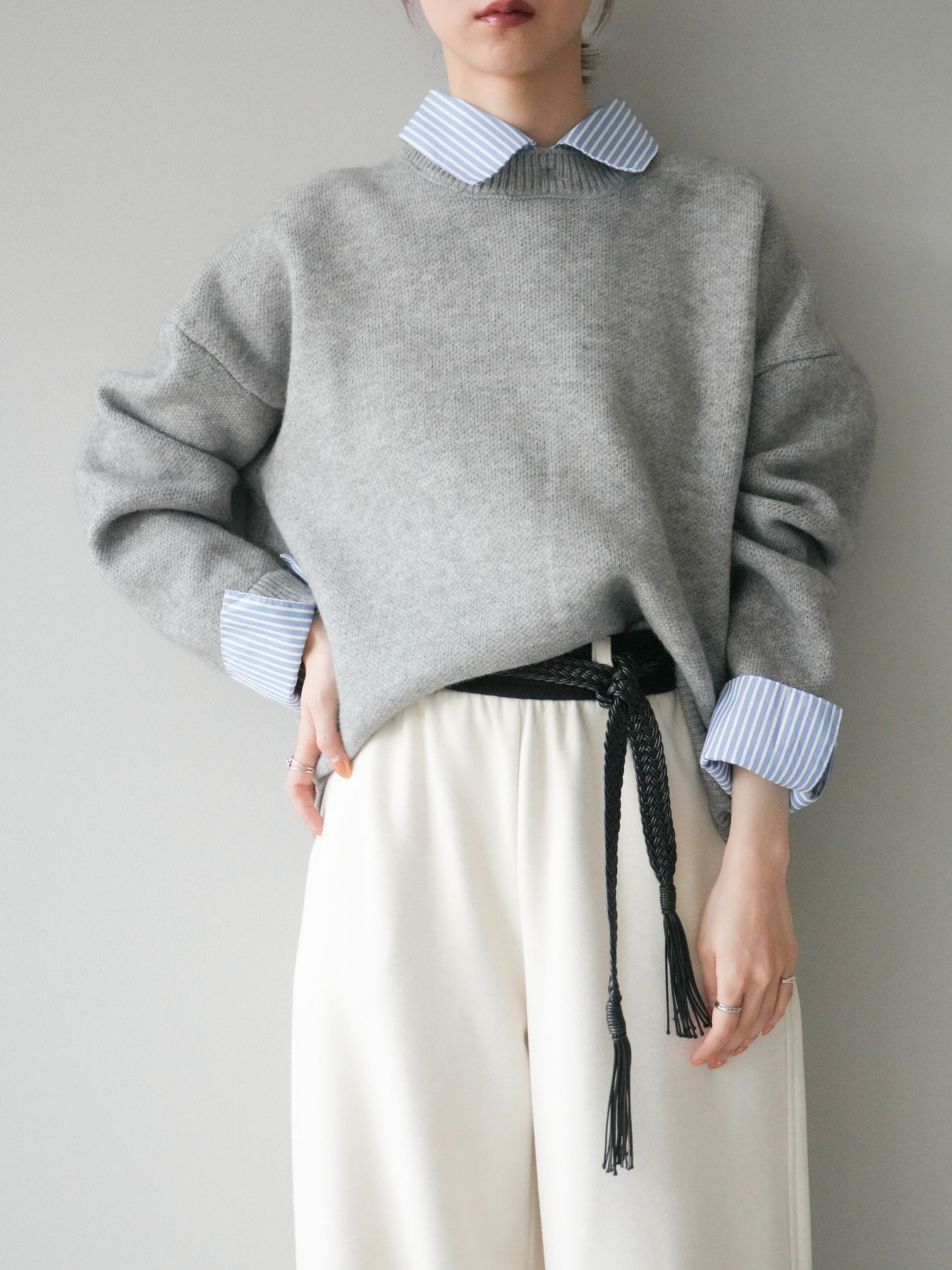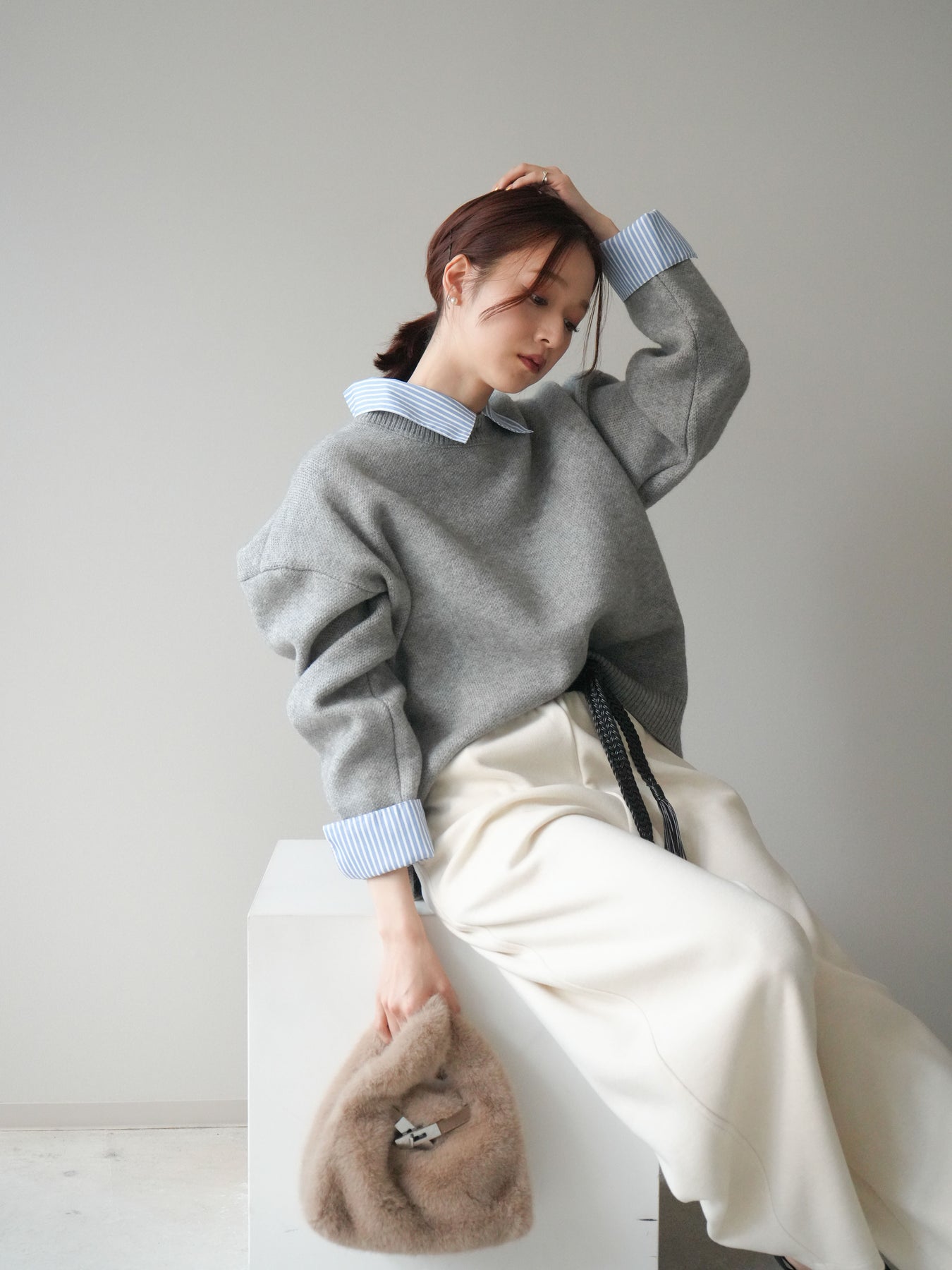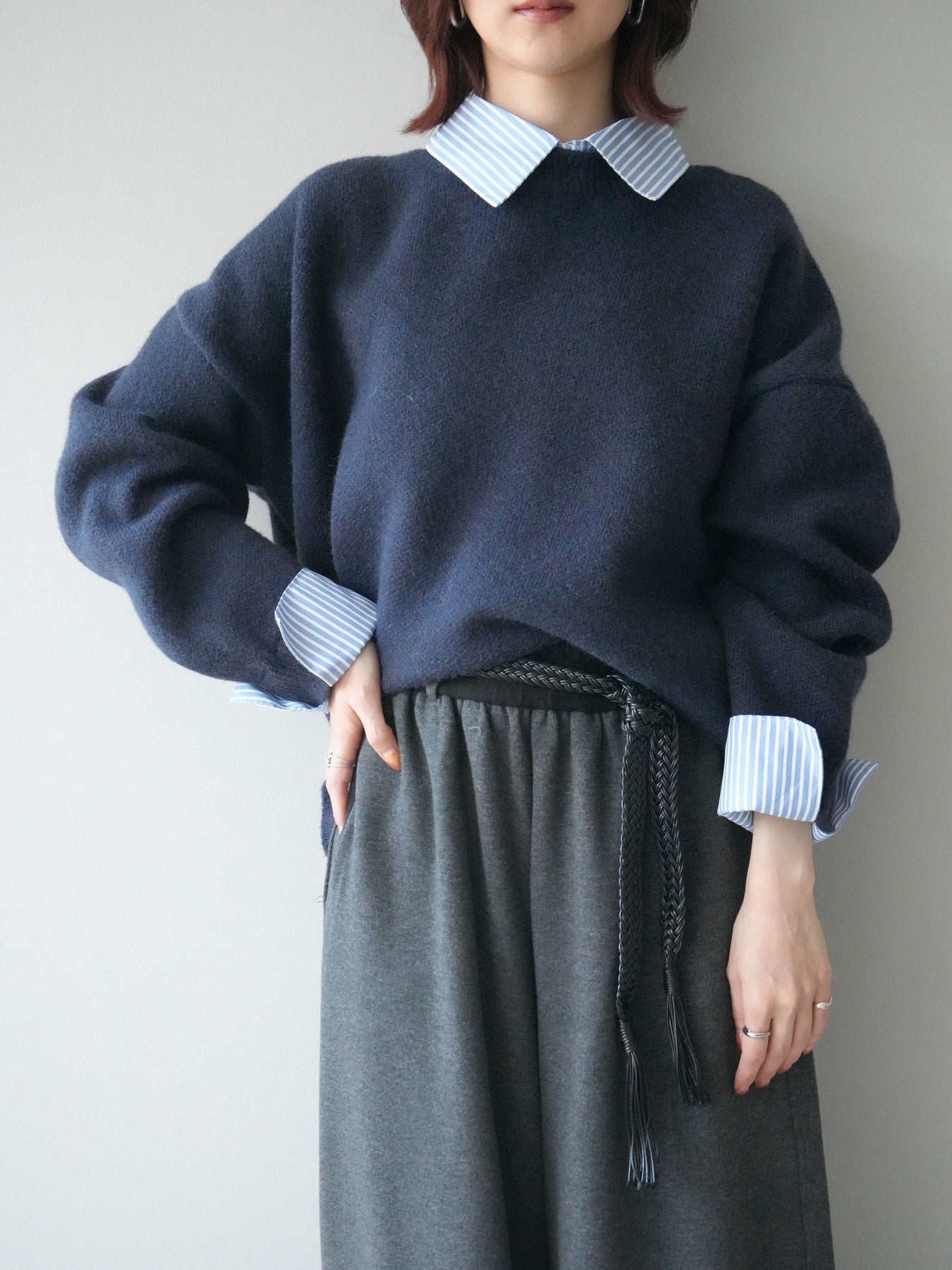 ストライプ柄の襟がアクセントになる、レイヤード風デザインのニットプルオーバー。襟は取り外し可能な2WAY仕様で、その日の気分やコーディネートに合わせてシンプルにも華やかにもアレンジできます。程よくゆとりのあるシルエットはリラックス感があり、ニットの柔らかな風合いが季節らしい温かみをプラス。デニムやスカートなど幅広いボトムスと相性がよく、1枚でバランスよく着映えする万能アイテムです。 ※ボトムス、キャミソール(インナー)以外の商品は一律でインナーは付属していません。