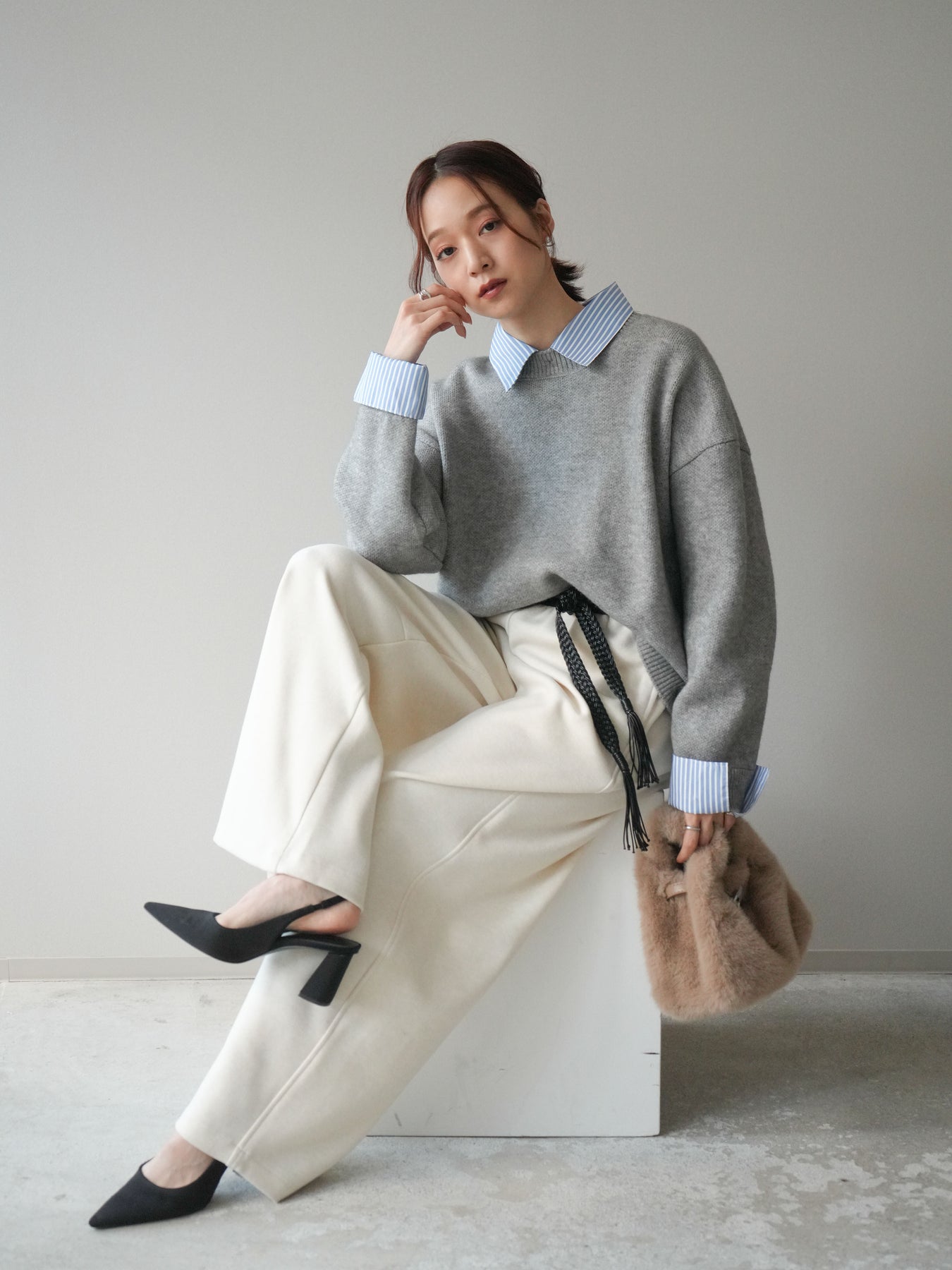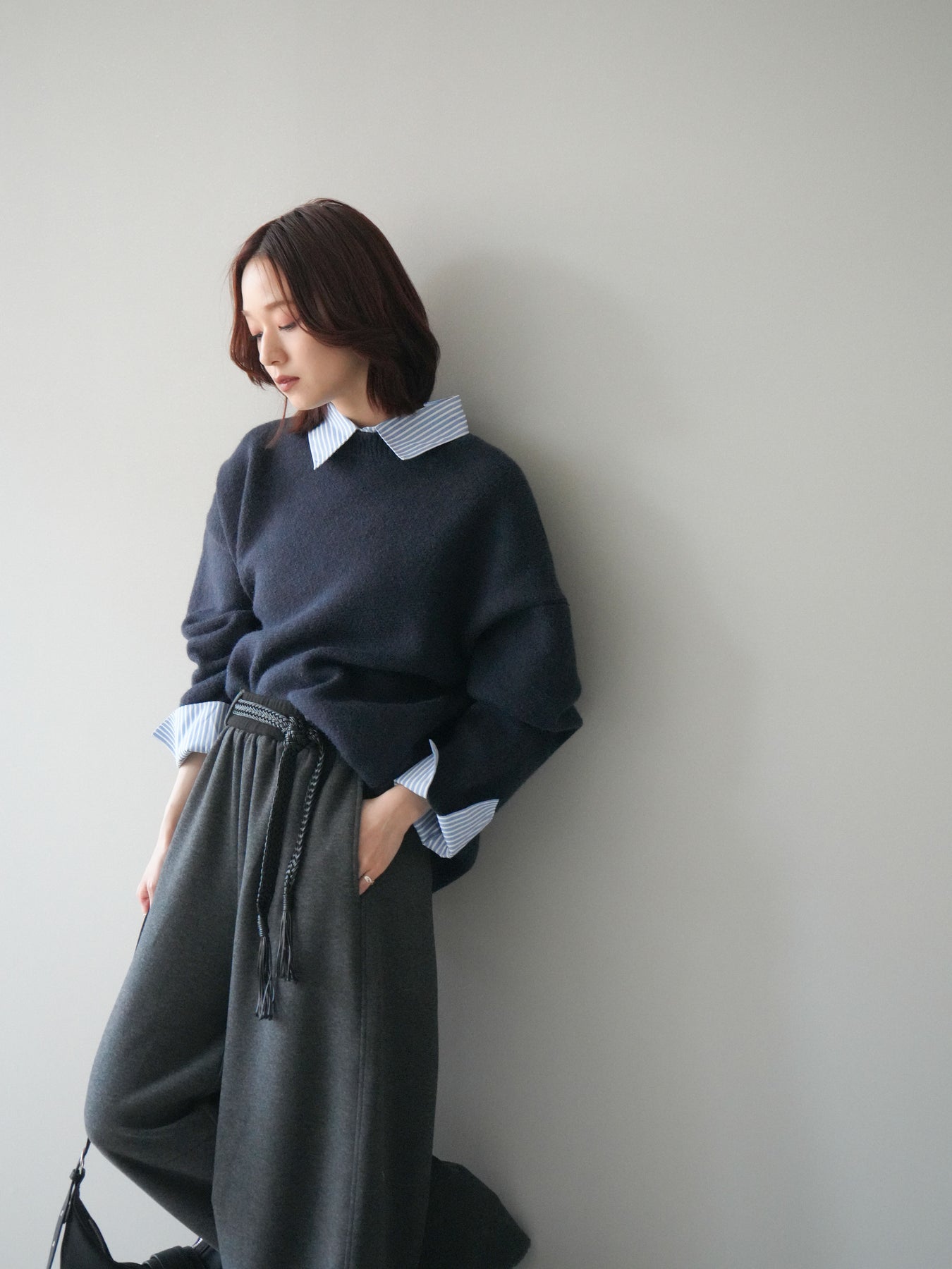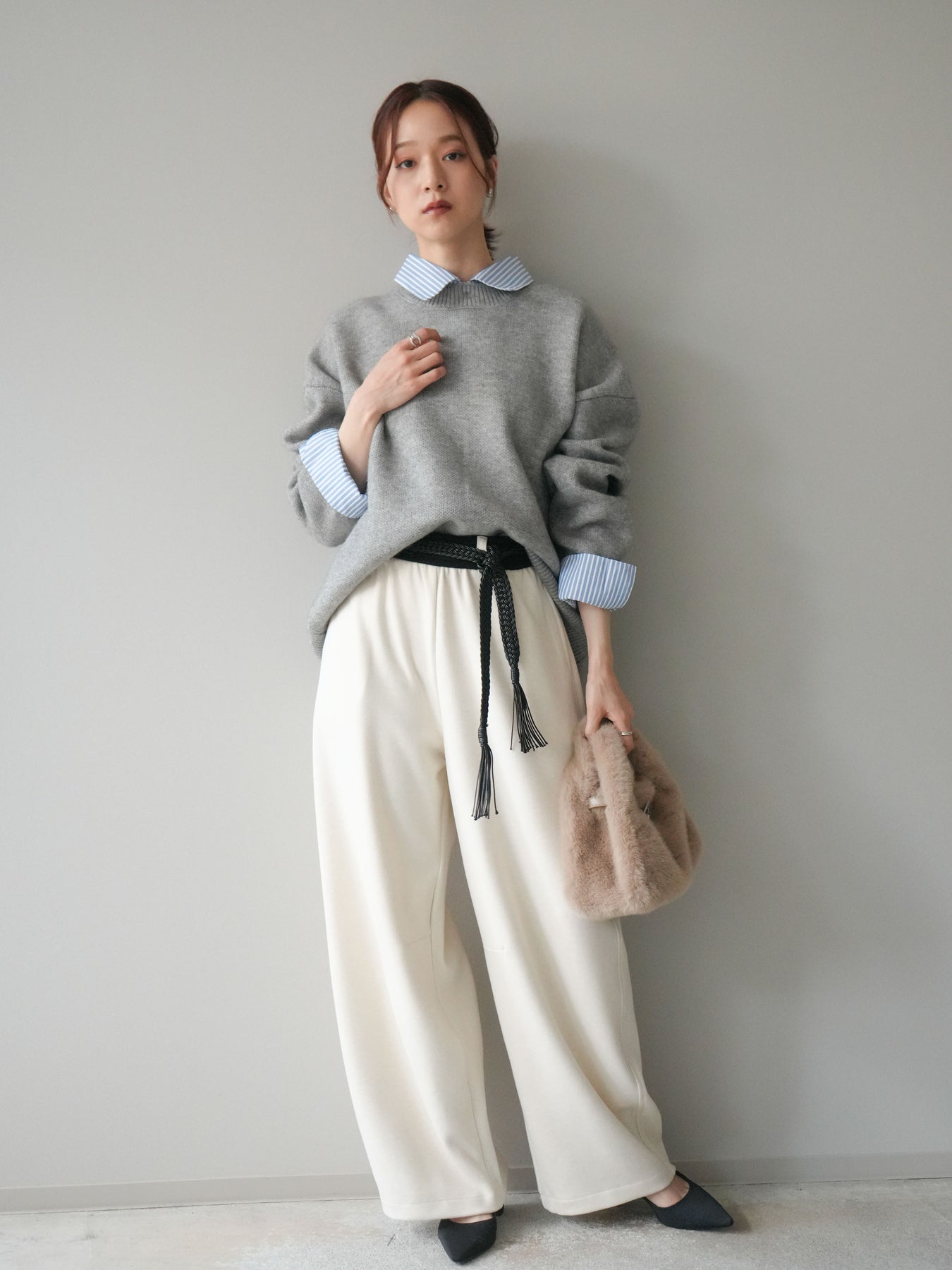 [SET]2WAYストライプ襟ニットプルオーバー+編み込みベルト付きウエスト配色スエットパンツ(2set)