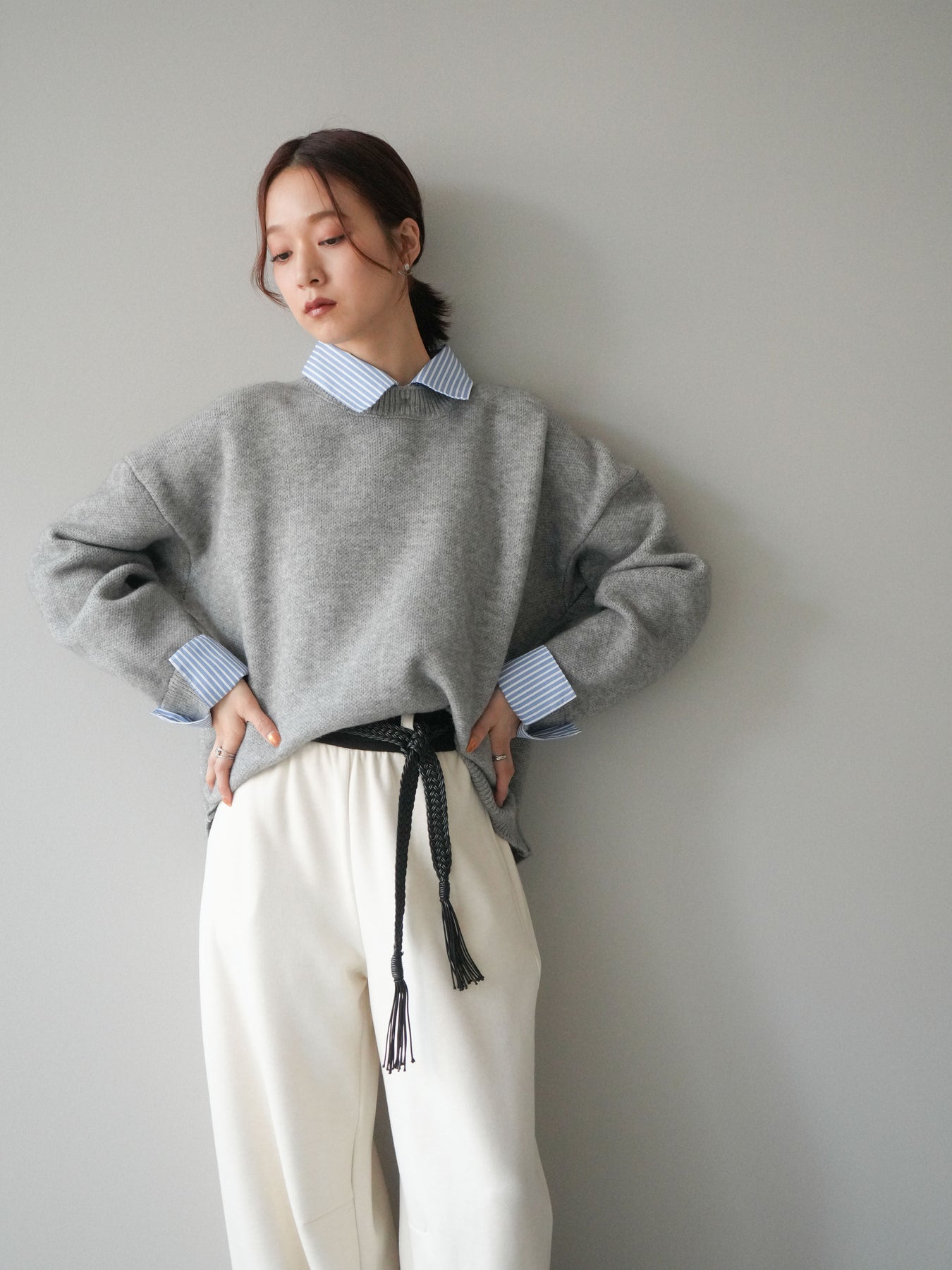 ウエスト部分に編み込みベルトを組み合わせた、アクセントの効いたデザインスエットパンツ。柔らかなスエット素材を使用し、リラックス感のある穿き心地ながらも落ち感のきれいなワイドシルエットが大人らしい印象を演出します。ウエストの配色切り替えがさりげなく視線を引き上げ、タックインスタイルもバランスよく決まるポイントに。シンプルなトップスと合わせるだけでこなれた着こなしが完成し、デイリーに活躍する万能な一本です。