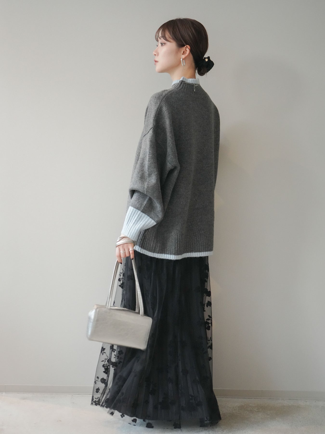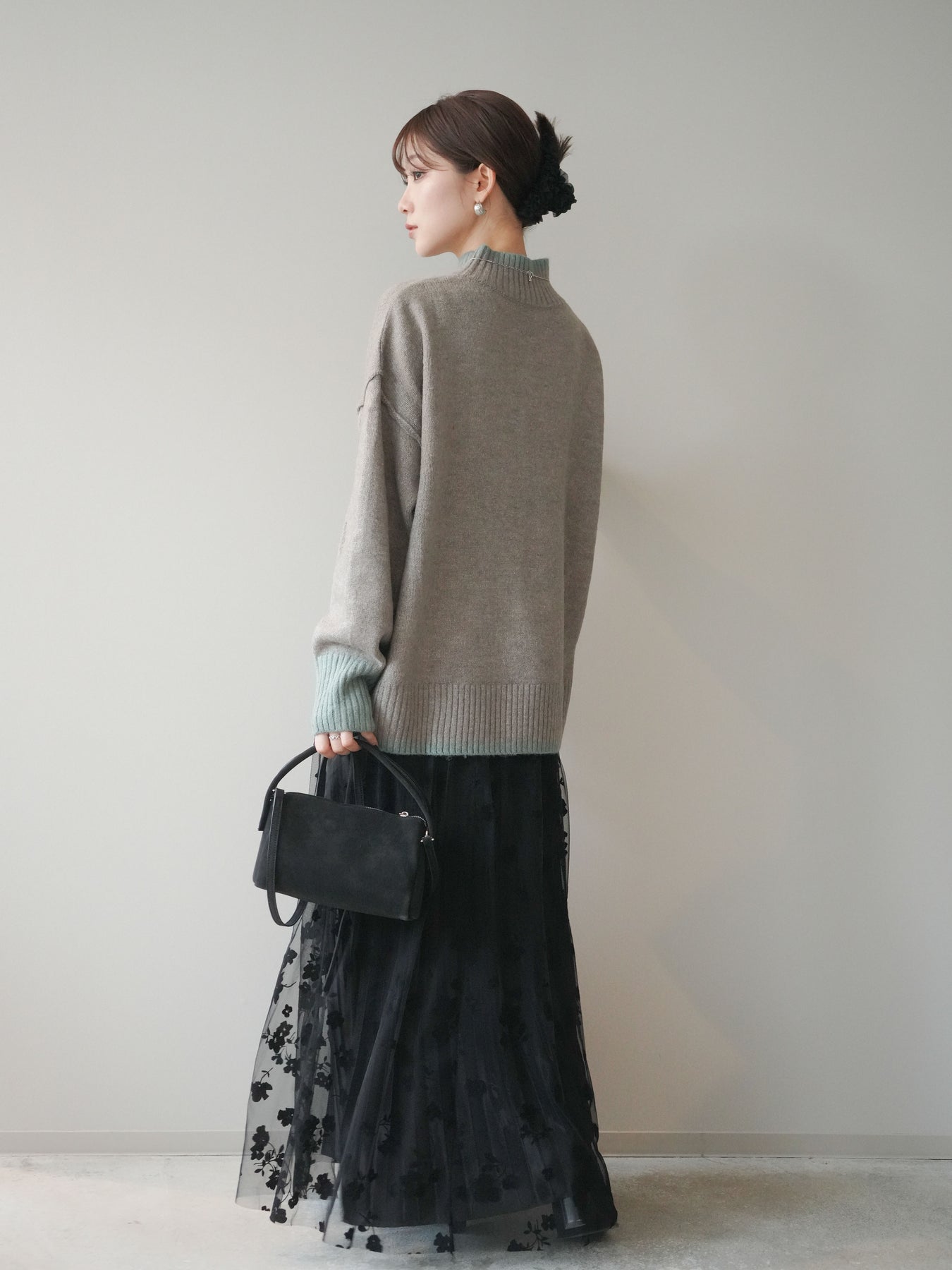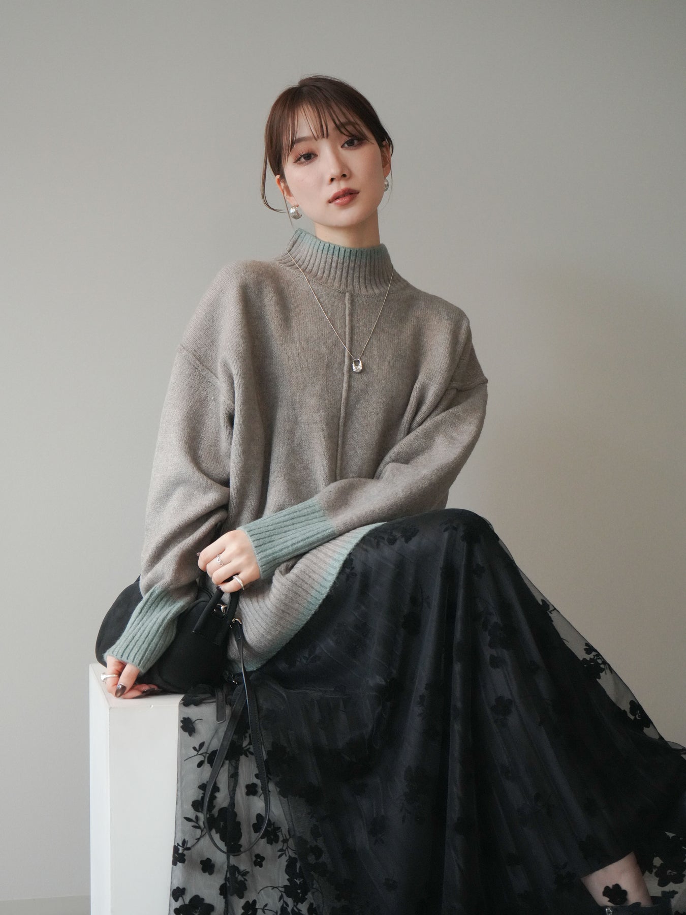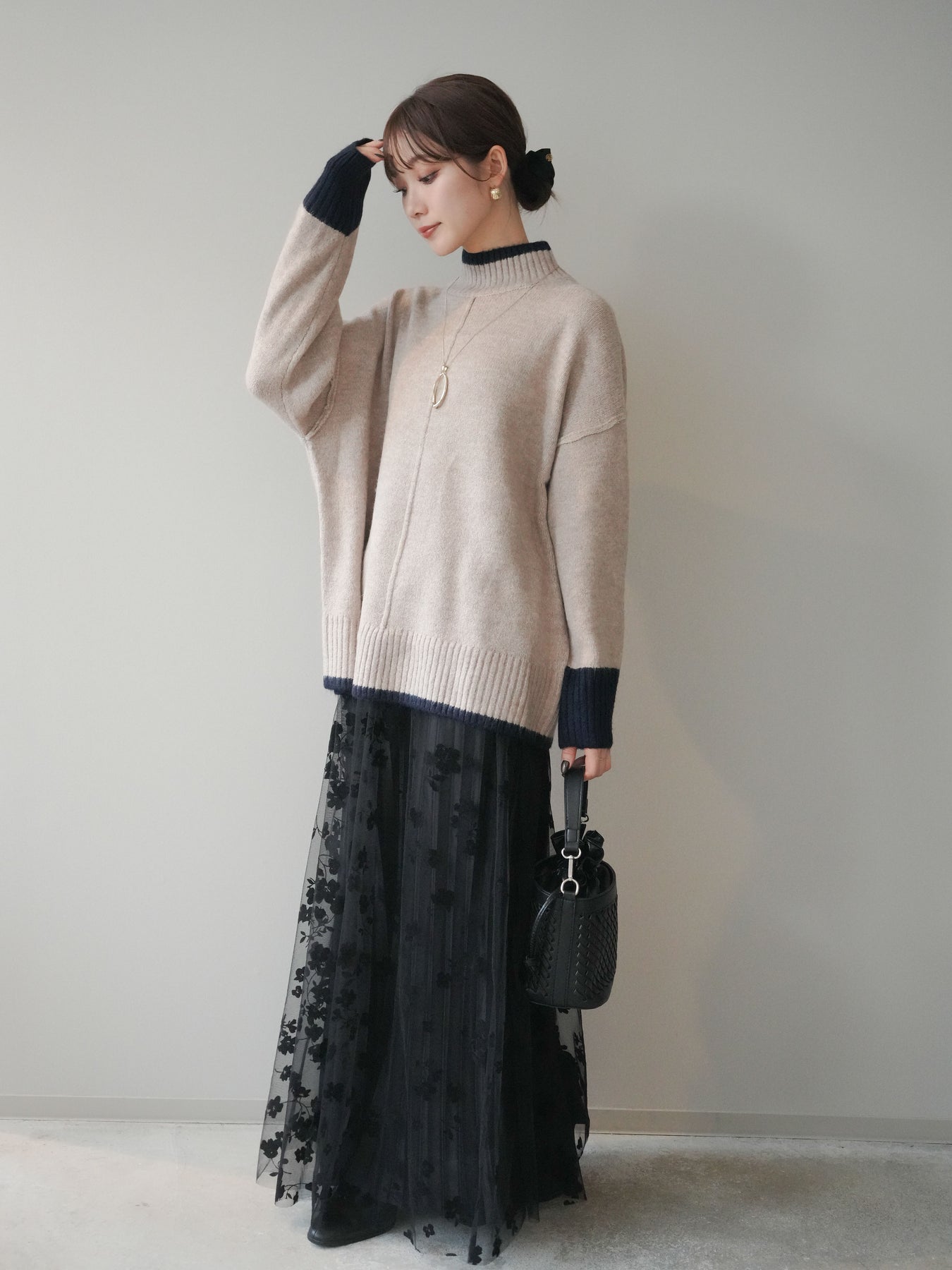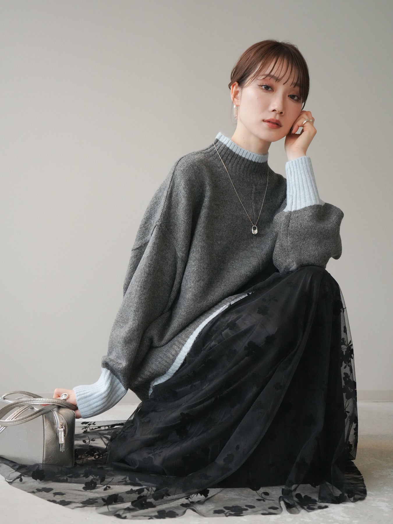 [SET]配色ハイネックニットプルオーバー+フラワーフロッキーチュールプリーツスカート(2set)