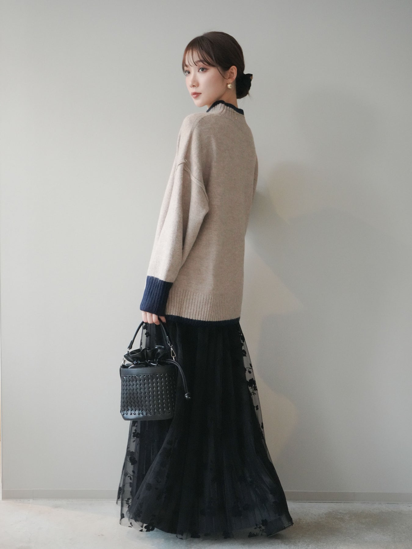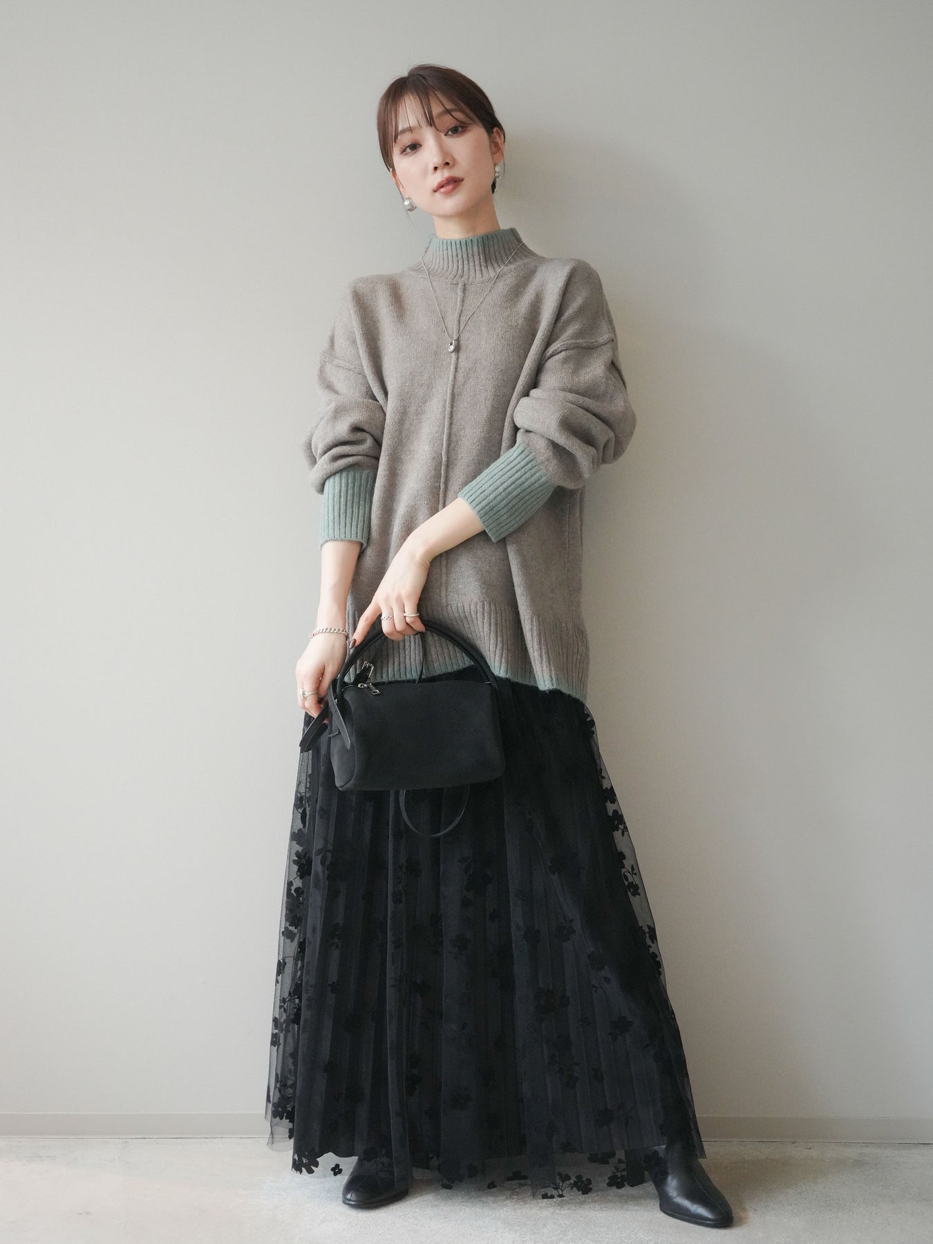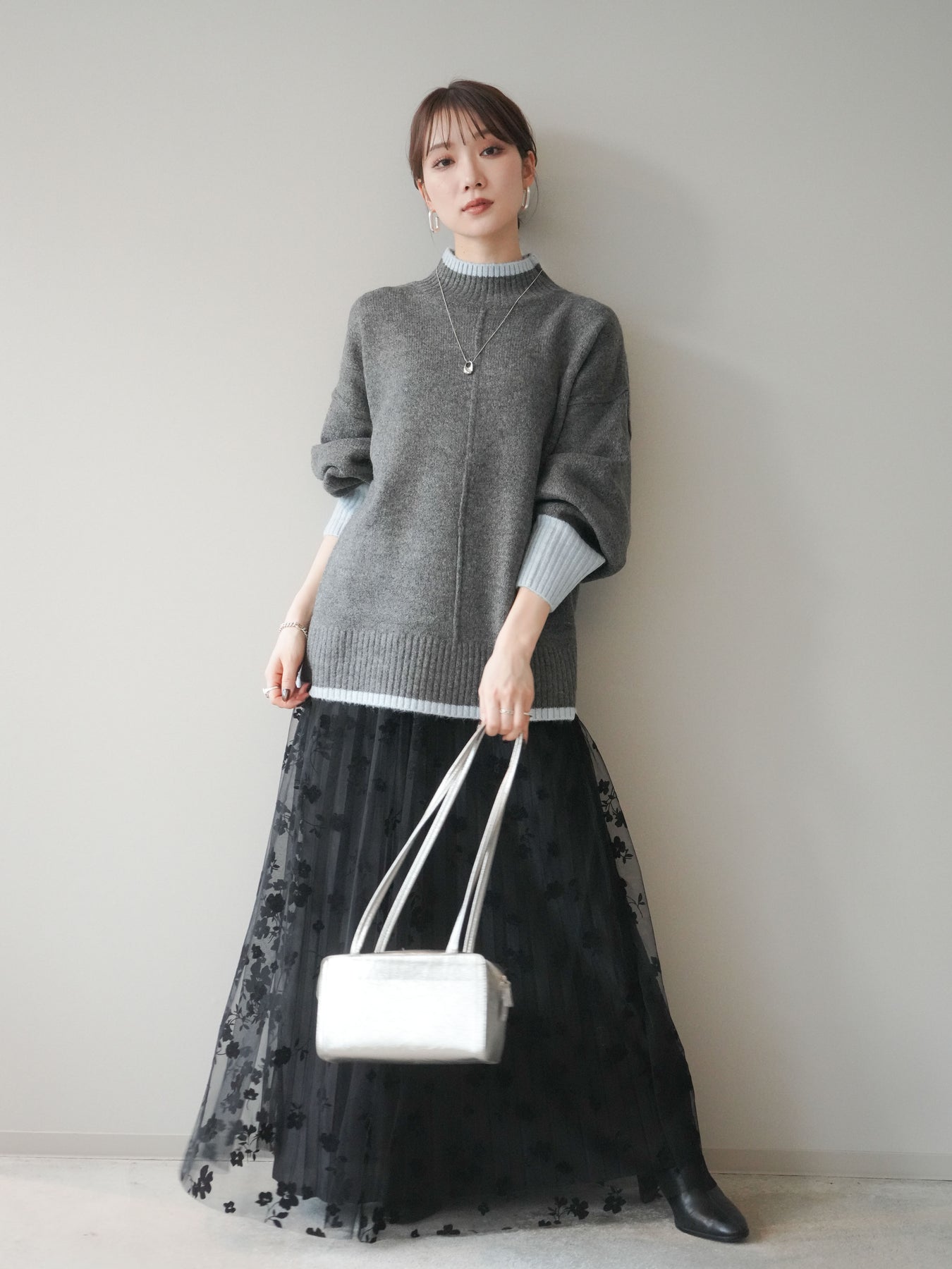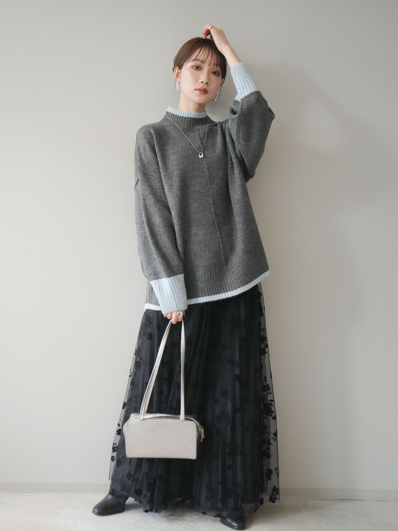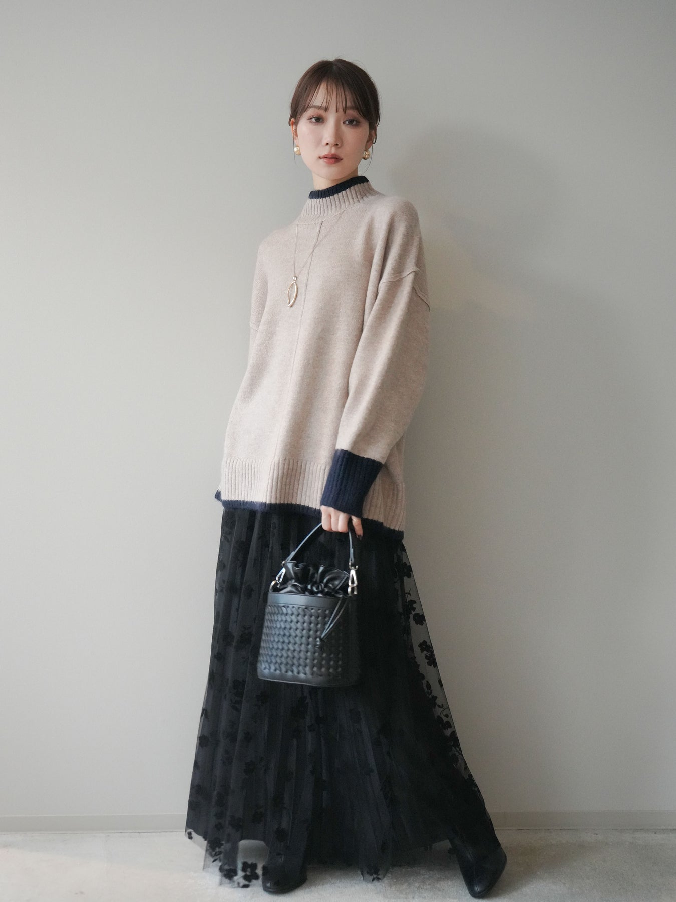 [SET]配色ハイネックニットプルオーバー+フラワーフロッキーチュールプリーツスカート(2set)