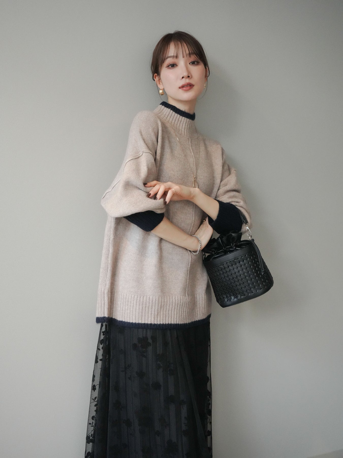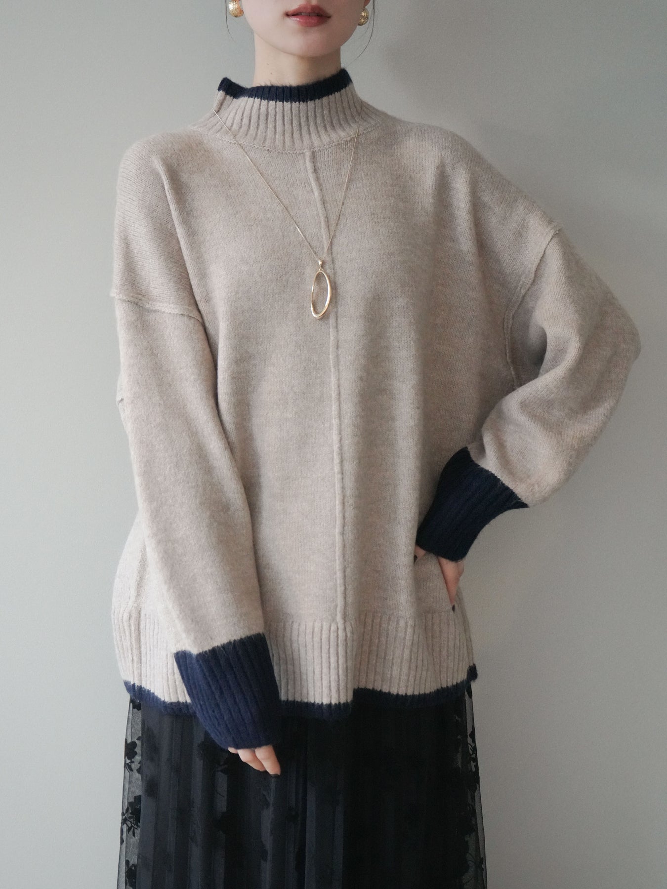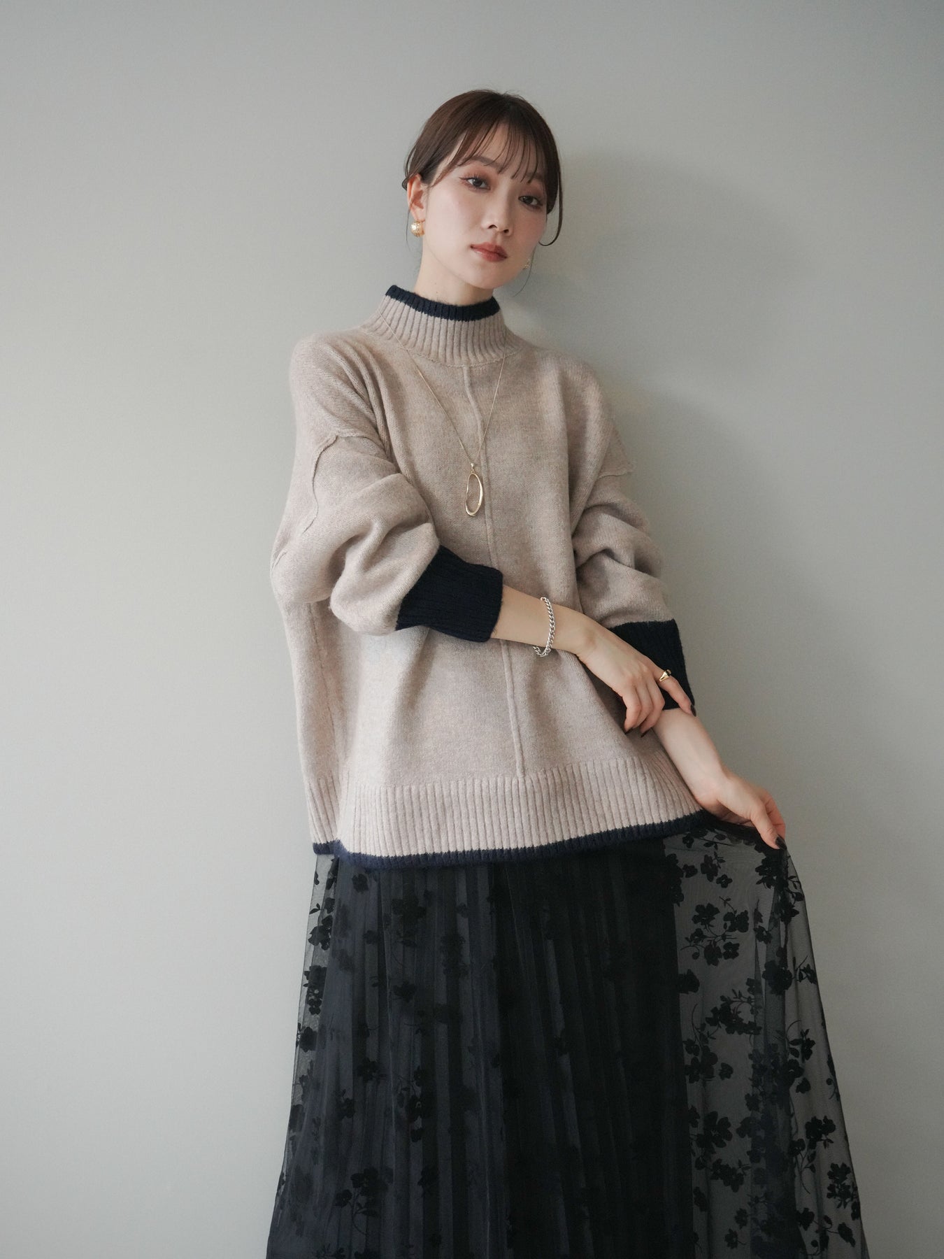 首元と袖口、裾に配したさりげない配色がアクセントになるハイネックニットプルオーバー。柔らかく滑らかな肌触りで、ゆったりとしたシルエットがリラックスした着心地を実現します。フロントの切替えラインが縦の印象を強め、シンプルながらも全体をすっきりと見せてくれるデザインに。デニムやスカートなど幅広いボトムスと合わせやすく、デイリーコーデに取り入れやすい万能な一枚です。 ※ボトムス、キャミソール(インナー)以外の商品は一律でインナーは付属していません。