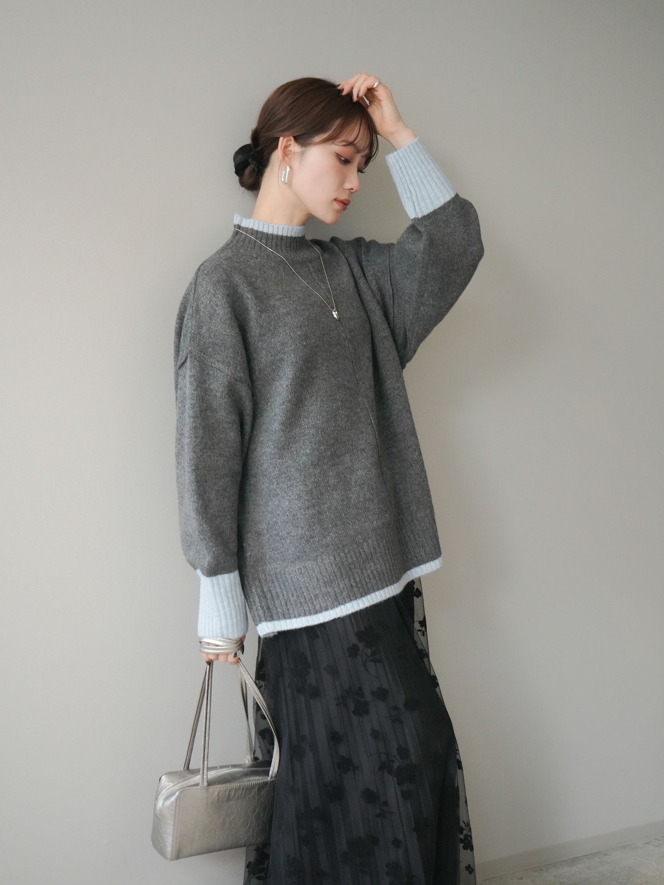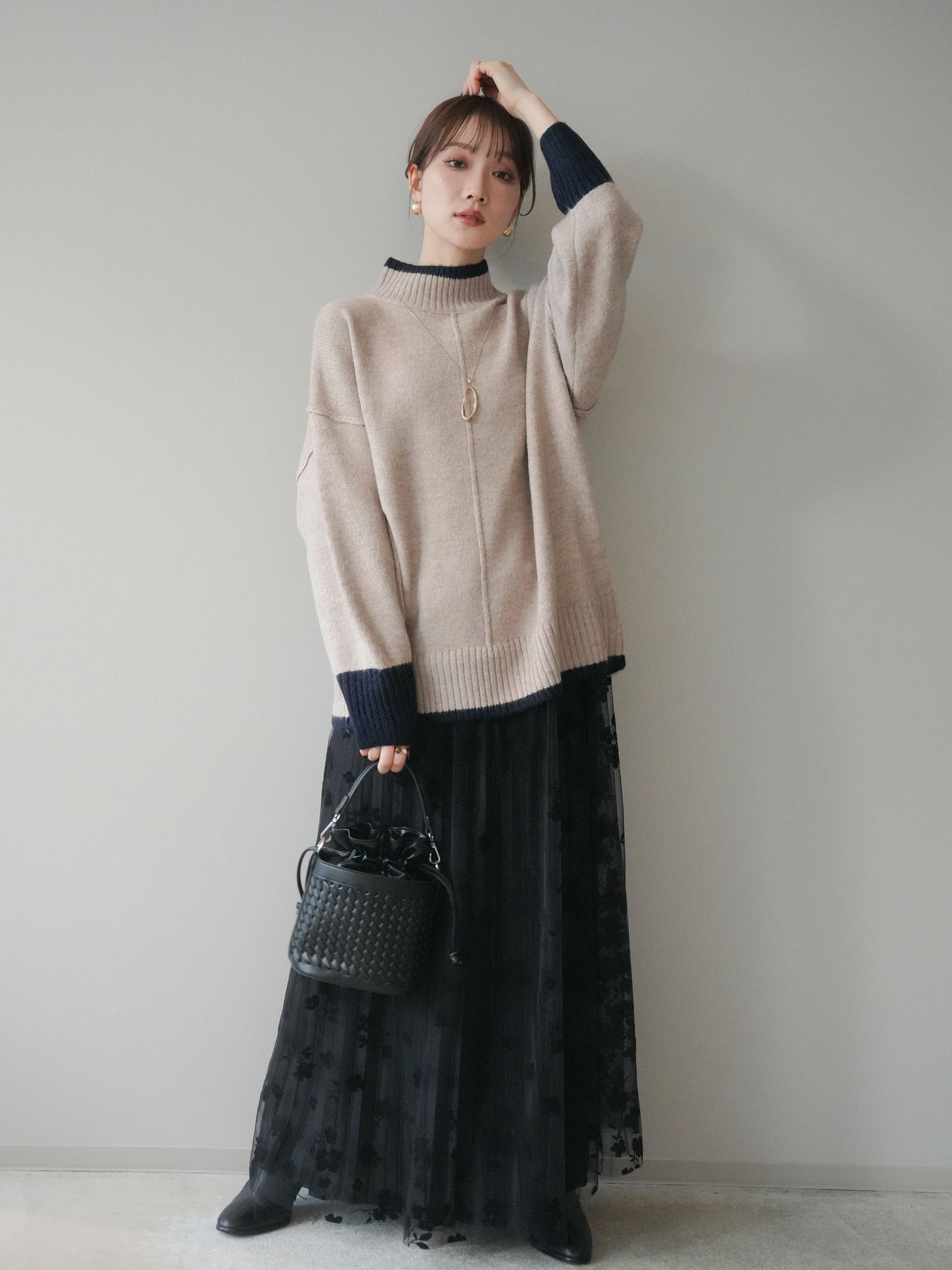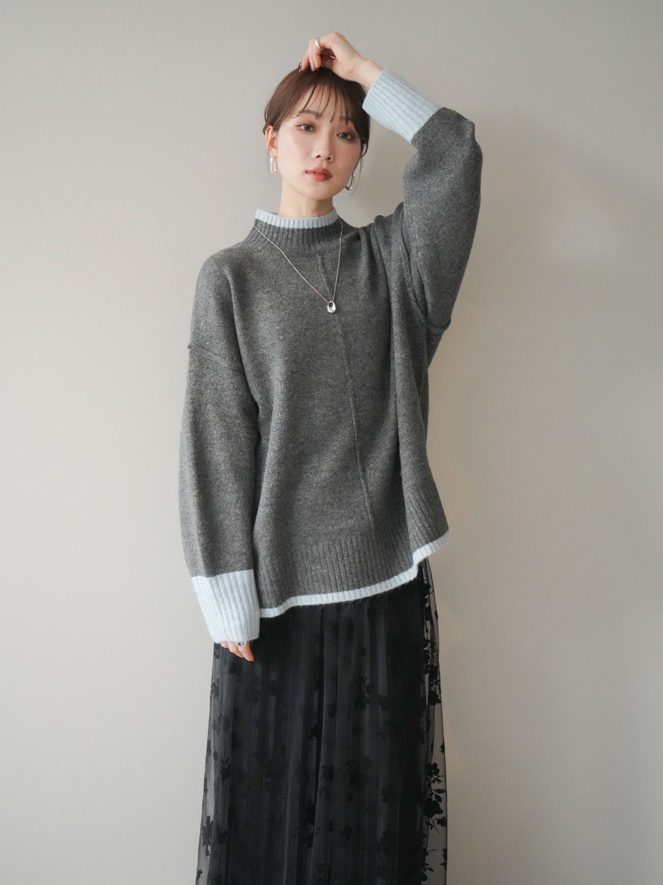 首元と袖口、裾に配したさりげない配色がアクセントになるハイネックニットプルオーバー。柔らかく滑らかな肌触りで、ゆったりとしたシルエットがリラックスした着心地を実現します。フロントの切替えラインが縦の印象を強め、シンプルながらも全体をすっきりと見せてくれるデザインに。デニムやスカートなど幅広いボトムスと合わせやすく、デイリーコーデに取り入れやすい万能な一枚です。 ※ボトムス、キャミソール(インナー)以外の商品は一律でインナーは付属していません。
